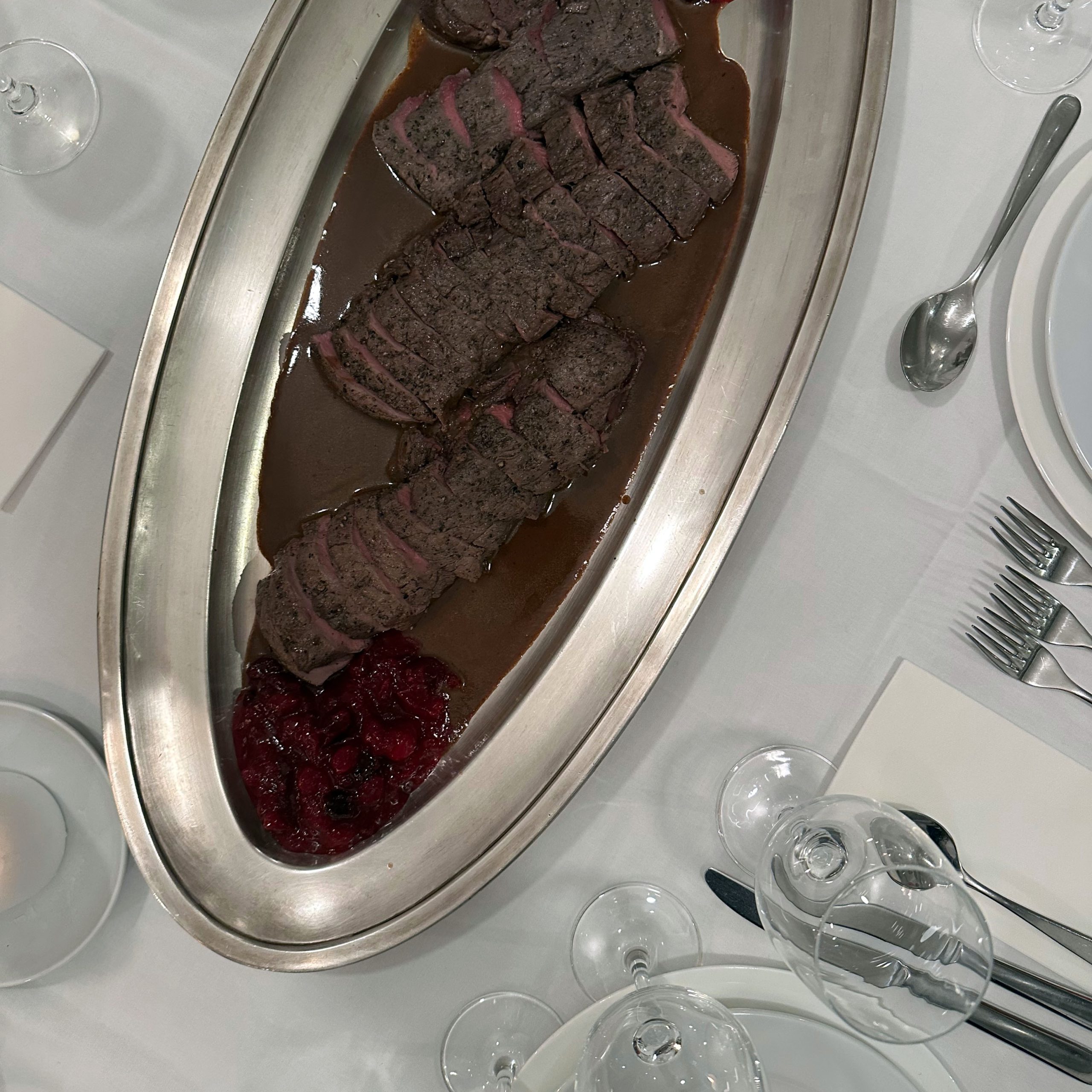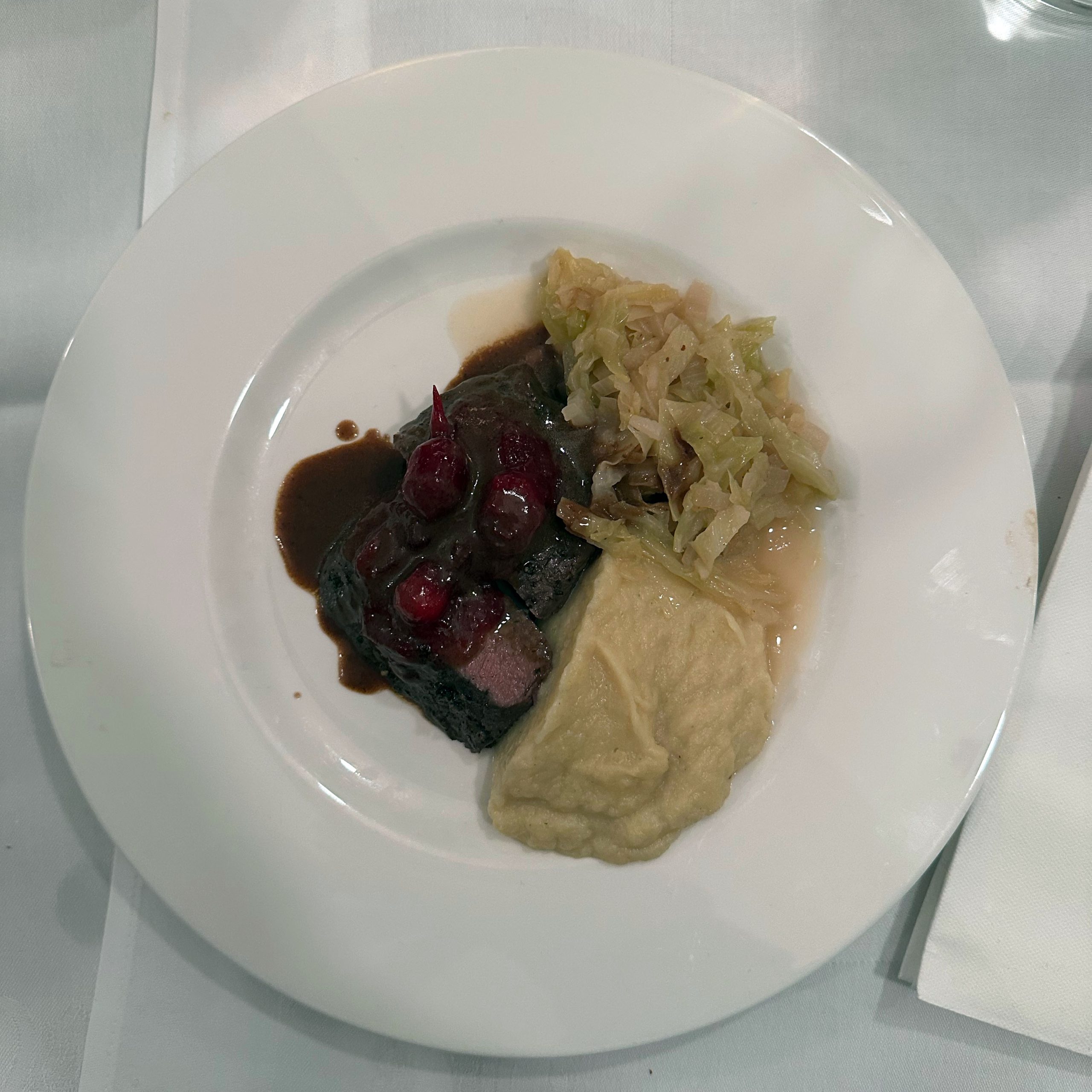 Auswärtsessen Festessen Fisch Fleisch Gedünstet Gekocht Salat Skandinavisch Winter Galerie Zagreus Johannisbeeren Kabeljau Kombu Meringue Muschelsud Parfait Pastinakenpüree Rehkeule Steinpilze