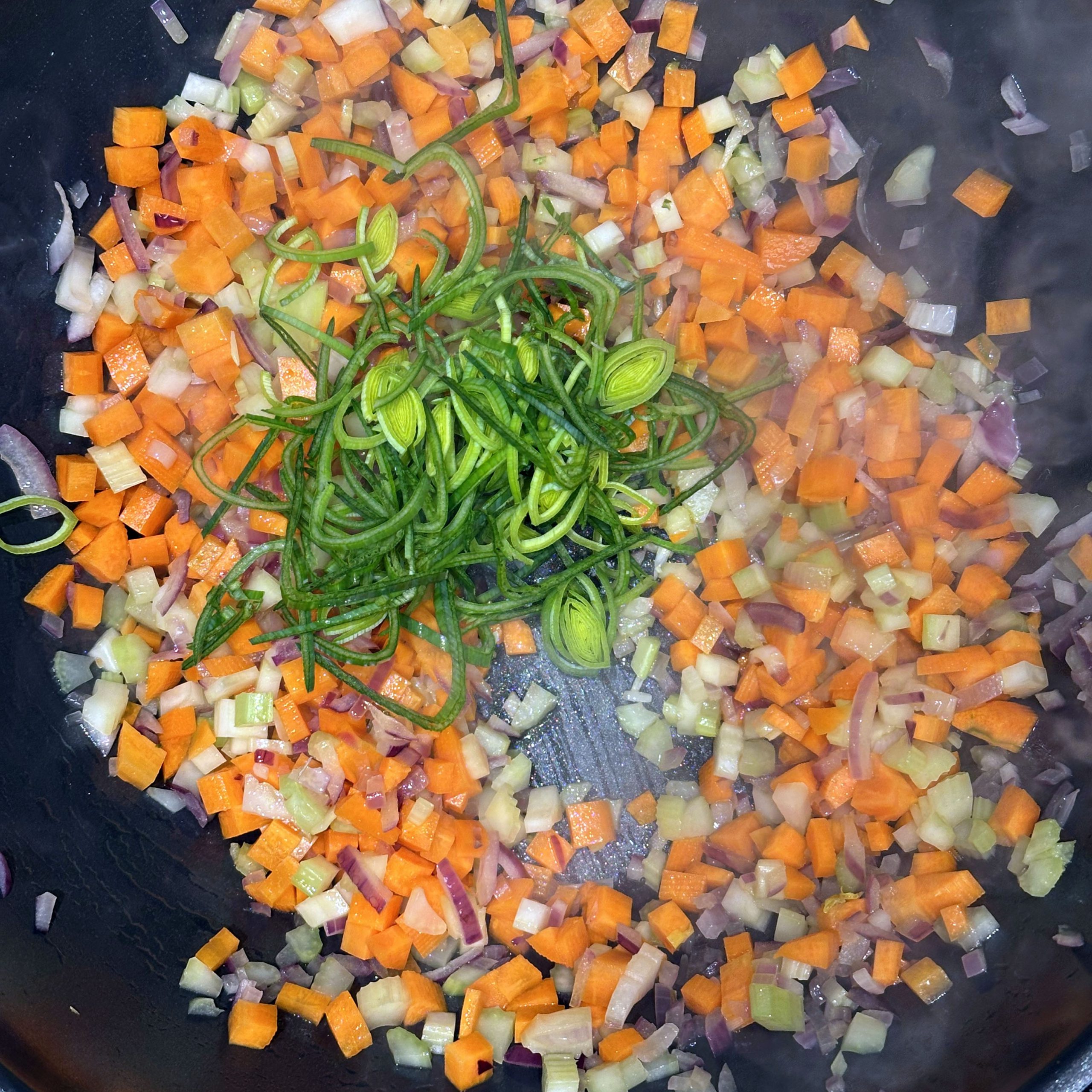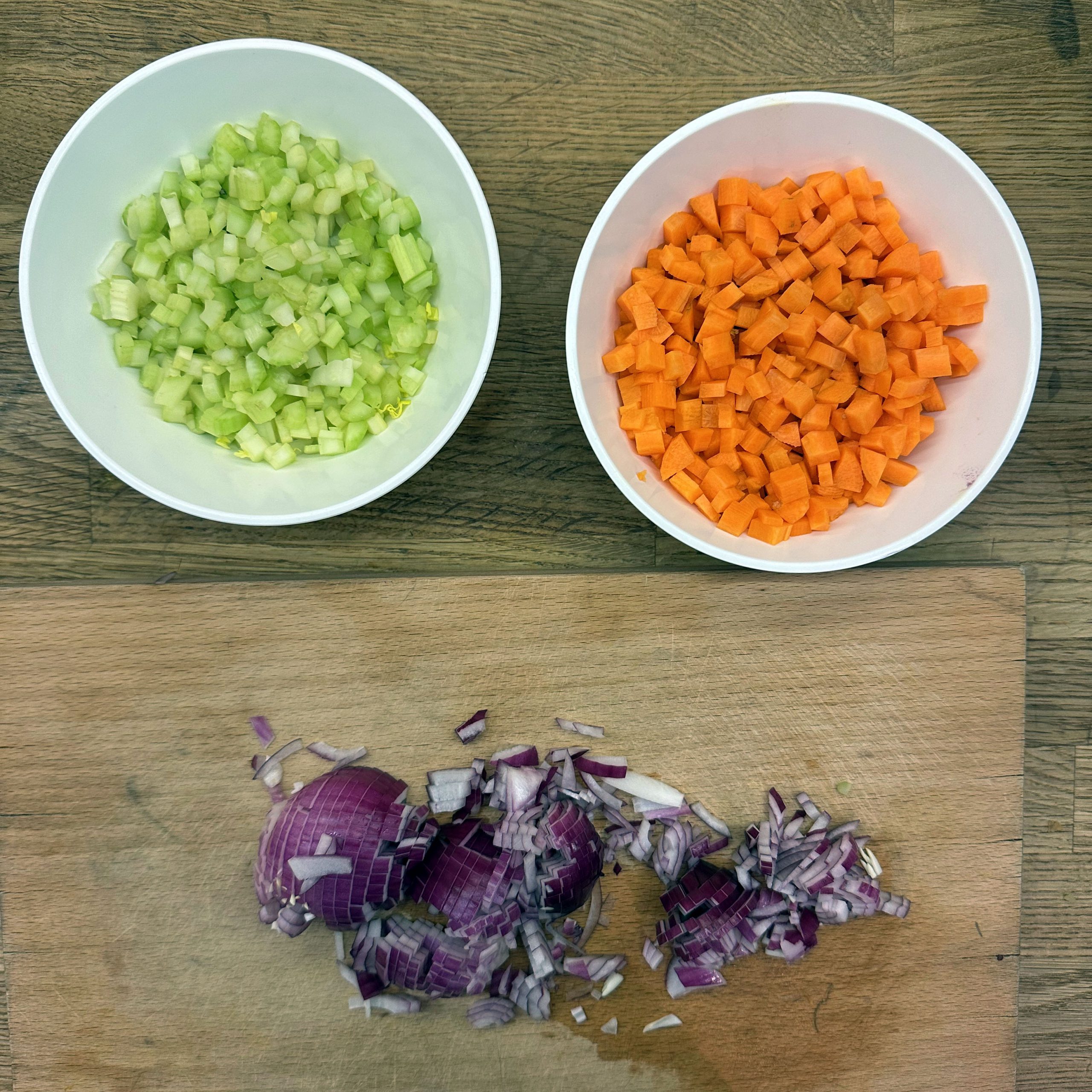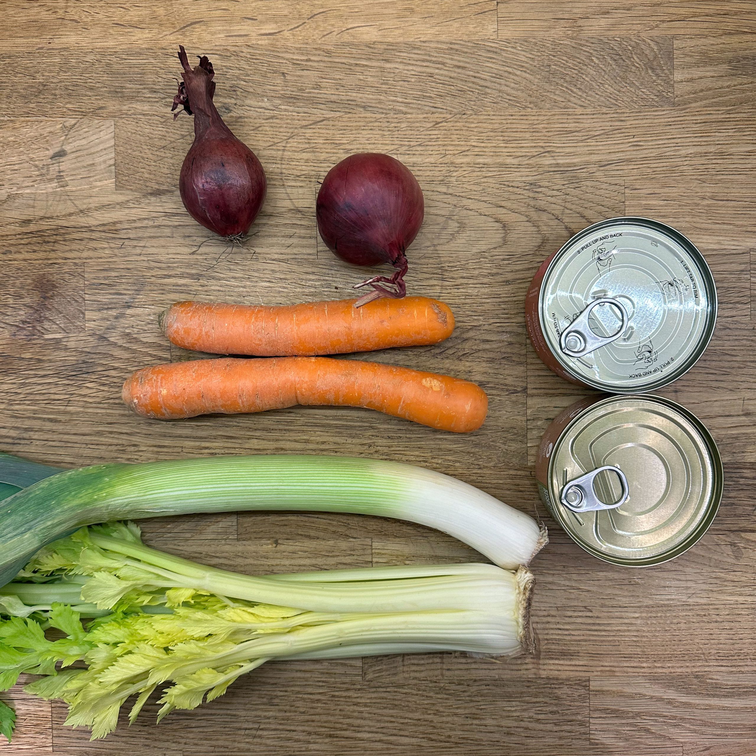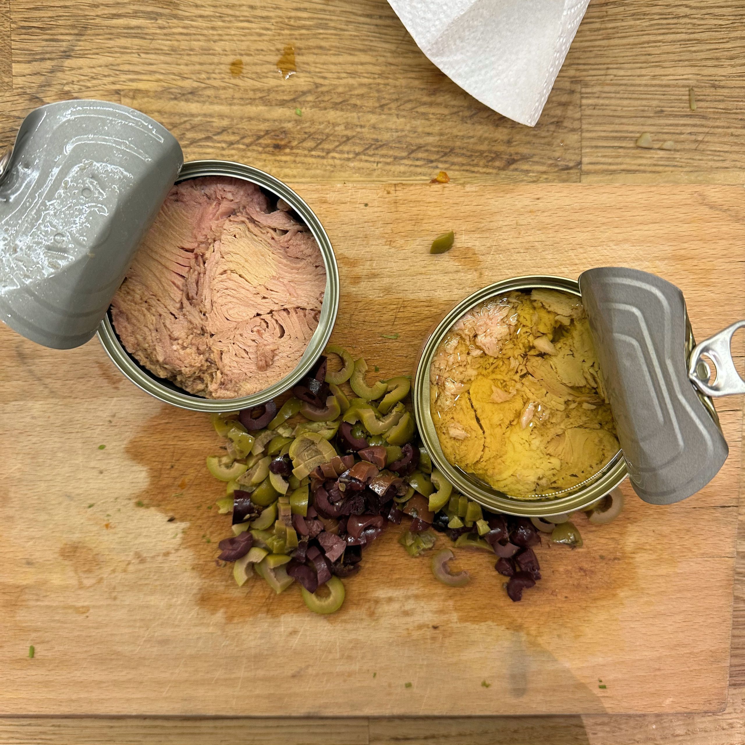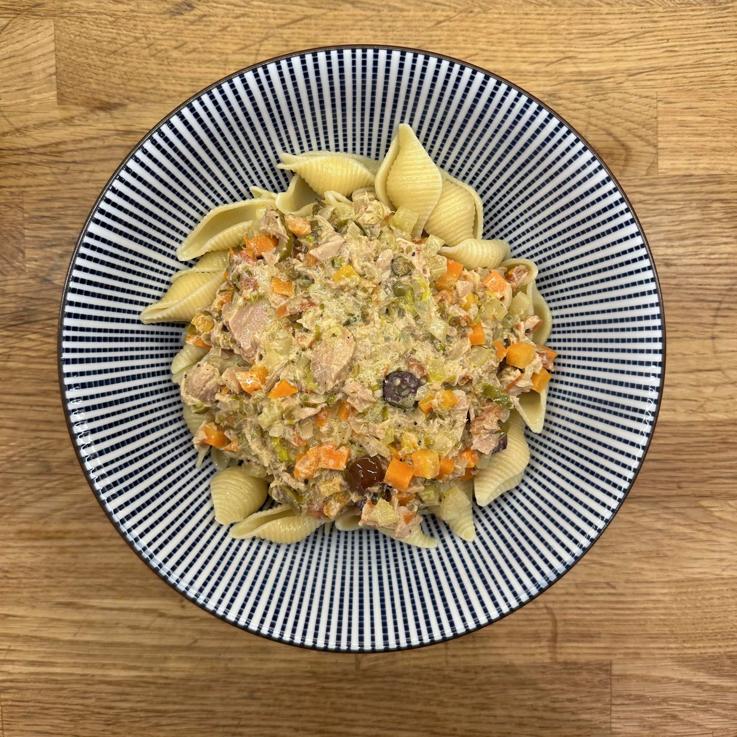 Nudeln in Salzwasser weich kochen, abschütten, mit etwas Olivenöl beträufeln. 2 Zwiebeln würfeln und in etwas Öl anbraten. 2 Möhren und 3 Selleriestangen würfeln, etwas Lauch in Ringen schneiden und 8-10min mitbraten. 1EL Kapern, 5 getrocknete Tomaten in Stücken und 50gr Oliven in Scheiben unterrühren, mit 300ml Brühe ablöschen und 10min köcheln lassen. 1 Becher Sahne einrühren, mit Salz, Pfeffer und getrockneten Kräutern abschmecken, 2 Dosen Thunfisch unterheben und nur kurz erwärmen. Nudeln mit der Thunfischsoße servieren und mit Parmesan bestreuen.