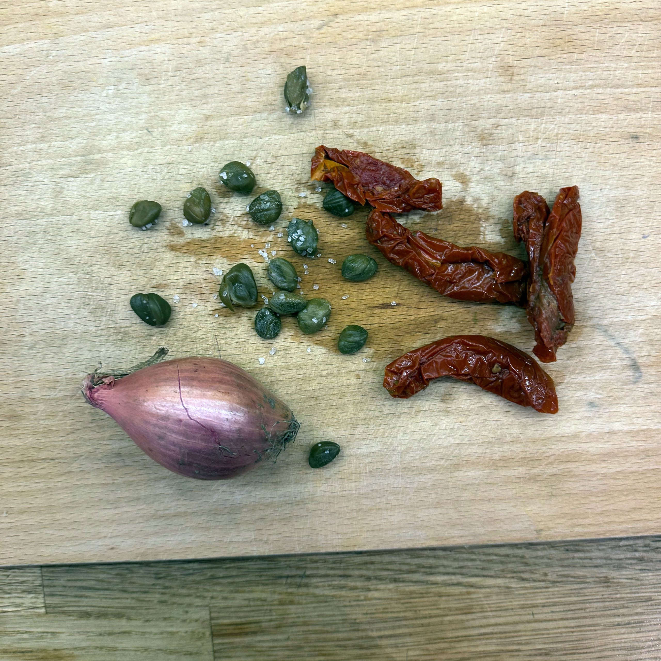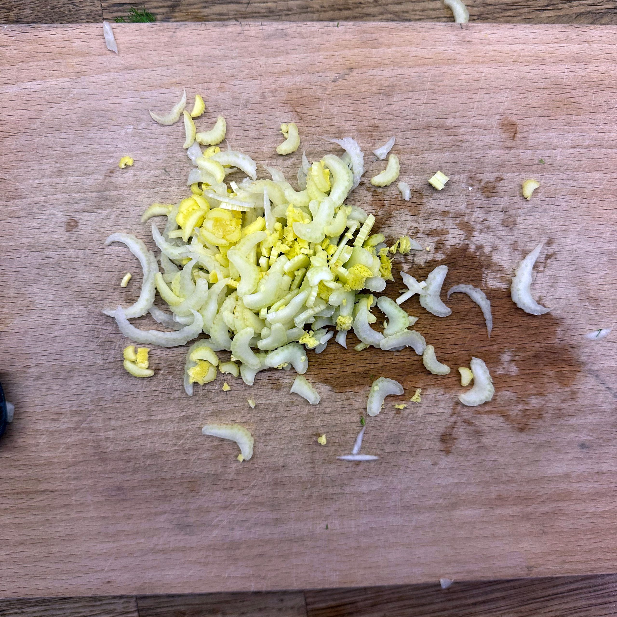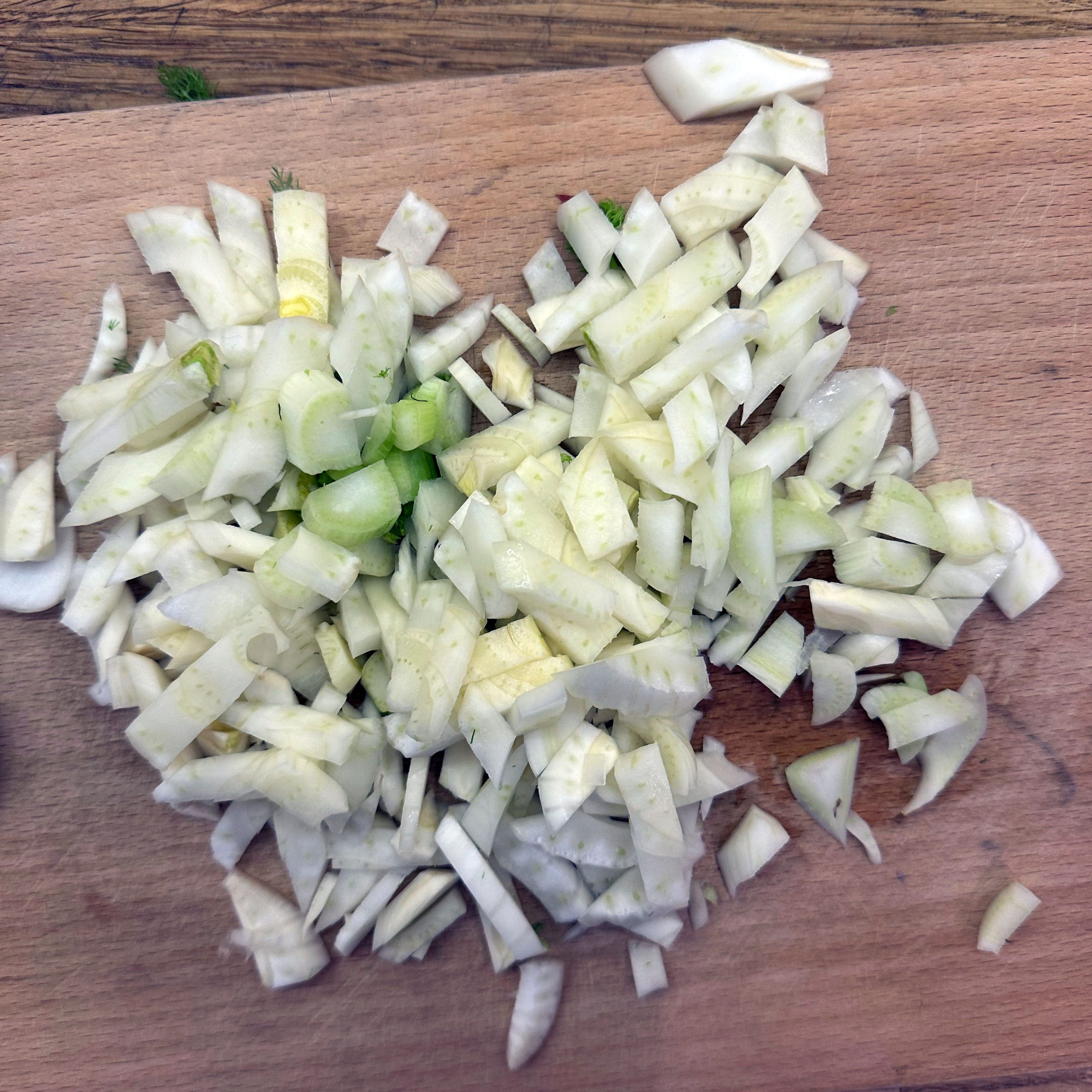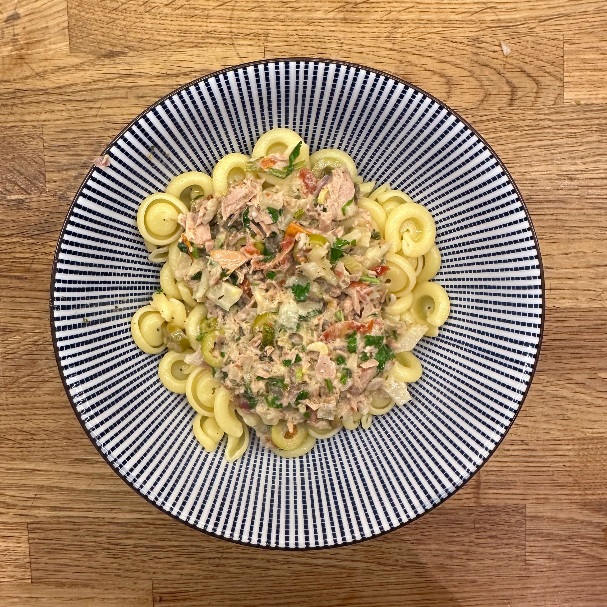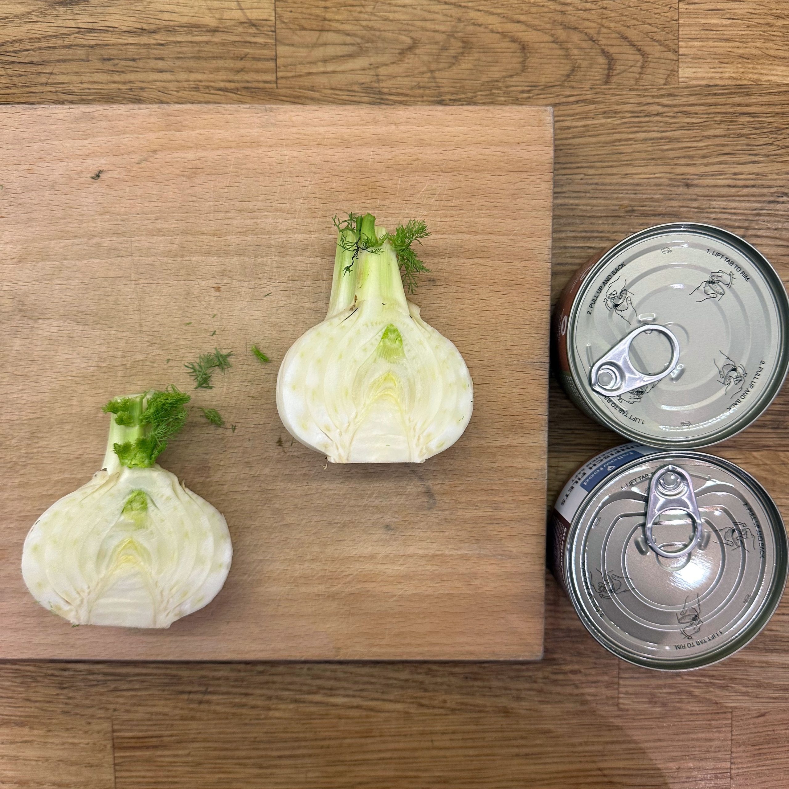 400gr Nudeln in Salzwasser al dente kochen. 1 Fenchelknolle würfeln und in etwas Öl dünsten. 2 gewürfelte Zwiebeln und 2 Stangen Sellerie in Stücken hinzufügen und anbraten. Mit 200ml Brühe ablöschen, 1EL gehackte Salzkapern, 5 getrocknete Tomaten in Stücken, Saft von 0,5 Zitrone, 100gr grüne Oliven in Scheiben und getrocknete Kräuter hinzufügen und 10min köcheln lassen. Fenchel und 1 Becher Sahne unterrühren, gehackte Petersilie und 2 Dosen Thunfisch abgetropft dazugeben und nur kurz erhitzen. Nudeln mit der Thunfischsoße auf Tellern anrichten und mit geriebenem Parmesan servieren.