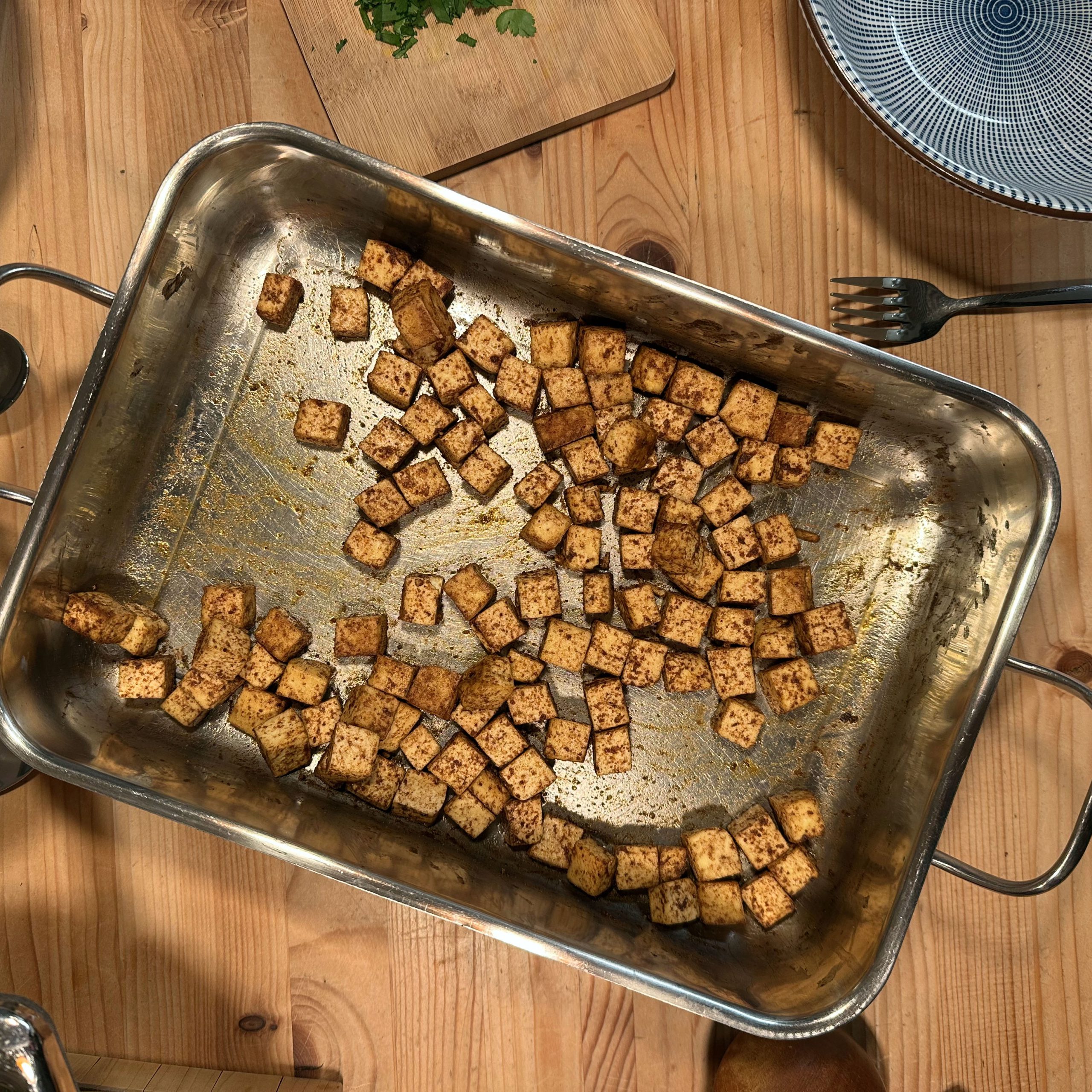 Karine kocht: 400 g Tofu trocken tupfen, in grobe Würfel schneiden, mit etwas Öl und 1 TL Garam Masala mischen und im Ofen bei 200 °C Umluft 20 min backen, bis der Tofu goldbraun ist. 200 g Buchweizen waschen, mit 400 ml Wasser und etwas Salz aufkochen und bei niedriger Hitze 15–20 min köcheln lassen. 500 g frischen Spinat waschen und in einem großen Topf mit etwas Öl erhitzen, bis er zusammengefallen ist. 300 g TK-Spinat auftauen. 1 Zwiebel würfeln und in 2 EL Rapsöl glasig dünsten, ein Stück Ingwer fein hacken und kurz mitbraten. 150 ml passierte Tomaten, 100 ml Wasser, 1 Prise Chilipulver, 2 Kardamomkapseln, 1 TL Kreuzkümmel, 1 TL gemahlene Koriandersamen, 0,25 TL Zimt und 0,5 TL Salz einrühren und 2 min schmoren lassen. TK-Spinat und frischen Spinat zugeben, alles gut vermengen und einige Minuten köcheln lassen. Kardamomkapseln entfernen, gebackenen Tofu unterheben und mit Buchweizen servieren.