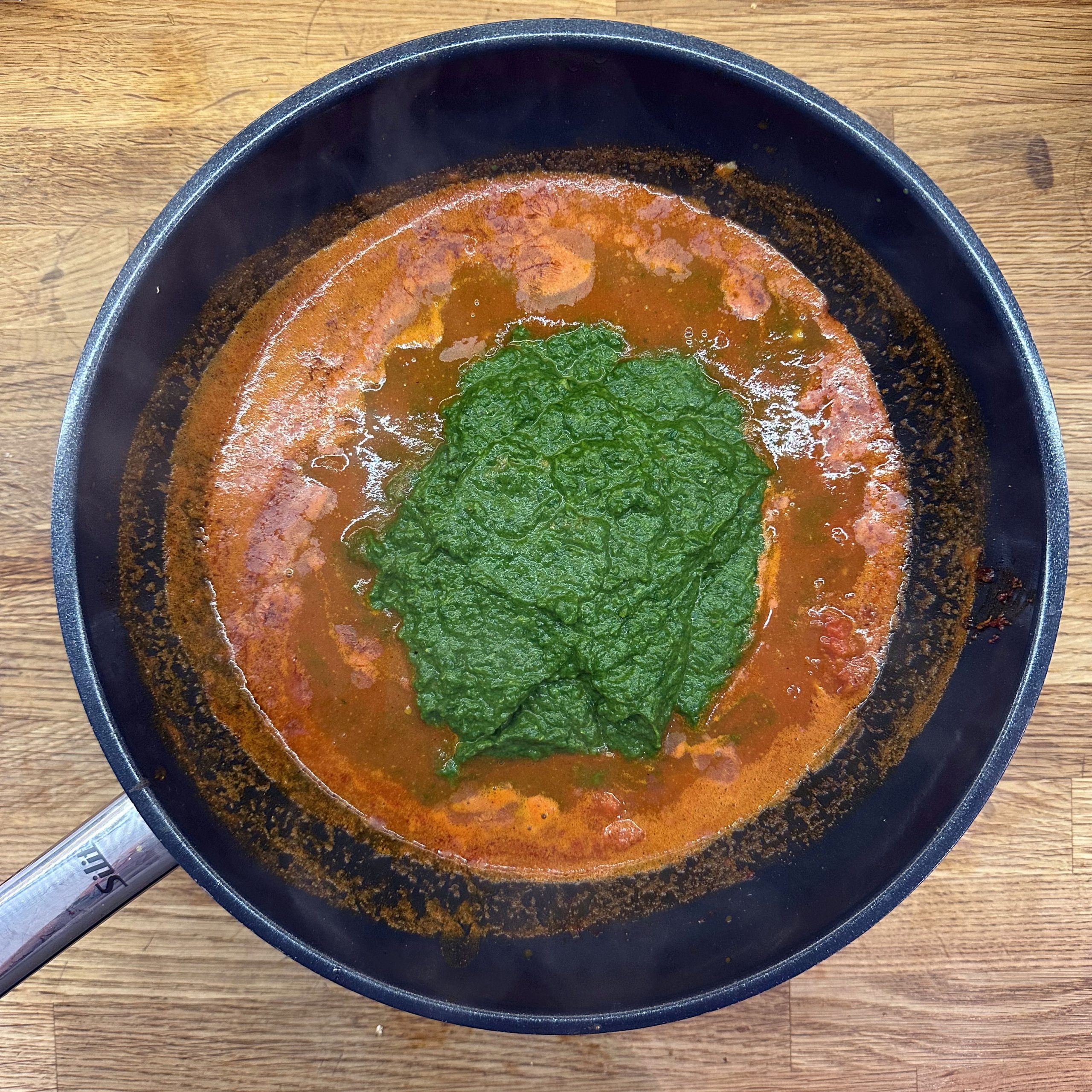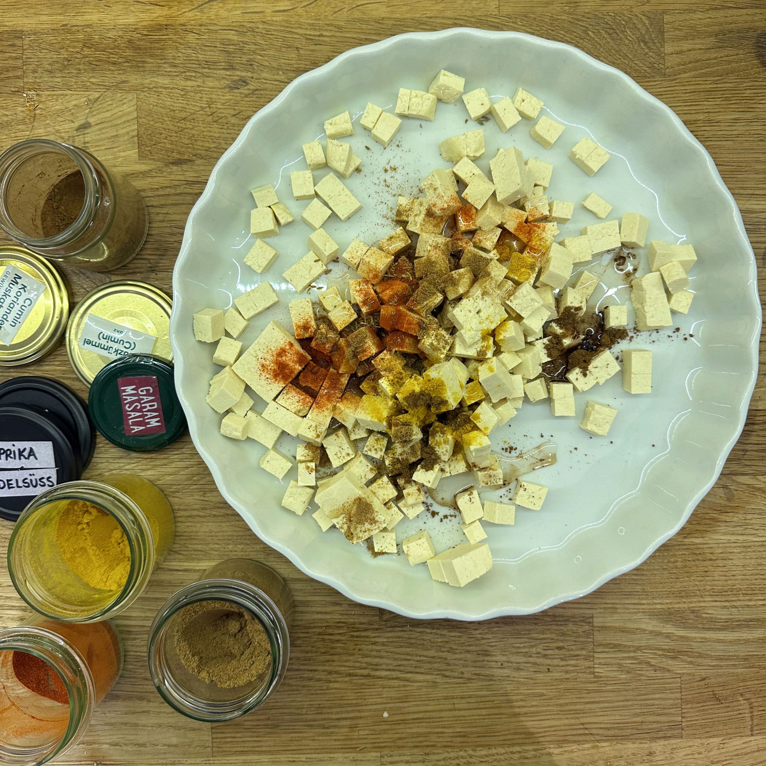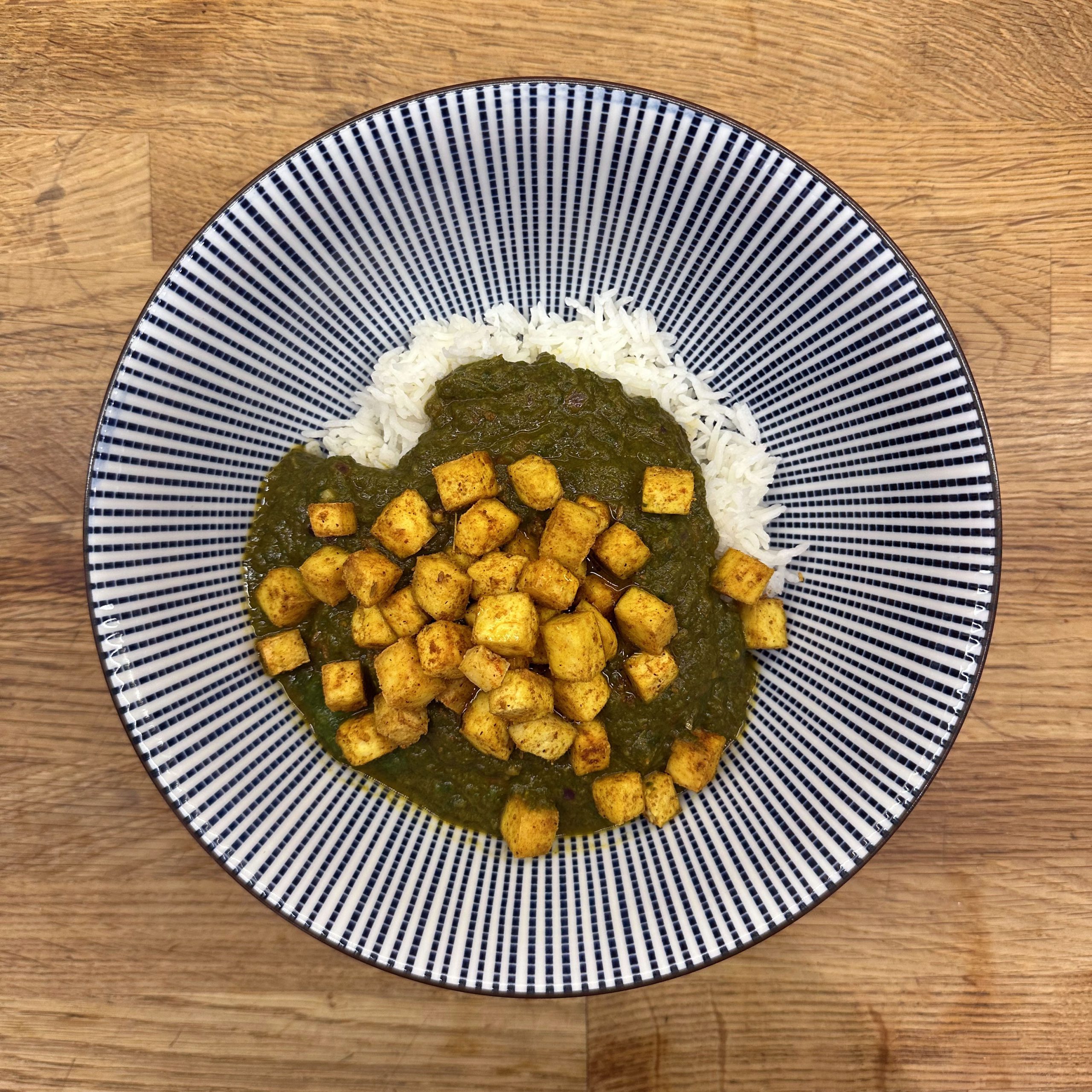 1 Tasse Basmatireis waschen, mit 1,5 Tassen Wasser und etwas Salz aufkochen, Hitze reduzieren und 35 min köcheln lassen. 400 g Tofu gut abtrocknen, in Würfel schneiden, mit etwas Öl, 1 TL Cumin und 1 TL Garam Masala vermengen und bei 200 °C Umluft 25 min im Ofen garen, dabei immer wieder umrühren. 450 g TK-Spinat auftauen. Gewürzmischung aus Garam Masala, Cumin, Kardamom, Koriander, Kurkuma, Nelken, Muskatnuss, Curry, Paprika und Salz mischen. 2 Zwiebeln und 1 daumengroßes Stück Ingwer klein schneiden und in Kokosöl bei mittlerer Hitze 10 min braten, Gewürzmischung unterrühren und kurz mitbraten, dann 2 EL Tomatenmark und 1 Dose Tomaten einrühren, 100 ml Brühe zugeben und 20 min köcheln lassen. Die Hälfte des Spinats in die Tomatensoße geben und fein pürieren, restlichen Spinat einrühren und nochmals erhitzen, Saft von 1 Limette unterrühren und abschmecken. Reis und Palak in Schüsseln verteilen, Ofentofu daraufgeben und mit Kokosjoghurt sowie scharfem Öl servieren.