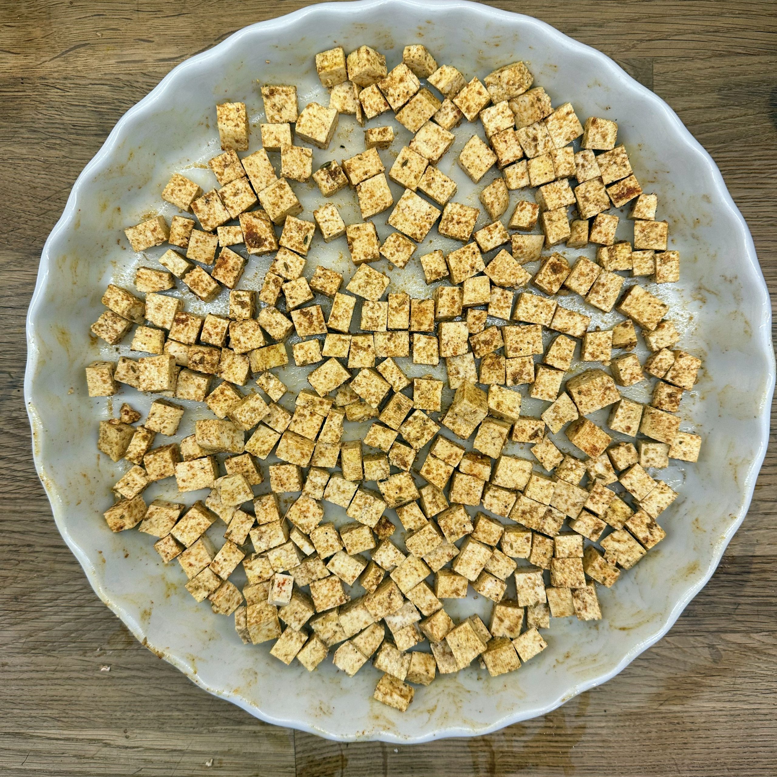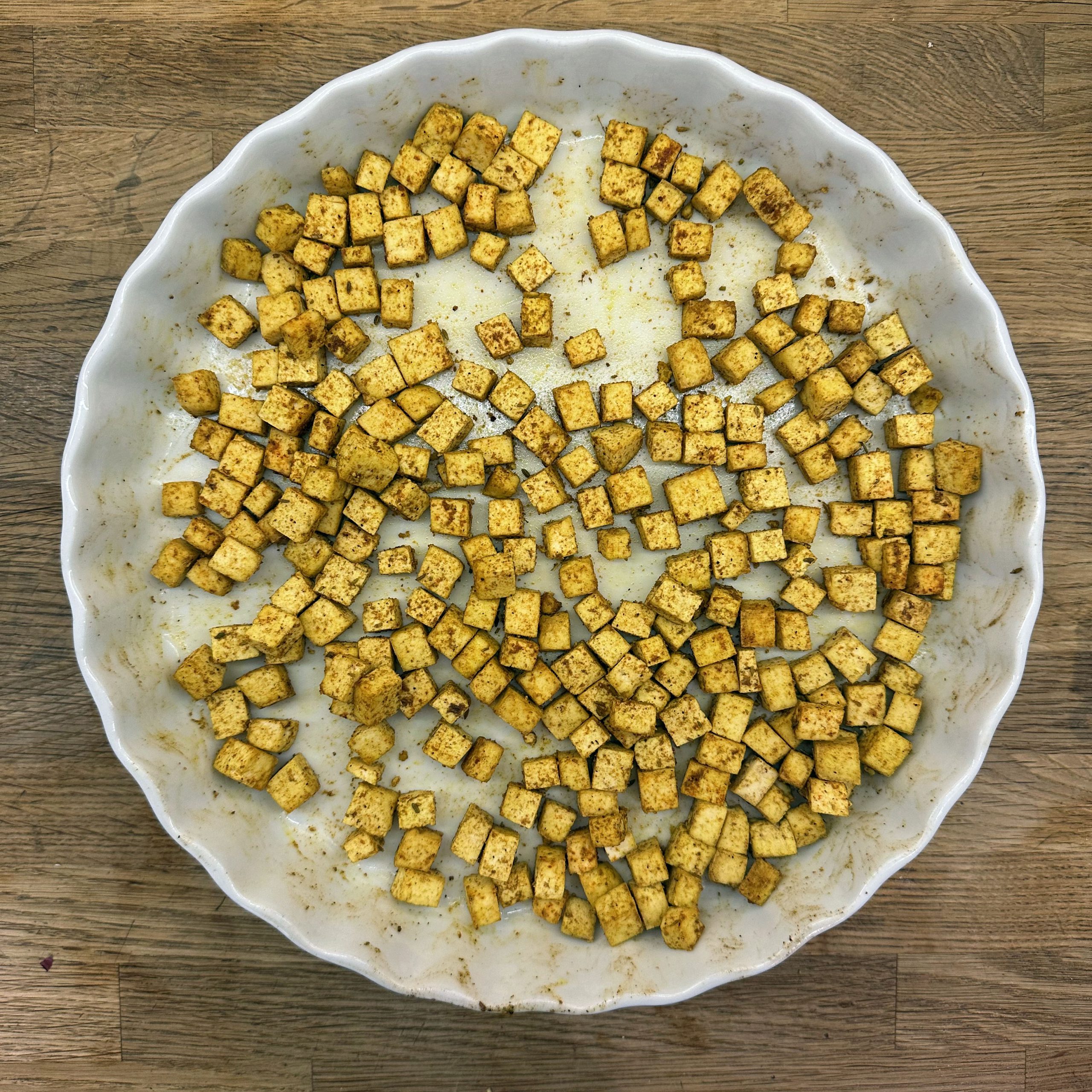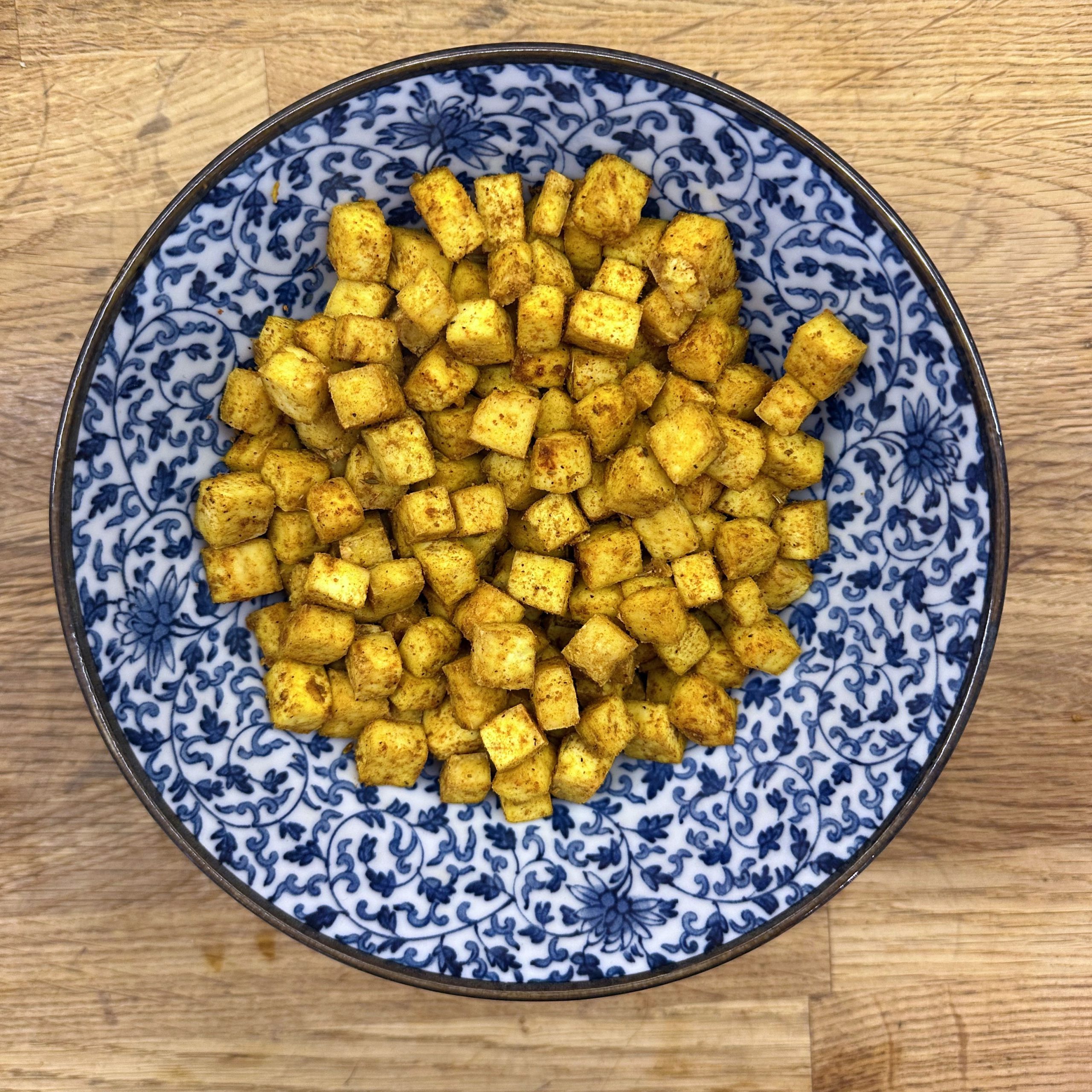 1 Tasse Basmatireis waschen, mit 1,5 Tassen Wasser und etwas Salz aufkochen, Hitze reduzieren und 35 min köcheln lassen. 400 g Tofu gut abtrocknen, in Würfel schneiden, mit etwas Öl, 1 TL Cumin und 1 TL Garam Masala vermengen und bei 200 °C Umluft 25 min im Ofen garen, dabei immer wieder umrühren. 450 g TK-Spinat auftauen. Gewürzmischung aus Garam Masala, Cumin, Kardamom, Koriander, Kurkuma, Nelken, Muskatnuss, Curry, Paprika und Salz mischen. 2 Zwiebeln und 1 daumengroßes Stück Ingwer klein schneiden und in Kokosöl bei mittlerer Hitze 10 min braten, Gewürzmischung unterrühren und kurz mitbraten, dann 2 EL Tomatenmark und 1 Dose Tomaten einrühren, 100 ml Brühe zugeben und 20 min köcheln lassen. Die Hälfte des Spinats in die Tomatensoße geben und fein pürieren, restlichen Spinat einrühren und nochmals erhitzen, Saft von 1 Limette unterrühren und abschmecken. Reis und Palak in Schüsseln verteilen, Ofentofu daraufgeben und mit Kokosjoghurt sowie scharfem Öl servieren.