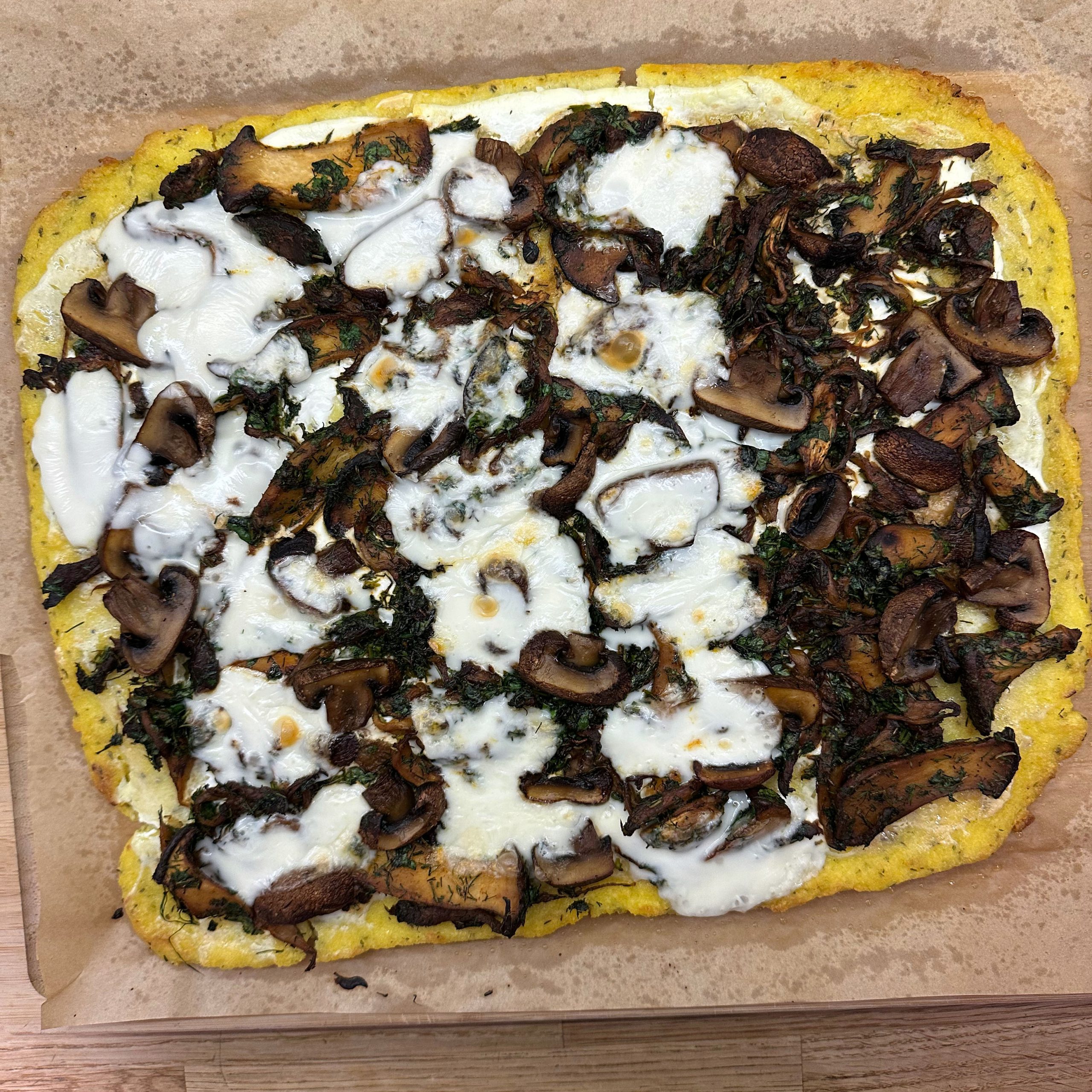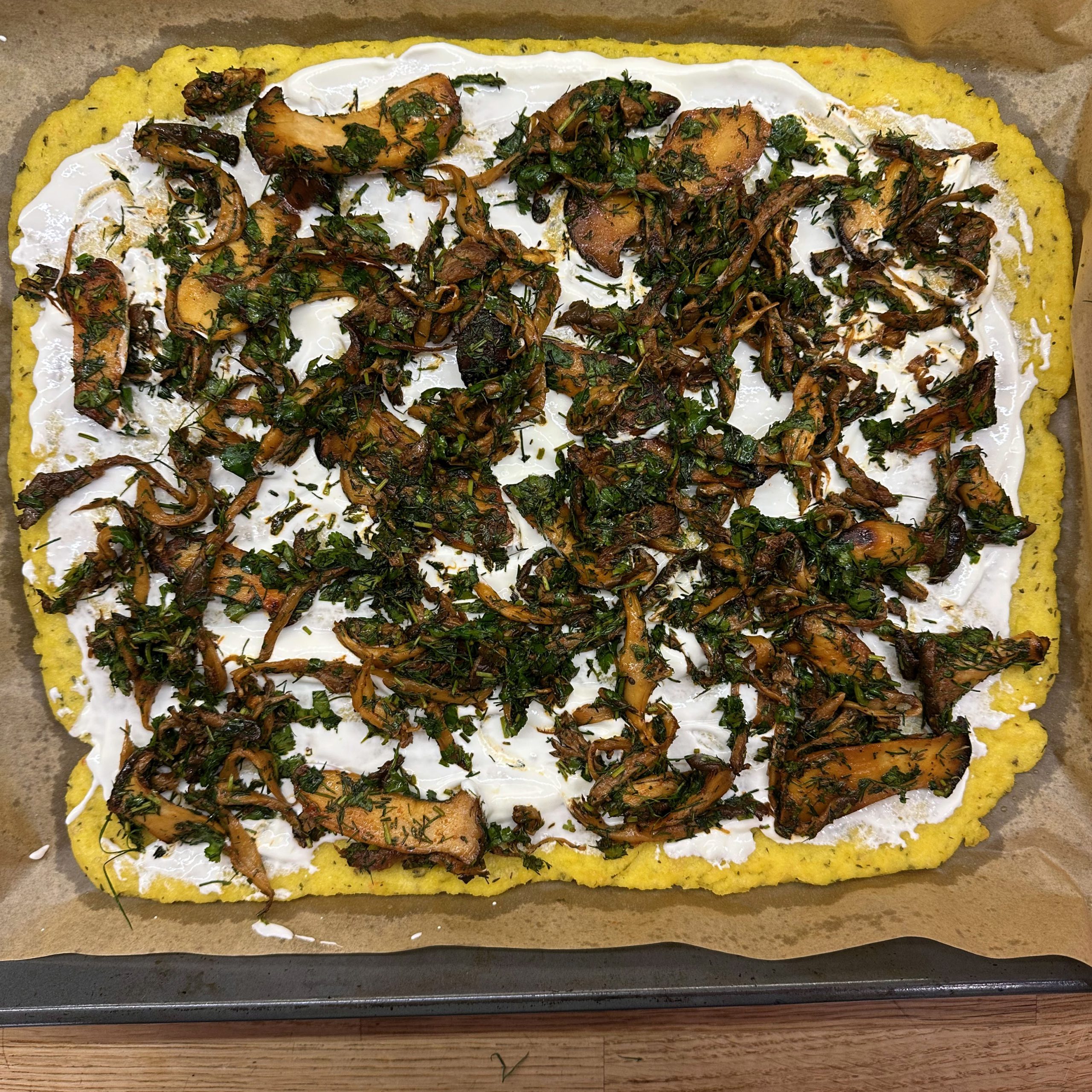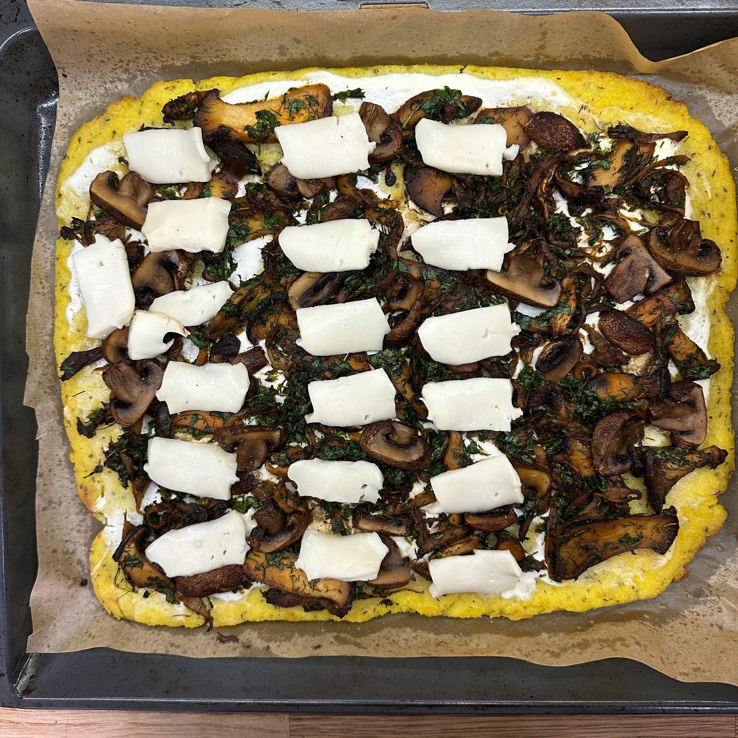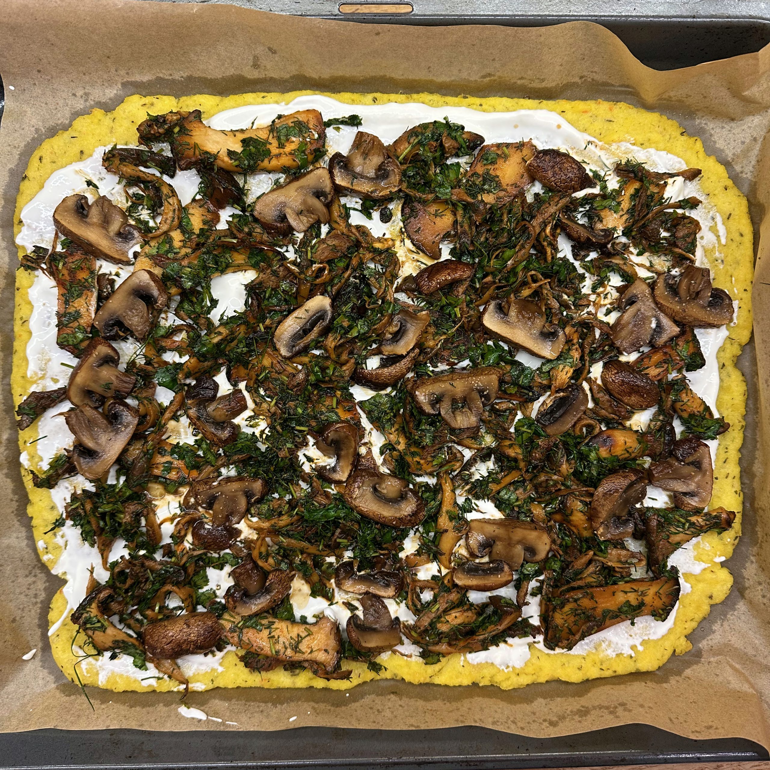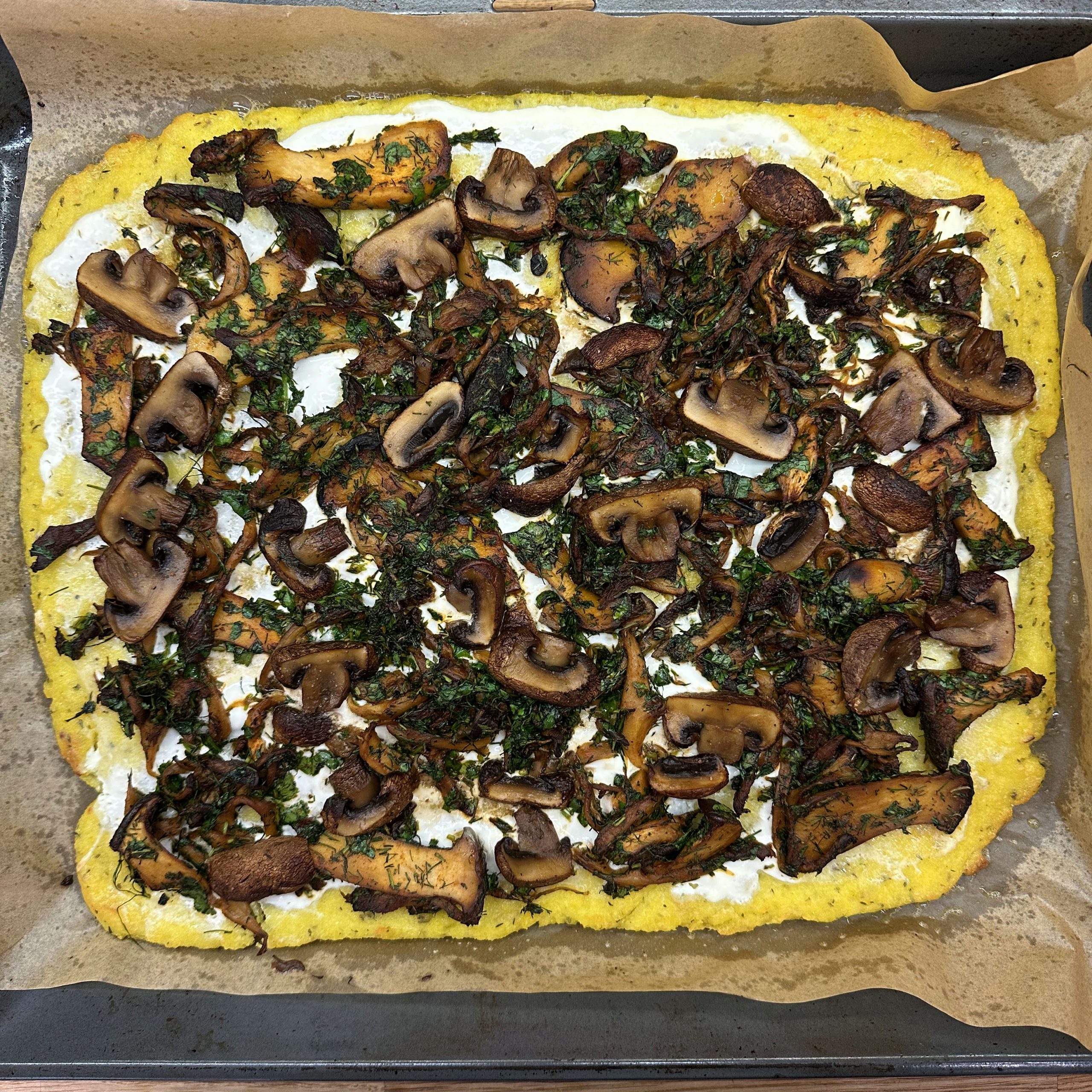 300 g Champignons ganz mit dem Kopf nach unten auf ein Blech setzen, mit etwas Öl beträufeln und salzen, bei 200 °C Umluft 30 Min. backen, etwas abkühlen lassen und in Scheiben schneiden. 300 g Austernpilze in Stücke zupfen und in etwas Öl kräftig anbraten, bis sie braune Stellen bekommen. 300 g Kräuterseitlinge in Scheiben schneiden und in etwas Öl von beiden Seiten 5–6 Min. braun braten. Alle Pilze mit Sojasoße marinieren. Koriander, Thymian, Dill und Petersilie hacken und unter die Pilze mischen. 400 ml Brühe aufkochen, 250 g Minutenpolenta unter ständigem Rühren einrieseln lassen und gut durchrühren, mit Kräutern der Provence würzen, 1 Becher Sahne und 40 g Butter unterrühren. Polenta auf ein mit Backpapier belegtes Blech gleichmäßig ausstreichen und bei 200 °C Umluft 15 Min. vorbacken. Polenta mit saurer Sahne bestreichen, die marinierten Pilze mit Kräutern darauf verteilen, 200 g Taleggio in Scheiben darauflegen und im Ofen grillen, bis der Käse Blasen schlägt. Polenta in Stücke schneiden und auf Tellern anrichten.