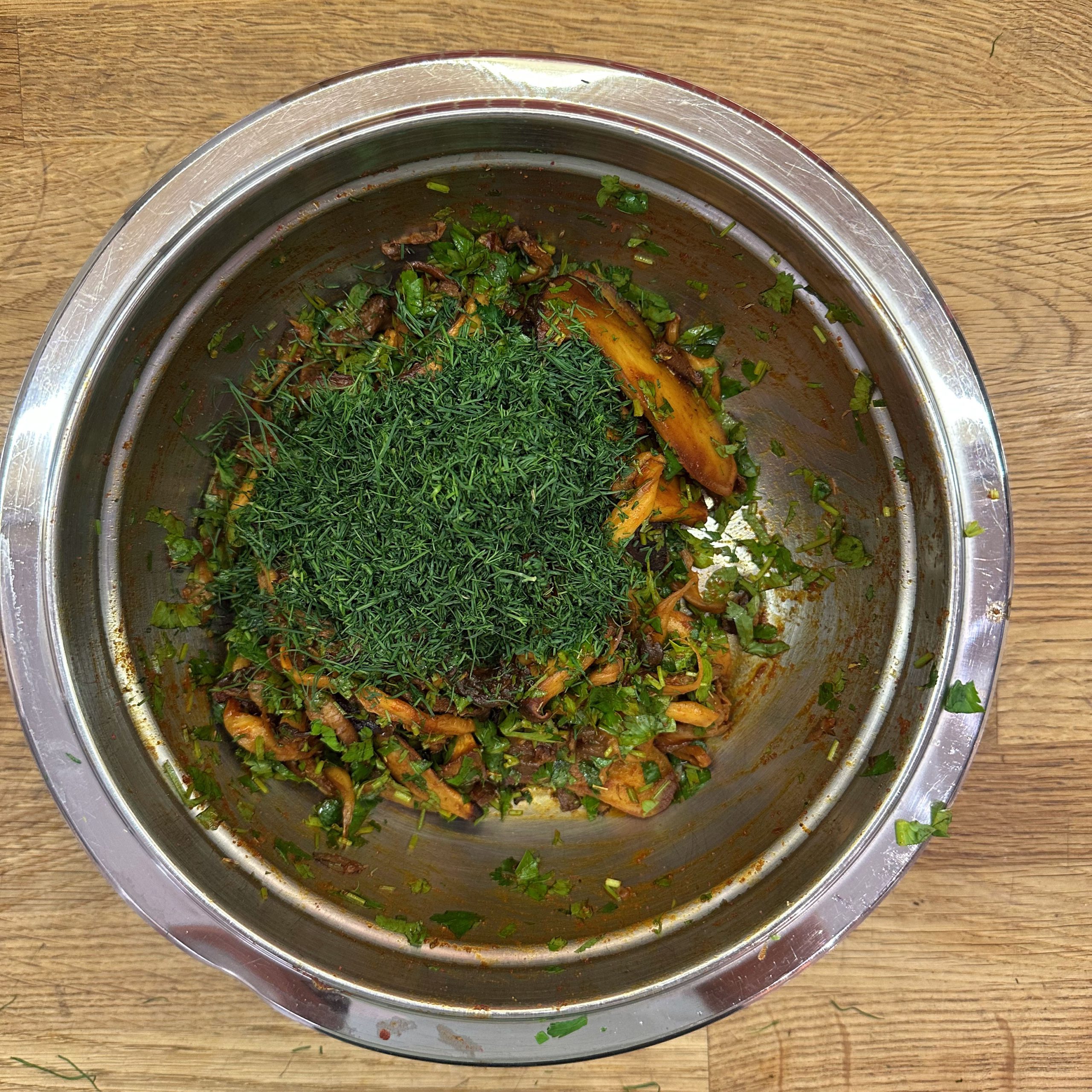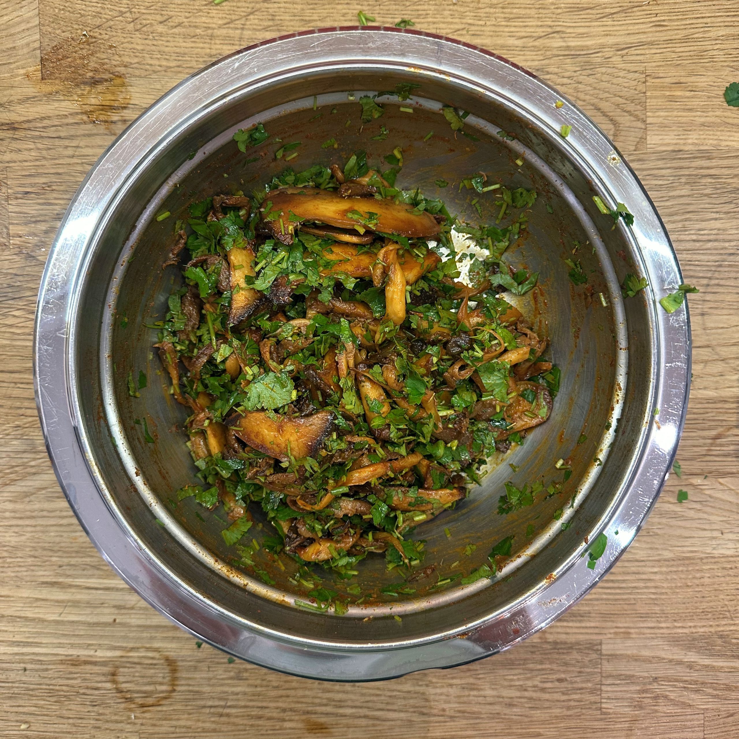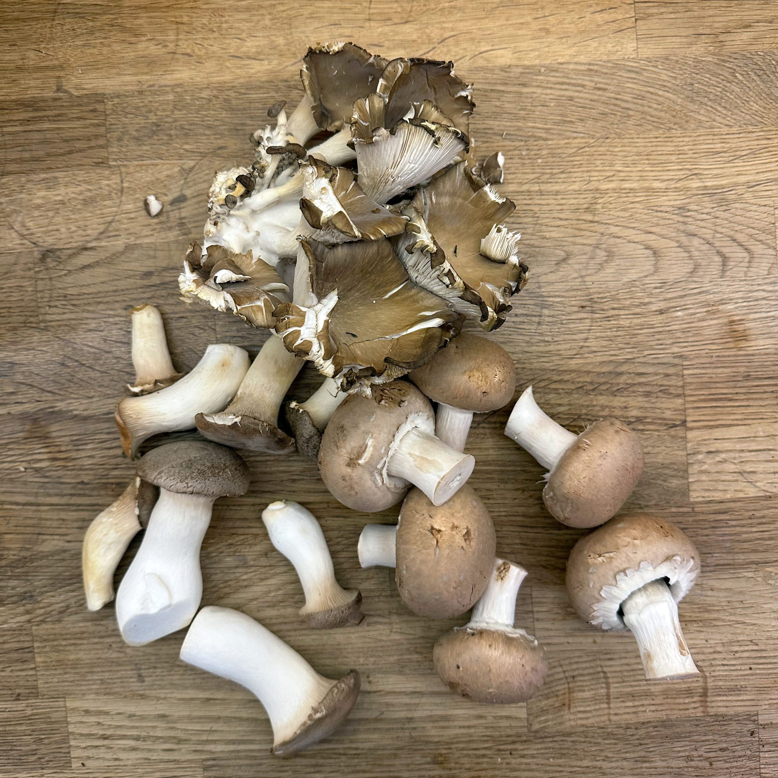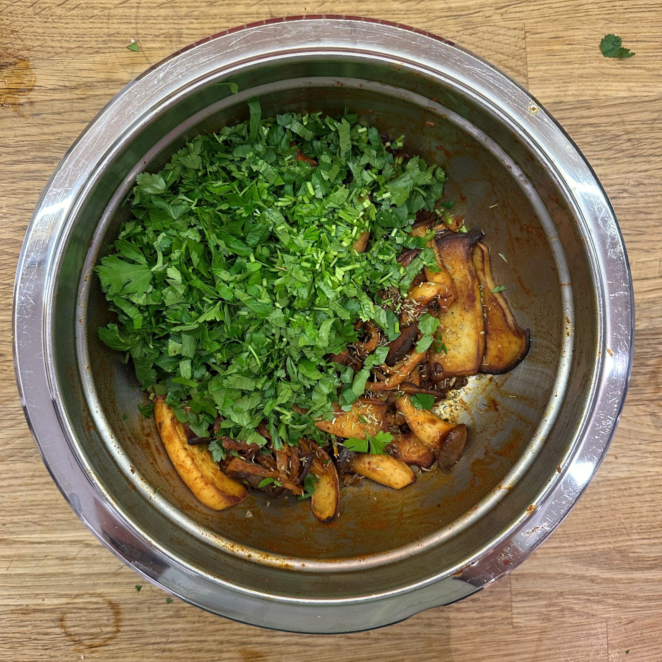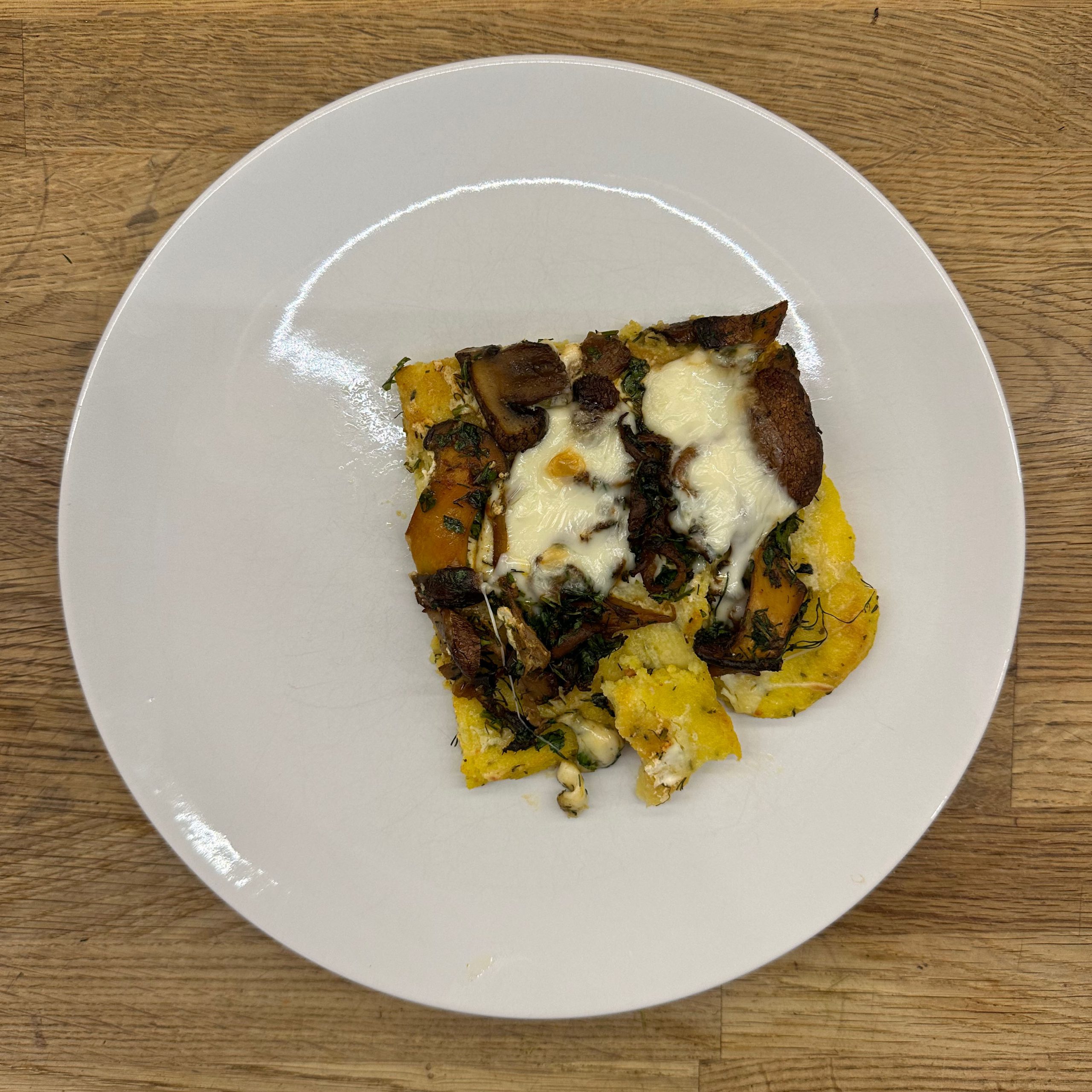 300 g Champignons ganz mit dem Kopf nach unten auf ein Blech setzen, mit etwas Öl beträufeln und salzen, bei 200 °C Umluft 30 Min. backen, etwas abkühlen lassen und in Scheiben schneiden. 300 g Austernpilze in Stücke zupfen und in etwas Öl kräftig anbraten, bis sie braune Stellen bekommen. 300 g Kräuterseitlinge in Scheiben schneiden und in etwas Öl von beiden Seiten 5–6 Min. braun braten. Alle Pilze mit Sojasoße marinieren. Koriander, Thymian, Dill und Petersilie hacken und unter die Pilze mischen. 400 ml Brühe aufkochen, 250 g Minutenpolenta unter ständigem Rühren einrieseln lassen und gut durchrühren, mit Kräutern der Provence würzen, 1 Becher Sahne und 40 g Butter unterrühren. Polenta auf ein mit Backpapier belegtes Blech gleichmäßig ausstreichen und bei 200 °C Umluft 15 Min. vorbacken. Polenta mit saurer Sahne bestreichen, die marinierten Pilze mit Kräutern darauf verteilen, 200 g Taleggio in Scheiben darauflegen und im Ofen grillen, bis der Käse Blasen schlägt. Polenta in Stücke schneiden und auf Tellern anrichten.