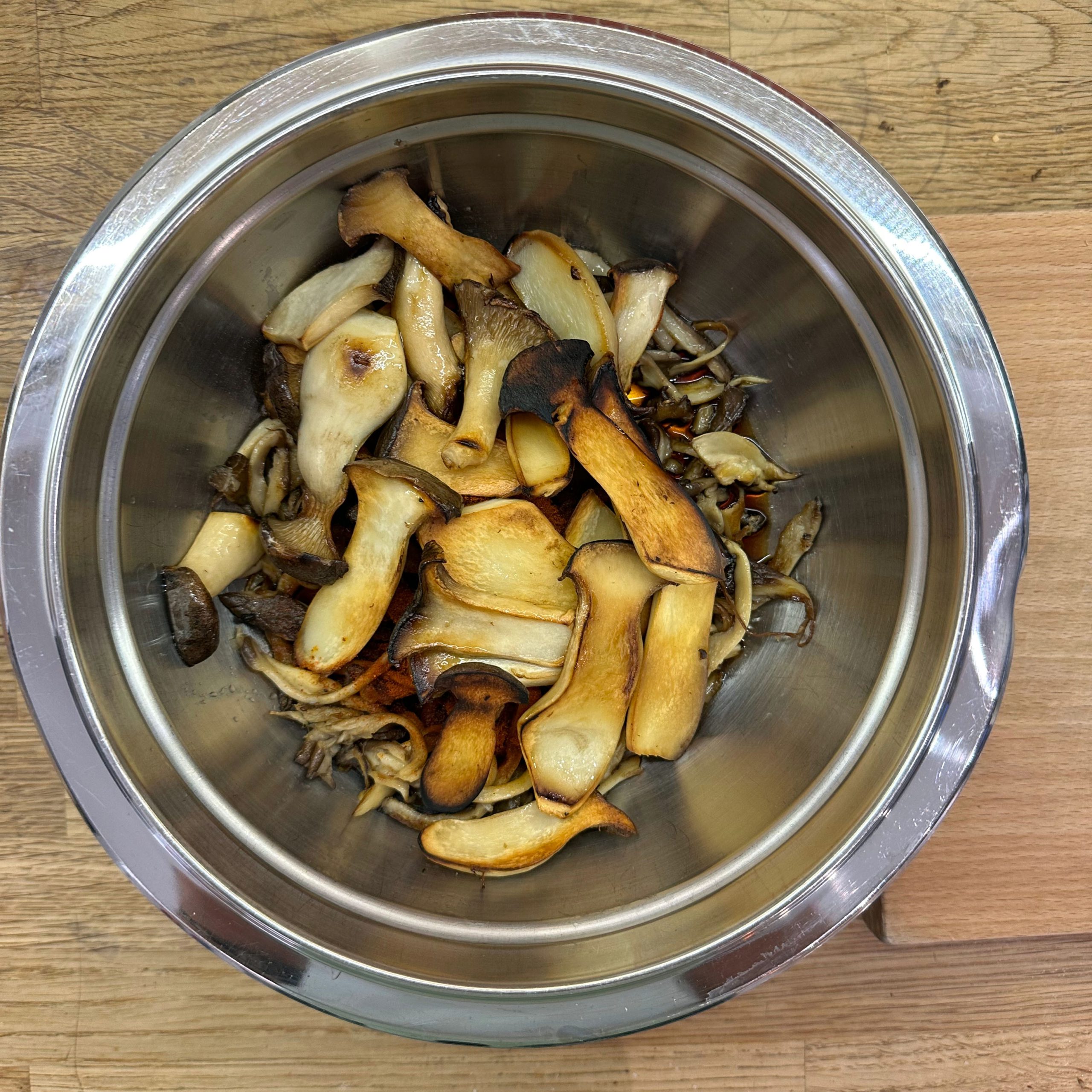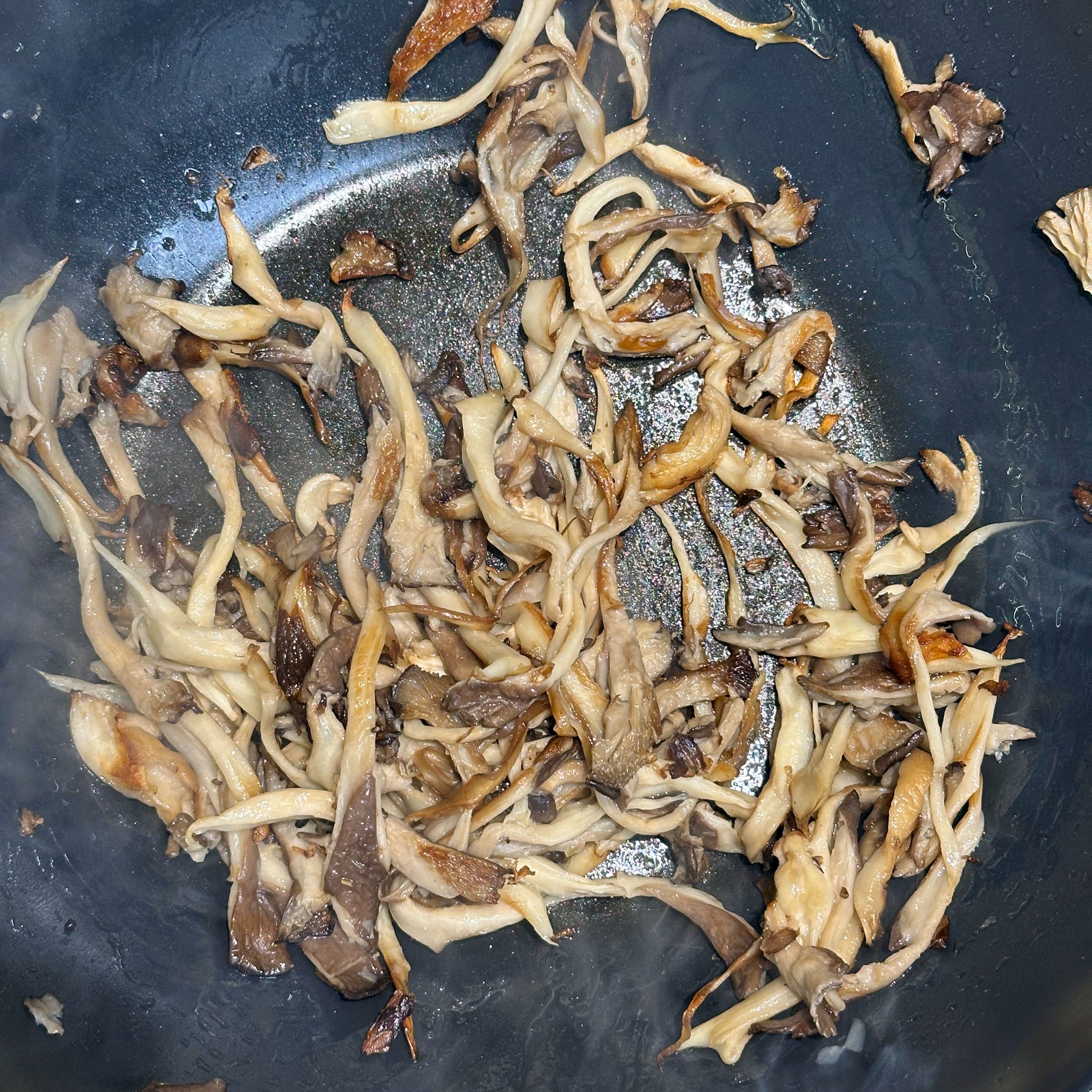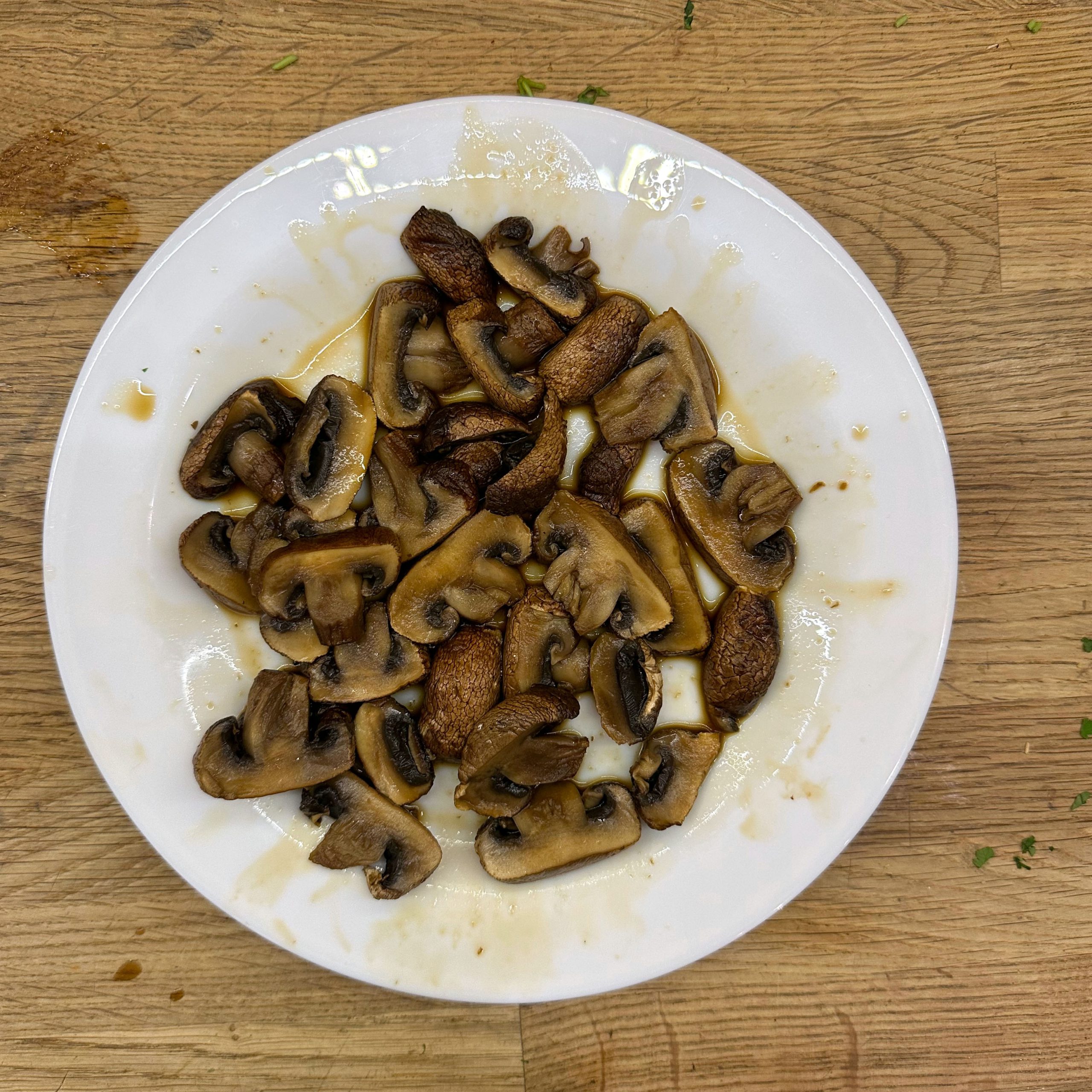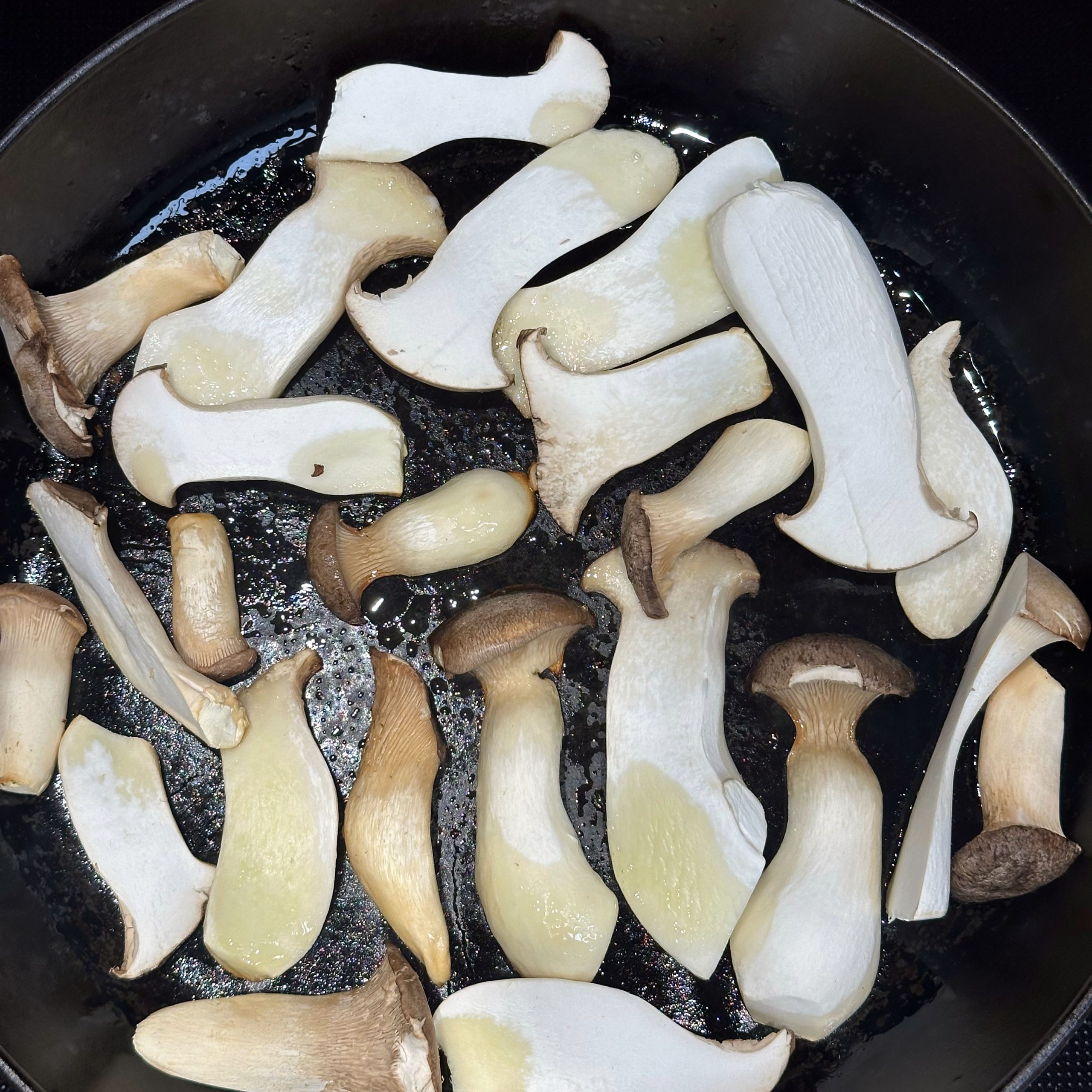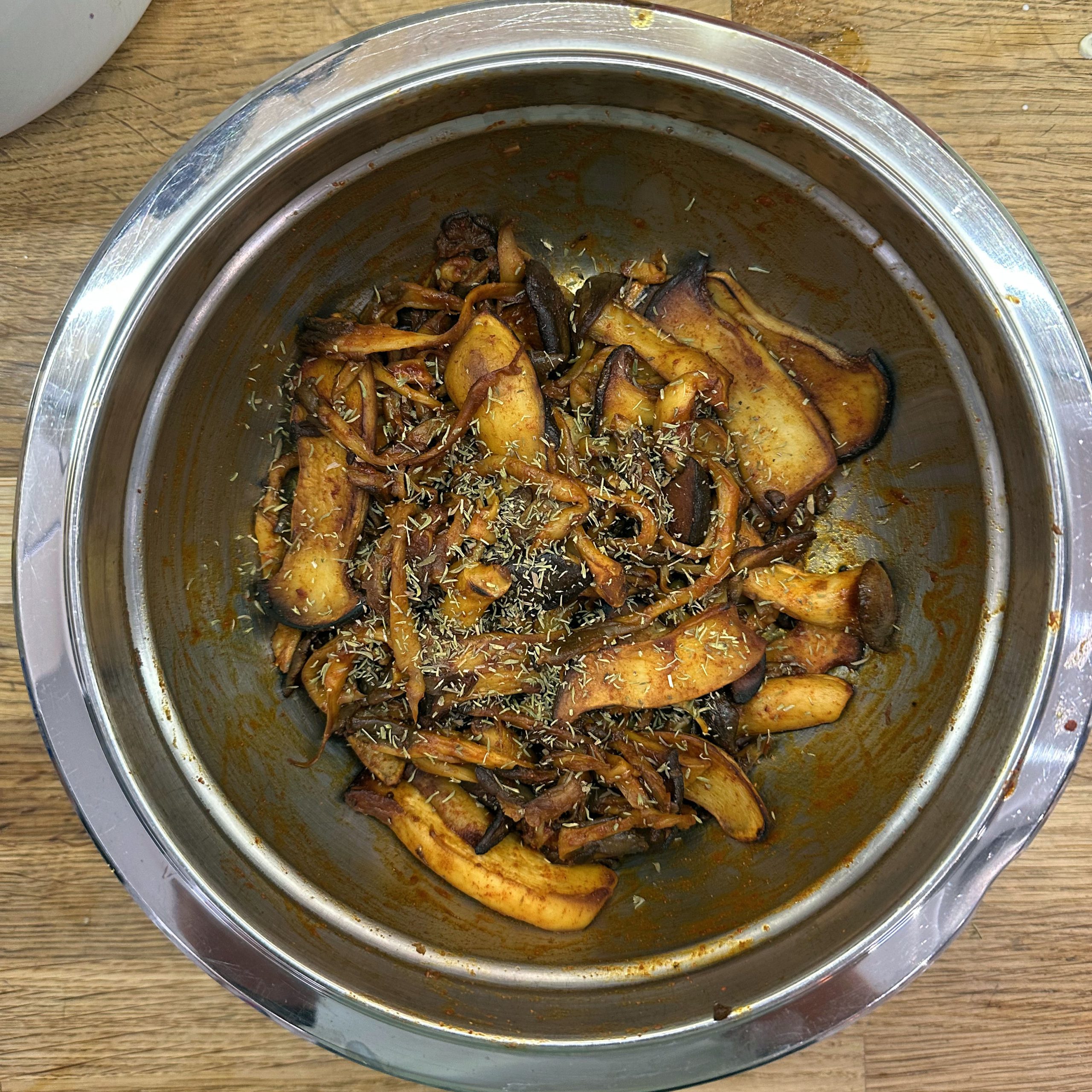 300 g Champignons ganz mit dem Kopf nach unten auf ein Blech setzen, mit etwas Öl beträufeln und salzen, bei 200 °C Umluft 30 Min. backen, etwas abkühlen lassen und in Scheiben schneiden. 300 g Austernpilze in Stücke zupfen und in etwas Öl kräftig anbraten, bis sie braune Stellen bekommen. 300 g Kräuterseitlinge in Scheiben schneiden und in etwas Öl von beiden Seiten 5–6 Min. braun braten. Alle Pilze mit Sojasoße marinieren. Koriander, Thymian, Dill und Petersilie hacken und unter die Pilze mischen. 400 ml Brühe aufkochen, 250 g Minutenpolenta unter ständigem Rühren einrieseln lassen und gut durchrühren, mit Kräutern der Provence würzen, 1 Becher Sahne und 40 g Butter unterrühren. Polenta auf ein mit Backpapier belegtes Blech gleichmäßig ausstreichen und bei 200 °C Umluft 15 Min. vorbacken. Polenta mit saurer Sahne bestreichen, die marinierten Pilze mit Kräutern darauf verteilen, 200 g Taleggio in Scheiben darauflegen und im Ofen grillen, bis der Käse Blasen schlägt. Polenta in Stücke schneiden und auf Tellern anrichten.