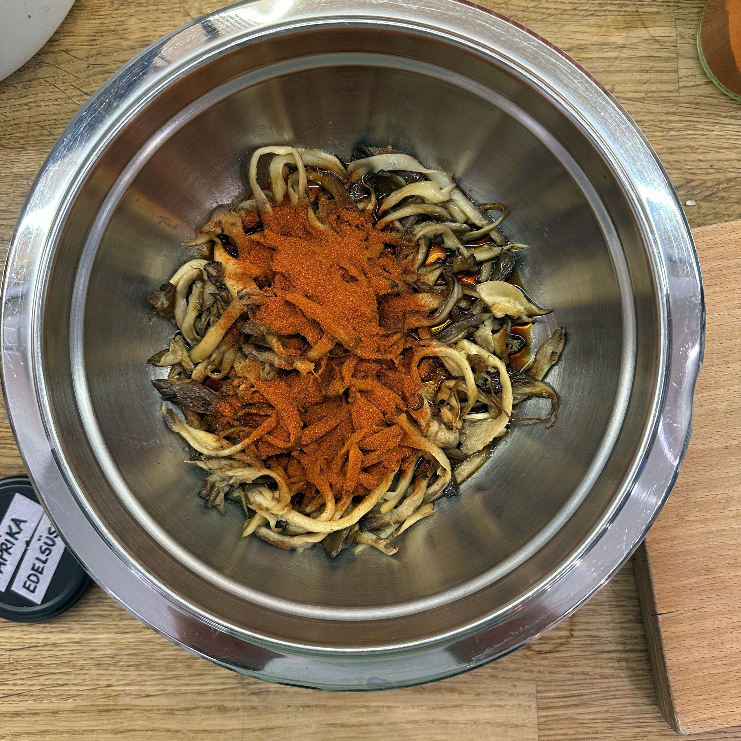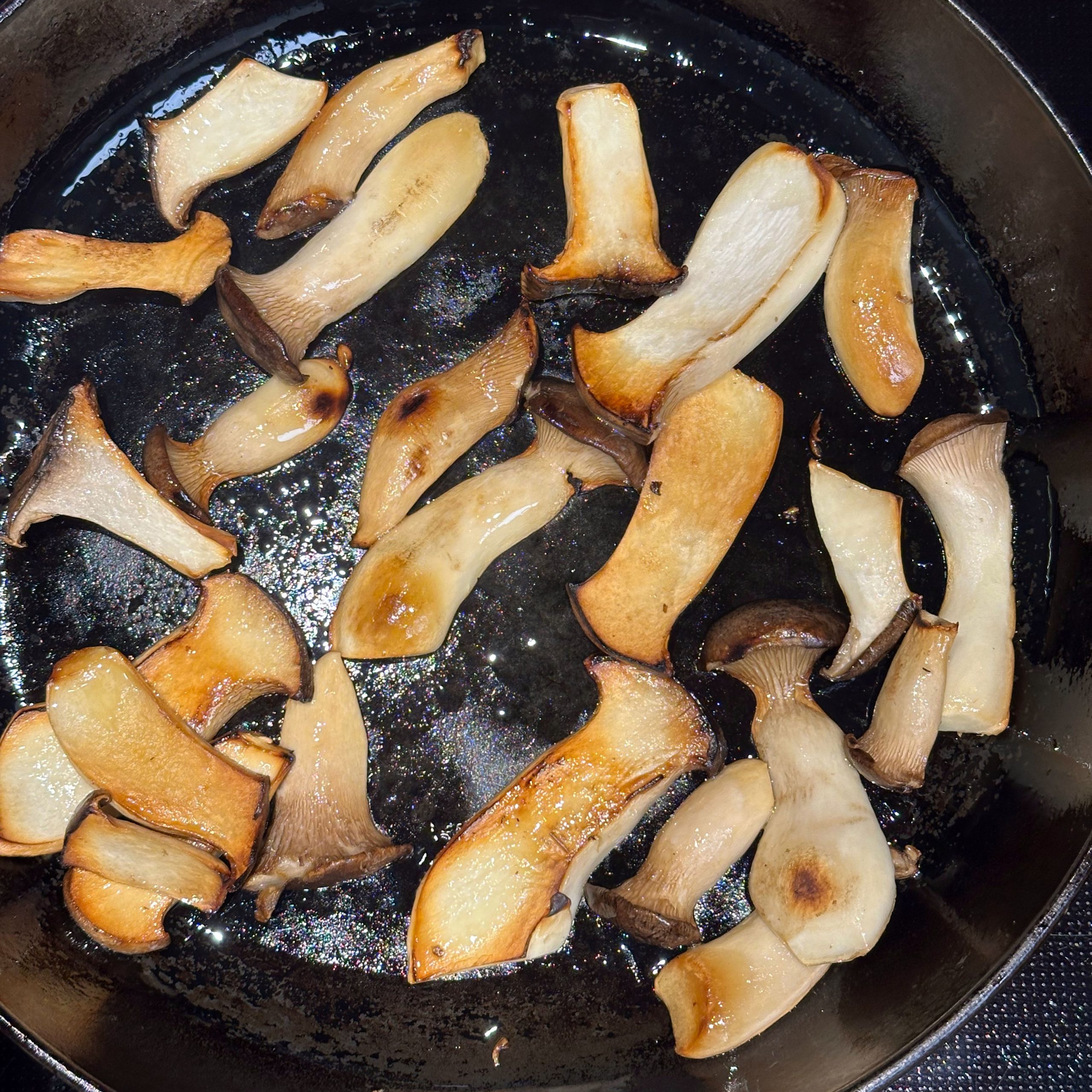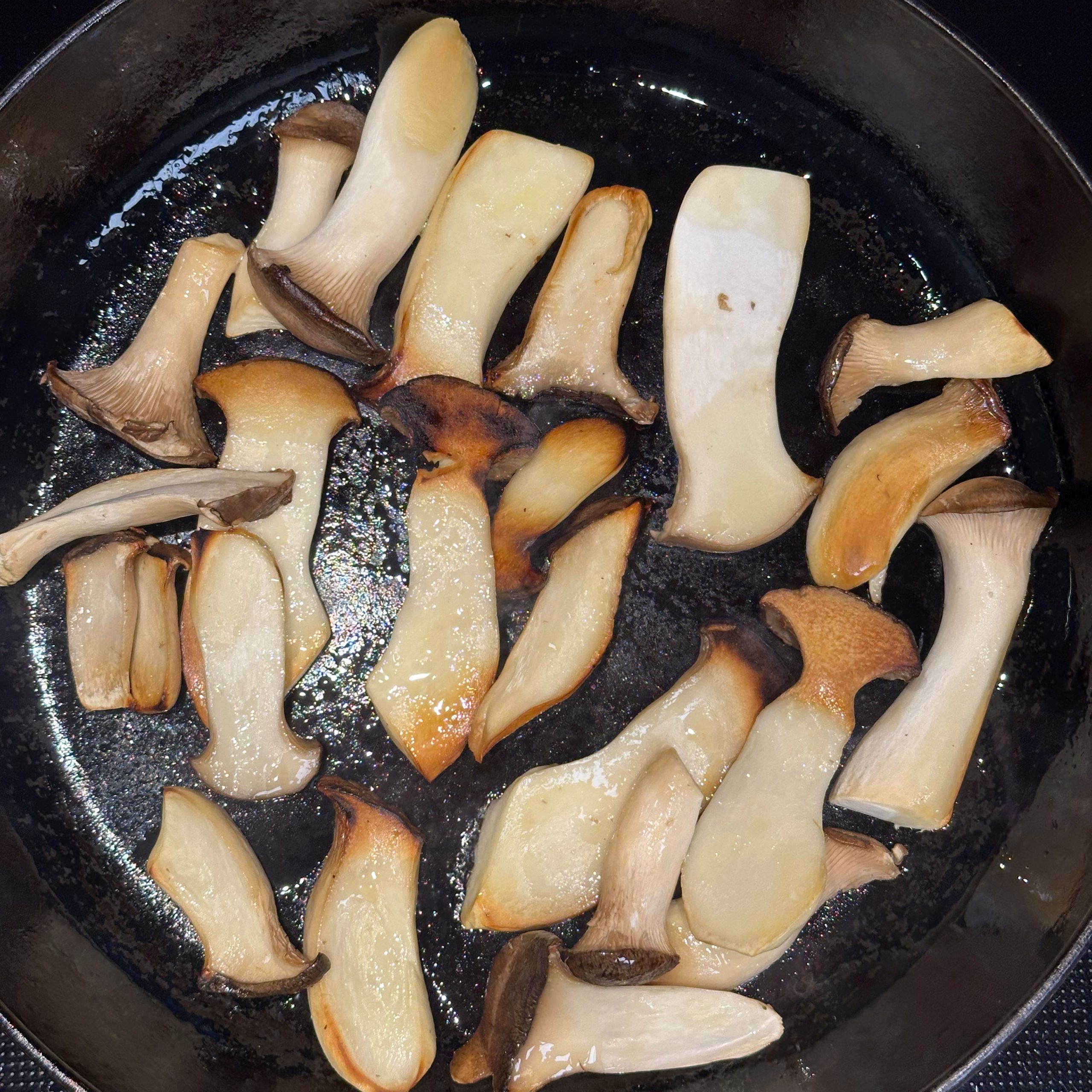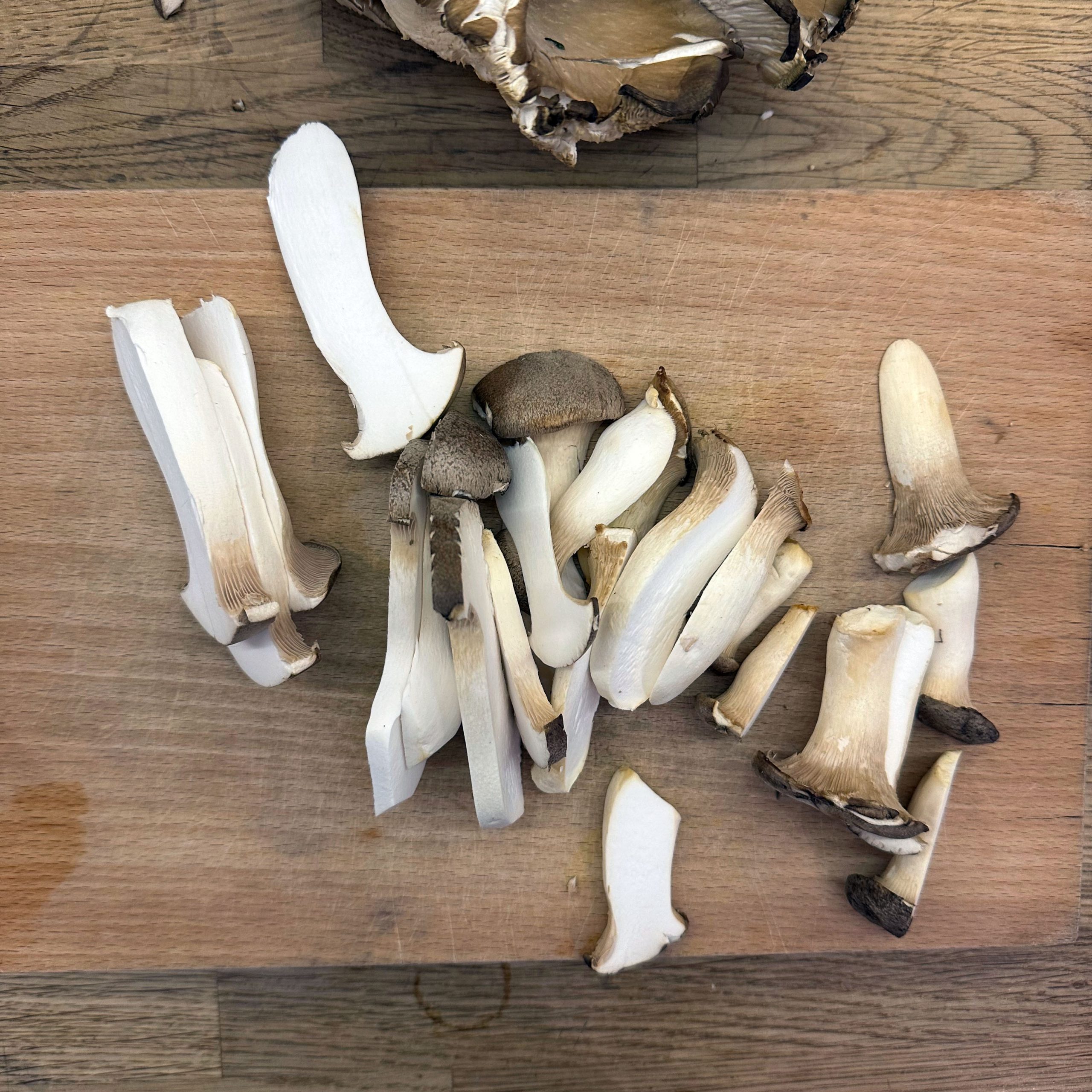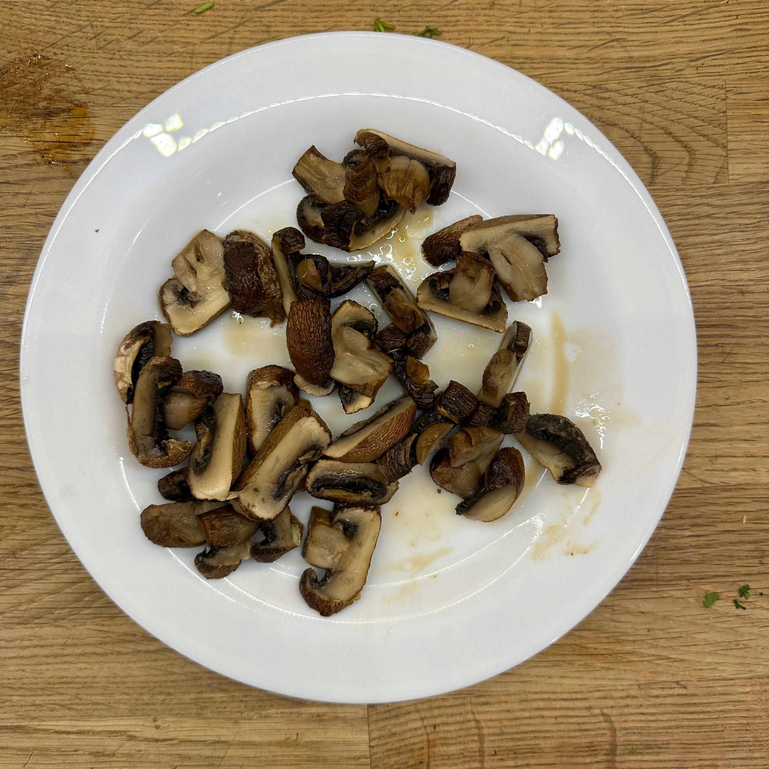 300 g Champignons ganz mit dem Kopf nach unten auf ein Blech setzen, mit etwas Öl beträufeln und salzen, bei 200 °C Umluft 30 Min. backen, etwas abkühlen lassen und in Scheiben schneiden. 300 g Austernpilze in Stücke zupfen und in etwas Öl kräftig anbraten, bis sie braune Stellen bekommen. 300 g Kräuterseitlinge in Scheiben schneiden und in etwas Öl von beiden Seiten 5–6 Min. braun braten. Alle Pilze mit Sojasoße marinieren. Koriander, Thymian, Dill und Petersilie hacken und unter die Pilze mischen. 400 ml Brühe aufkochen, 250 g Minutenpolenta unter ständigem Rühren einrieseln lassen und gut durchrühren, mit Kräutern der Provence würzen, 1 Becher Sahne und 40 g Butter unterrühren. Polenta auf ein mit Backpapier belegtes Blech gleichmäßig ausstreichen und bei 200 °C Umluft 15 Min. vorbacken. Polenta mit saurer Sahne bestreichen, die marinierten Pilze mit Kräutern darauf verteilen, 200 g Taleggio in Scheiben darauflegen und im Ofen grillen, bis der Käse Blasen schlägt. Polenta in Stücke schneiden und auf Tellern anrichten.
