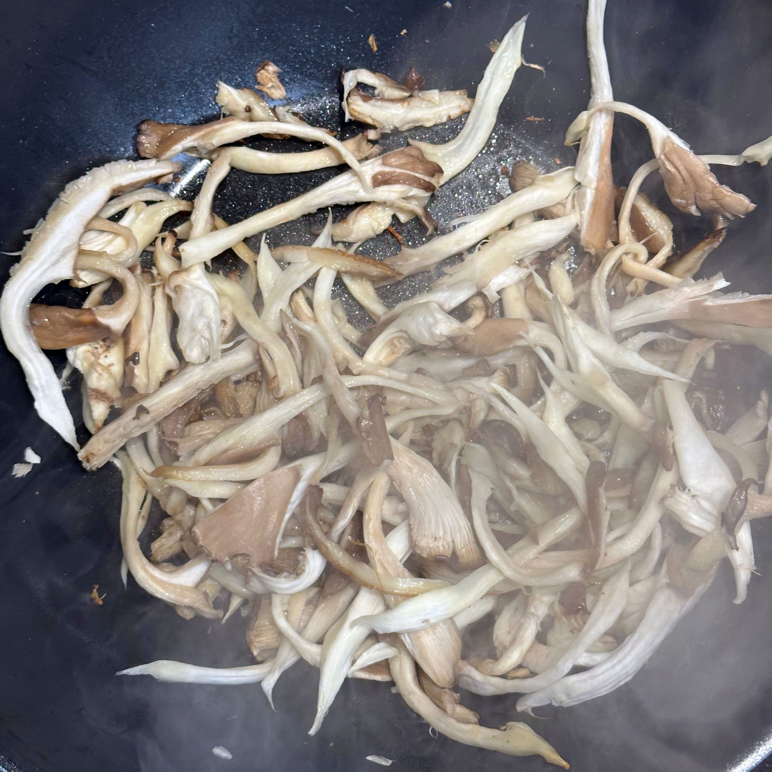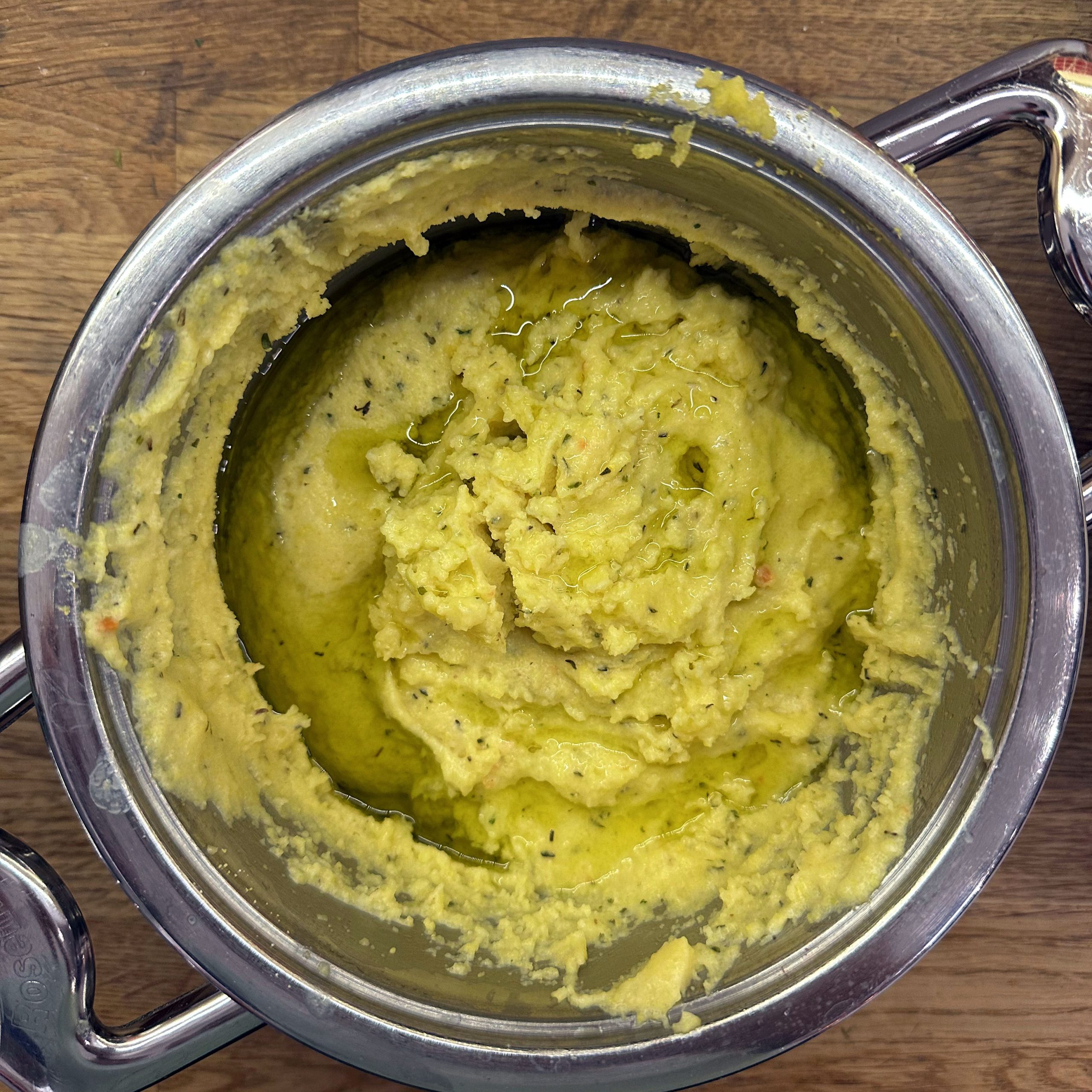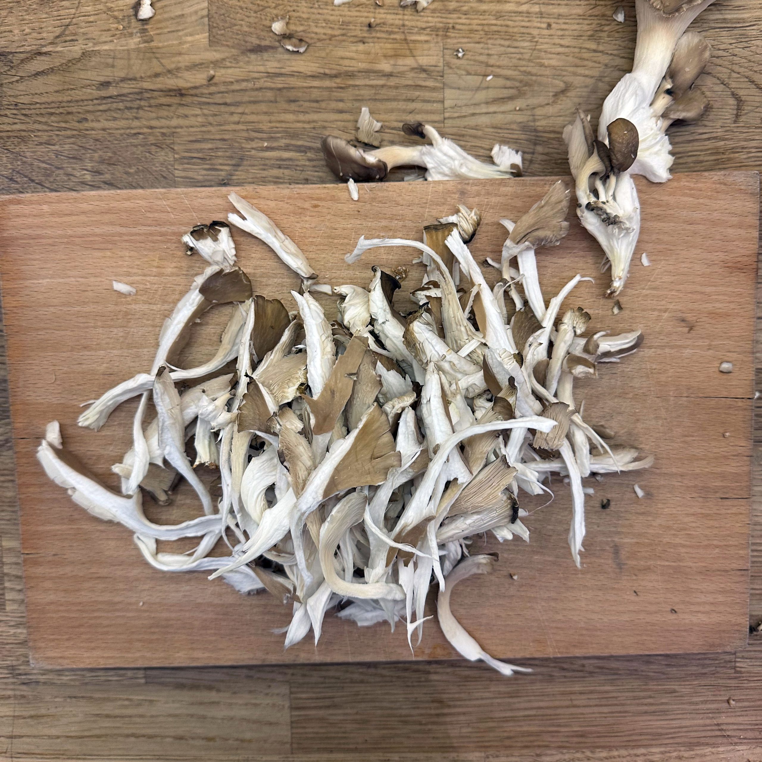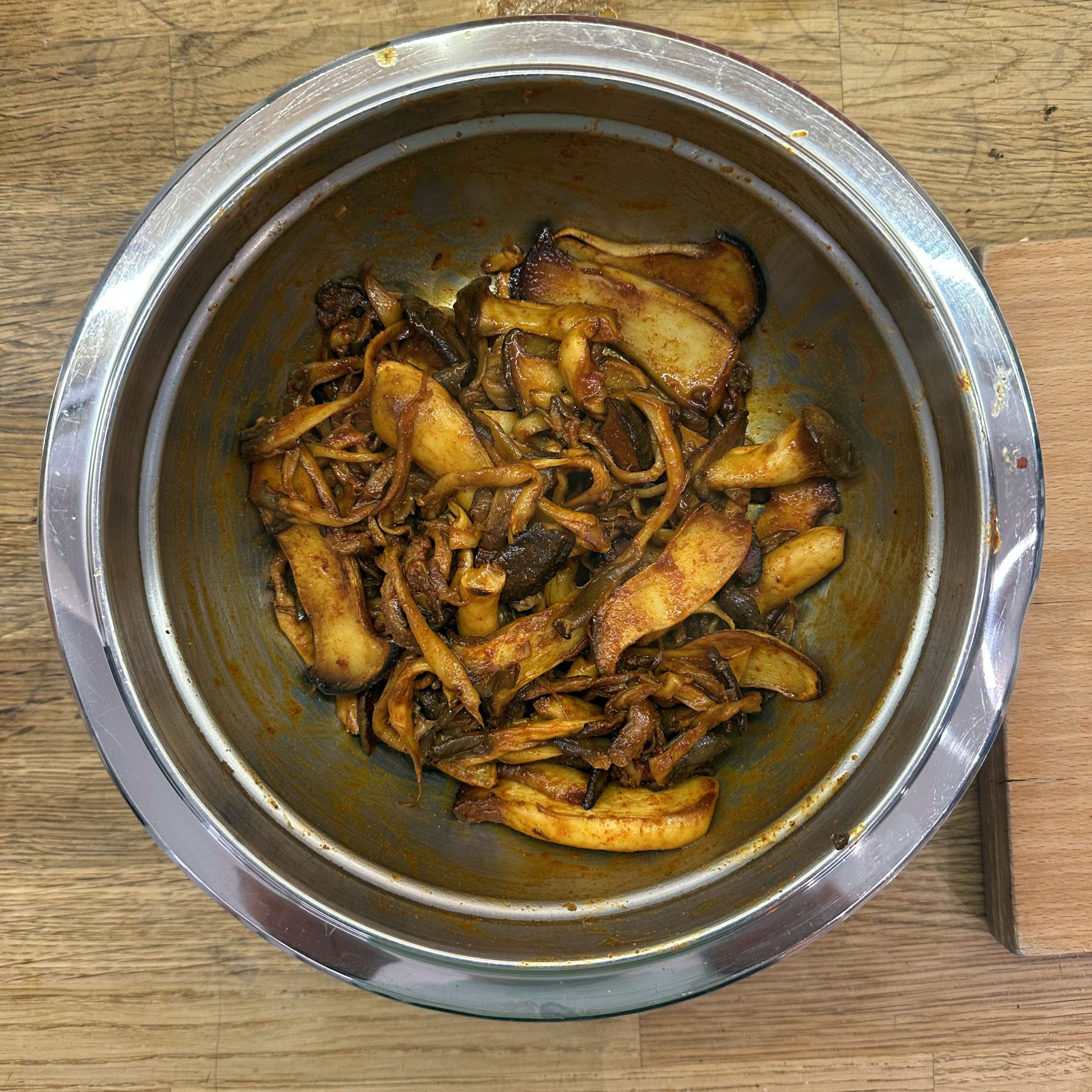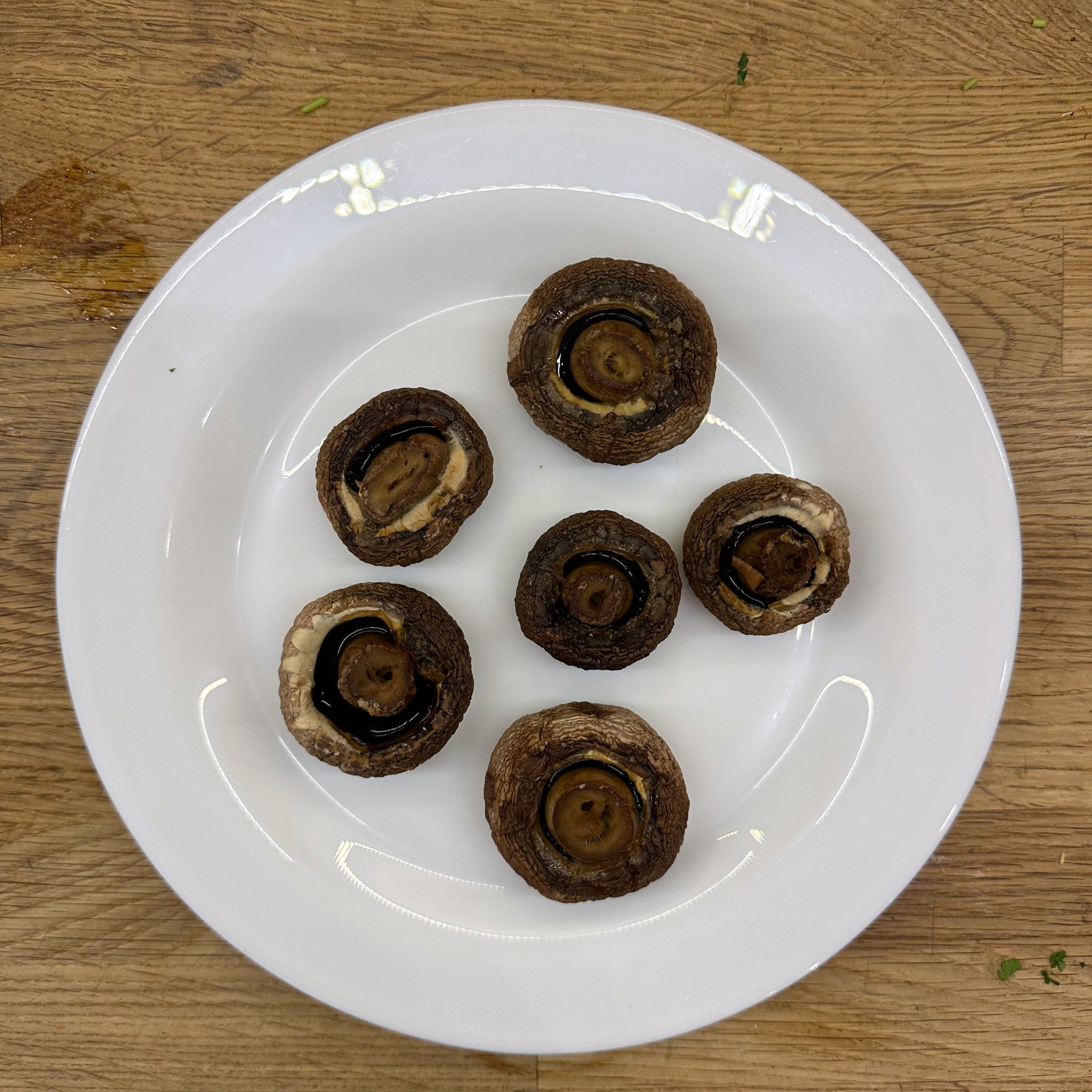 300 g Champignons ganz mit dem Kopf nach unten auf ein Blech setzen, mit etwas Öl beträufeln und salzen, bei 200 °C Umluft 30 Min. backen, etwas abkühlen lassen und in Scheiben schneiden. 300 g Austernpilze in Stücke zupfen und in etwas Öl kräftig anbraten, bis sie braune Stellen bekommen. 300 g Kräuterseitlinge in Scheiben schneiden und in etwas Öl von beiden Seiten 5–6 Min. braun braten. Alle Pilze mit Sojasoße marinieren. Koriander, Thymian, Dill und Petersilie hacken und unter die Pilze mischen. 400 ml Brühe aufkochen, 250 g Minutenpolenta unter ständigem Rühren einrieseln lassen und gut durchrühren, mit Kräutern der Provence würzen, 1 Becher Sahne und 40 g Butter unterrühren. Polenta auf ein mit Backpapier belegtes Blech gleichmäßig ausstreichen und bei 200 °C Umluft 15 Min. vorbacken. Polenta mit saurer Sahne bestreichen, die marinierten Pilze mit Kräutern darauf verteilen, 200 g Taleggio in Scheiben darauflegen und im Ofen grillen, bis der Käse Blasen schlägt. Polenta in Stücke schneiden und auf Tellern anrichten.