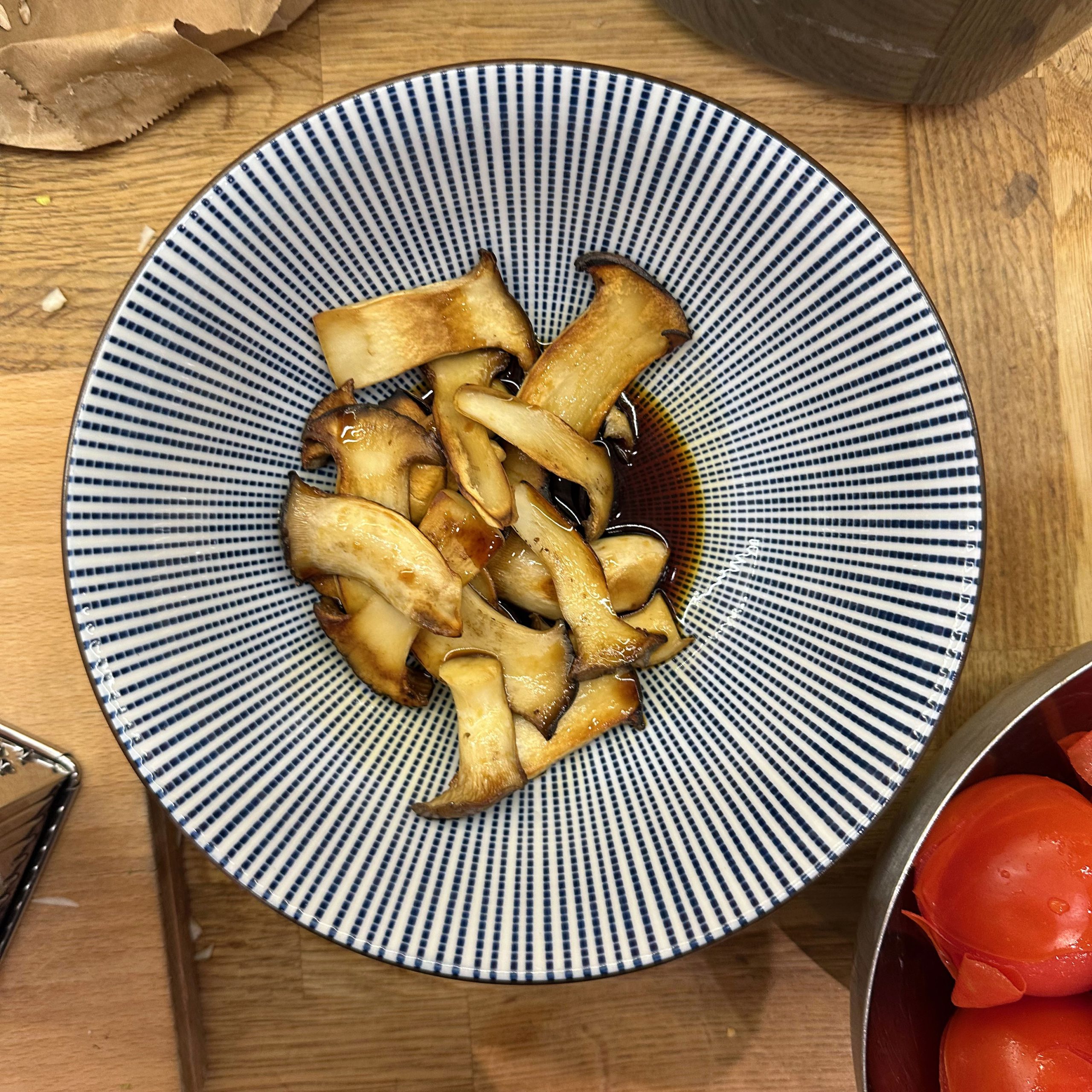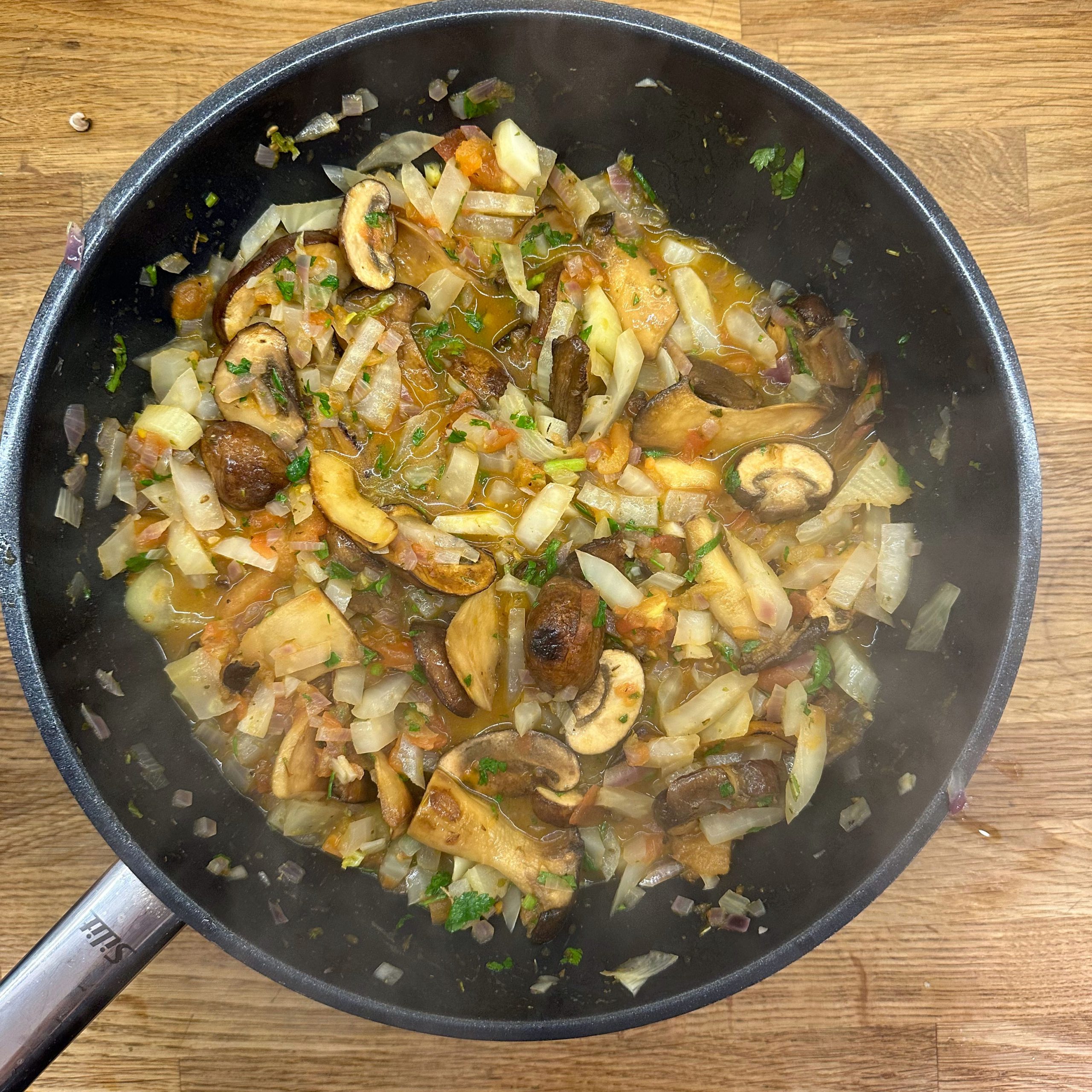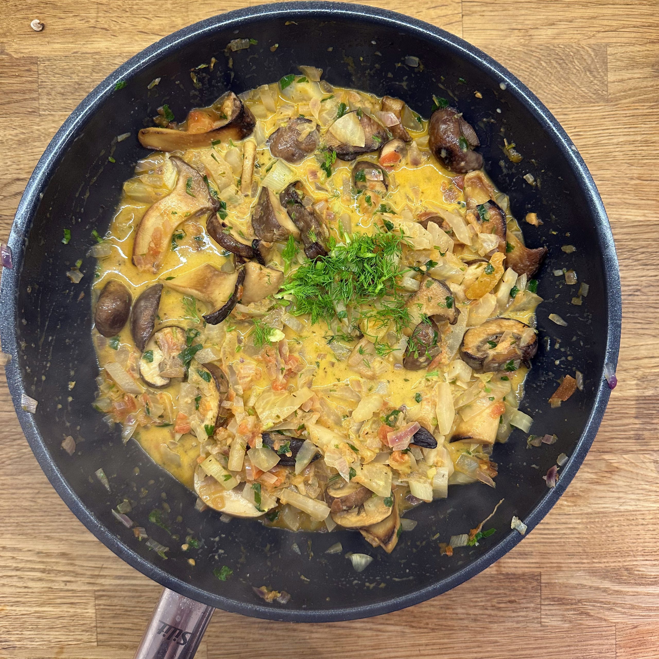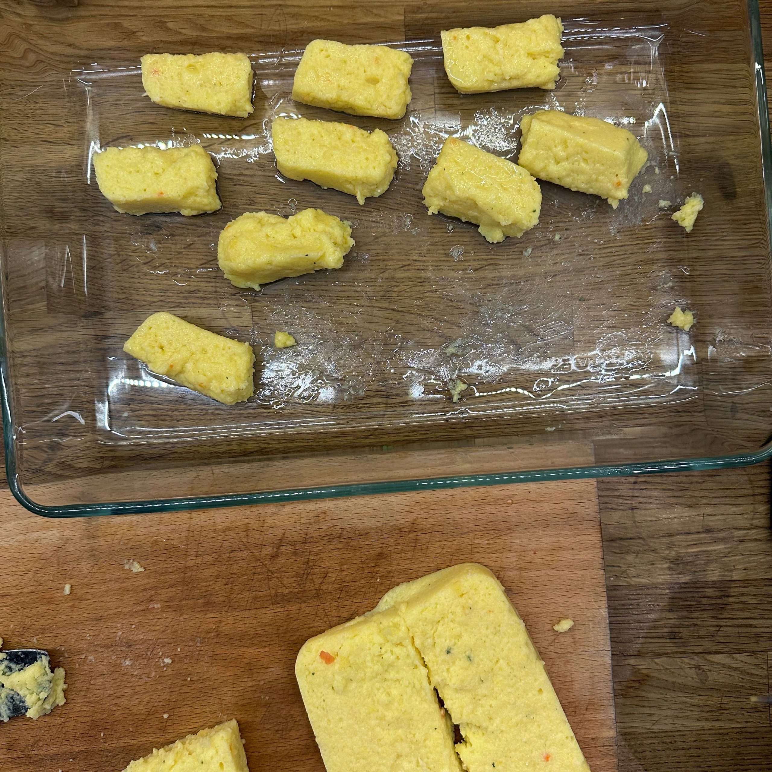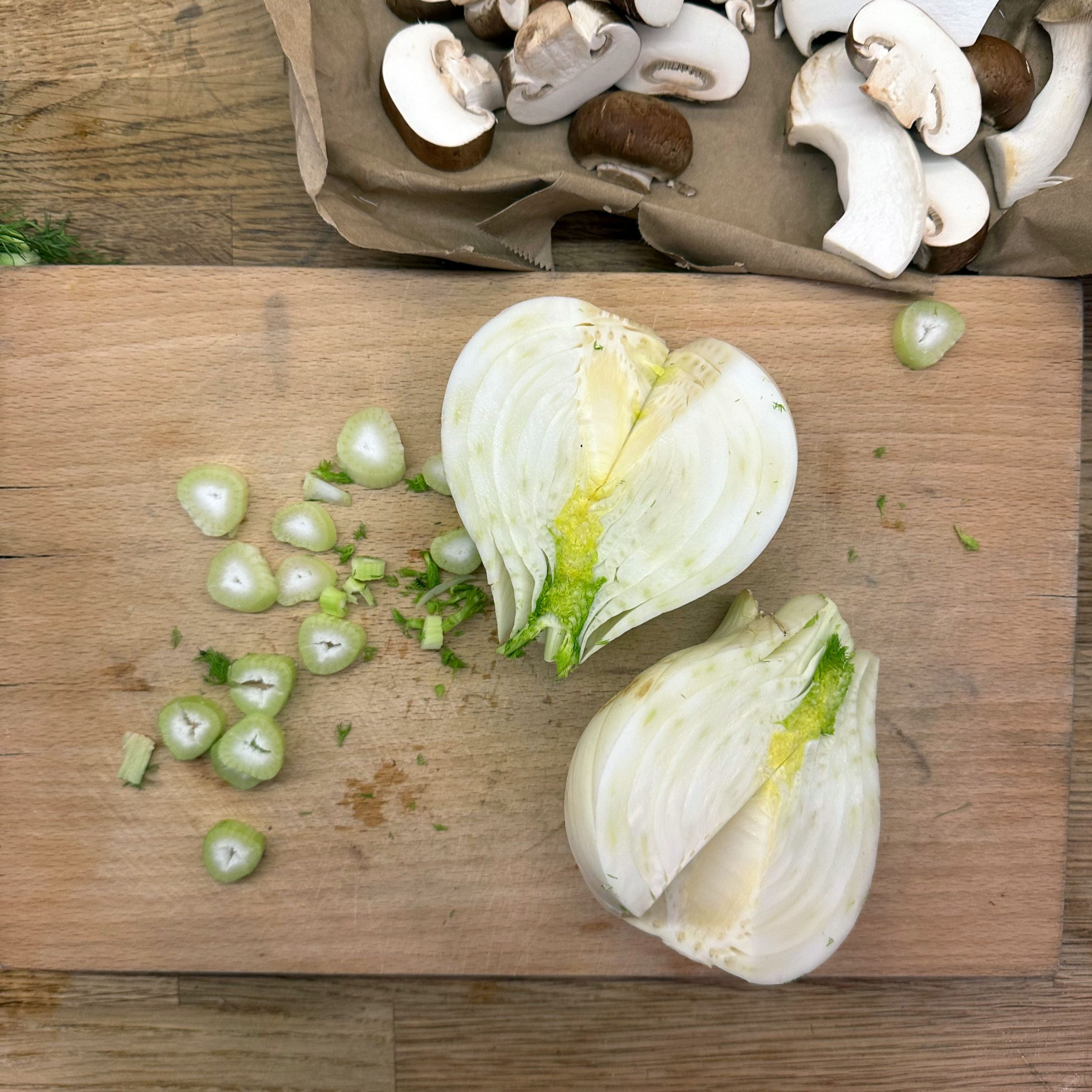 Brühe aufkochen, 120gr Polenta unter ständigem Rühren einrieseln lassen und unter Rühren köcheln lassen, dann etwas Butter, Sahne und Parmesan unterrühren. Polenta in eine Glasschüssel geben und abkühlen lassen. 200gr Champignons und 200gr Kräuterseitlinge in Scheiben schneiden und in einer Pfanne in etwas Öl von beiden Seiten braun braten, dann mit Sojasoße, fein gehacktem Rosmarin und 0,5 Bund gehackter Petersilie marinieren. 5 Tomaten mit kochendem Wasser übergießen, häuten und würfeln. 2 rote Zwiebeln würfeln und in einem Topf in Butter und Öl anbraten, 1 große Fenchelknolle würfeln und zugeben, 6min mitbraten, getrocknete Kräuter unterrühren, mit 300ml Brühe auffüllen, Tomaten zugeben und 20min köcheln lassen. Abgekühlte Polenta aus der Schüssel stürzen, längs durchschneiden und in kleine Vierecke schneiden, in einer Auflaufform die Stücke in Öl wenden und bei 200° Umluft 20min backen. Marinierte Pilze unter das Fenchel-Tomaten-Ragout mischen und weitere 10min köcheln lassen, 80ml Sahne unterrühren und mit den Polentaschnitten aus dem Ofen in tiefen Tellern servieren.