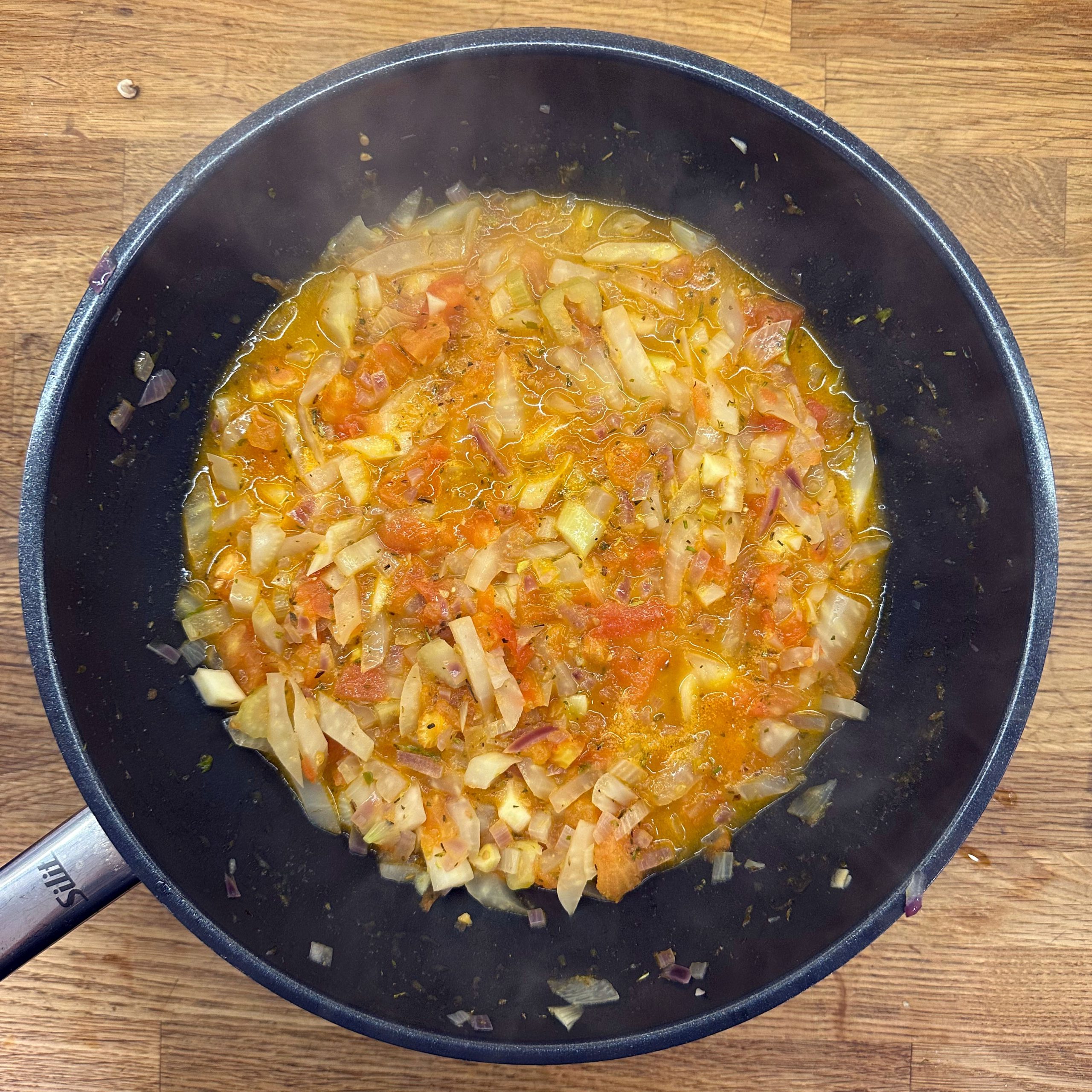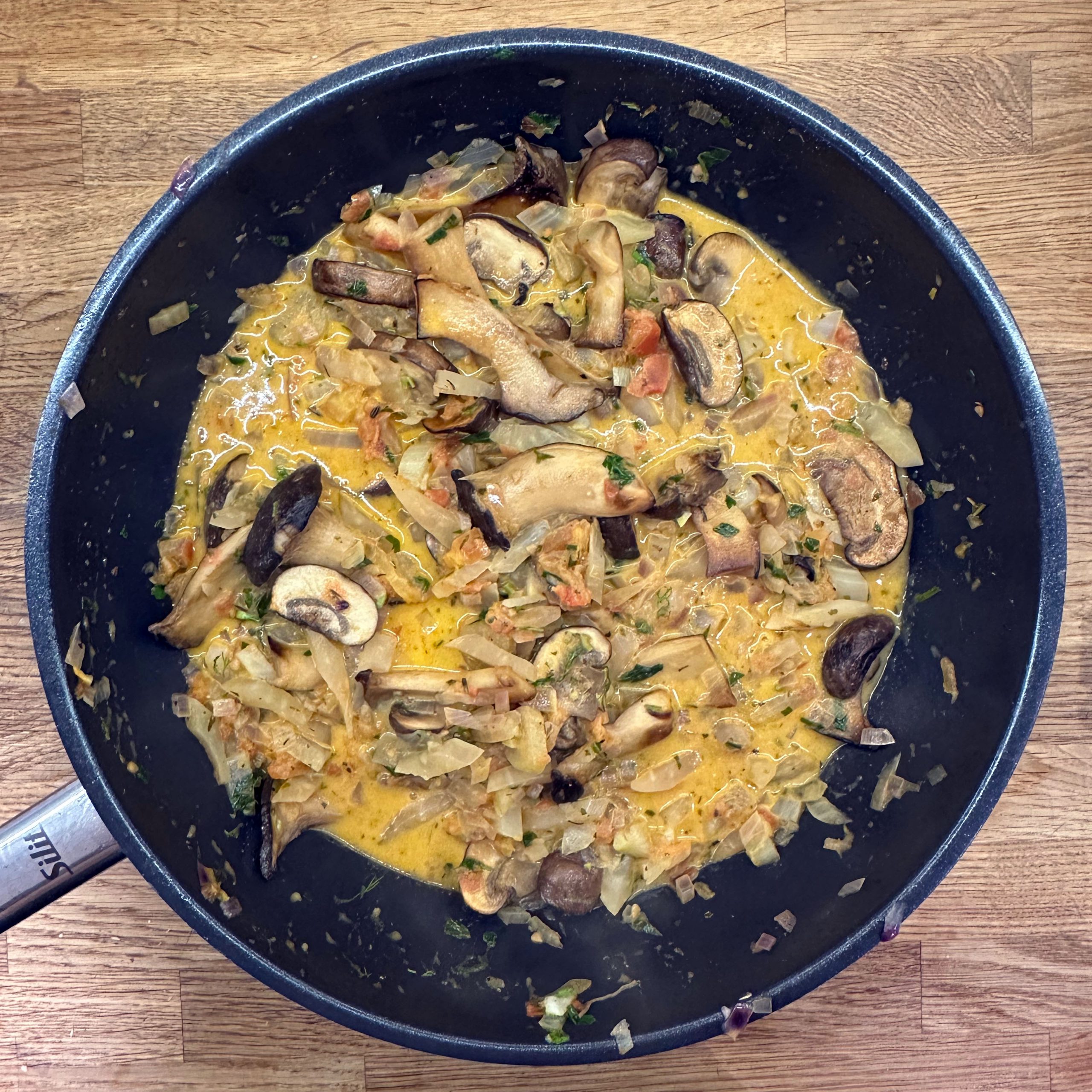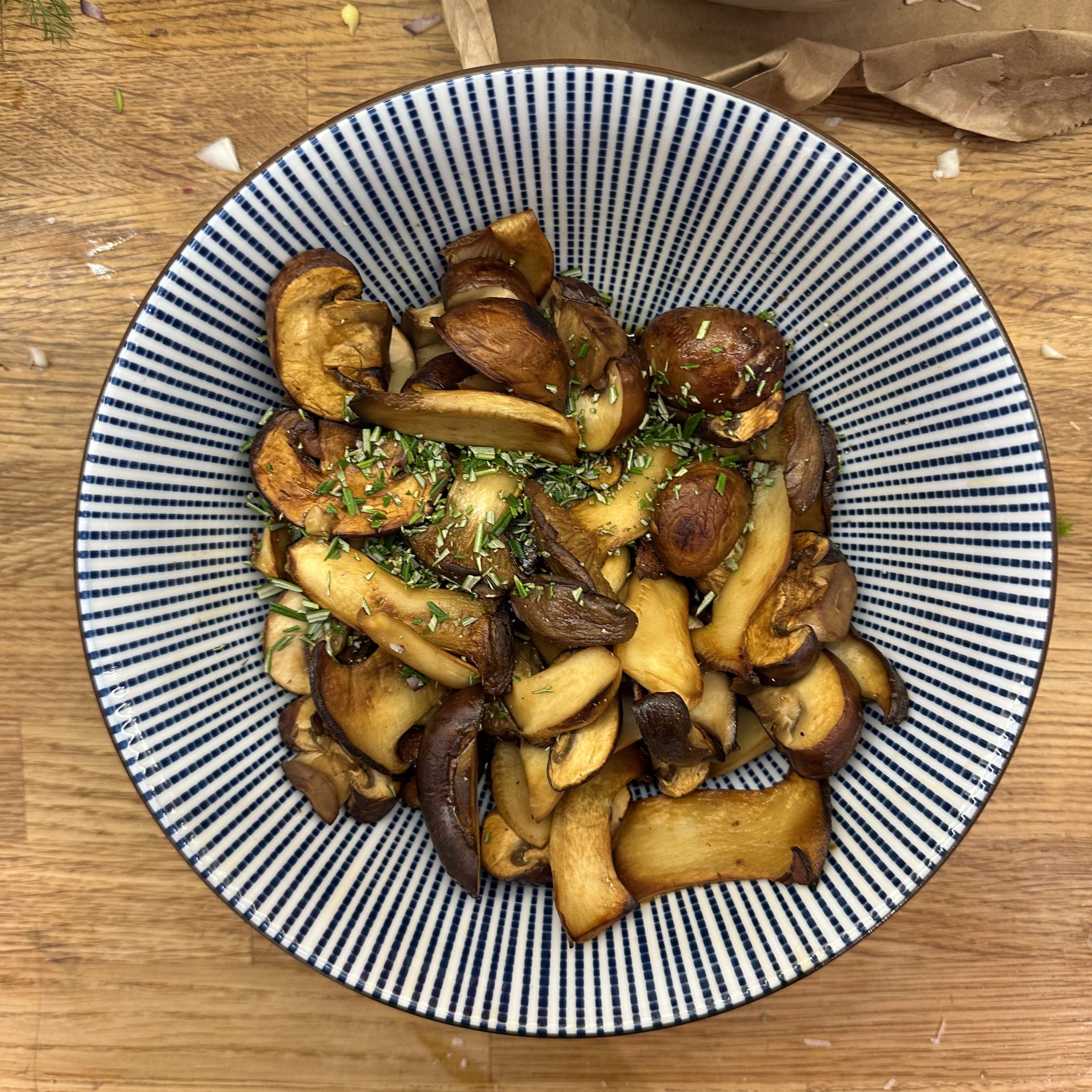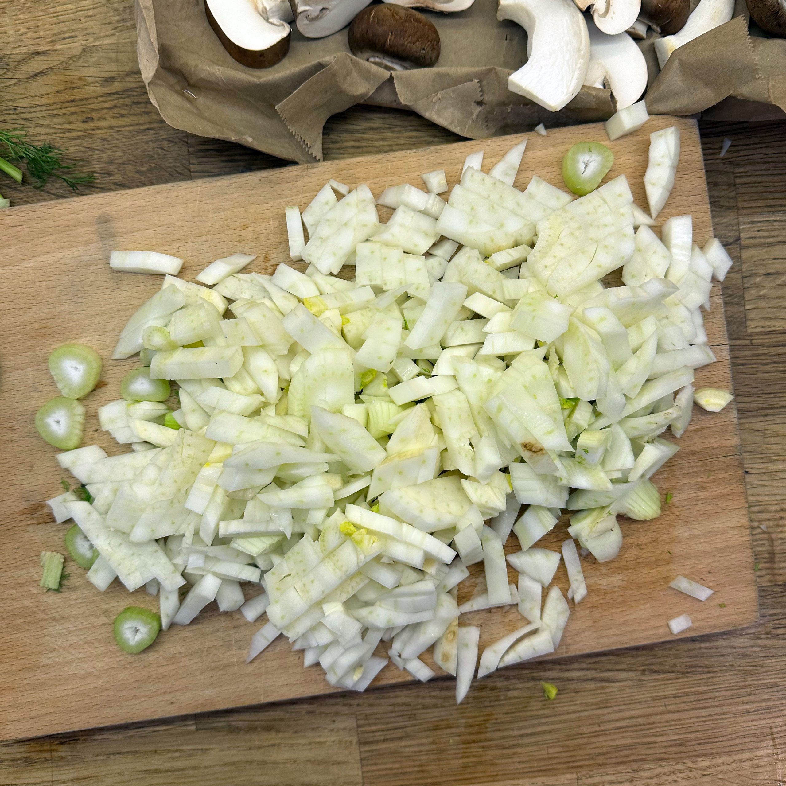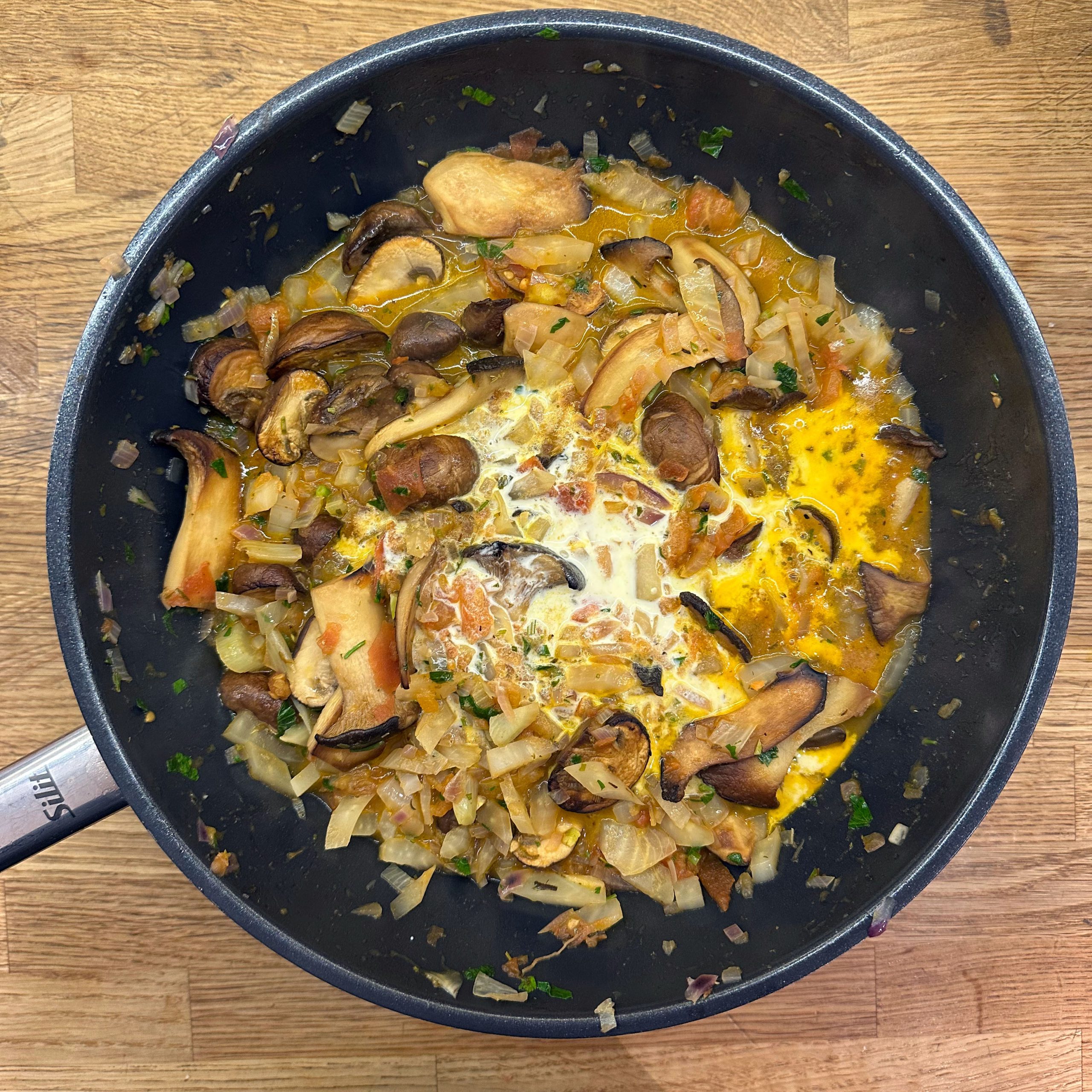 Brühe aufkochen, 120gr Polenta unter ständigem Rühren einrieseln lassen und unter Rühren köcheln lassen, dann etwas Butter, Sahne und Parmesan unterrühren. Polenta in eine Glasschüssel geben und abkühlen lassen. 200gr Champignons und 200gr Kräuterseitlinge in Scheiben schneiden und in einer Pfanne in etwas Öl von beiden Seiten braun braten, dann mit Sojasoße, fein gehacktem Rosmarin und 0,5 Bund gehackter Petersilie marinieren. 5 Tomaten mit kochendem Wasser übergießen, häuten und würfeln. 2 rote Zwiebeln würfeln und in einem Topf in Butter und Öl anbraten, 1 große Fenchelknolle würfeln und zugeben, 6min mitbraten, getrocknete Kräuter unterrühren, mit 300ml Brühe auffüllen, Tomaten zugeben und 20min köcheln lassen. Abgekühlte Polenta aus der Schüssel stürzen, längs durchschneiden und in kleine Vierecke schneiden, in einer Auflaufform die Stücke in Öl wenden und bei 200° Umluft 20min backen. Marinierte Pilze unter das Fenchel-Tomaten-Ragout mischen und weitere 10min köcheln lassen, 80ml Sahne unterrühren und mit den Polentaschnitten aus dem Ofen in tiefen Tellern servieren.