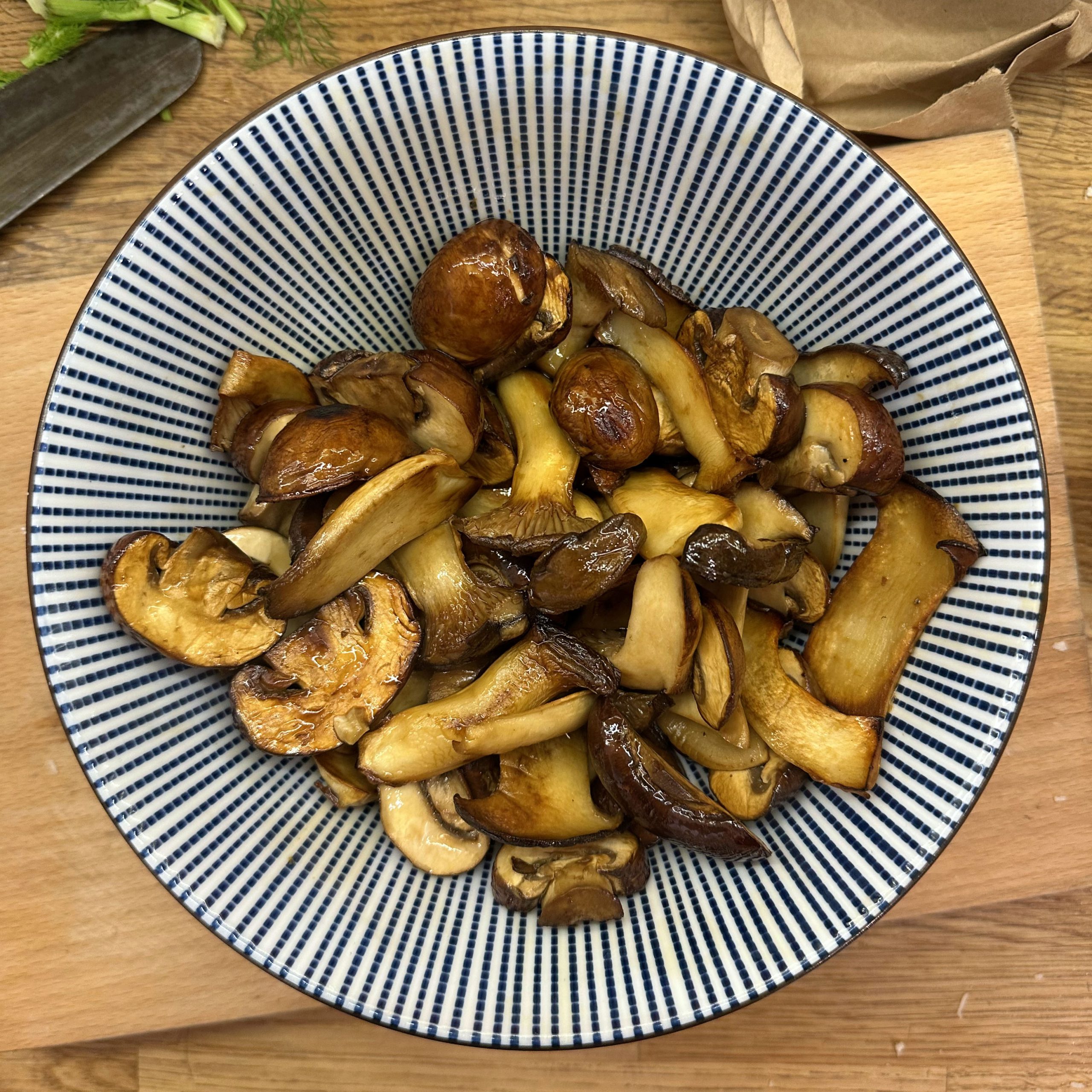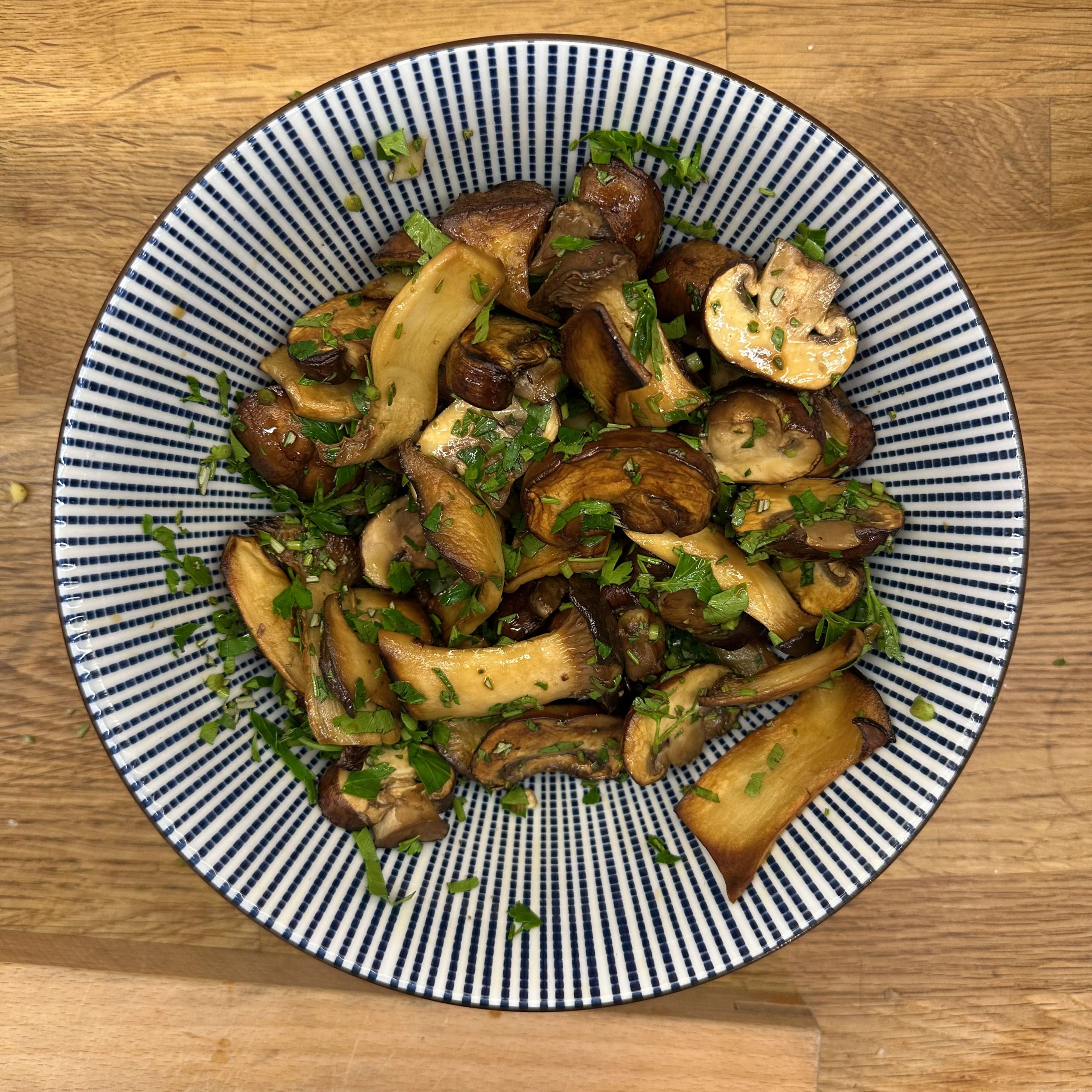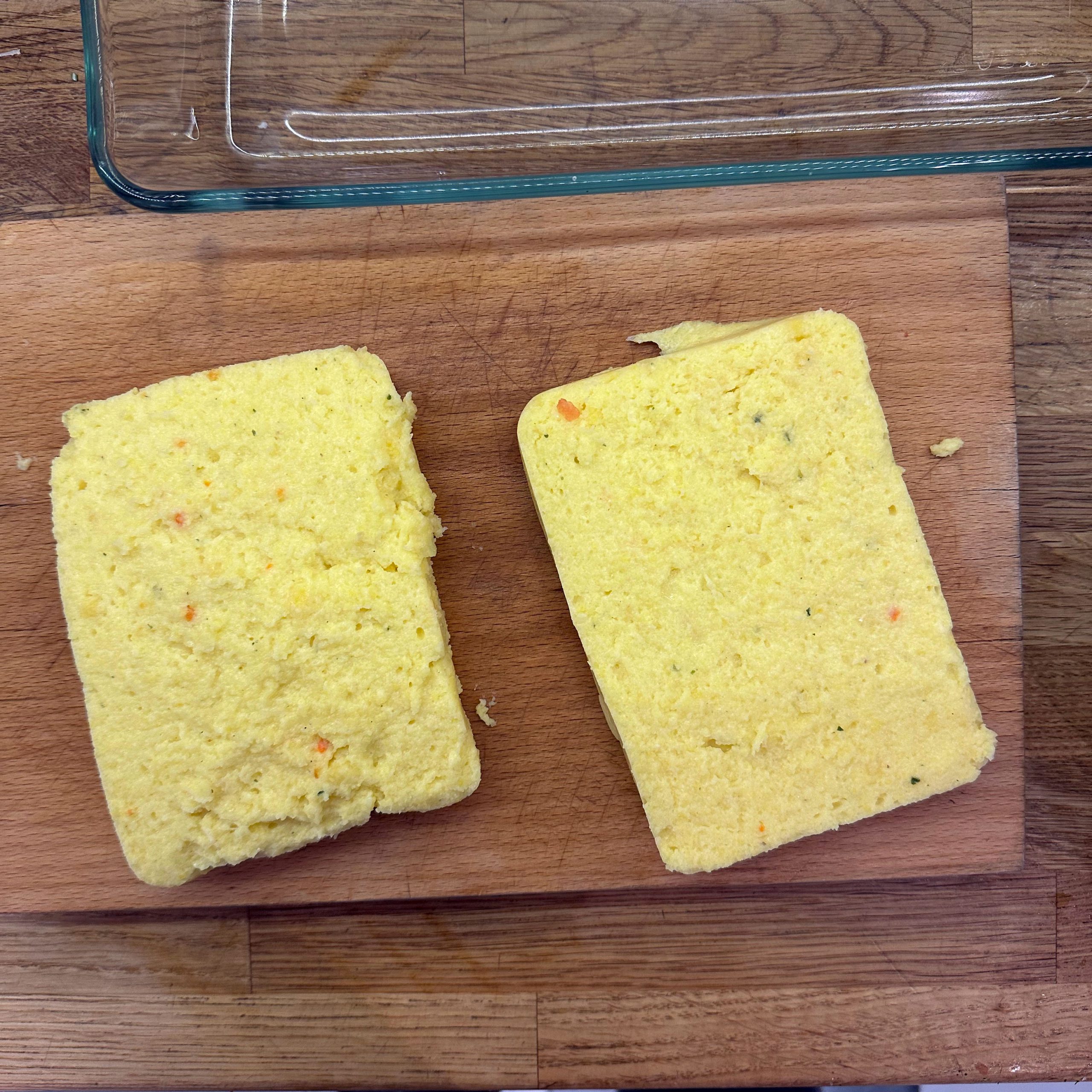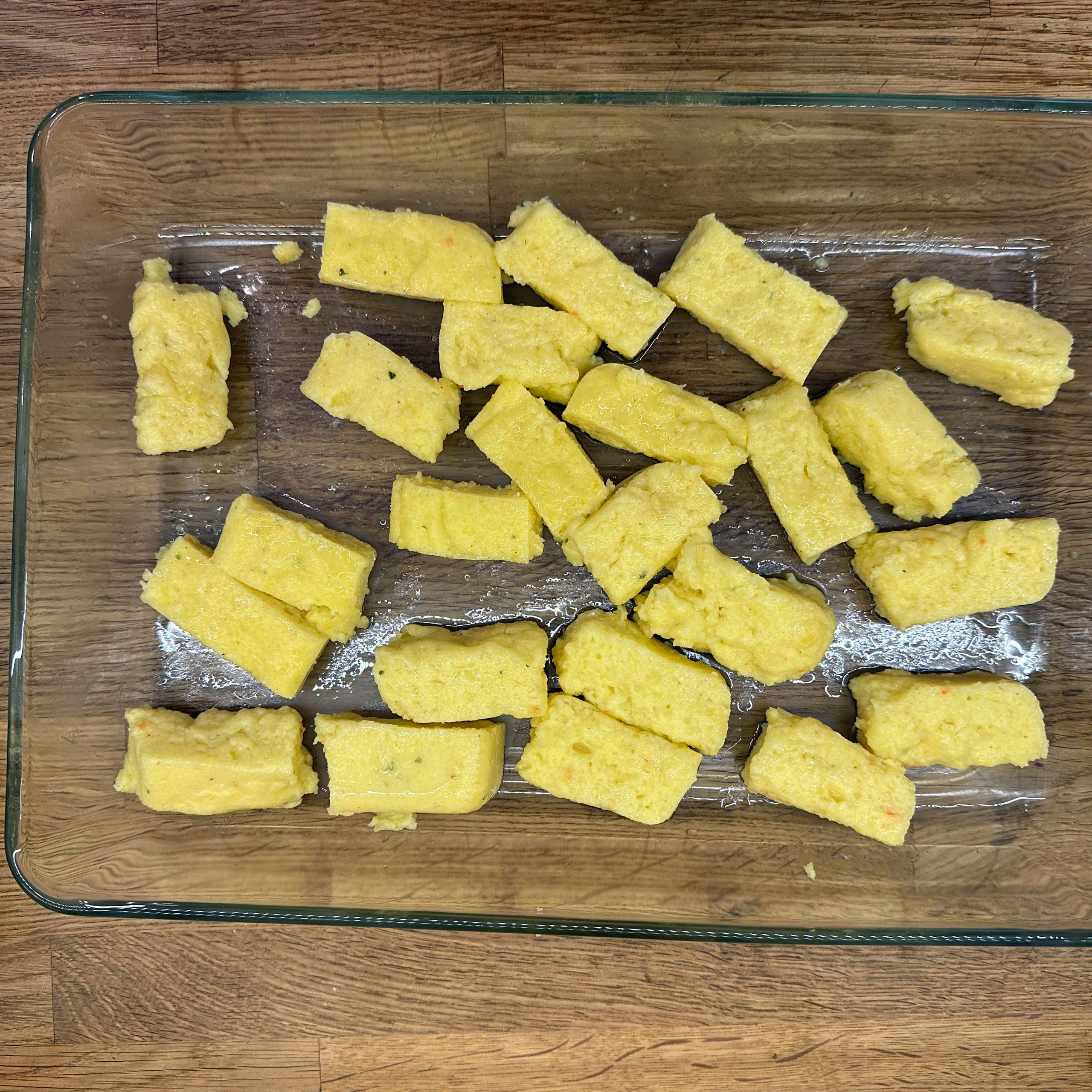 Brühe aufkochen, 120gr Polenta unter ständigem Rühren einrieseln lassen und unter Rühren köcheln lassen, dann etwas Butter, Sahne und Parmesan unterrühren. Polenta in eine Glasschüssel geben und abkühlen lassen. 200gr Champignons und 200gr Kräuterseitlinge in Scheiben schneiden und in einer Pfanne in etwas Öl von beiden Seiten braun braten, dann mit Sojasoße, fein gehacktem Rosmarin und 0,5 Bund gehackter Petersilie marinieren. 5 Tomaten mit kochendem Wasser übergießen, häuten und würfeln. 2 rote Zwiebeln würfeln und in einem Topf in Butter und Öl anbraten, 1 große Fenchelknolle würfeln und zugeben, 6min mitbraten, getrocknete Kräuter unterrühren, mit 300ml Brühe auffüllen, Tomaten zugeben und 20min köcheln lassen. Abgekühlte Polenta aus der Schüssel stürzen, längs durchschneiden und in kleine Vierecke schneiden, in einer Auflaufform die Stücke in Öl wenden und bei 200° Umluft 20min backen. Marinierte Pilze unter das Fenchel-Tomaten-Ragout mischen und weitere 10min köcheln lassen, 80ml Sahne unterrühren und mit den Polentaschnitten aus dem Ofen in tiefen Tellern servieren.