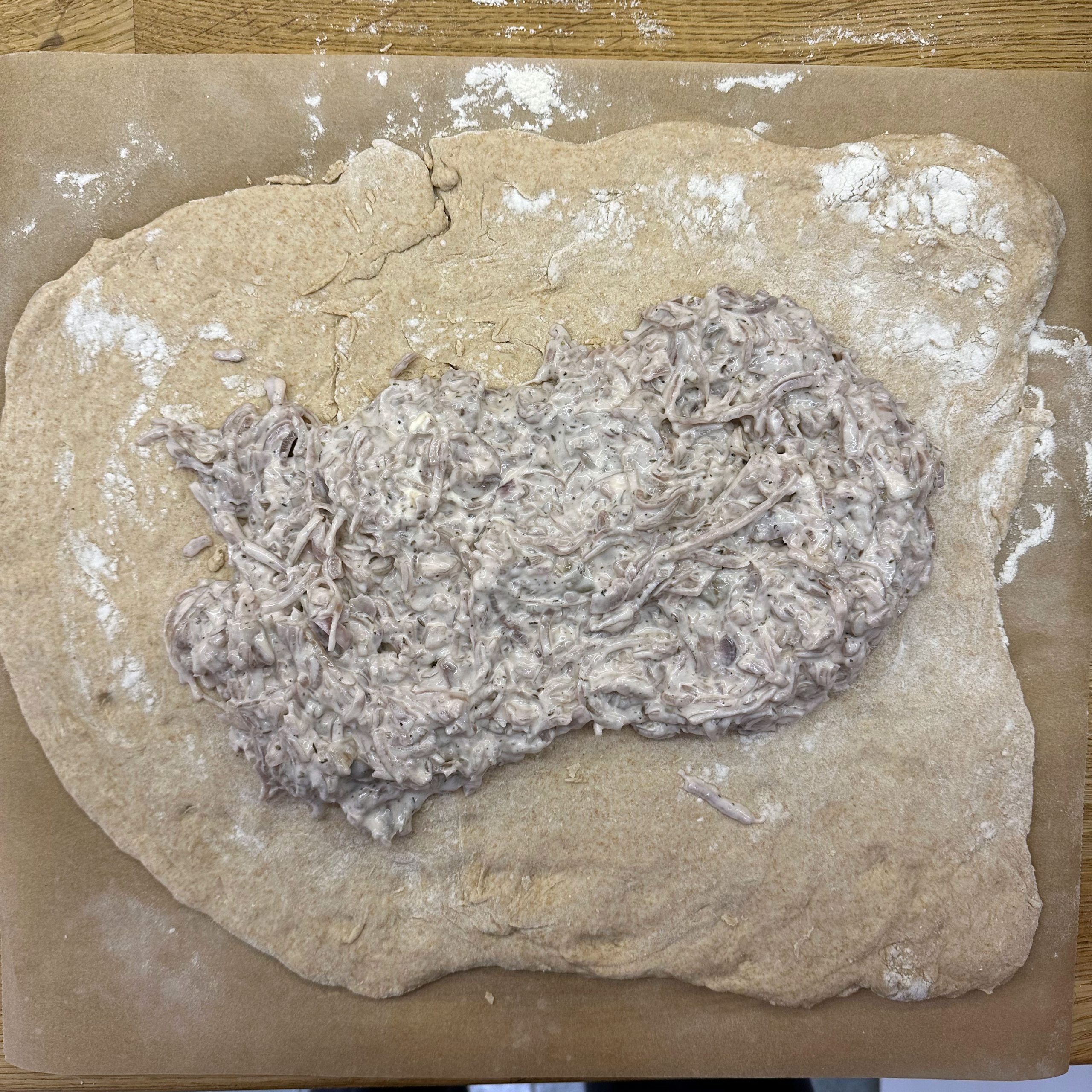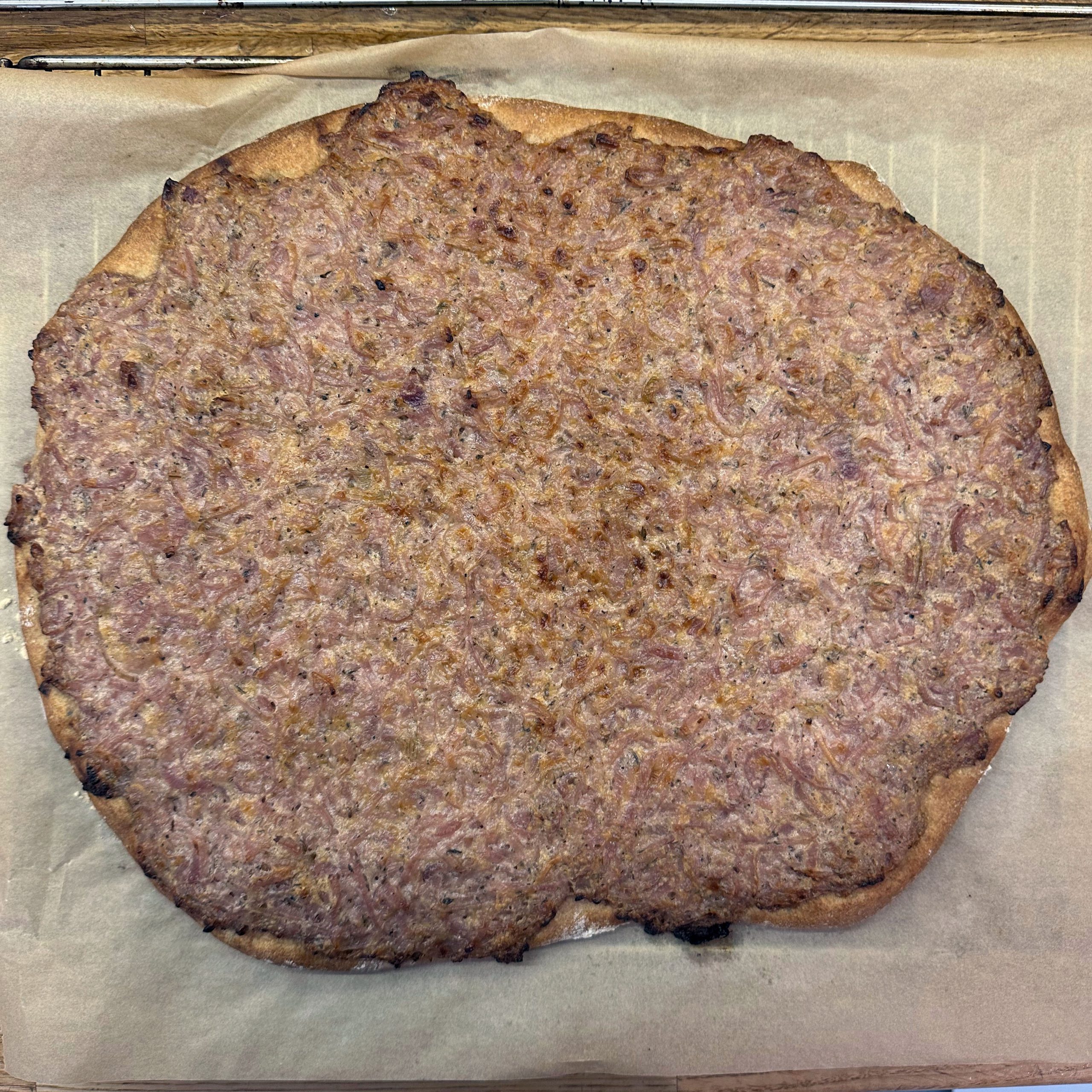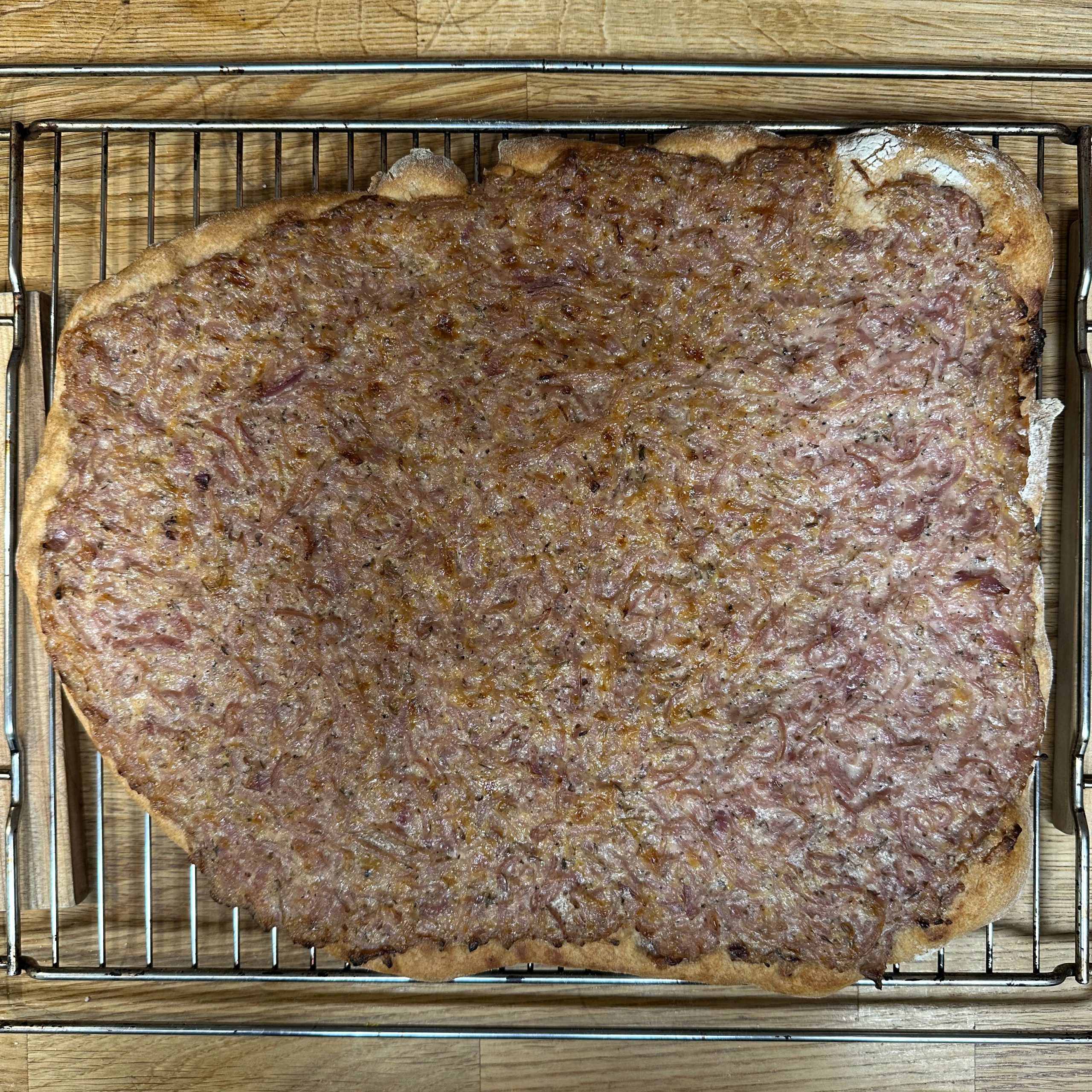 Anlässlich des 20-jährigen Einzugsjubiläums wird auf der Straße mit Grill und Glühwein bei Minus-Temperaturen gefeiert. Ich steuere Zwiebelkuchen und frische Waffeln bei. Für den Zwiebelkuchen den Teig schon 36h vorher ansetzen: 800 g Mehl mit Wasser, Öl, Salz und 3 g Trockenhefe zu einem Teig vermischen, abgedeckt im Kühlschrank gehen lassen, alle 6 Stunden ziehen und falten. 1,5 kg gemischte Zwiebeln schälen und in Ringe schneiden, in einem Wok 40 Minuten braten und dünsten, mit Salz, Pfeffer, Thymian und Kümmel würzen. Die abgekühlten Zwiebeln mit 2 Bechern Crème fraîche vermischen. Den Teig 2h vor dem Backen in zwei Hälften teilen und ruhen lassen. Die Teiglinge auf Backpapier ca. 1 cm dick ausrollen, mit der Hälfte der Zwiebelmasse bestreichen und im Backofen bei 200° ca. 30min backen. Für den Waffelteig 250 g Zucker, 3 EL Vanillezucker, 1 TL Salz, 1 EL Backpulver und 6 Eier mit dem Rührgerät verrühren, 400 ml Milch unterrühren, dann 600 g Mehl schrittweise hinzufügen und gut vermengen. Den Teig etwas stehen lassen und im Waffeleisen ausbacken. Mit warmem Nutella bestrichen servieren.