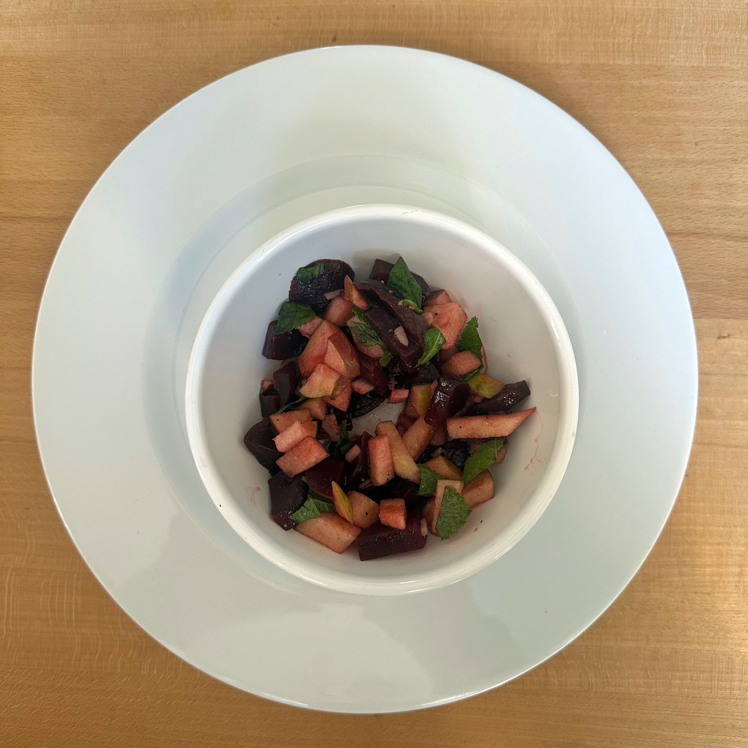 Reinhard kocht sehr lecker zur Besprechung unserer Hüttenwanderung: Vorspeise: Rote-Bete-Salat mit Apfelstücken und frischen Minzblättern. Hauptgang: Zweierlei Hähnchenbrust (einmal schlicht gewürzt, einmal mit Kräuterkruste) auf Couscous, dazu Ratatouille-artiges Gemüse aus Paprika, Aubergine, Zucchini und schwarzen Oliven, gebratene Zwiebeln mit Lauch und ein Klecks Joghurt.