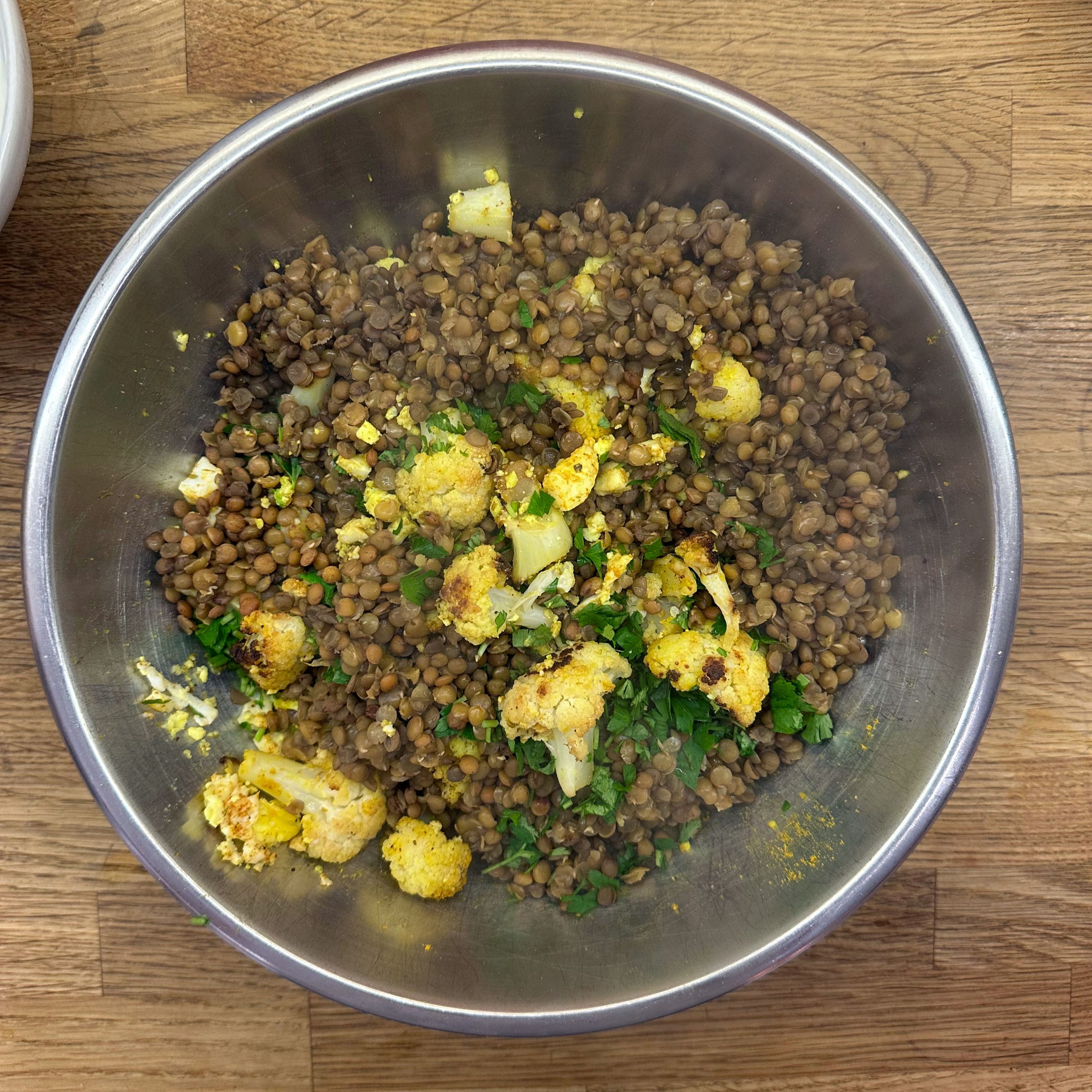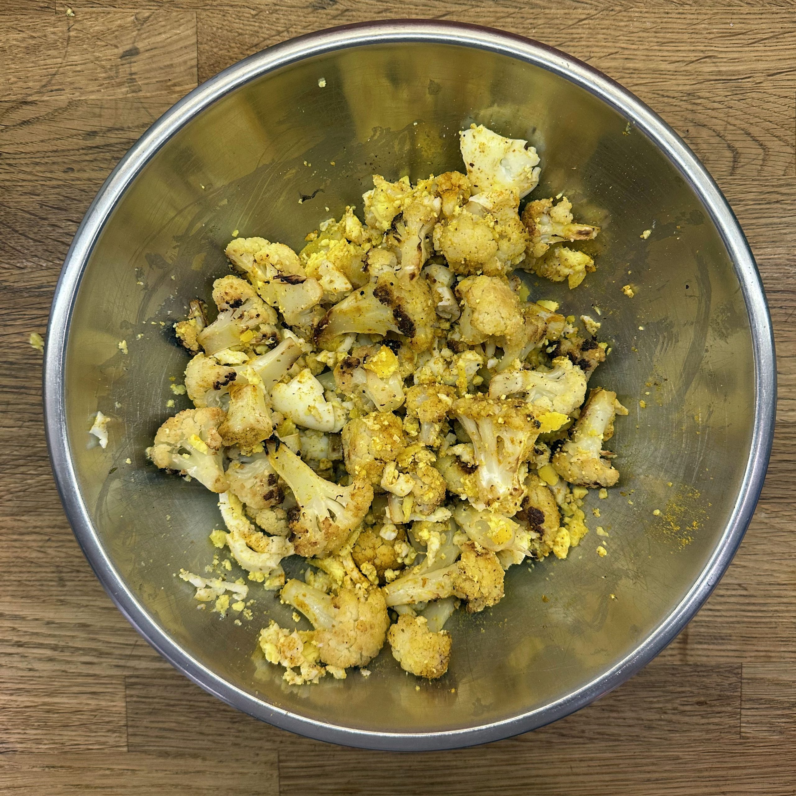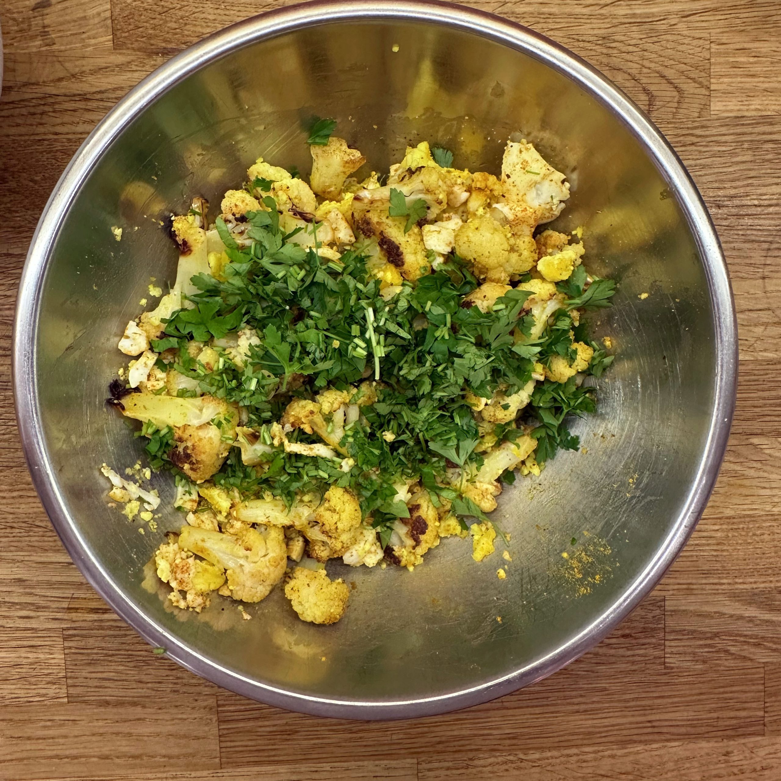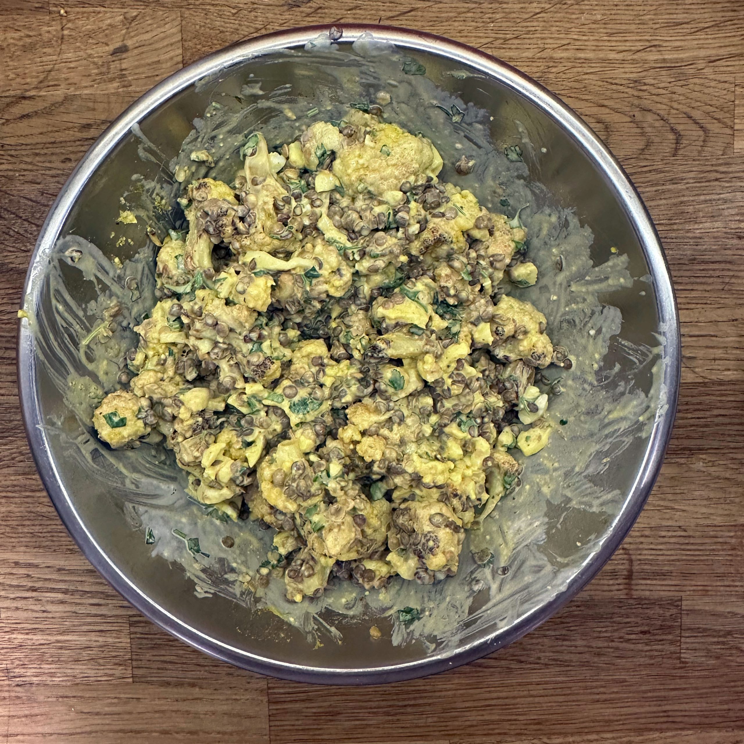 Noch einen Teigling von gestern übrig, den dann wieder mit Schmand, frischem Spinat, Zwiebeln und Chili belegt. Im Ofen auf dem Pizzablech 14 Min. bei 230° Umluft gebacken. Daneben den Salat aus geröstetem Blumenkohl gemacht: 1 Blumenkohl in 4 cm große Röschen teilen, mit 4 EL Olivenöl, 2 TL mildem Currypulver und etwas Salz in einer Backform vermengen. In der Backform im Ofen 30 Min. rösten, bis die Röschen goldbraun und weich sind. 125 g grüne oder braune Linsen waschen und in leicht gesalzenem Wasser bissfest kochen, in ein Sieb abtropfen lassen und abkühlen lassen. 4 Eier 9 Min. kochen, herausnehmen, kalt abspülen, abkühlen lassen, pellen und in einer großen Schüssel grob zerdrücken. Blumenkohl, 0,5 Bund gehackte Petersilie, 1 TL Sumach und 1 TL zerstoßenen Kreuzkümmel mit den Eiern vermengen. Linsen abtropfen lassen und unterrühren. 100 g Joghurt, 50 g Mayonnaise und den Saft einer halben Zitrone verrühren und vorsichtig mit dem Rest vermengen.