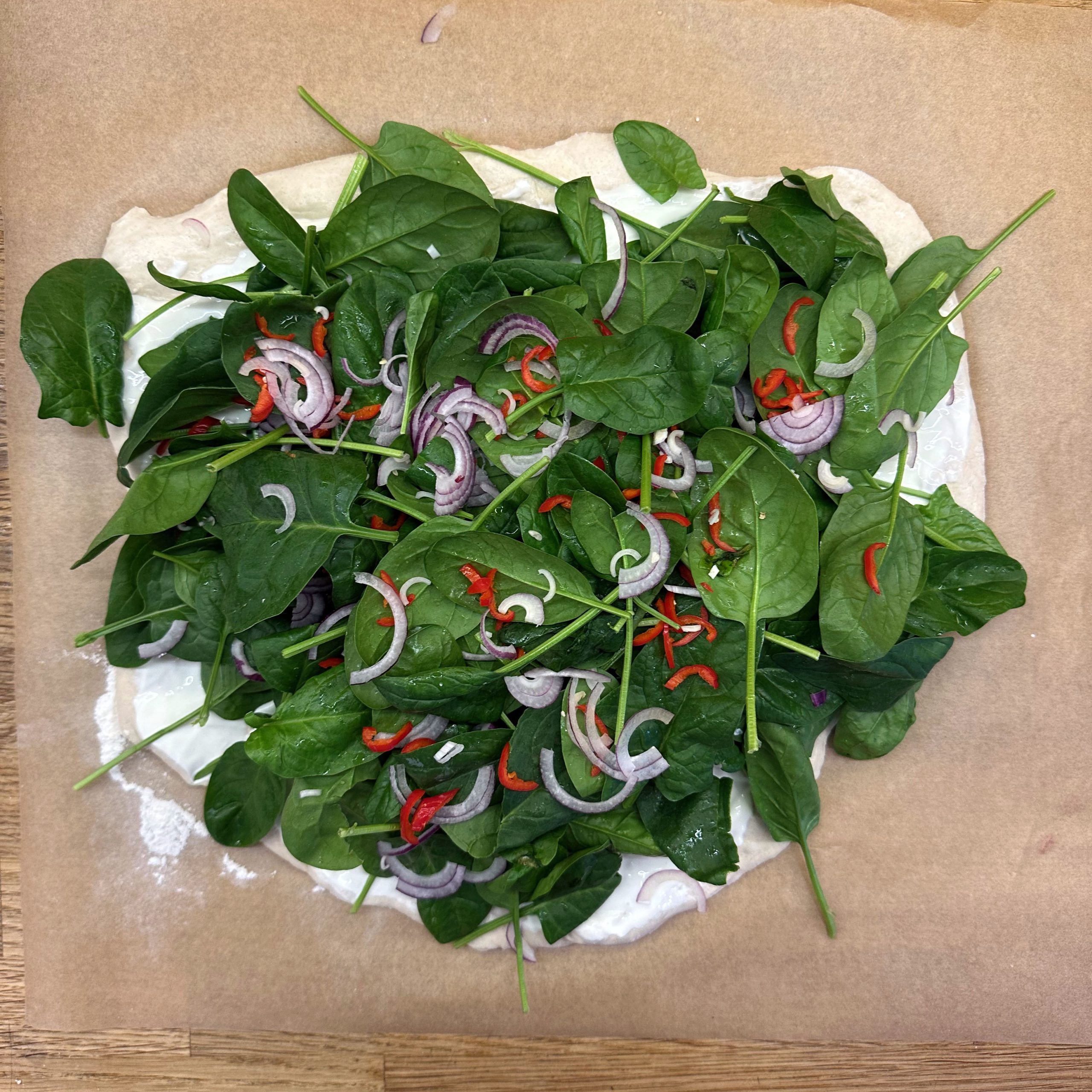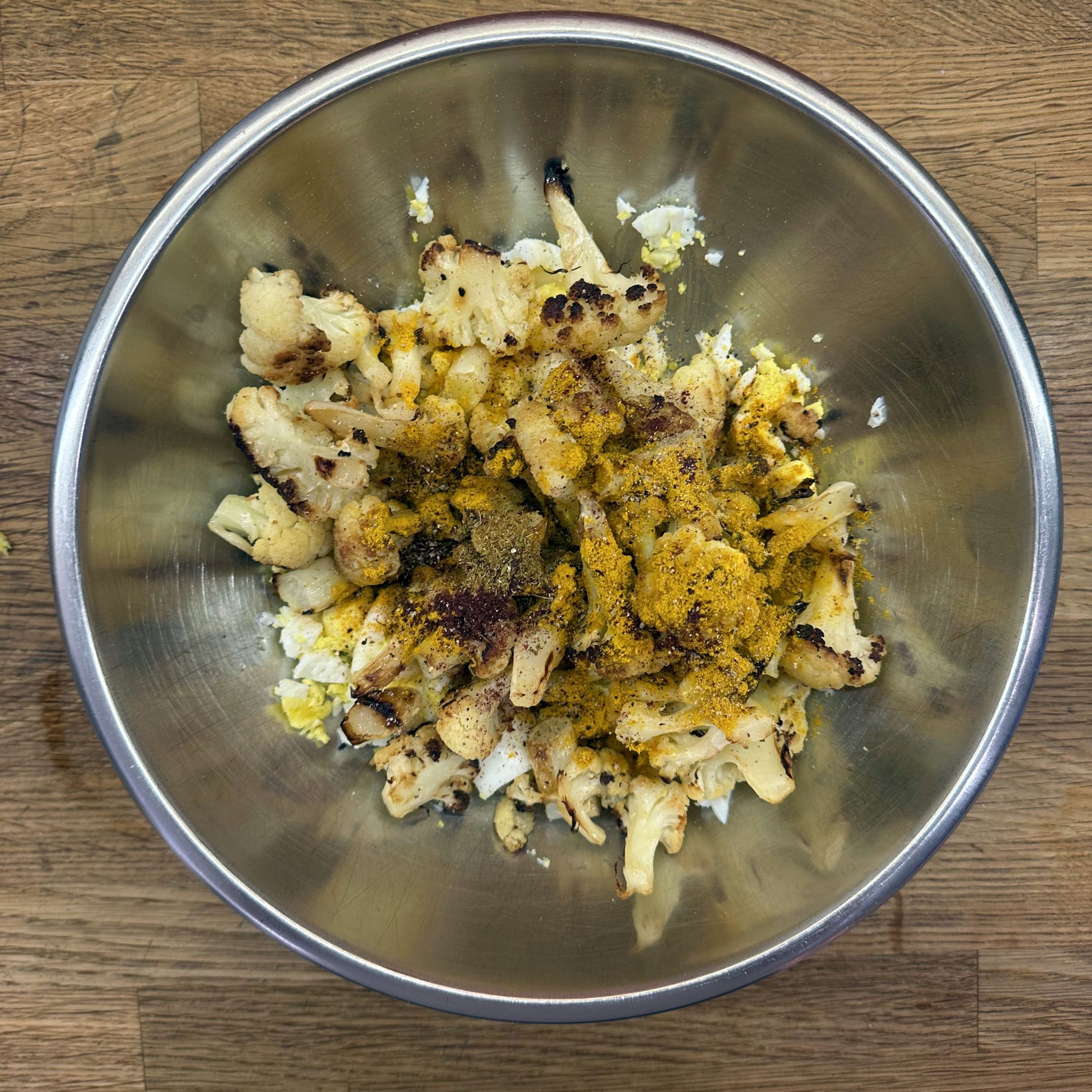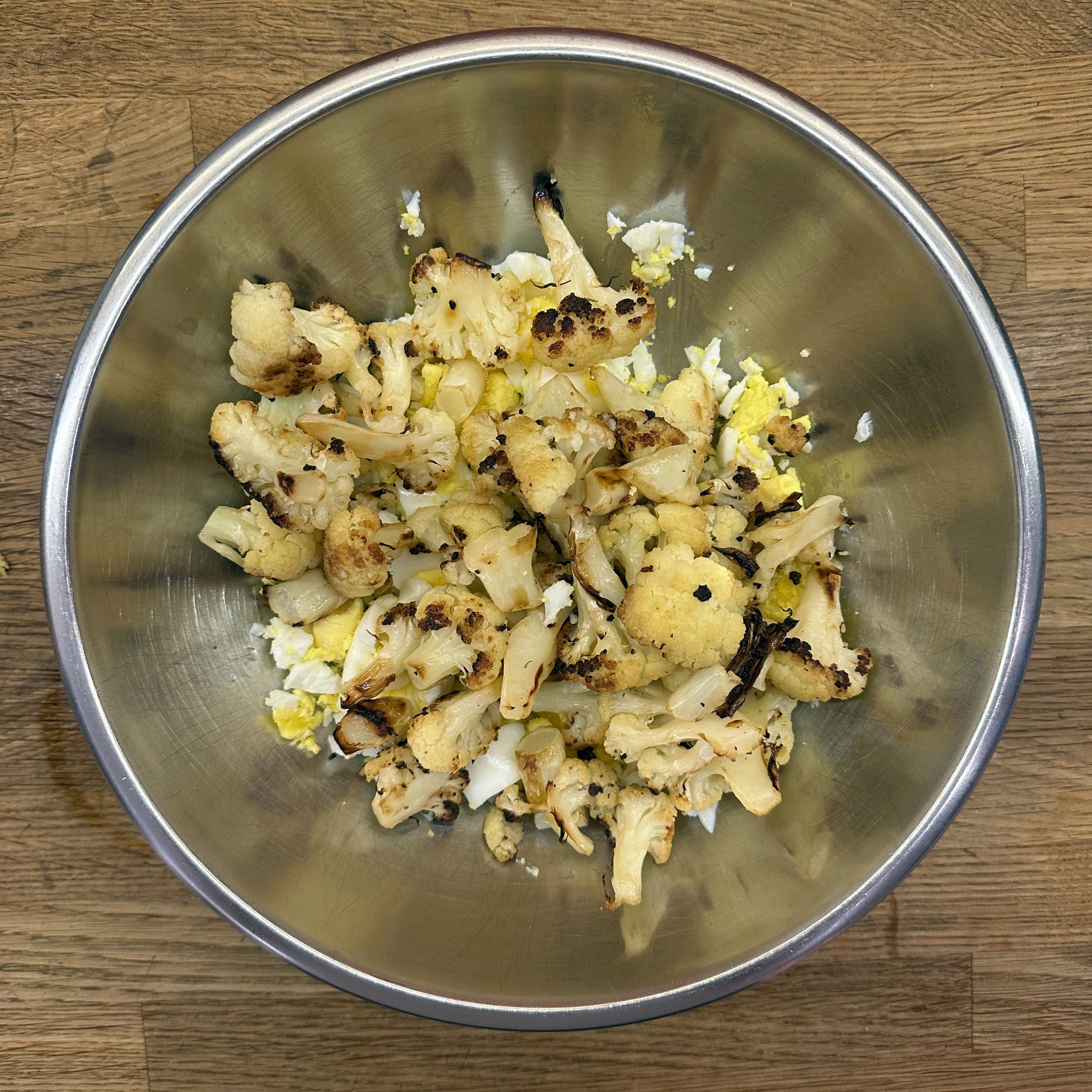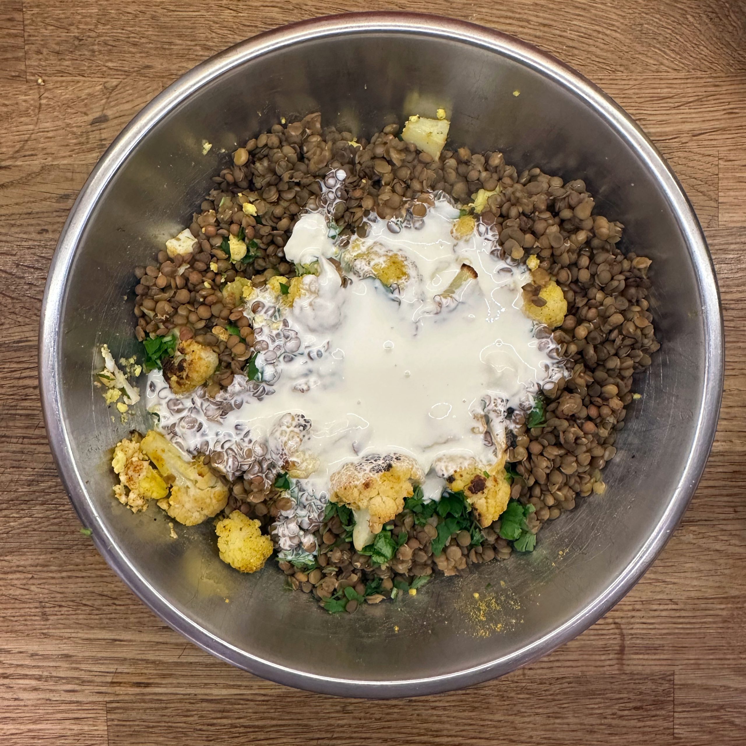 Noch einen Teigling von gestern übrig, den dann wieder mit Schmand, frischem Spinat, Zwiebeln und Chili belegt. Im Ofen auf dem Pizzablech 14 Min. bei 230° Umluft gebacken. Daneben den Salat aus geröstetem Blumenkohl gemacht: 1 Blumenkohl in 4 cm große Röschen teilen, mit 4 EL Olivenöl, 2 TL mildem Currypulver und etwas Salz in einer Backform vermengen. In der Backform im Ofen 30 Min. rösten, bis die Röschen goldbraun und weich sind. 125 g grüne oder braune Linsen waschen und in leicht gesalzenem Wasser bissfest kochen, in ein Sieb abtropfen lassen und abkühlen lassen. 4 Eier 9 Min. kochen, herausnehmen, kalt abspülen, abkühlen lassen, pellen und in einer großen Schüssel grob zerdrücken. Blumenkohl, 0,5 Bund gehackte Petersilie, 1 TL Sumach und 1 TL zerstoßenen Kreuzkümmel mit den Eiern vermengen. Linsen abtropfen lassen und unterrühren. 100 g Joghurt, 50 g Mayonnaise und den Saft einer halben Zitrone verrühren und vorsichtig mit dem Rest vermengen.