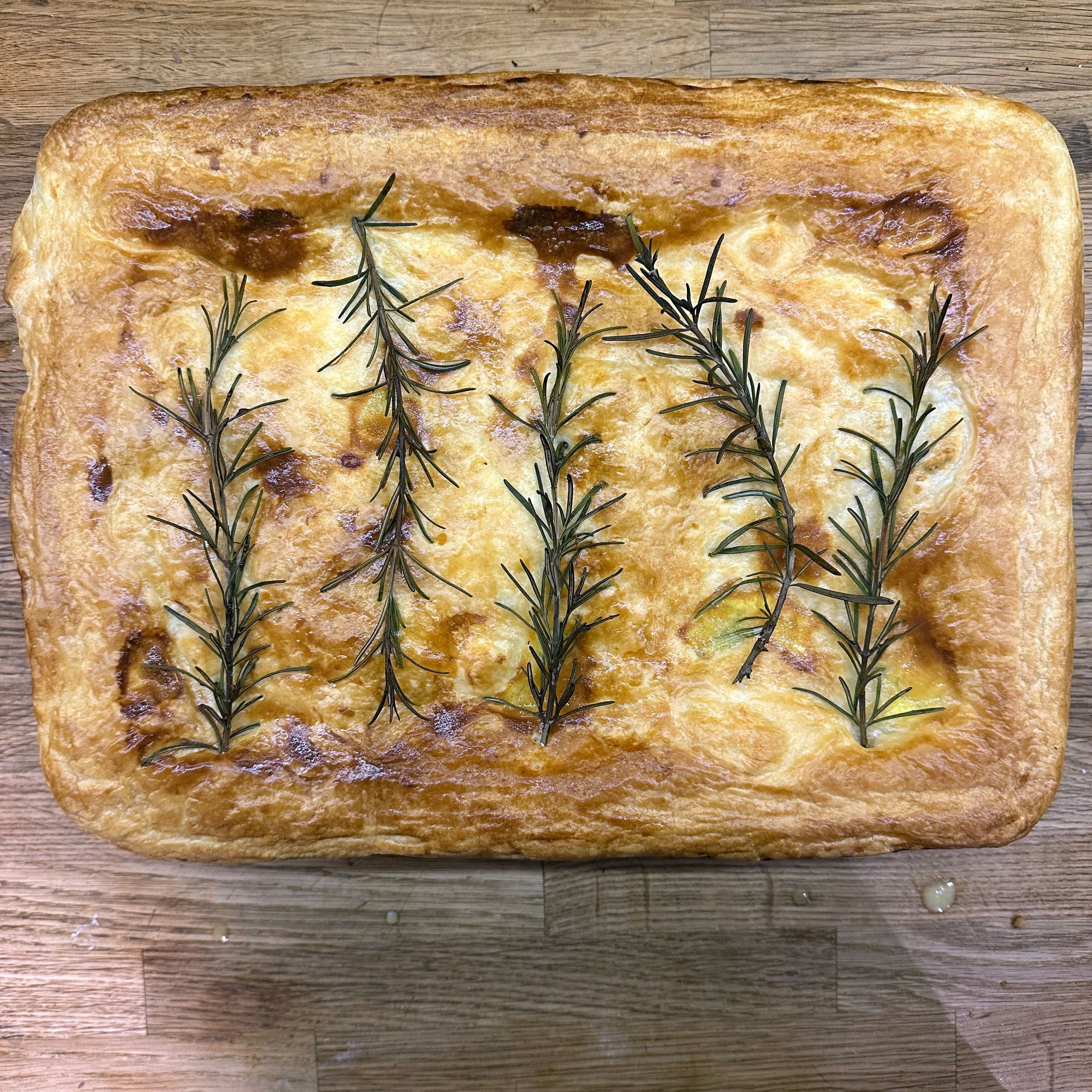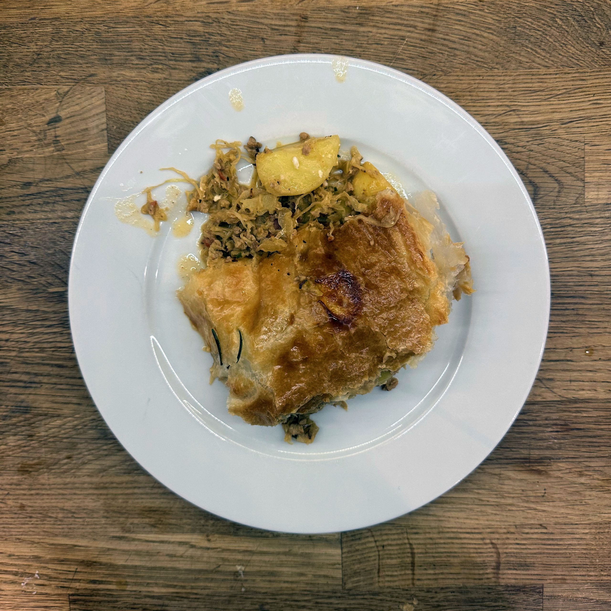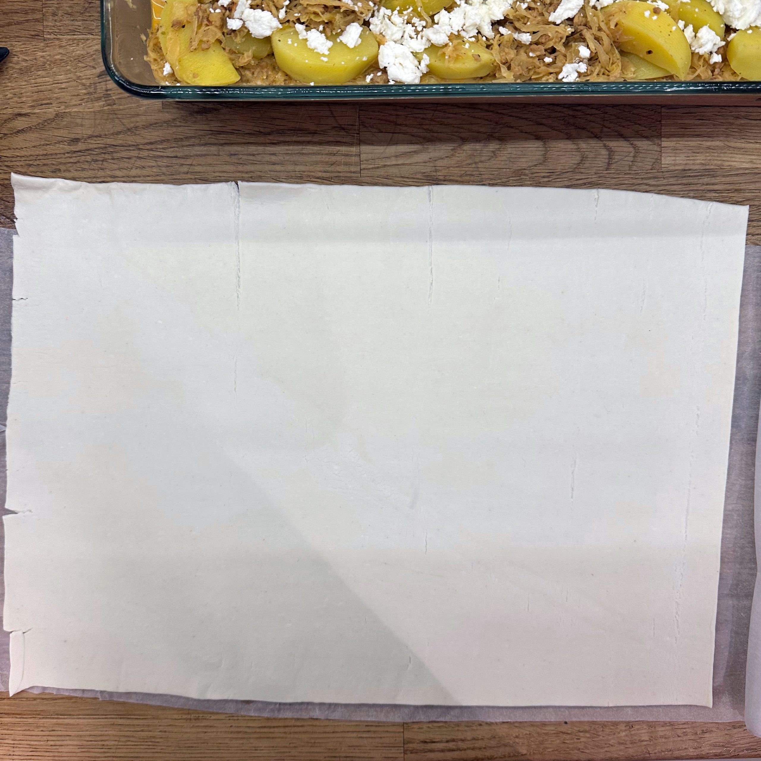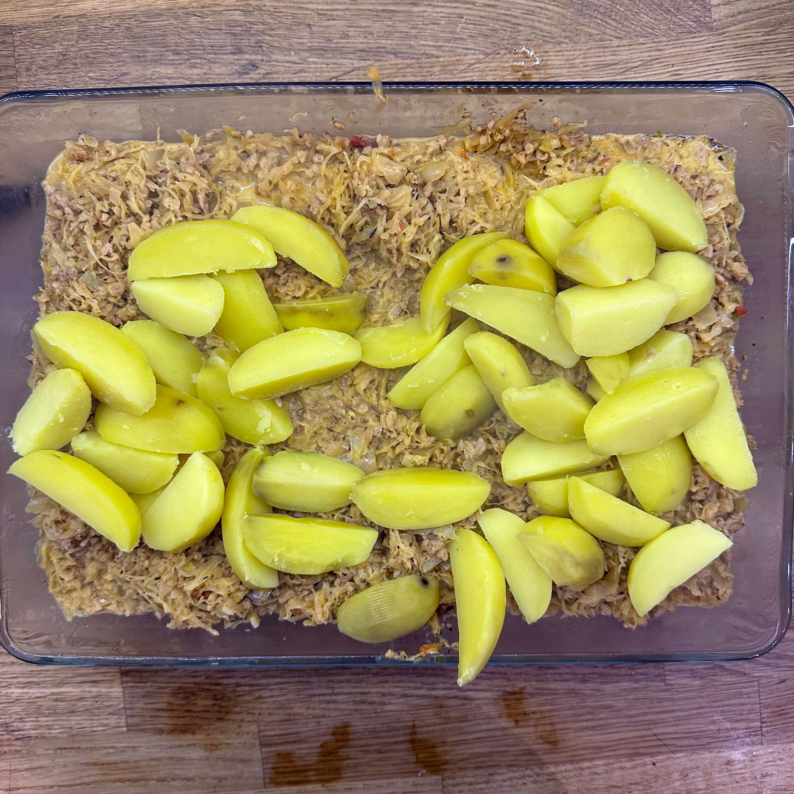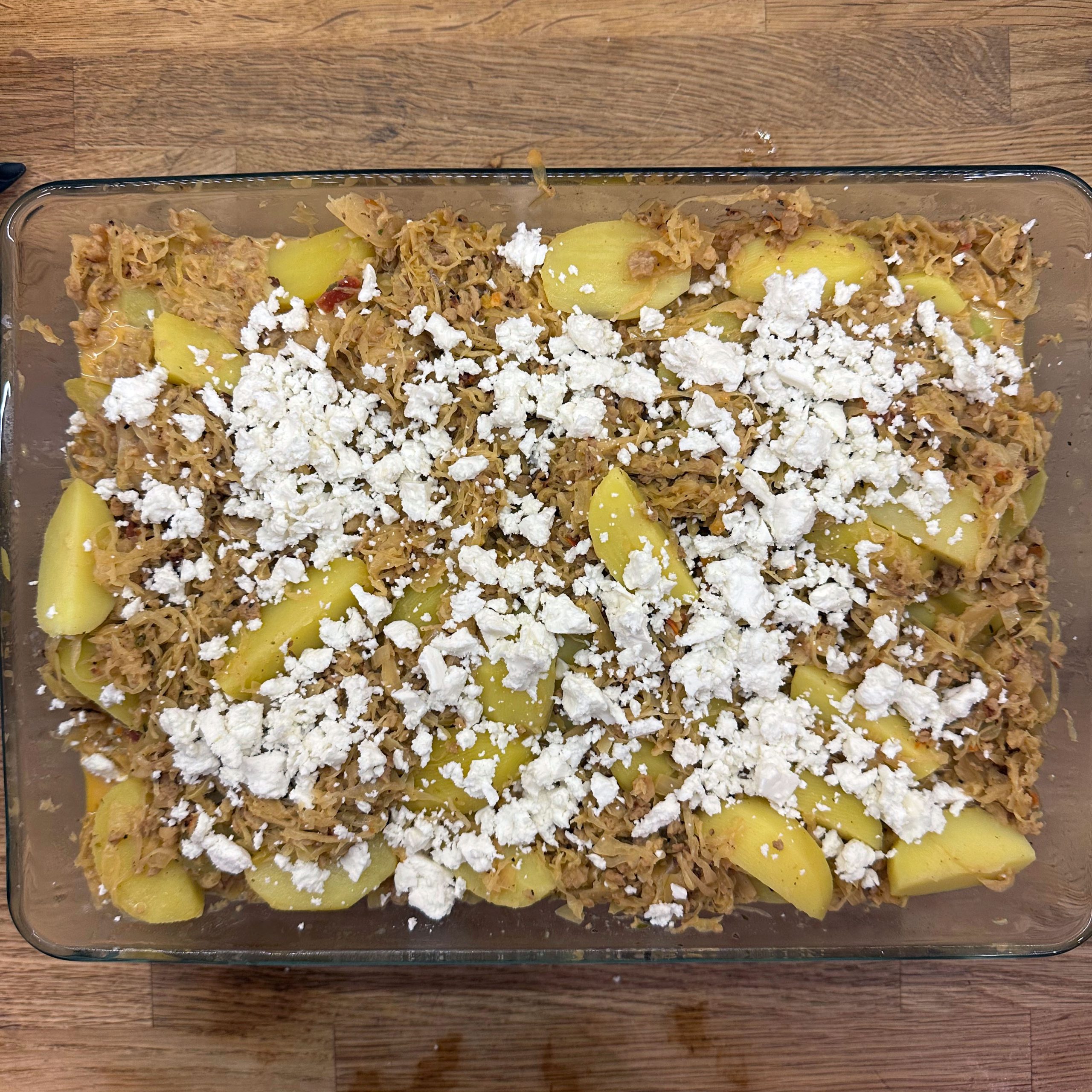 200 g Sojahack in kochender Brühe 10 Minuten einweichen, auswringen und in etwas Öl scharf anbraten. 2 gewürfelte Zwiebeln hinzufügen und mitbraten, 750 g Sauerkraut unterrühren, mit Salz, Pfeffer und 1 TL Kümmel würzen und 1 Becher Sahne unterrühren. 750 g Kartoffeln schälen, achteln und in Salzwasser 15 Minuten kochen, abgießen. Sauerkraut-Sojahack-Mischung in eine gefettete Auflaufform geben, die gekochten Kartoffelecken darauf verteilen und alles vorsichtig vermengen. 1 Platte Blätterteig ausrollen und auf die Größe der Auflaufform zuschneiden, Rosmarinzweige auf den Blätterteig legen und leicht andrücken, den Blätterteig mit der Rosmarinseite nach oben als Deckel auf den Auflauf legen und die Ränder leicht festdrücken. Bei 200° Umluft 25–30 Minuten backen, bis der Blätterteig goldbraun und knusprig ist.