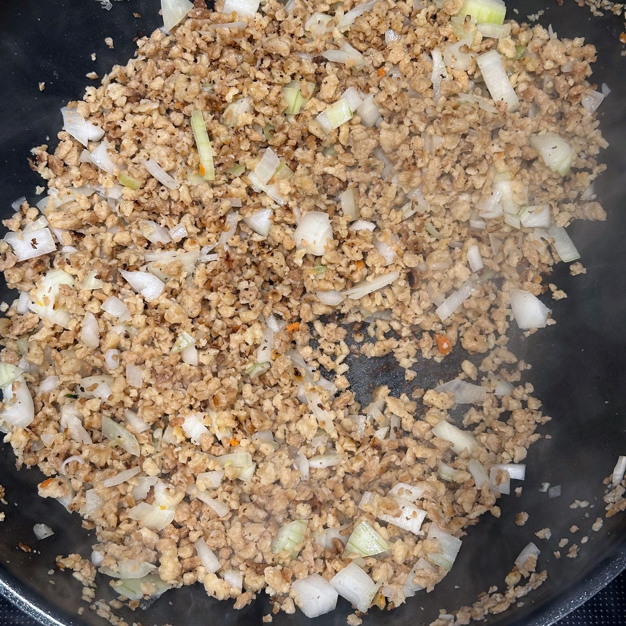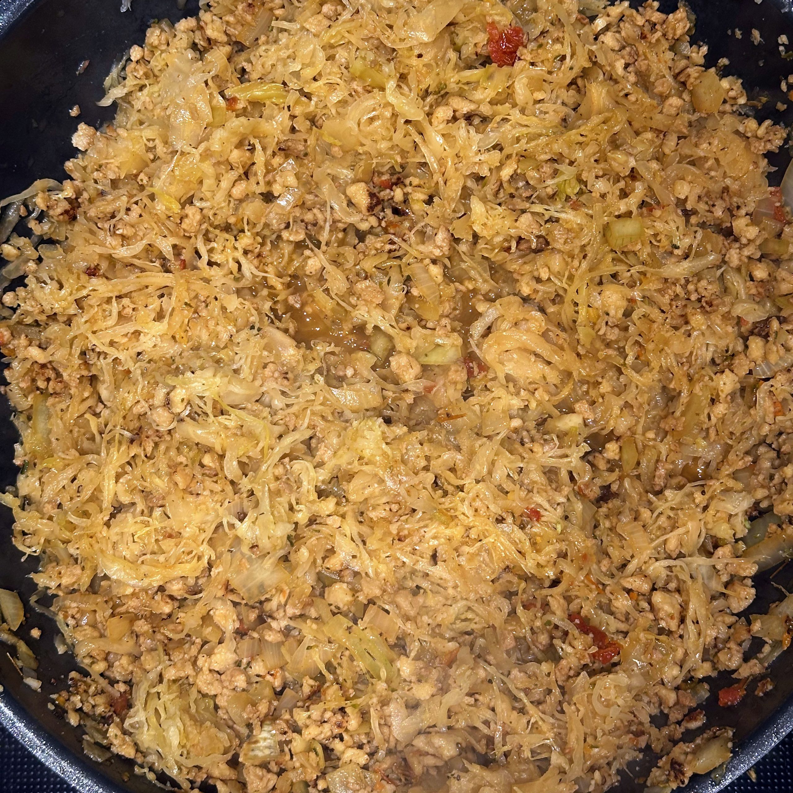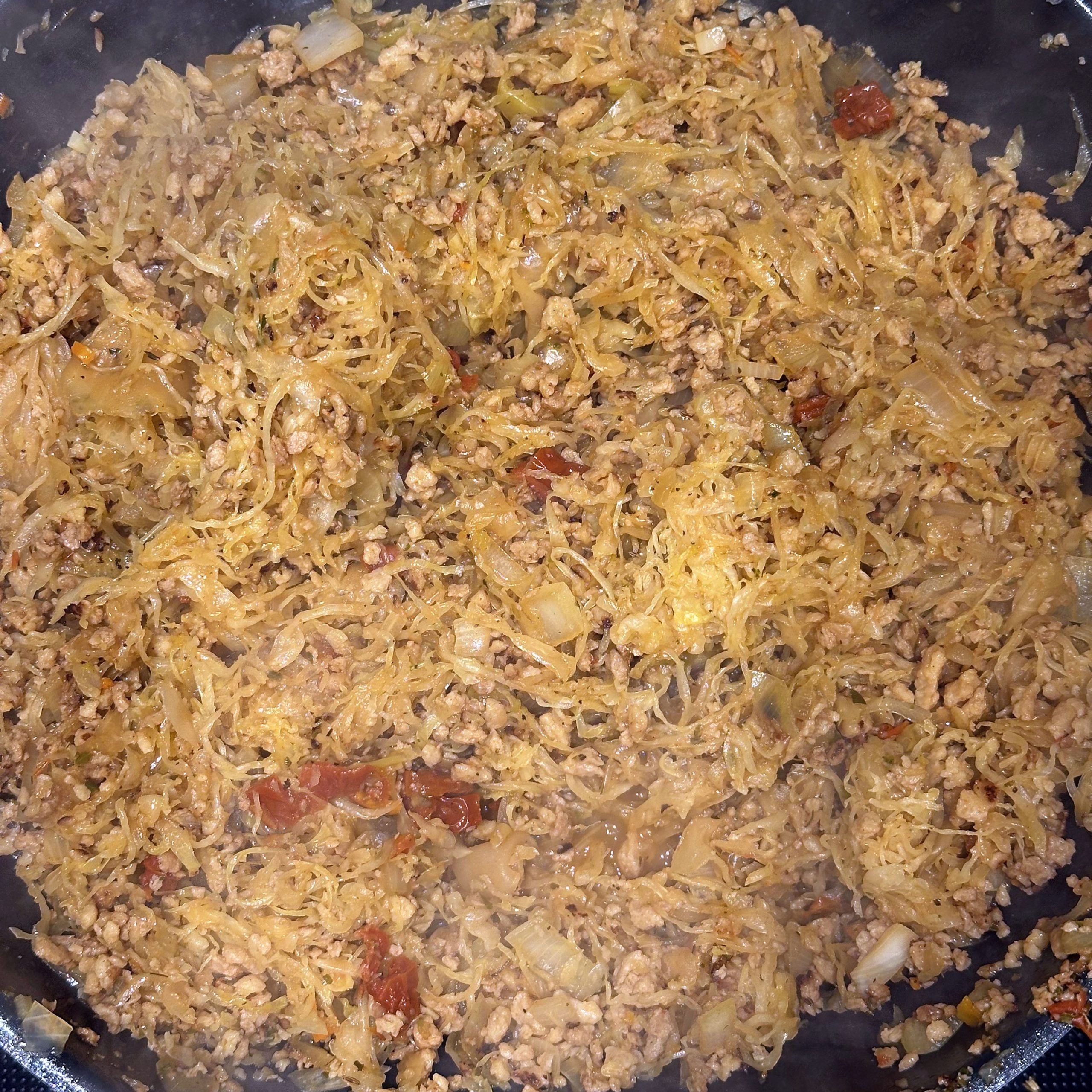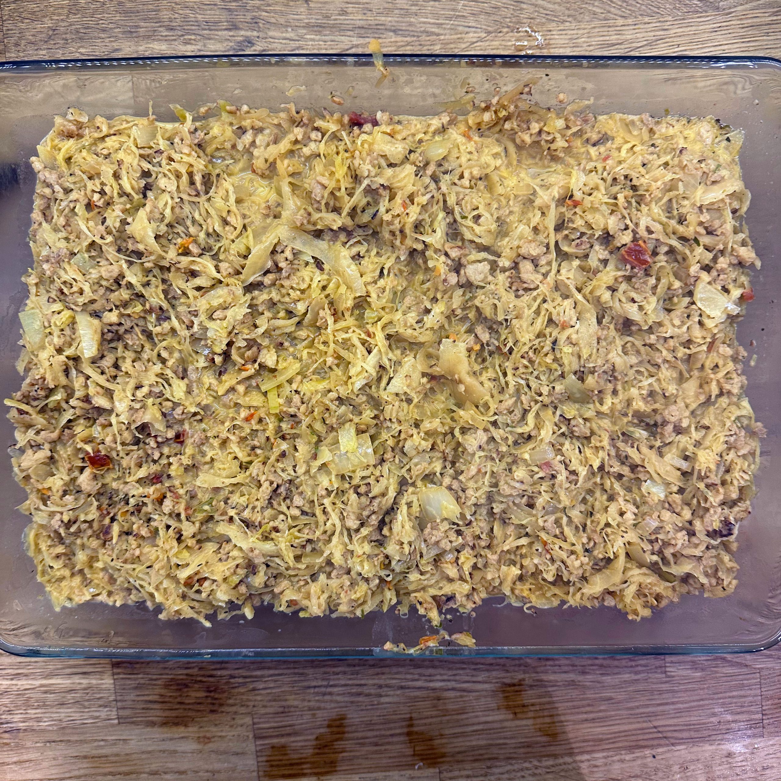 200 g Sojahack in kochender Brühe 10 Minuten einweichen, auswringen und in etwas Öl scharf anbraten. 2 gewürfelte Zwiebeln hinzufügen und mitbraten, 750 g Sauerkraut unterrühren, mit Salz, Pfeffer und 1 TL Kümmel würzen und 1 Becher Sahne unterrühren. 750 g Kartoffeln schälen, achteln und in Salzwasser 15 Minuten kochen, abgießen. Sauerkraut-Sojahack-Mischung in eine gefettete Auflaufform geben, die gekochten Kartoffelecken darauf verteilen und alles vorsichtig vermengen. 1 Platte Blätterteig ausrollen und auf die Größe der Auflaufform zuschneiden, Rosmarinzweige auf den Blätterteig legen und leicht andrücken, den Blätterteig mit der Rosmarinseite nach oben als Deckel auf den Auflauf legen und die Ränder leicht festdrücken. Bei 200° Umluft 25–30 Minuten backen, bis der Blätterteig goldbraun und knusprig ist.