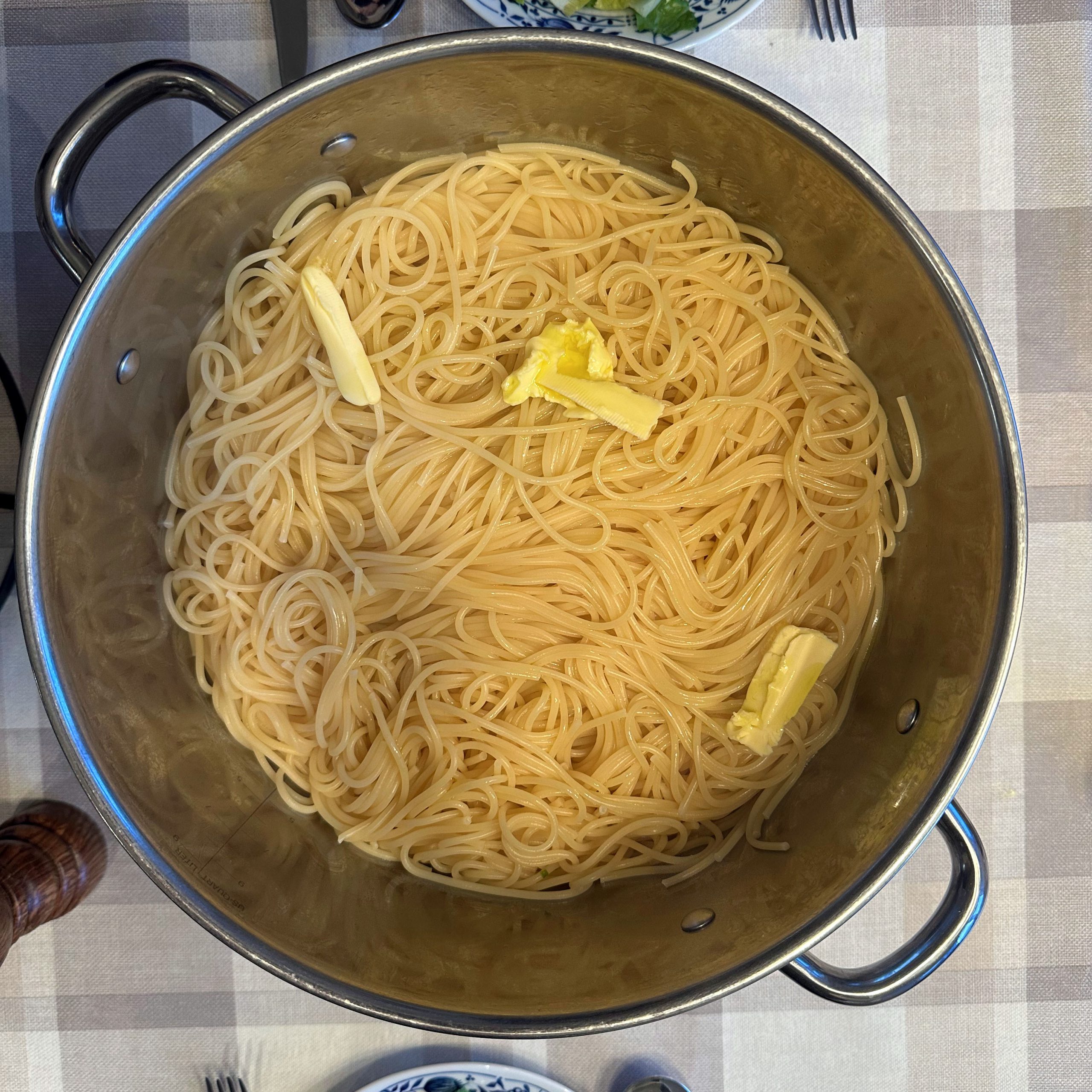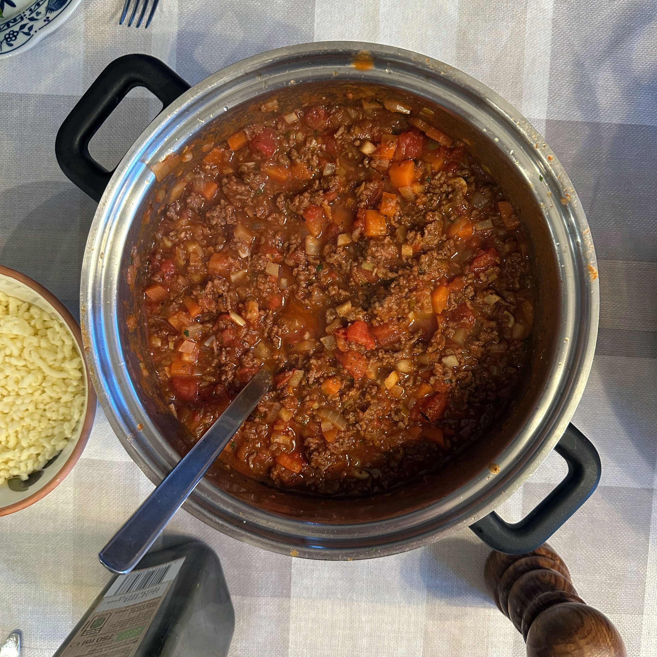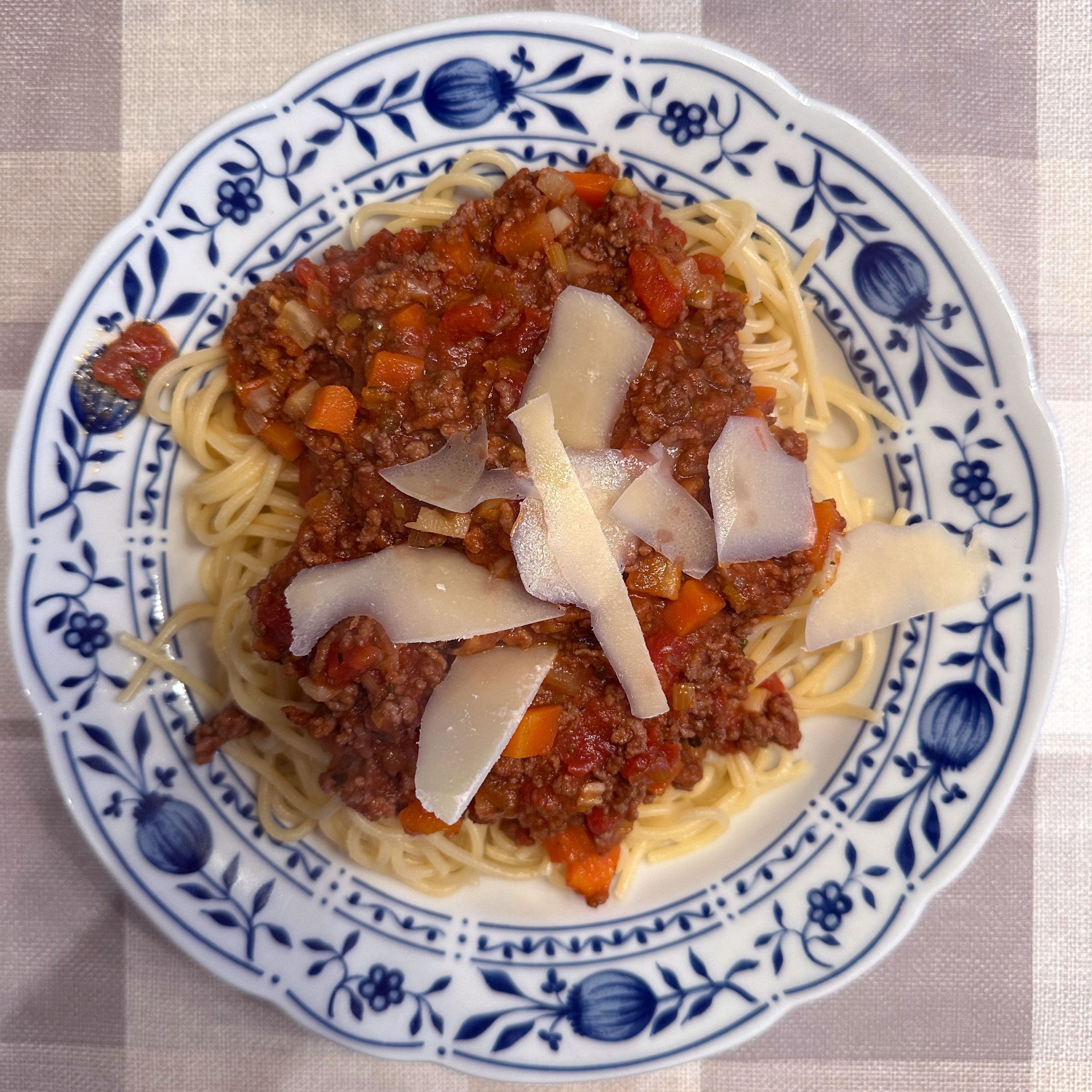 Erstes Abendessen in voller Besetzung auf unserem C3-Skatwochenende im Seebad Ahlbeck: 1,5kg Spaghetti nach Packungsanweisung in Salzwasser kochen. 1,5kg Rinderhackfleisch in etwas Öl in mehreren Chargen bei hoher Hitze krümelig anbraten und beiseitestellen. 5 gewürfelte Zwiebeln, 8 Knoblauchzehen fein gehackt und 4 Chilischoten entkernt und fein gehackt in etwas Öl anbraten. 2 Bund Suppengrün putzen, fein würfeln und 10min mitbraten. Das Hackfleisch wieder in den Topf geben, 3EL Tomatenmark unterrühren und kurz mitrösten. Mit 300ml Rotwein ablöschen, 5 Dosen stückige Tomaten und 300ml Gemüsebrühe hinzufügen, 2 Lorbeerblätter und 1TL Oregano dazugeben und mit Salz und Pfeffer würzen. Mit geschlossenem Deckel 40-50min bei niedriger Hitze köcheln lassen, gelegentlich umrühren. Mit Salz, Pfeffer und etwas Zucker abschmecken. Spaghetti abgießen, mit der Bolognese auf Tellern anrichten und mit geriebenem Parmesan servieren.