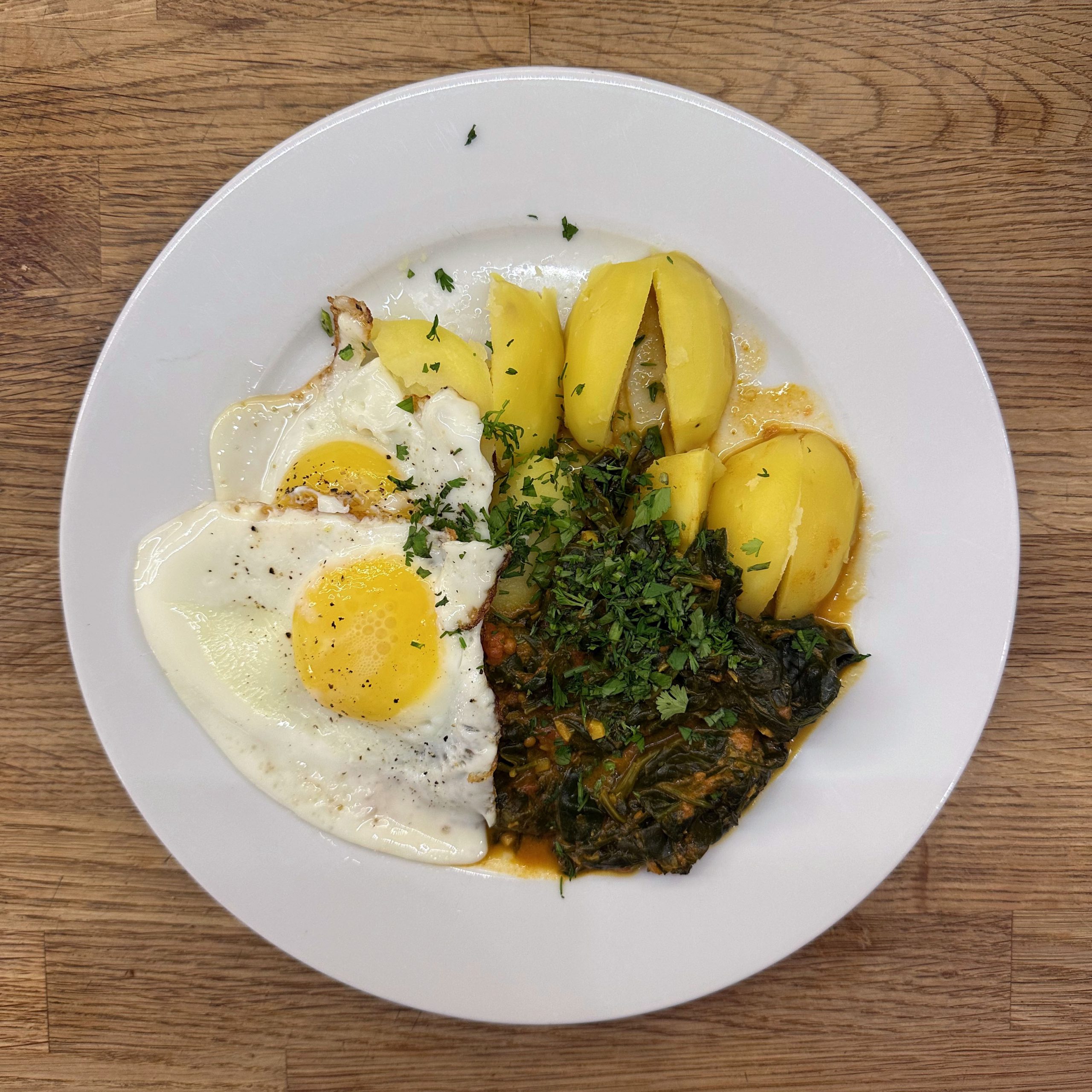 Karine kocht den Klassiker, aber mit indischer Note: für den Spinat etwas Ingwer in einem Wok anbraten, mit 1 TL Garam Masala kurz mitbraten und mit 0,5 Dose Tomaten ablöschen, 10 min köcheln lassen. 300 g frischen Spinat unterrühren und köcheln, bis der zusammengefallen ist. Kartoffeln kochen und Eier braten und zusammen mit dem Spinat servieren. Mit Koriander bestreuen.