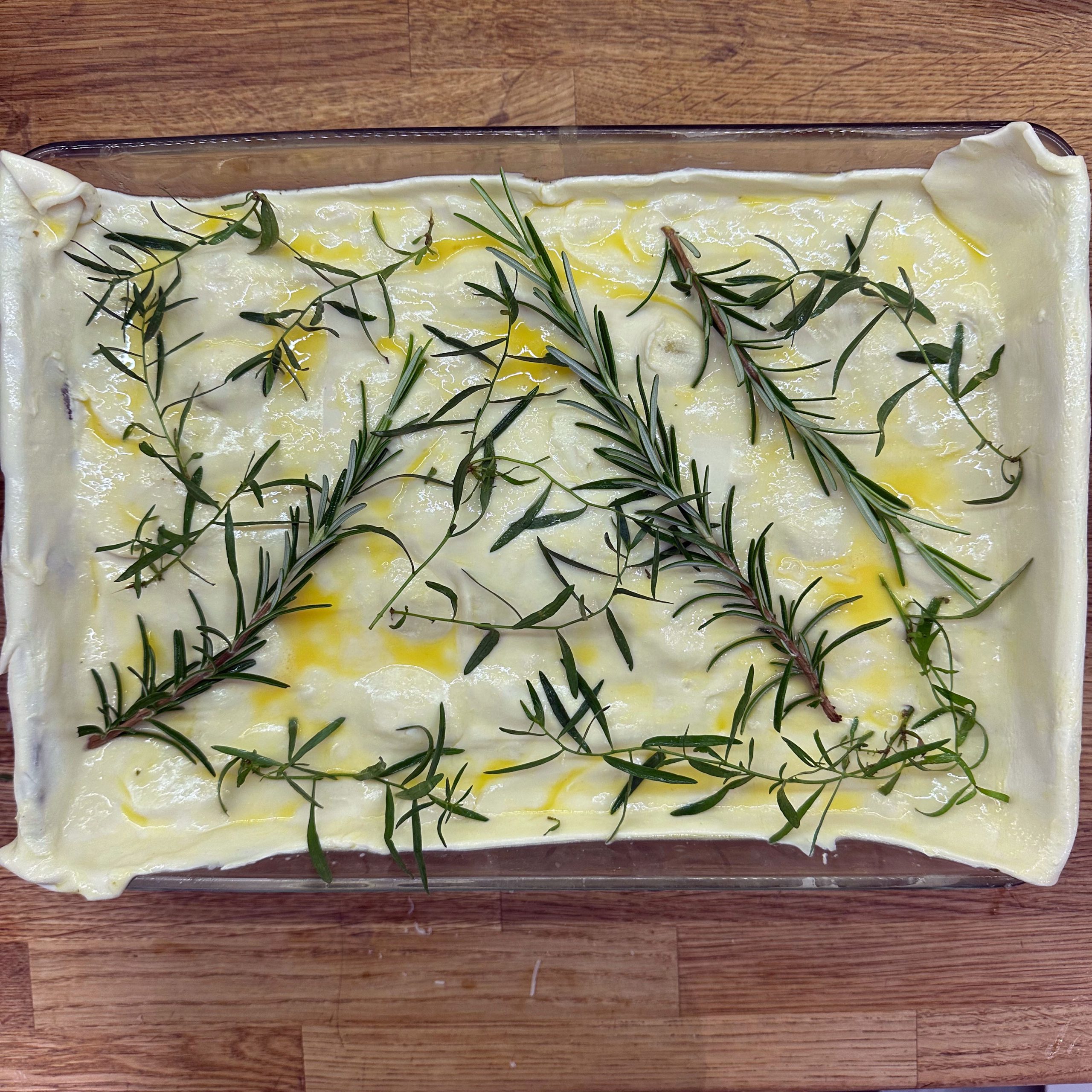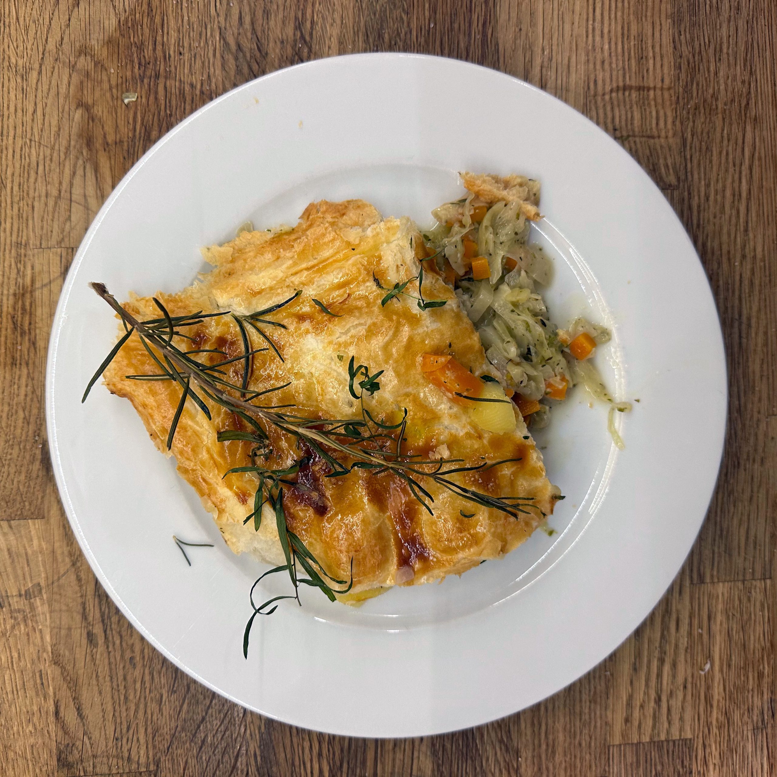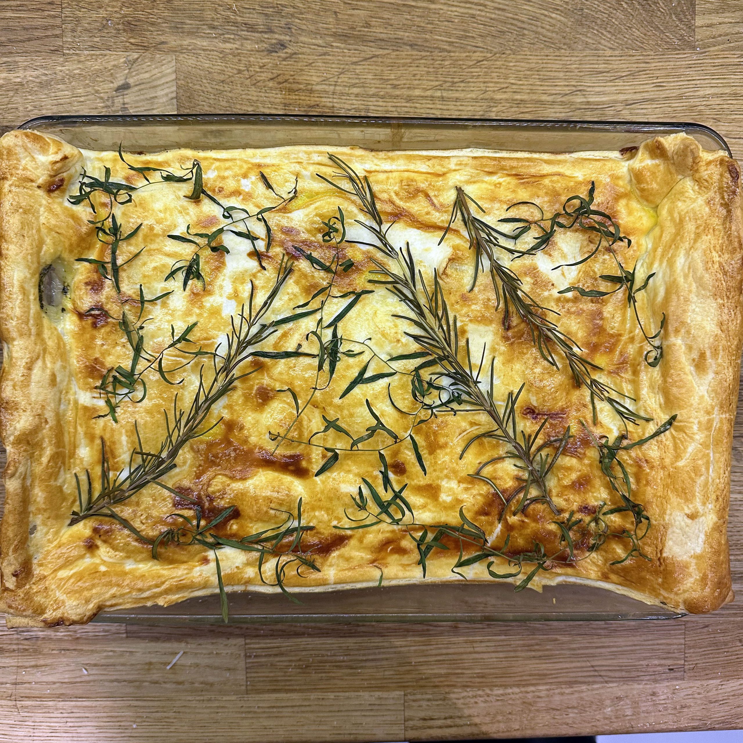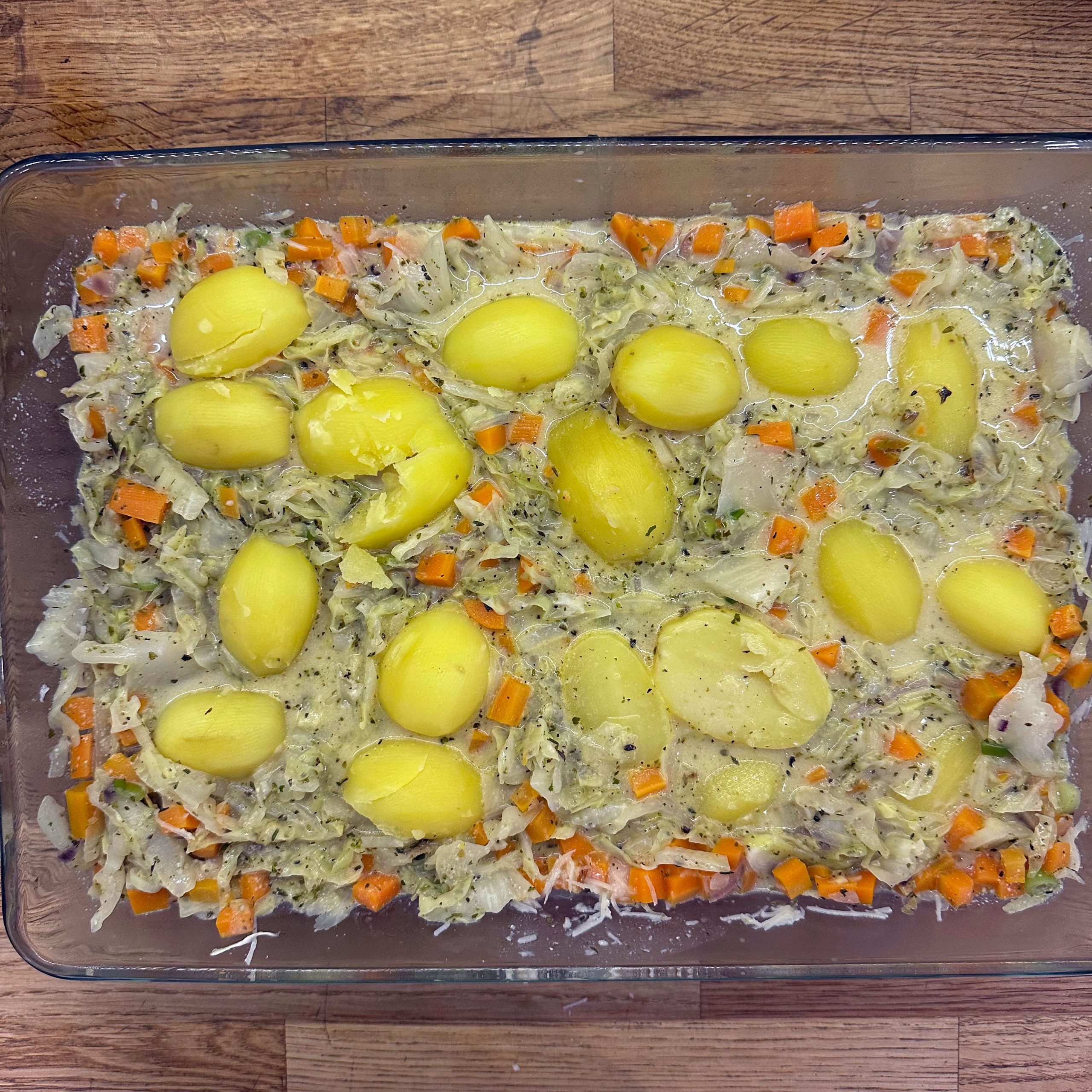 900g kleine Kartoffeln schälen und 20min in Salzwasser kochen, kurz abkühlen lassen und längs halbieren. 0,5 Spitzkohl vierteln und den Strunk herausschneiden. Den Spitzkohl und 200g rote Zwiebeln in Streifen schneiden, 200g Möhren schälen und fein würfeln, 100g Parmesan grob reiben. 3 EL Erdnussöl in einer großen Pfanne erhitzen und das gesamte Gemüse etwa 5 Minuten anbraten. Mit 600ml Gemüsebrühe ablöschen und etwa 15 Minuten köcheln lassen, dann 200ml Kokos-Cuisine hinzufügen und weitere 5 Minuten köcheln. Die Pfanne vom Herd nehmen, mit Salz und Pfeffer würzen, den geriebenen Parmesan unterrühren und die Mischung in eine gefettete Auflaufform (ca. 30x20x5 cm) füllen. Den Ofen auf 200°C (Umluft 180°C) vorheizen. 300g Blätterteig auf die Größe der Auflaufform ausrollen, den oberen Rand der Form mit Wasser bepinseln, die Teigplatte darauflegen und etwas festdrücken. Mit 1 verquirltem Ei bepinseln und mit Estragon und Rosmarin bestreuen. Den Pie etwa 35 Minuten goldbraun backen und heiß servieren.