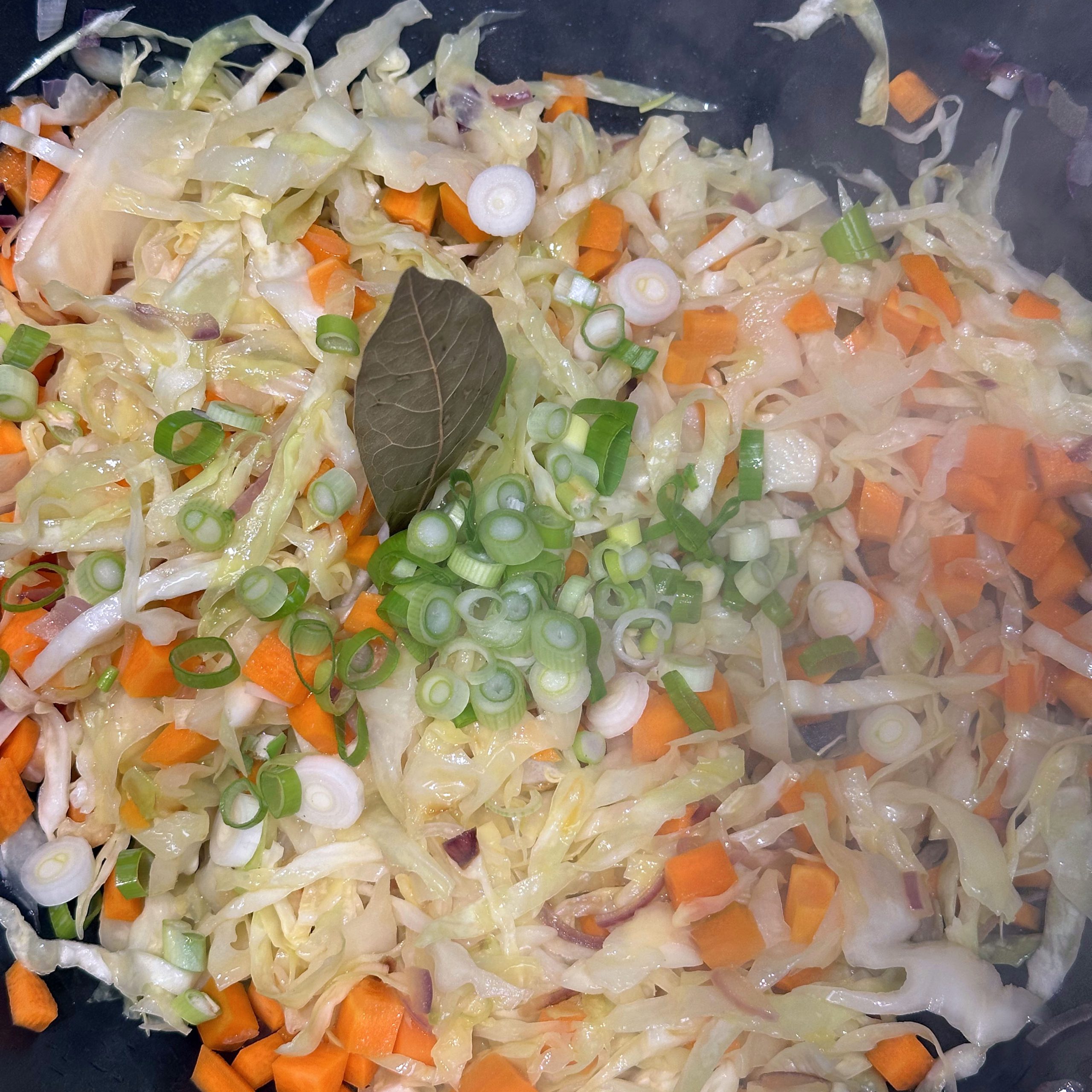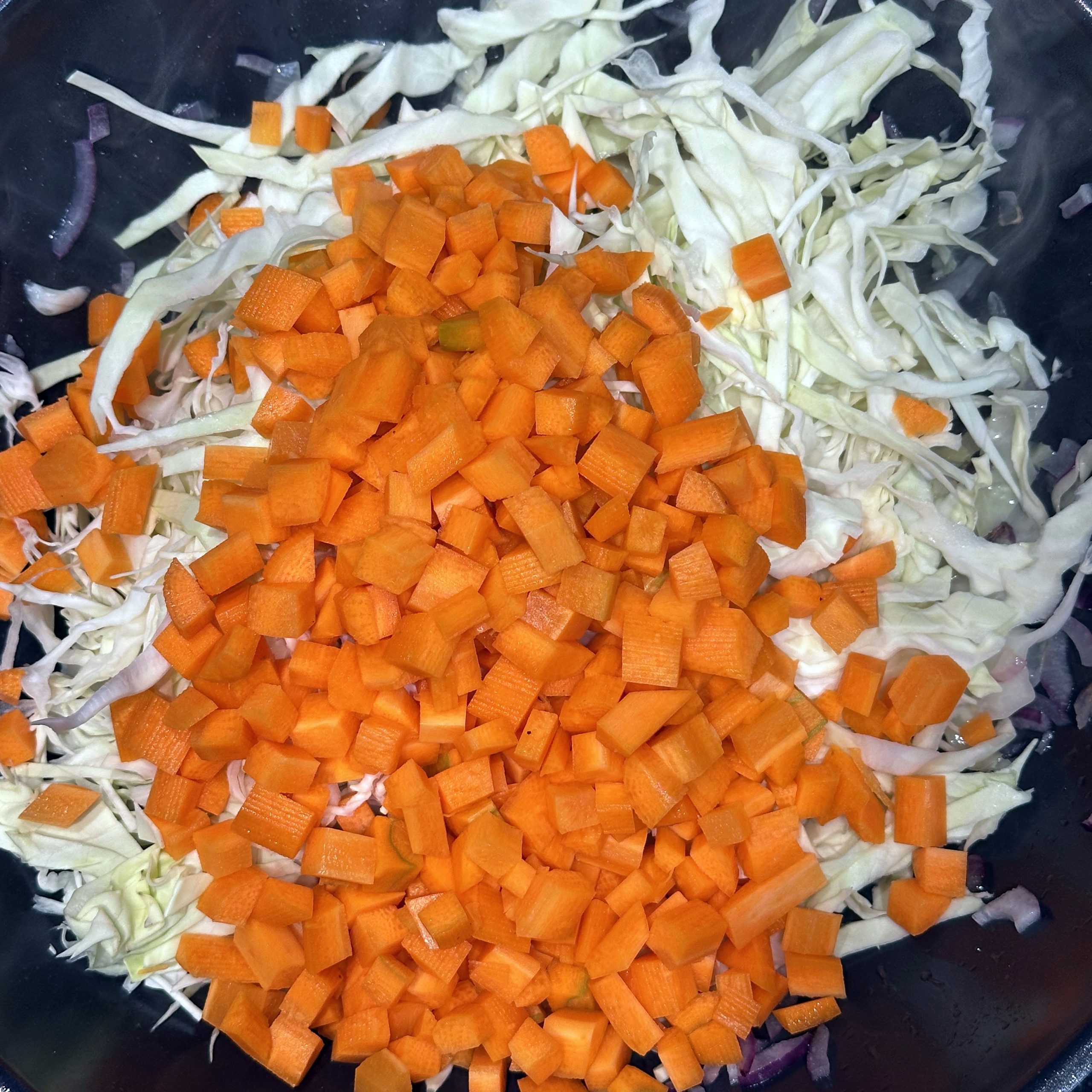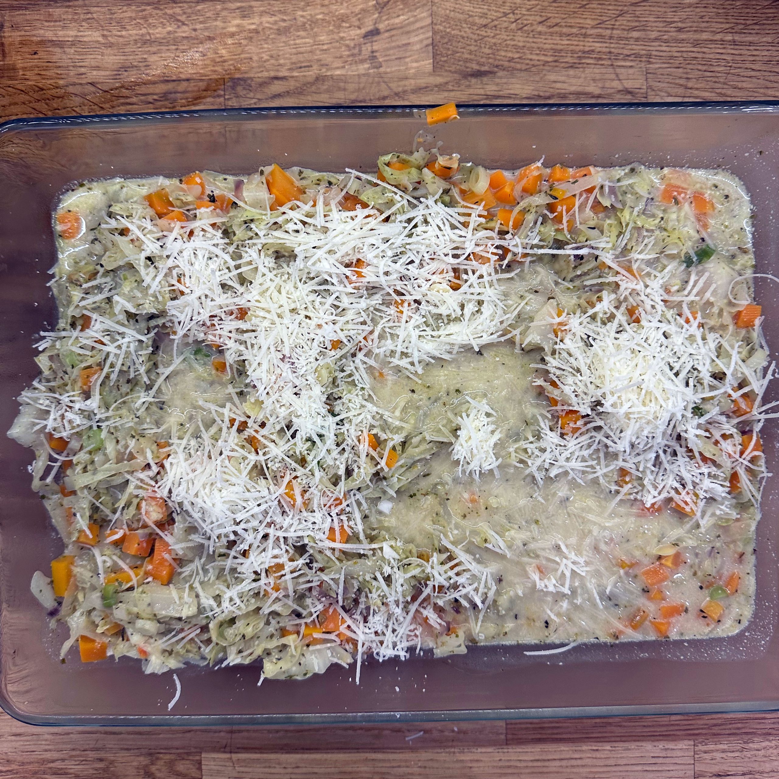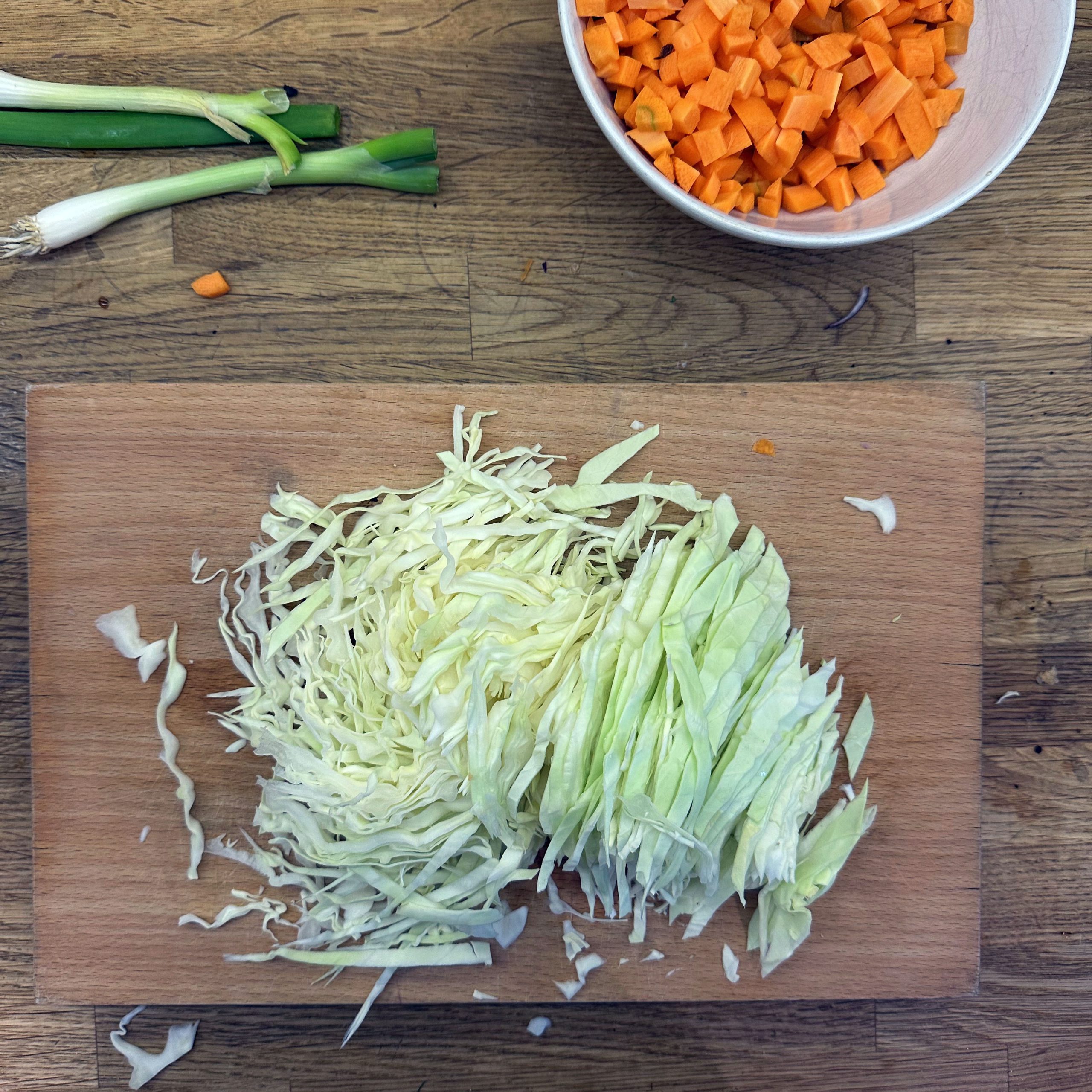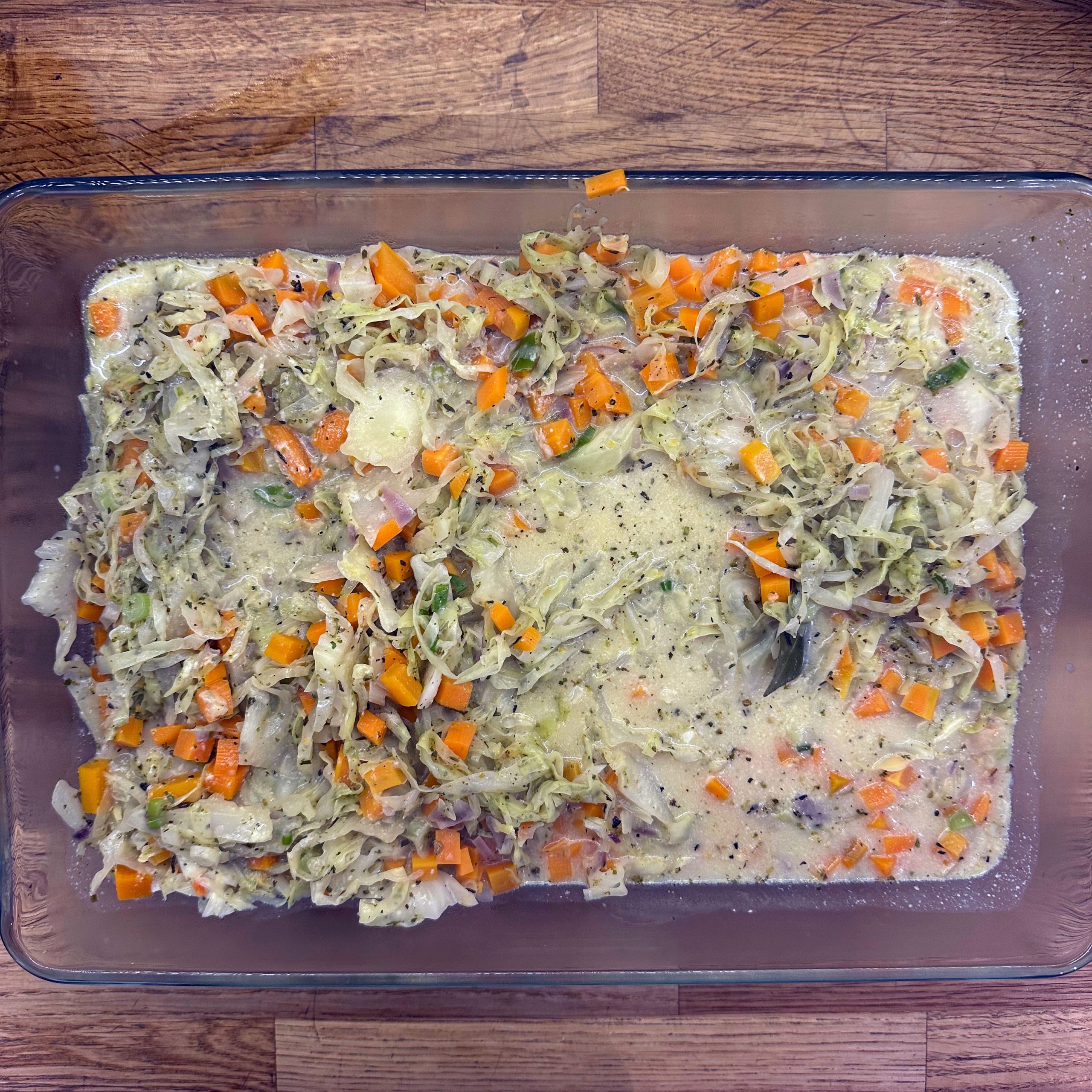 900g kleine Kartoffeln schälen und 20min in Salzwasser kochen, kurz abkühlen lassen und längs halbieren. 0,5 Spitzkohl vierteln und den Strunk herausschneiden. Den Spitzkohl und 200g rote Zwiebeln in Streifen schneiden, 200g Möhren schälen und fein würfeln, 100g Parmesan grob reiben. 3 EL Erdnussöl in einer großen Pfanne erhitzen und das gesamte Gemüse etwa 5 Minuten anbraten. Mit 600ml Gemüsebrühe ablöschen und etwa 15 Minuten köcheln lassen, dann 200ml Kokos-Cuisine hinzufügen und weitere 5 Minuten köcheln. Die Pfanne vom Herd nehmen, mit Salz und Pfeffer würzen, den geriebenen Parmesan unterrühren und die Mischung in eine gefettete Auflaufform (ca. 30x20x5 cm) füllen. Den Ofen auf 200°C (Umluft 180°C) vorheizen. 300g Blätterteig auf die Größe der Auflaufform ausrollen, den oberen Rand der Form mit Wasser bepinseln, die Teigplatte darauflegen und etwas festdrücken. Mit 1 verquirltem Ei bepinseln und mit Estragon und Rosmarin bestreuen. Den Pie etwa 35 Minuten goldbraun backen und heiß servieren.