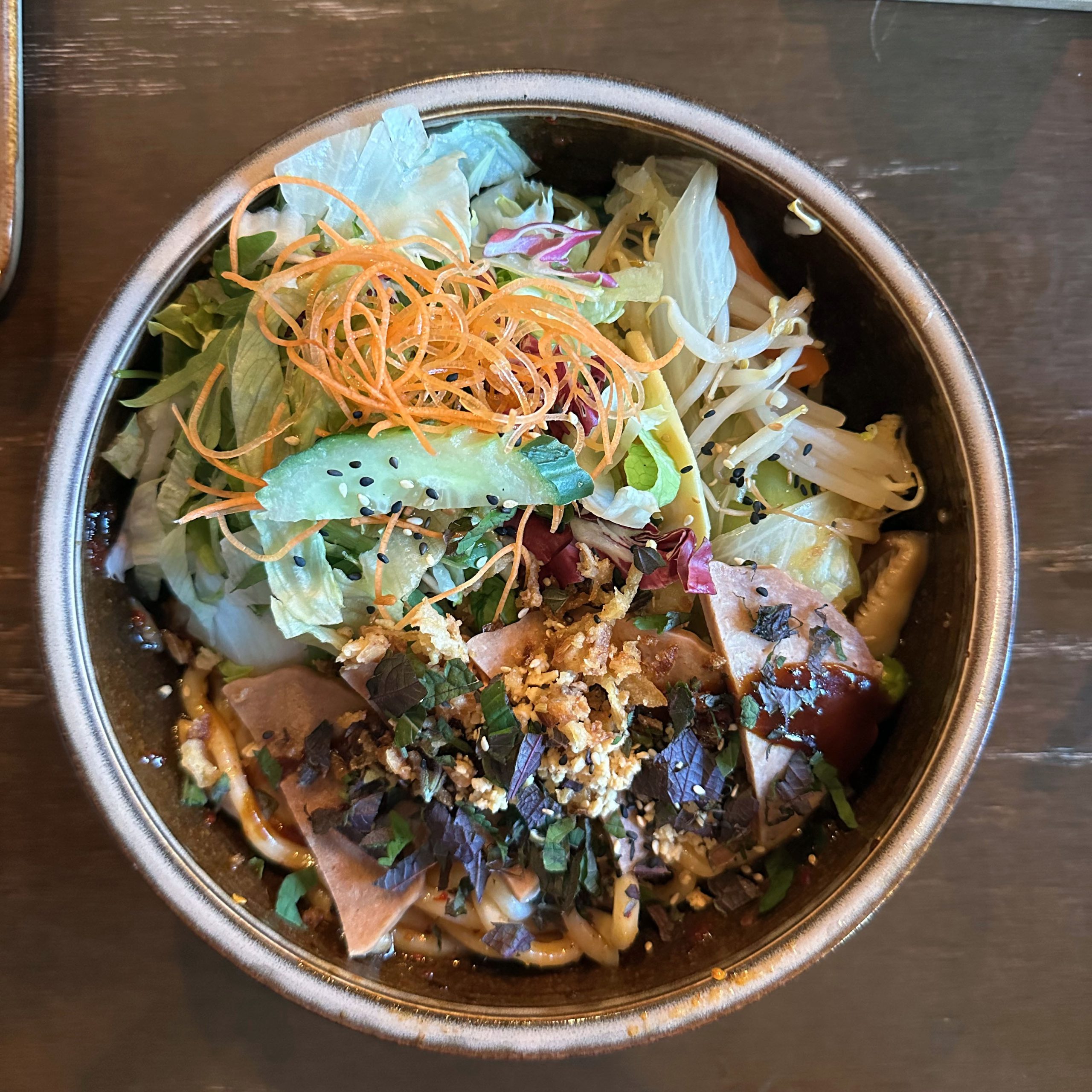 Udon-Nudeln mit selbstgemachter veganer vietnamesischer Wurst, Gemüse, Sesam, Röstzwiebeln, Erdnüssen, Kräutern, Sojasprossen und Chili-Pad-Thai-Soße. War okay.