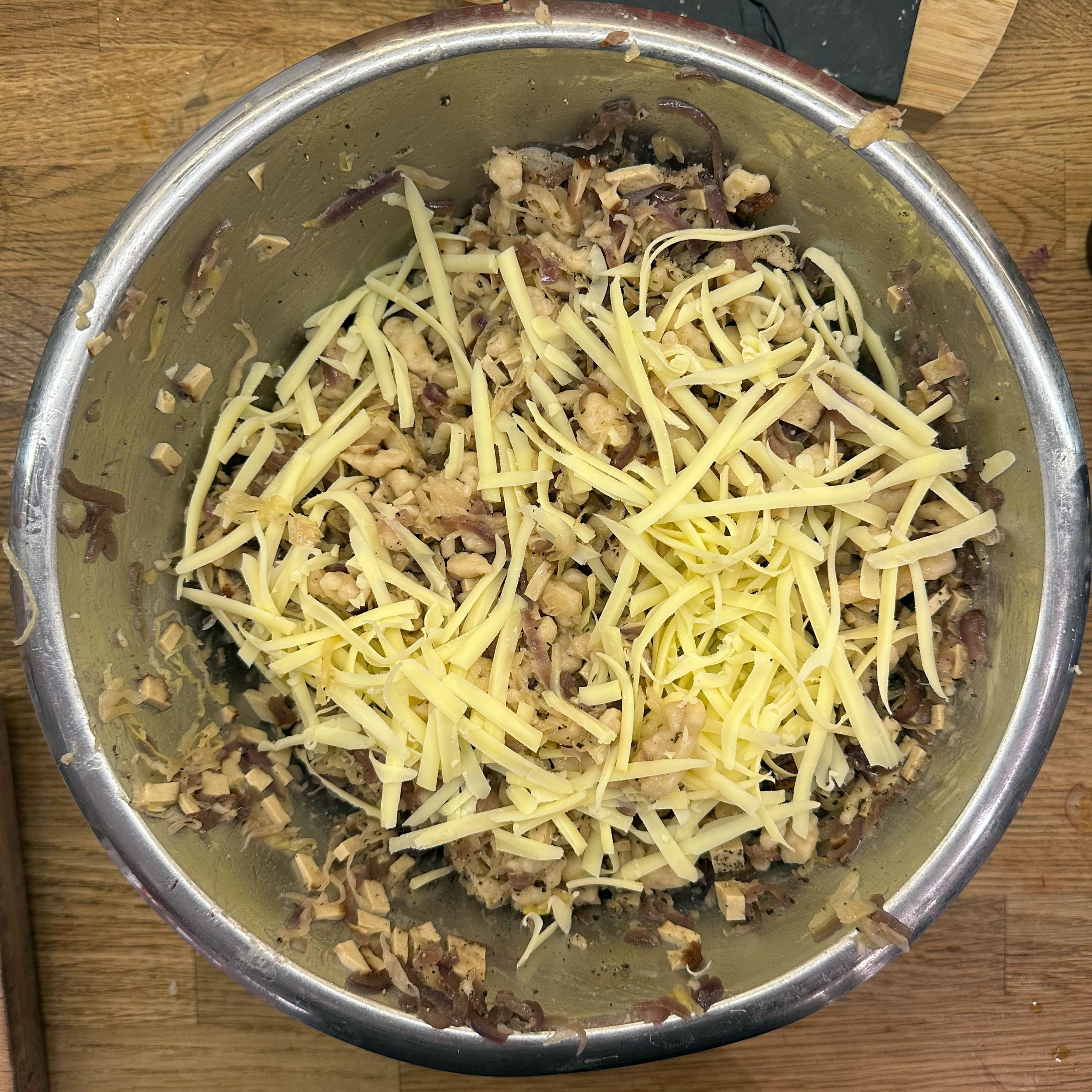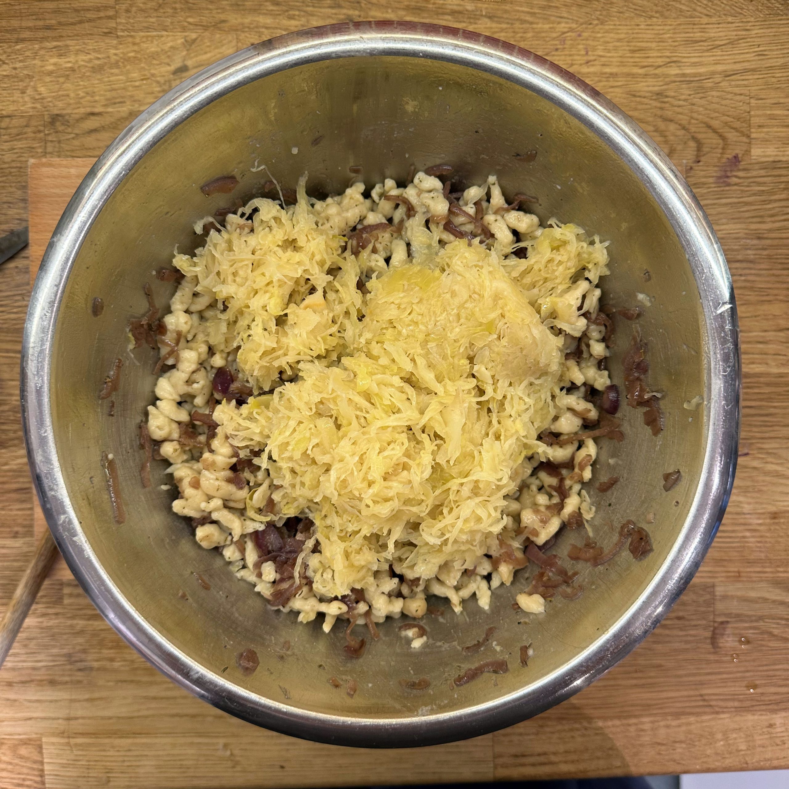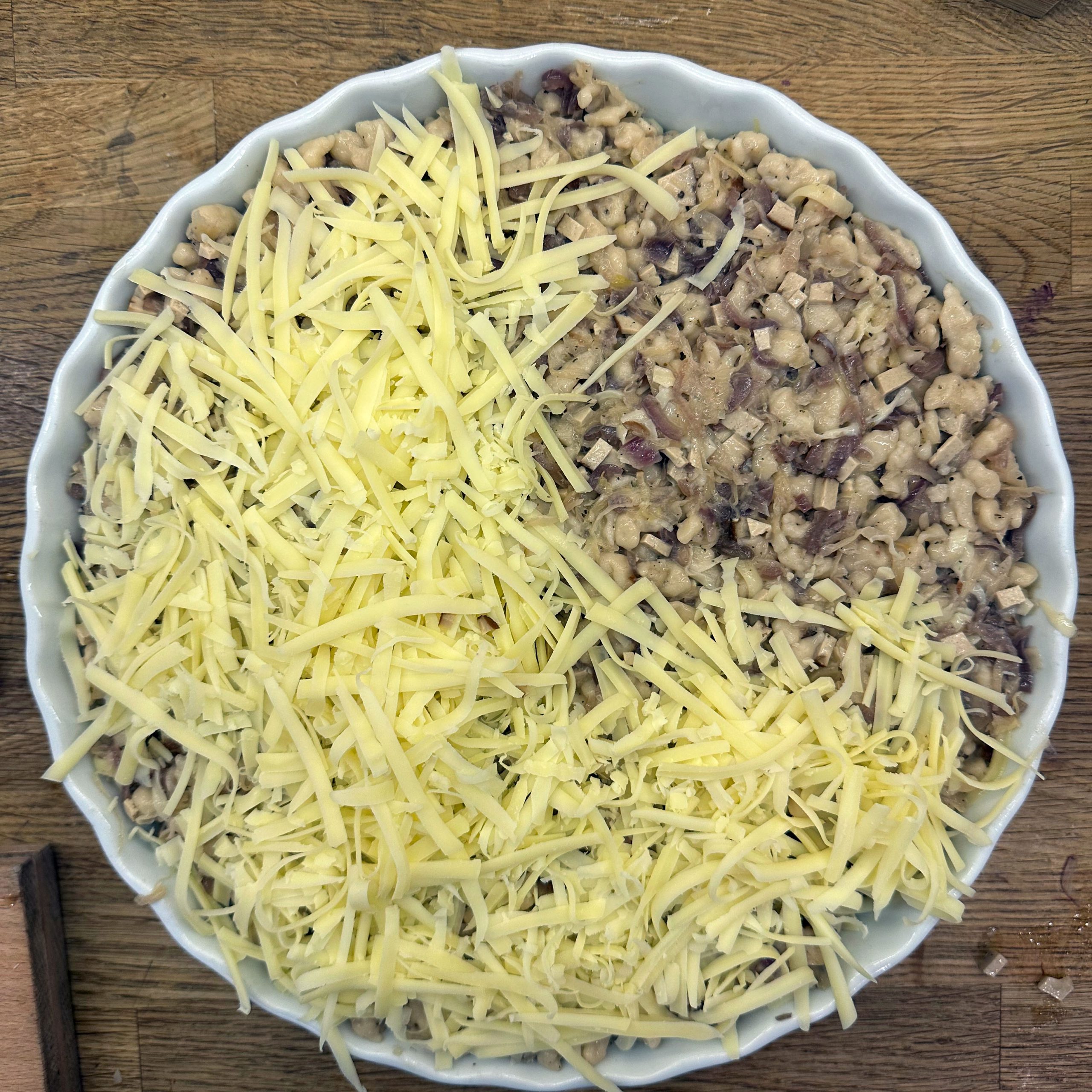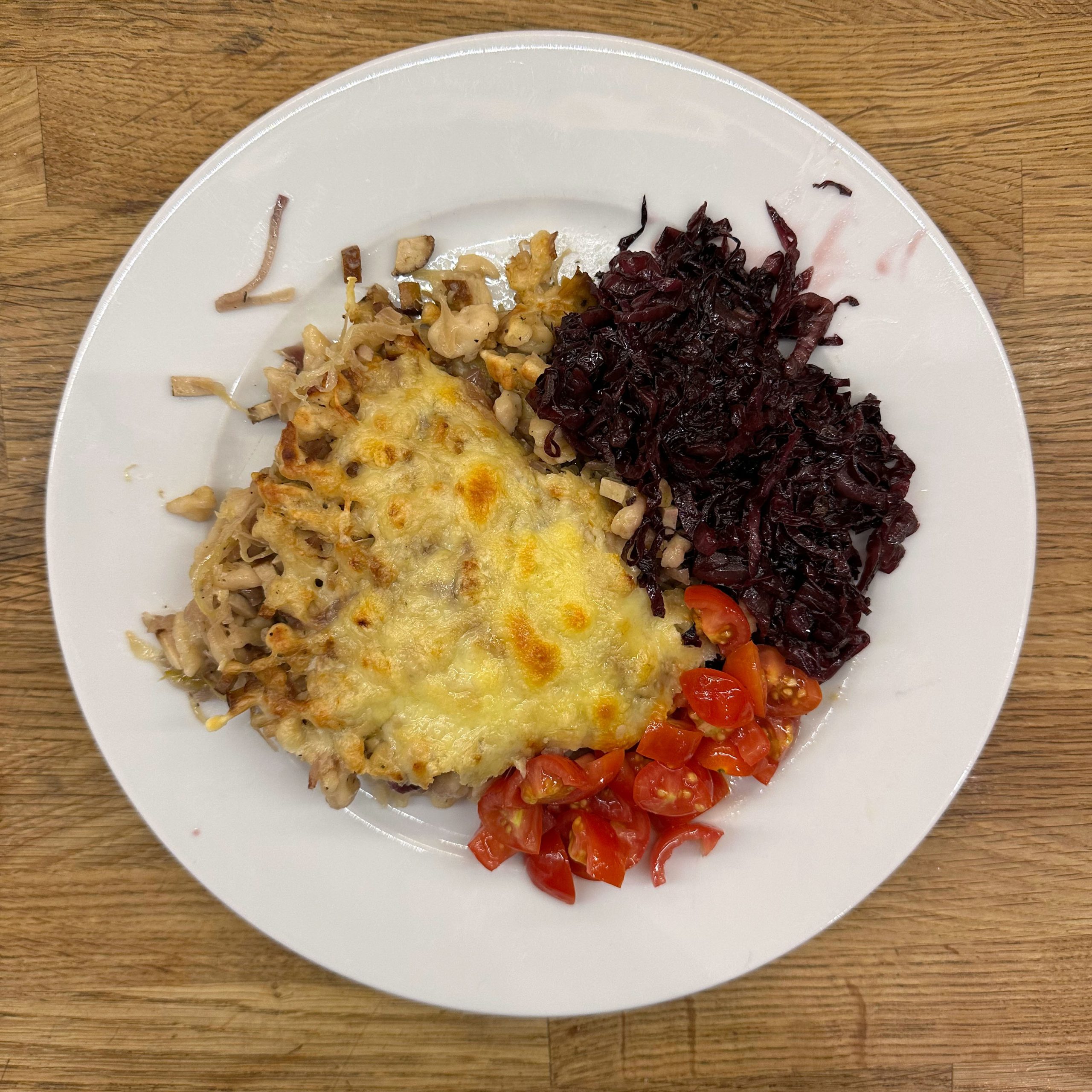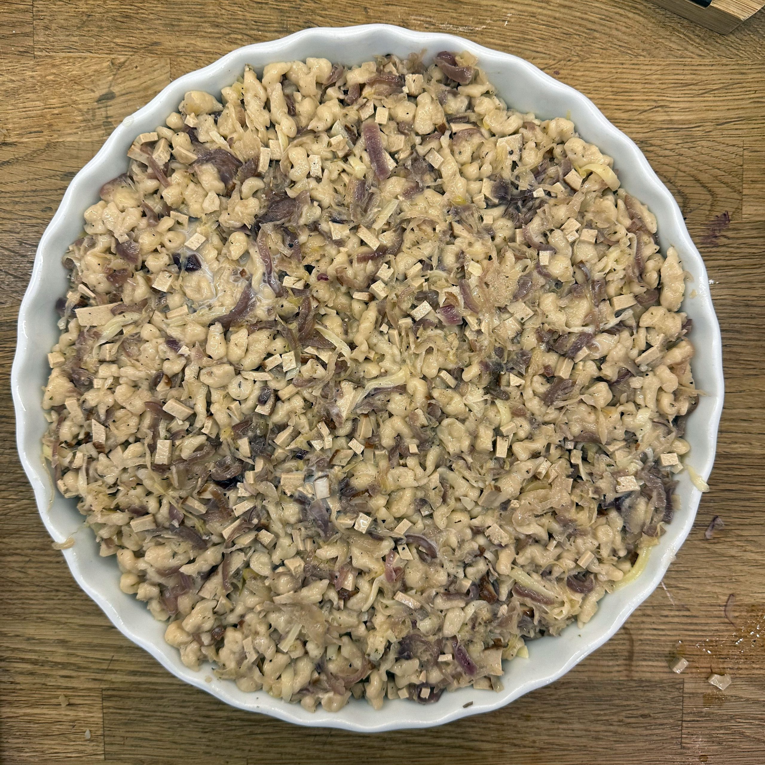Für den Spätzleteig 200g Dinkelmehl, 200g Weizenmehl, 4 Eier und etwa 100ml Wasser gut verrühren, bis der Teig Blasen schlägt. Den Teig durch ein Spätzlesieb in kochendes Salzwasser schaben, 4 Minuten ziehen lassen und abschütten. 5-6 rote Zwiebeln schälen, in Streifen schneiden und in einer Pfanne bei geringer Hitze etwa 50 Minuten braun backen, am Ende 2 TL getrockneten Thymian und Salz unterrühren. Die Spätzle in einem Topf mit den Röstzwiebeln, 1 Glas Sauerkraut (ca. 300g), 80g geriebenem Bergkäse und 200ml Hafersahne verrühren, in eine Tarteform geben und mit 200g geriebenem Bergkäse bestreuen. Im vorgeheizten Ofen bei 200°C 20 Minuten backen und am Ende 4 Minuten grillen, bis die Oberfläche goldbraun ist. Für den Radicchio-Salat 1 Radicchio-Kopf in Streifen schneiden und in einer Pfanne mit Olivenöl scharf anbraten, bis er gebräunt ist, dann mit 3 EL Balsamico-Essig, 2 EL Ahornsirup, Sojasoße, Salz und Pfeffer marinieren. Einen Tomatensalat aus 100g Kirschtomaten zubereiten. Tomaten kleinschneiden und mit 3 EL Olivenöl, 1 EL Balsamico-Essig und Salz marinieren. Die überbackenen Sauerkrautspätzle mit dem gebratenen Radicchio-Salat und dem Kirschtomatensalat servieren.