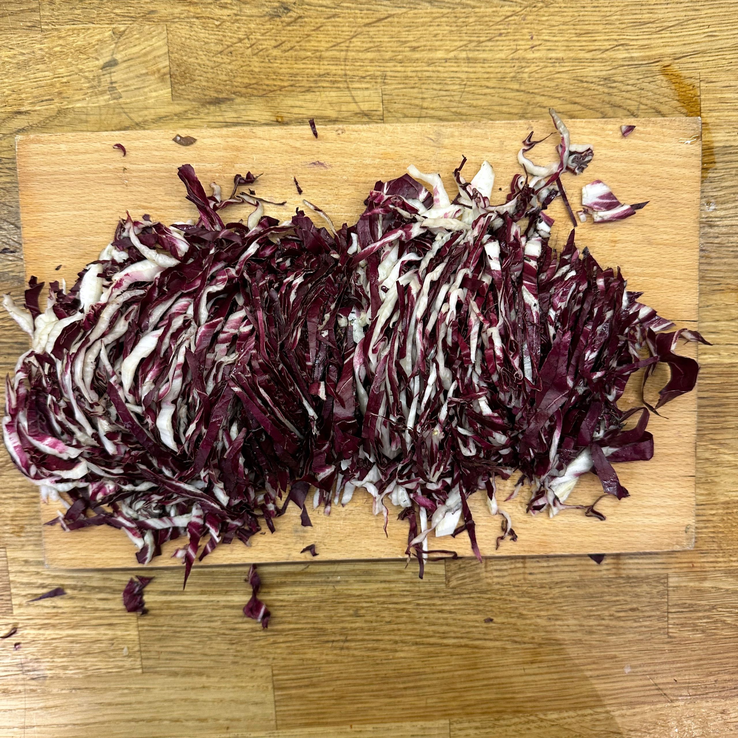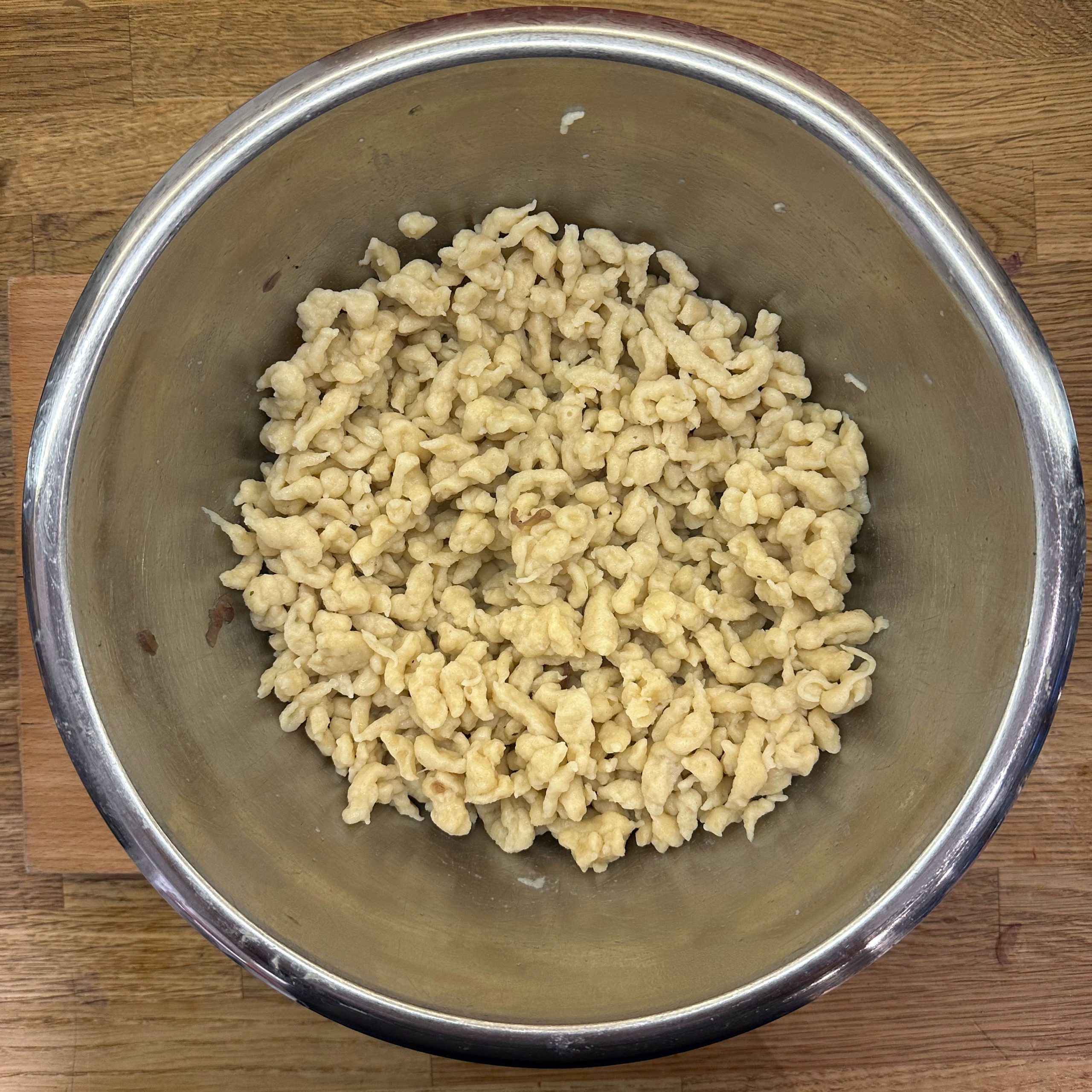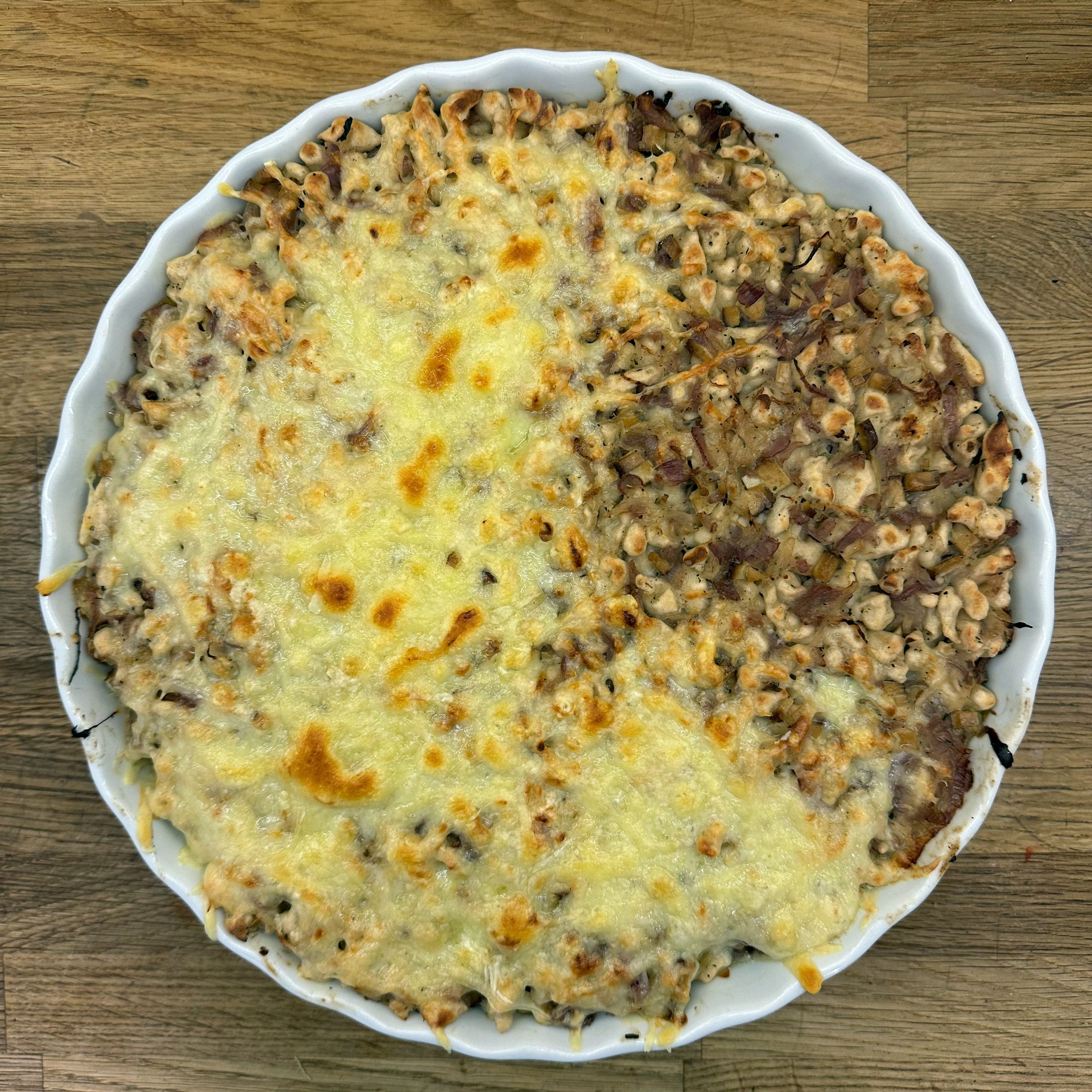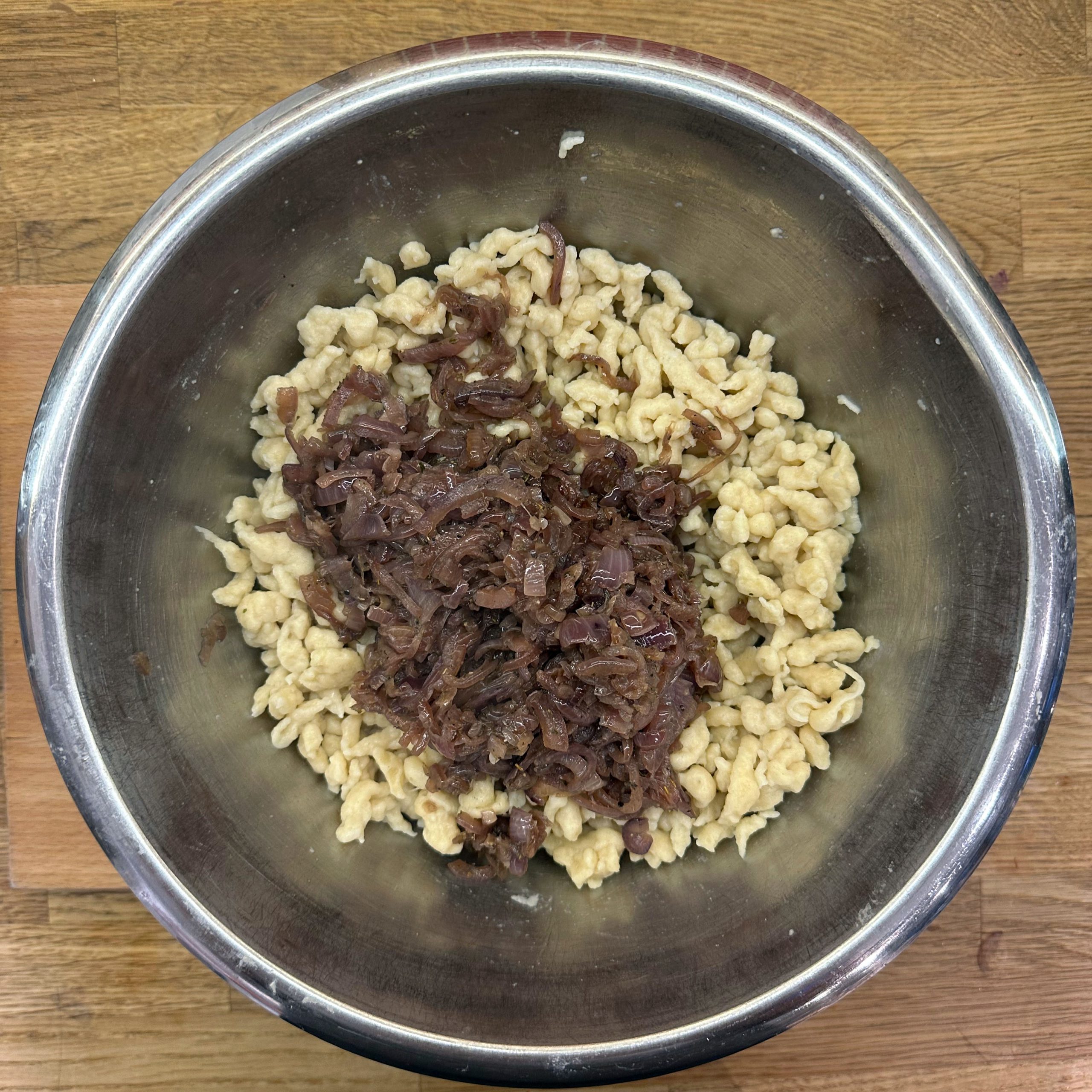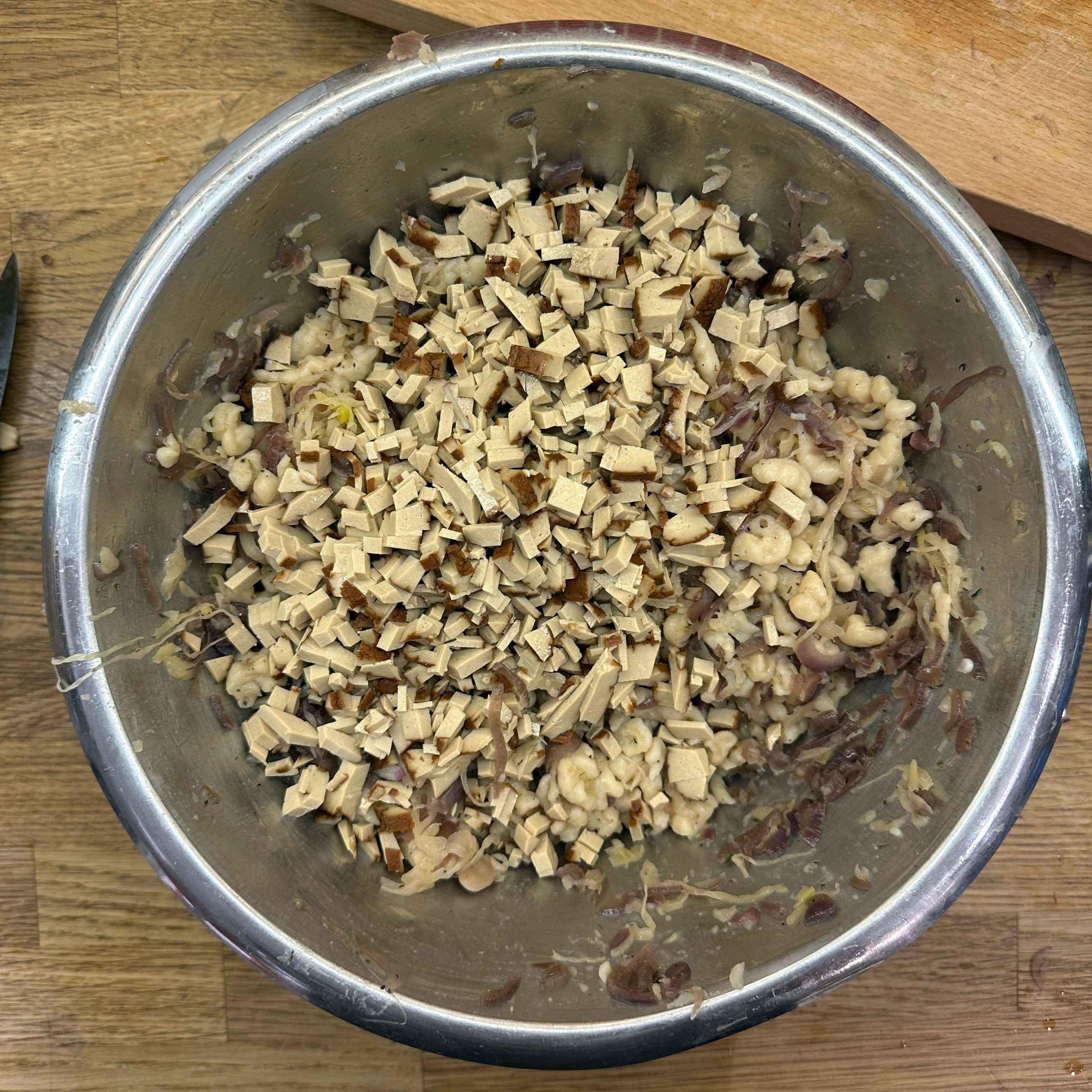 Für den Spätzleteig 200g Dinkelmehl, 200g Weizenmehl, 4 Eier und etwa 100ml Wasser gut verrühren, bis der Teig Blasen schlägt. Den Teig durch ein Spätzlesieb in kochendes Salzwasser schaben, 4 Minuten ziehen lassen und abschütten. 5-6 rote Zwiebeln schälen, in Streifen schneiden und in einer Pfanne bei geringer Hitze etwa 50 Minuten braun backen, am Ende 2 TL getrockneten Thymian und Salz unterrühren. Die Spätzle in einem Topf mit den Röstzwiebeln, 1 Glas Sauerkraut (ca. 300g), 80g geriebenem Bergkäse und 200ml Hafersahne verrühren, in eine Tarteform geben und mit 200g geriebenem Bergkäse bestreuen. Im vorgeheizten Ofen bei 200°C 20 Minuten backen und am Ende 4 Minuten grillen, bis die Oberfläche goldbraun ist. Für den Radicchio-Salat 1 Radicchio-Kopf in Streifen schneiden und in einer Pfanne mit Olivenöl scharf anbraten, bis er gebräunt ist, dann mit 3 EL Balsamico-Essig, 2 EL Ahornsirup, Sojasoße, Salz und Pfeffer marinieren. Einen Tomatensalat aus 100g Kirschtomaten zubereiten. Tomaten kleinschneiden und mit 3 EL Olivenöl, 1 EL Balsamico-Essig und Salz marinieren. Die überbackenen Sauerkrautspätzle mit dem gebratenen Radicchio-Salat und dem Kirschtomatensalat servieren.