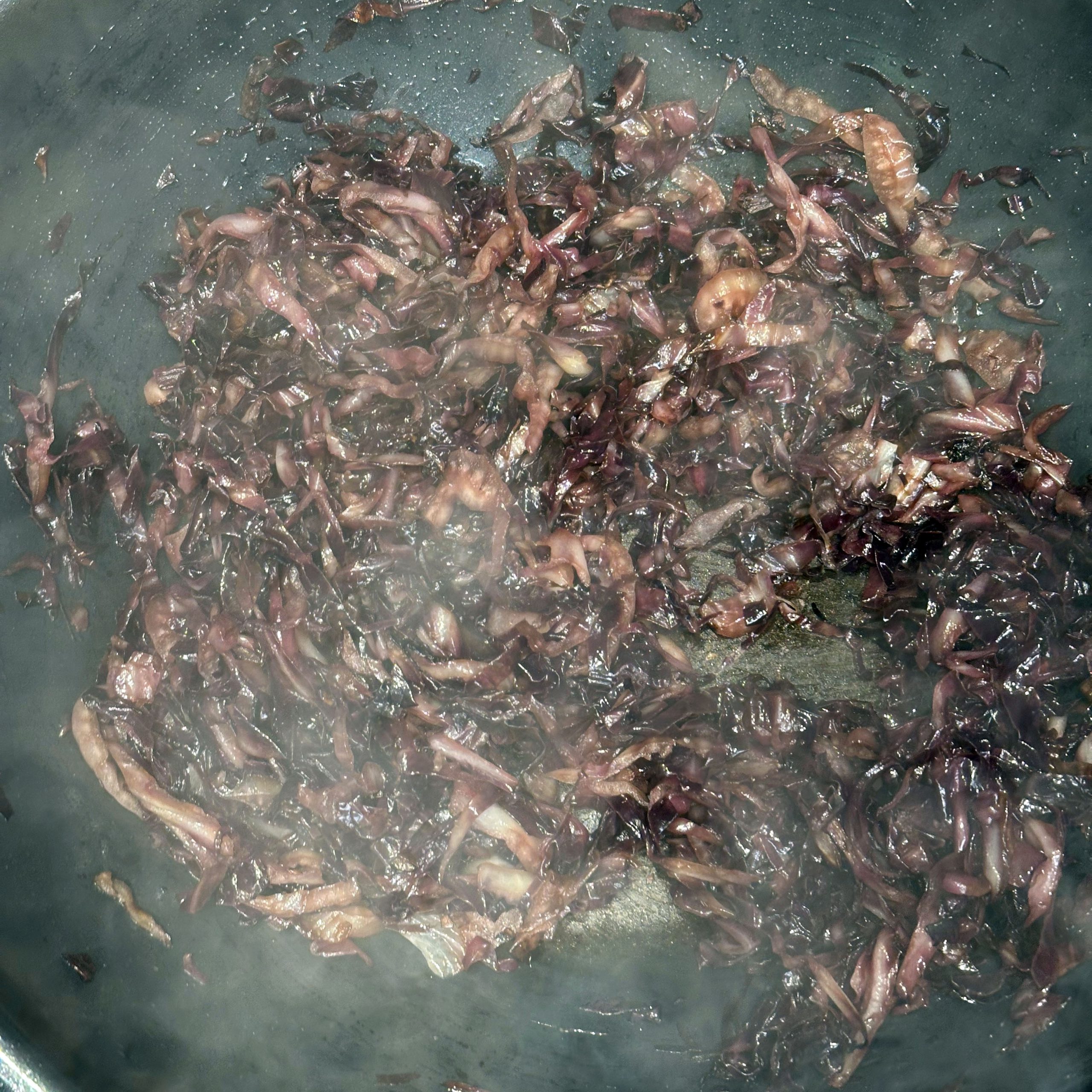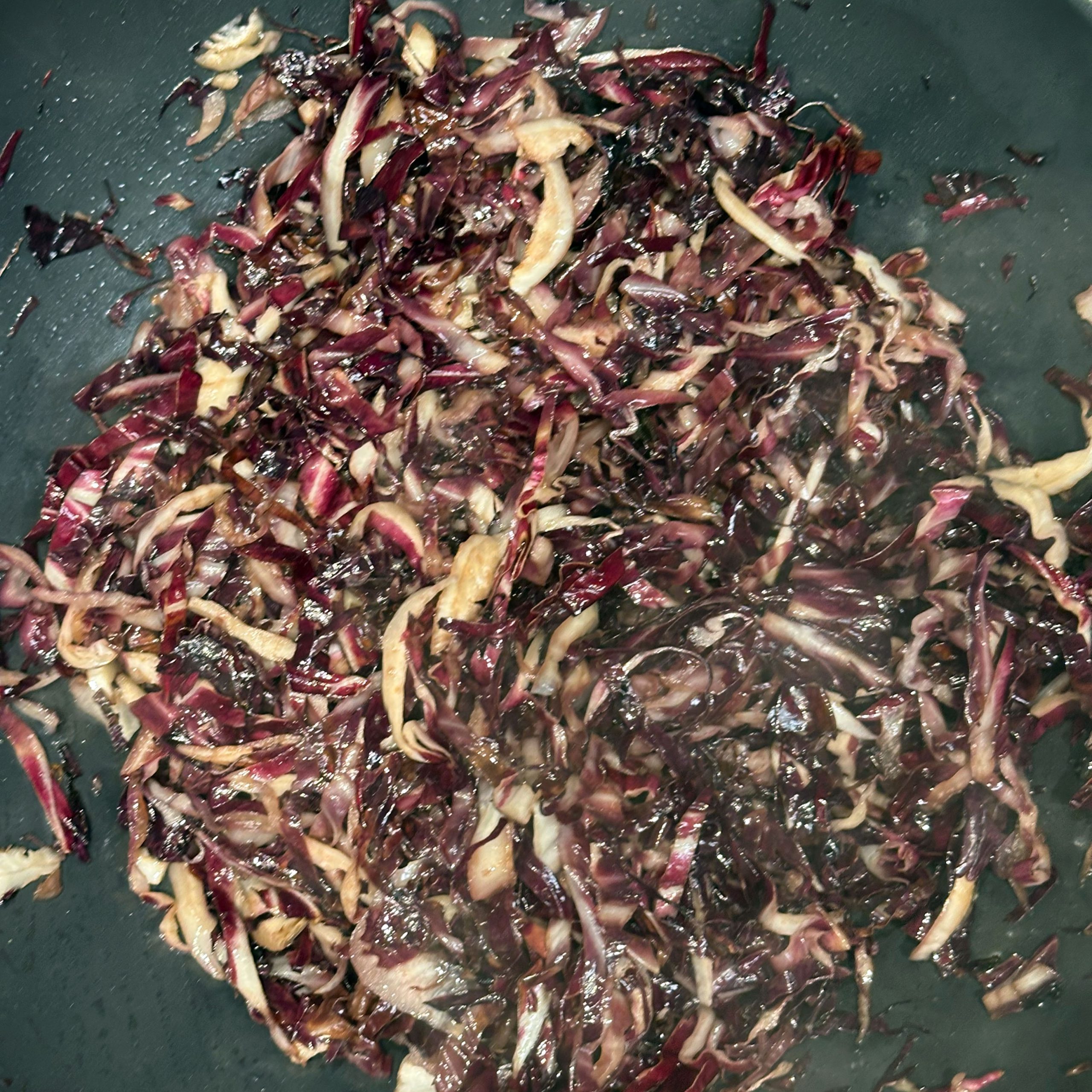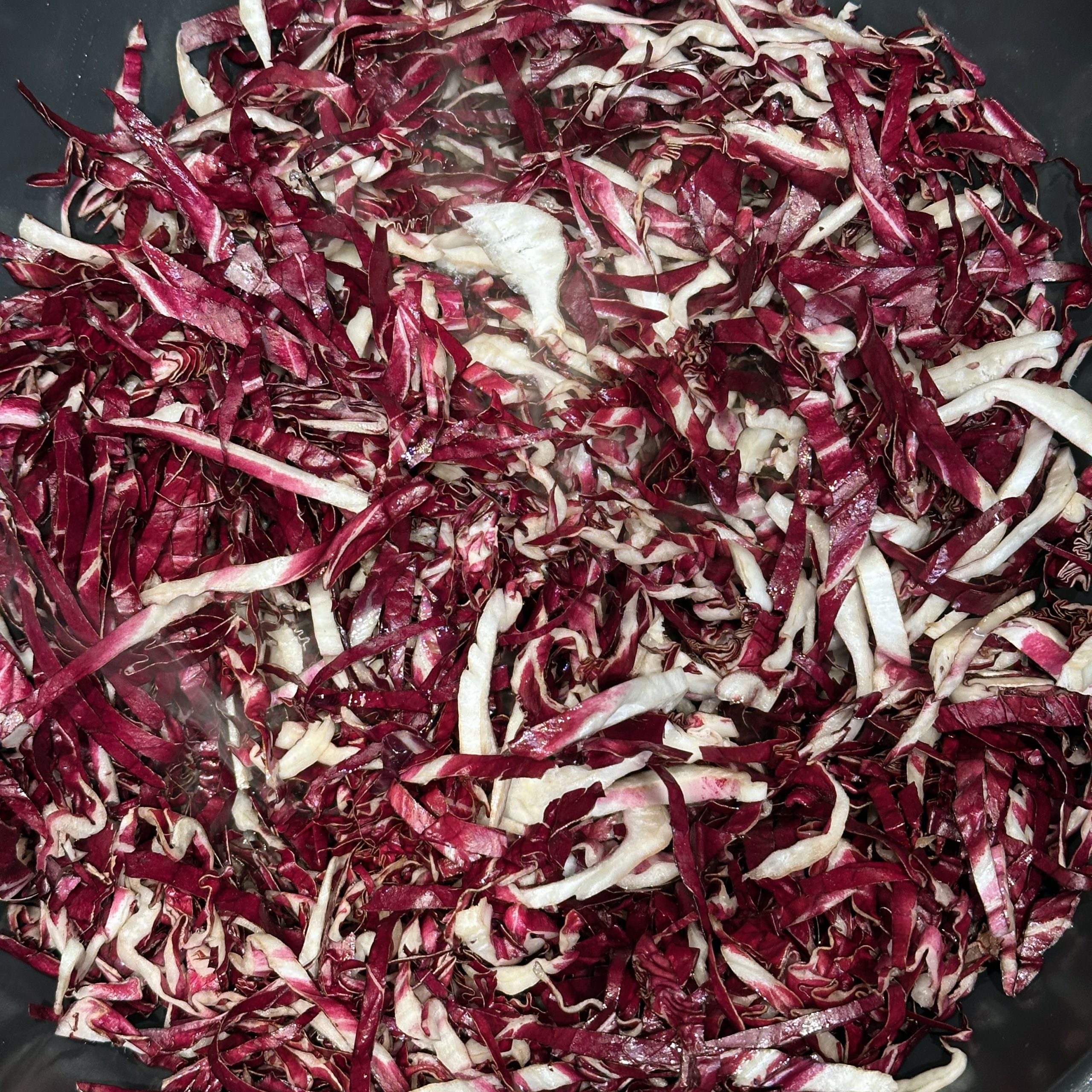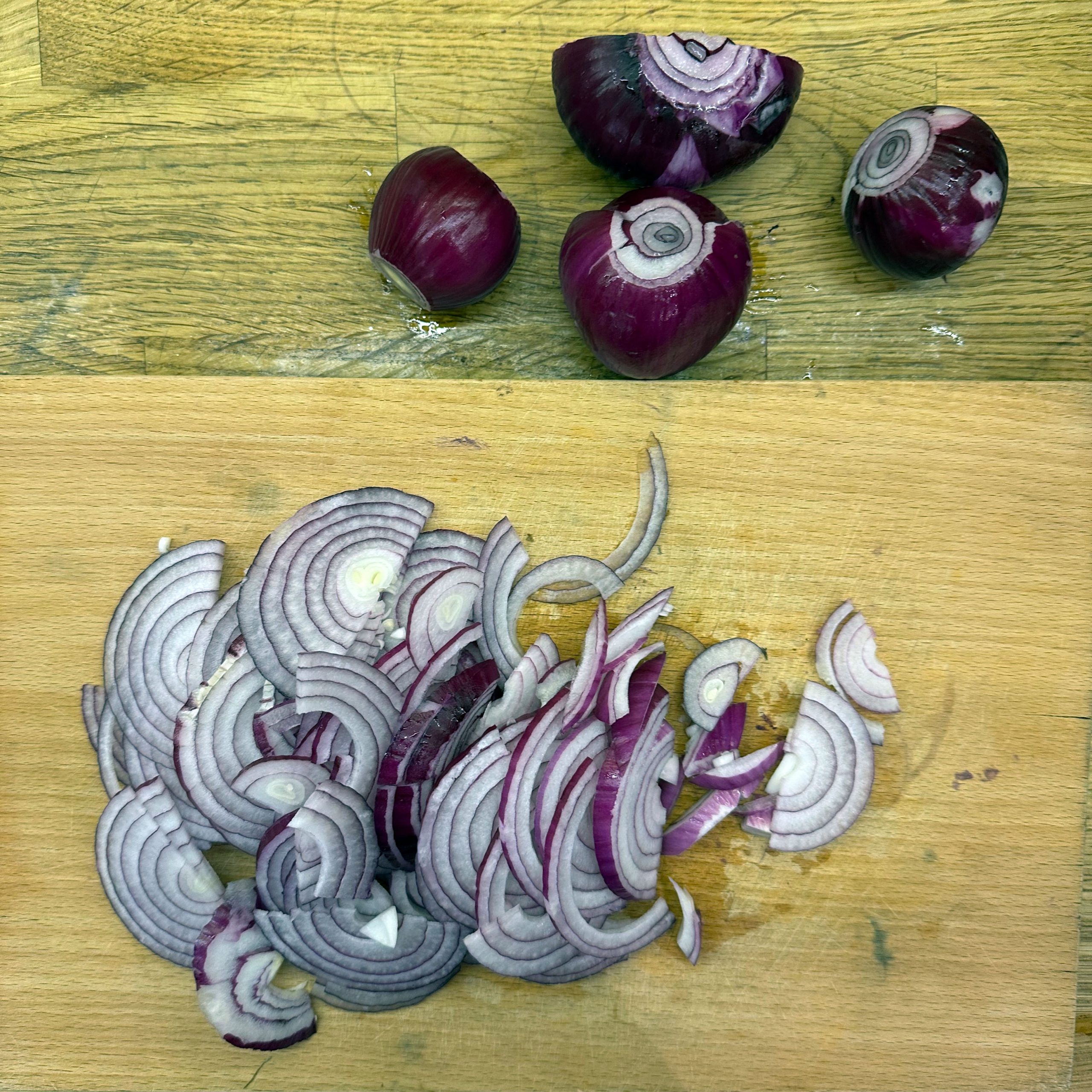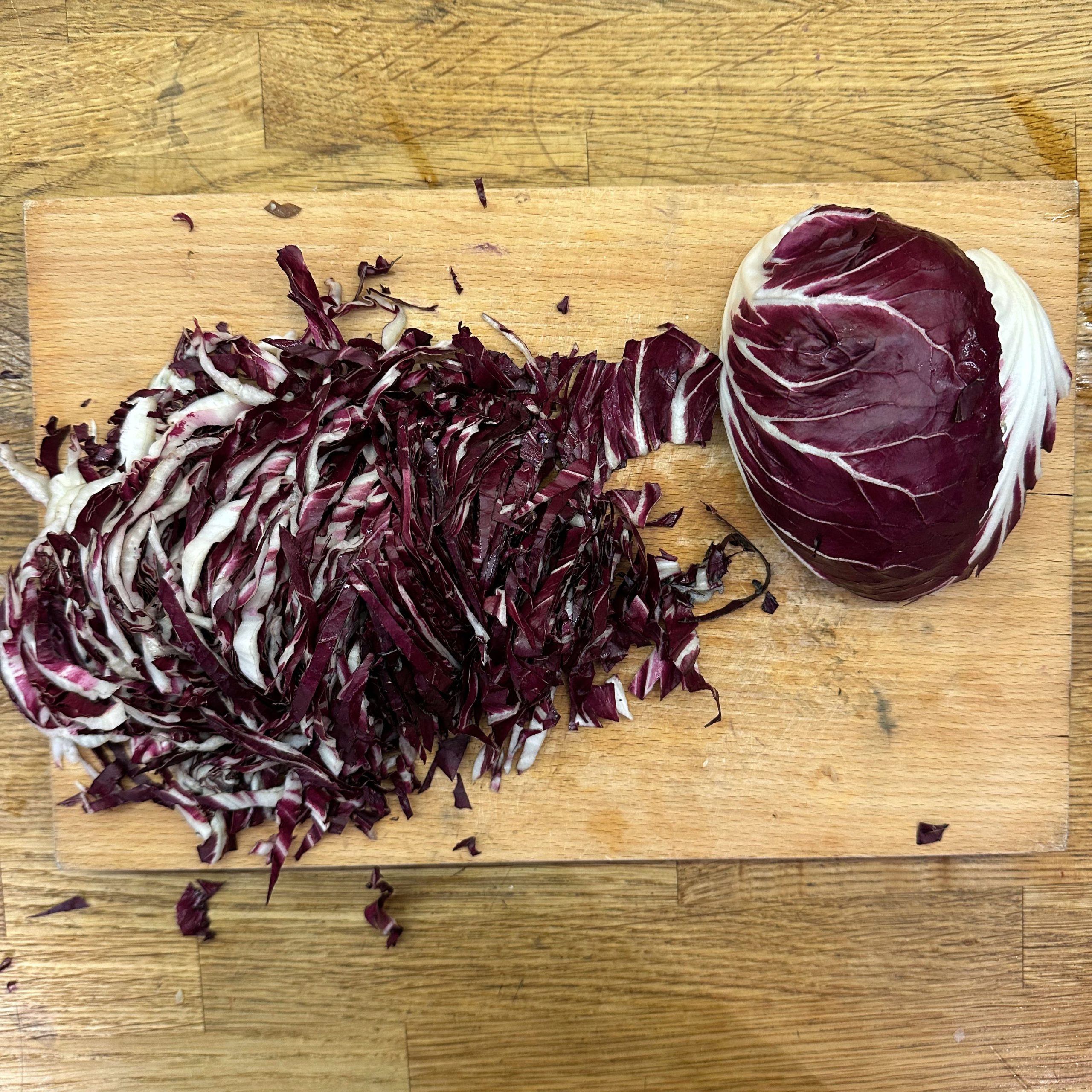 Für den Spätzleteig 200g Dinkelmehl, 200g Weizenmehl, 4 Eier und etwa 100ml Wasser gut verrühren, bis der Teig Blasen schlägt. Den Teig durch ein Spätzlesieb in kochendes Salzwasser schaben, 4 Minuten ziehen lassen und abschütten. 5-6 rote Zwiebeln schälen, in Streifen schneiden und in einer Pfanne bei geringer Hitze etwa 50 Minuten braun backen, am Ende 2 TL getrockneten Thymian und Salz unterrühren. Die Spätzle in einem Topf mit den Röstzwiebeln, 1 Glas Sauerkraut (ca. 300g), 80g geriebenem Bergkäse und 200ml Hafersahne verrühren, in eine Tarteform geben und mit 200g geriebenem Bergkäse bestreuen. Im vorgeheizten Ofen bei 200°C 20 Minuten backen und am Ende 4 Minuten grillen, bis die Oberfläche goldbraun ist. Für den Radicchio-Salat 1 Radicchio-Kopf in Streifen schneiden und in einer Pfanne mit Olivenöl scharf anbraten, bis er gebräunt ist, dann mit 3 EL Balsamico-Essig, 2 EL Ahornsirup, Sojasoße, Salz und Pfeffer marinieren. Einen Tomatensalat aus 100g Kirschtomaten zubereiten. Tomaten kleinschneiden und mit 3 EL Olivenöl, 1 EL Balsamico-Essig und Salz marinieren. Die überbackenen Sauerkrautspätzle mit dem gebratenen Radicchio-Salat und dem Kirschtomatensalat servieren.