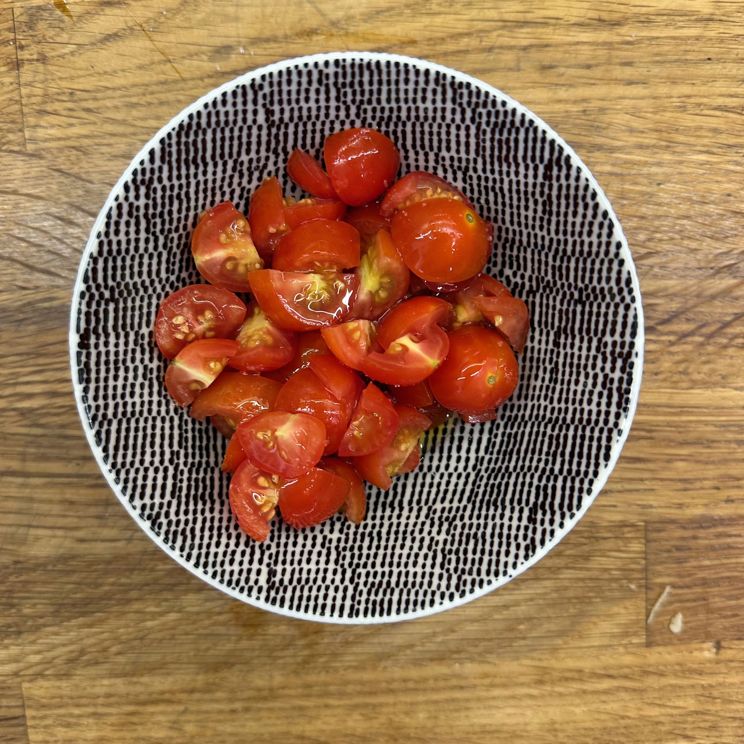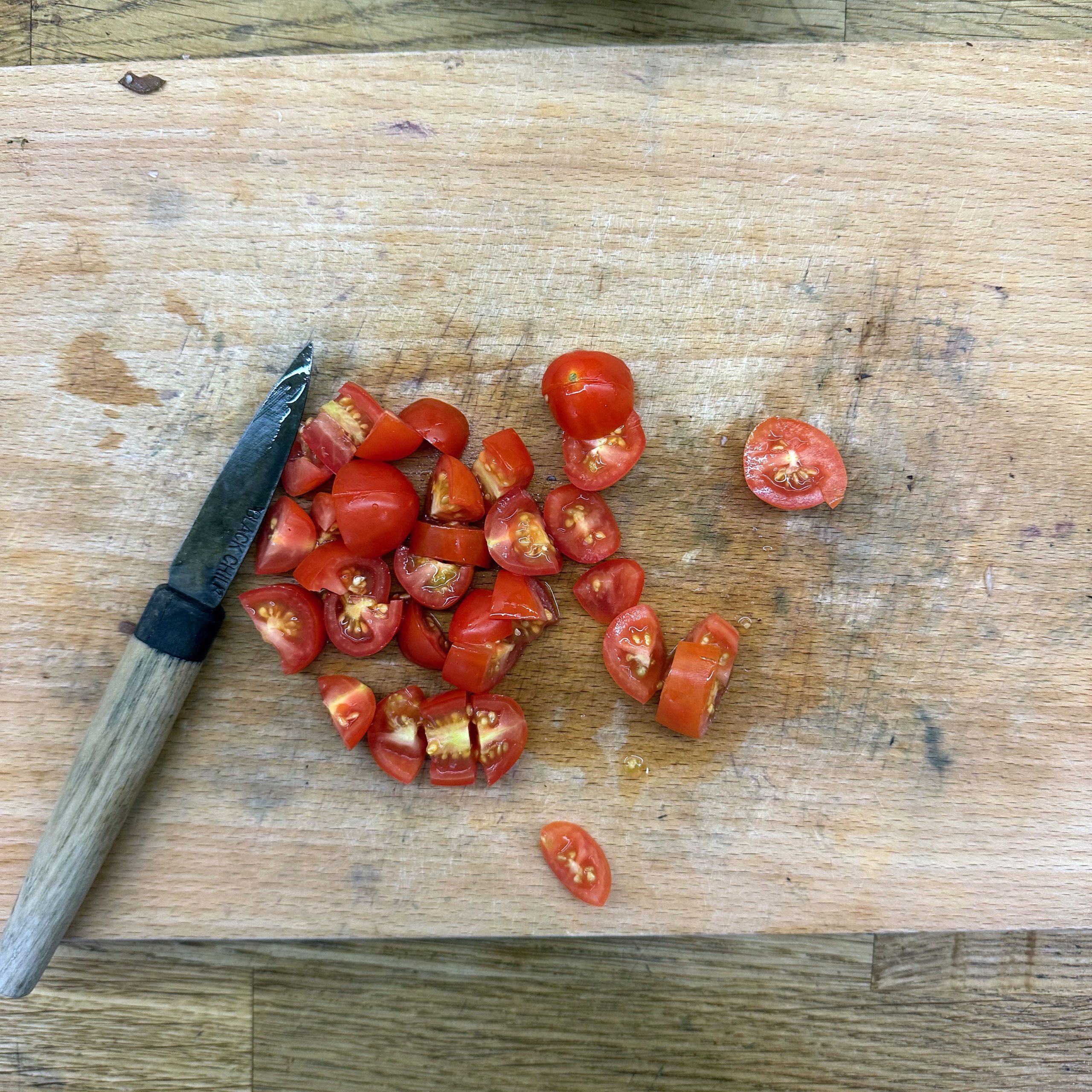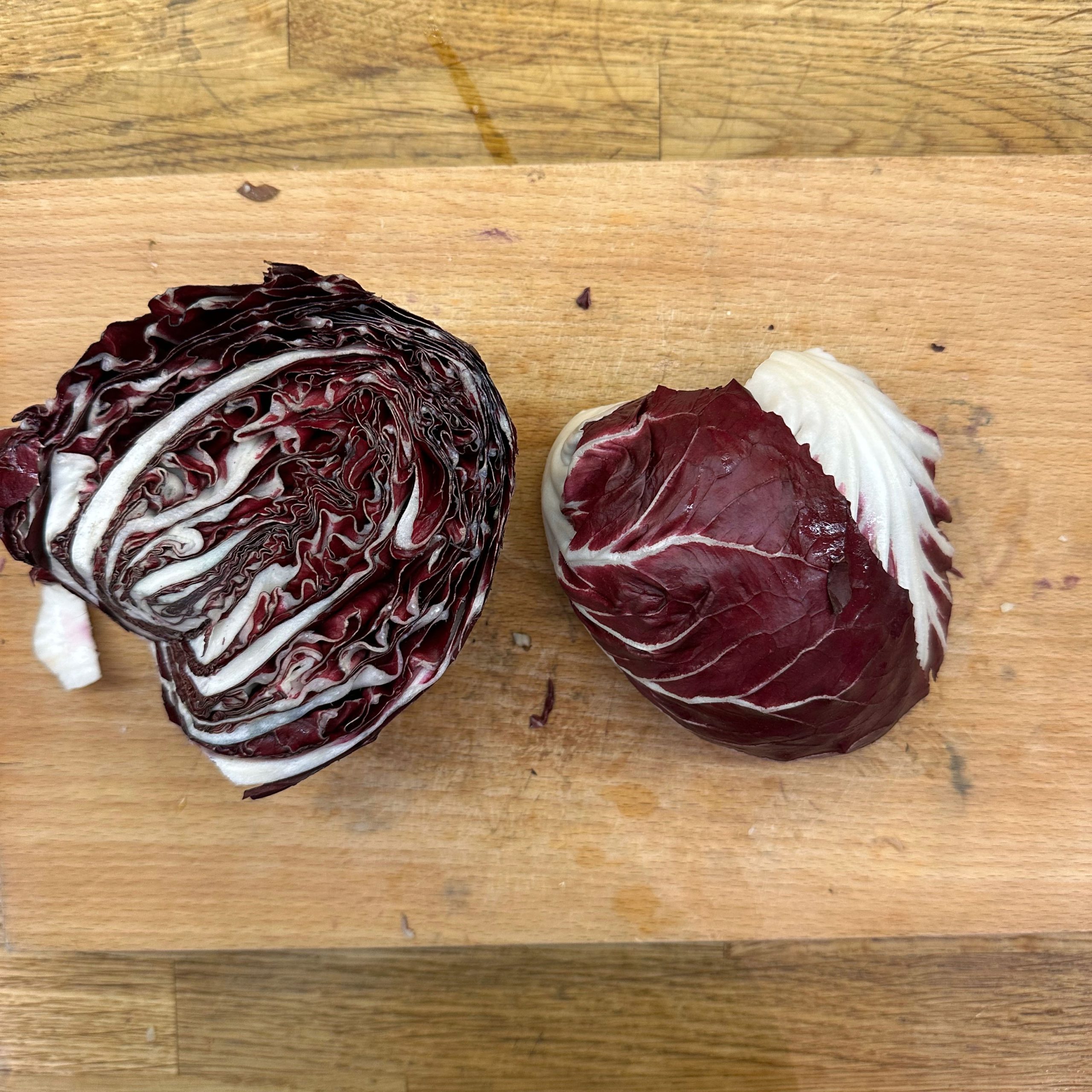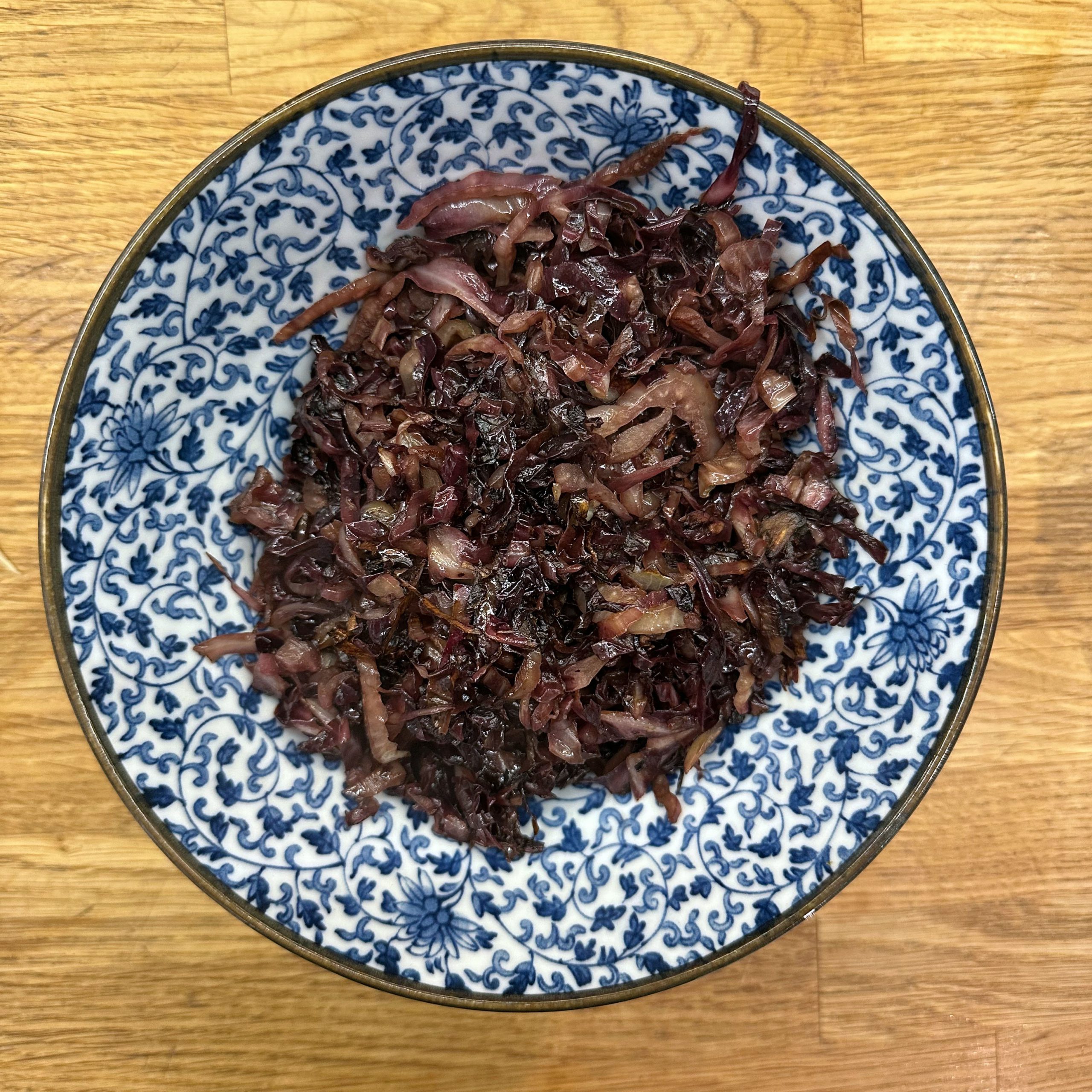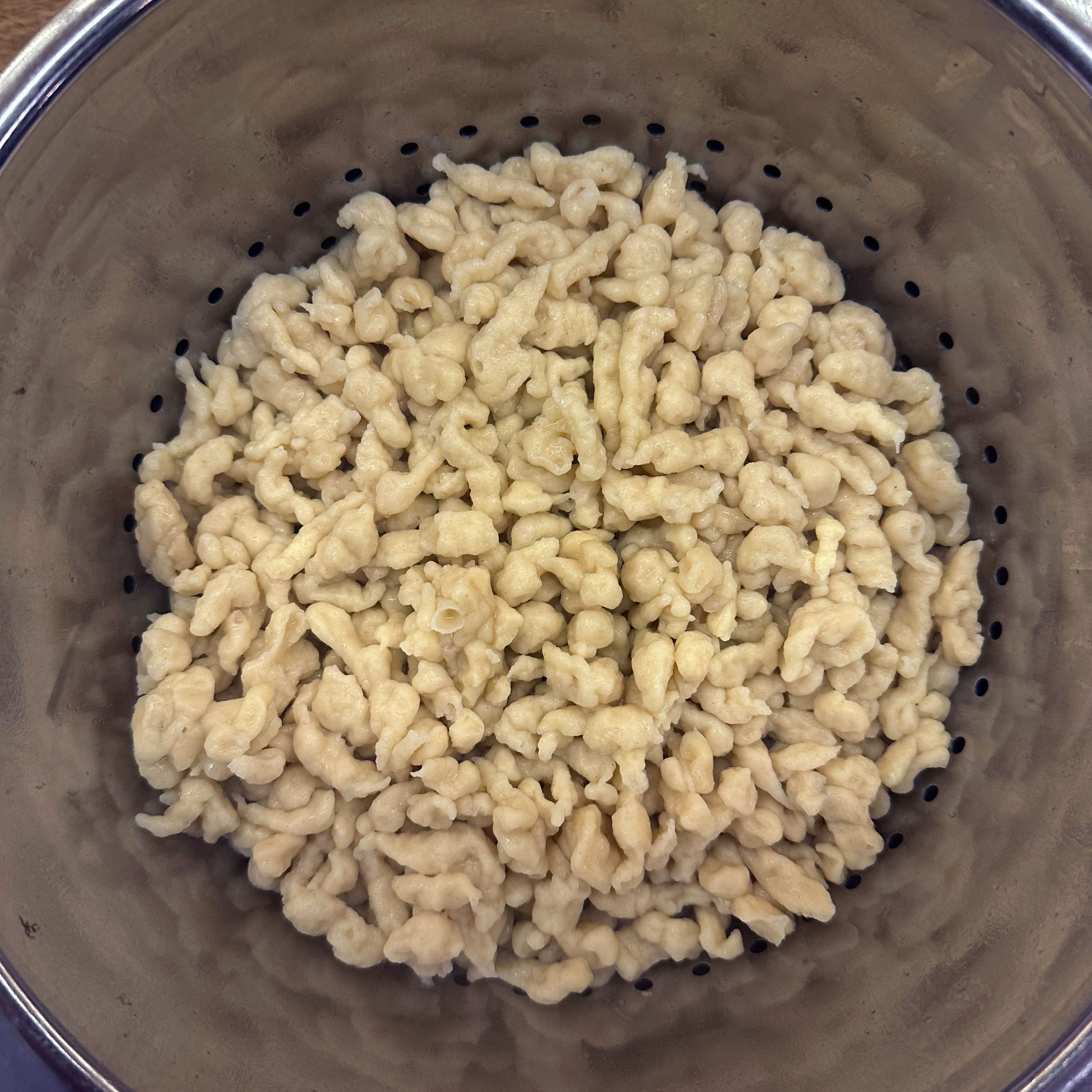 Für den Spätzleteig 200g Dinkelmehl, 200g Weizenmehl, 4 Eier und etwa 100ml Wasser gut verrühren, bis der Teig Blasen schlägt. Den Teig durch ein Spätzlesieb in kochendes Salzwasser schaben, 4 Minuten ziehen lassen und abschütten. 5-6 rote Zwiebeln schälen, in Streifen schneiden und in einer Pfanne bei geringer Hitze etwa 50 Minuten braun backen, am Ende 2 TL getrockneten Thymian und Salz unterrühren. Die Spätzle in einem Topf mit den Röstzwiebeln, 1 Glas Sauerkraut (ca. 300g), 80g geriebenem Bergkäse und 200ml Hafersahne verrühren, in eine Tarteform geben und mit 200g geriebenem Bergkäse bestreuen. Im vorgeheizten Ofen bei 200°C 20 Minuten backen und am Ende 4 Minuten grillen, bis die Oberfläche goldbraun ist. Für den Radicchio-Salat 1 Radicchio-Kopf in Streifen schneiden und in einer Pfanne mit Olivenöl scharf anbraten, bis er gebräunt ist, dann mit 3 EL Balsamico-Essig, 2 EL Ahornsirup, Sojasoße, Salz und Pfeffer marinieren. Einen Tomatensalat aus 100g Kirschtomaten zubereiten. Tomaten kleinschneiden und mit 3 EL Olivenöl, 1 EL Balsamico-Essig und Salz marinieren. Die überbackenen Sauerkrautspätzle mit dem gebratenen Radicchio-Salat und dem Kirschtomatensalat servieren.