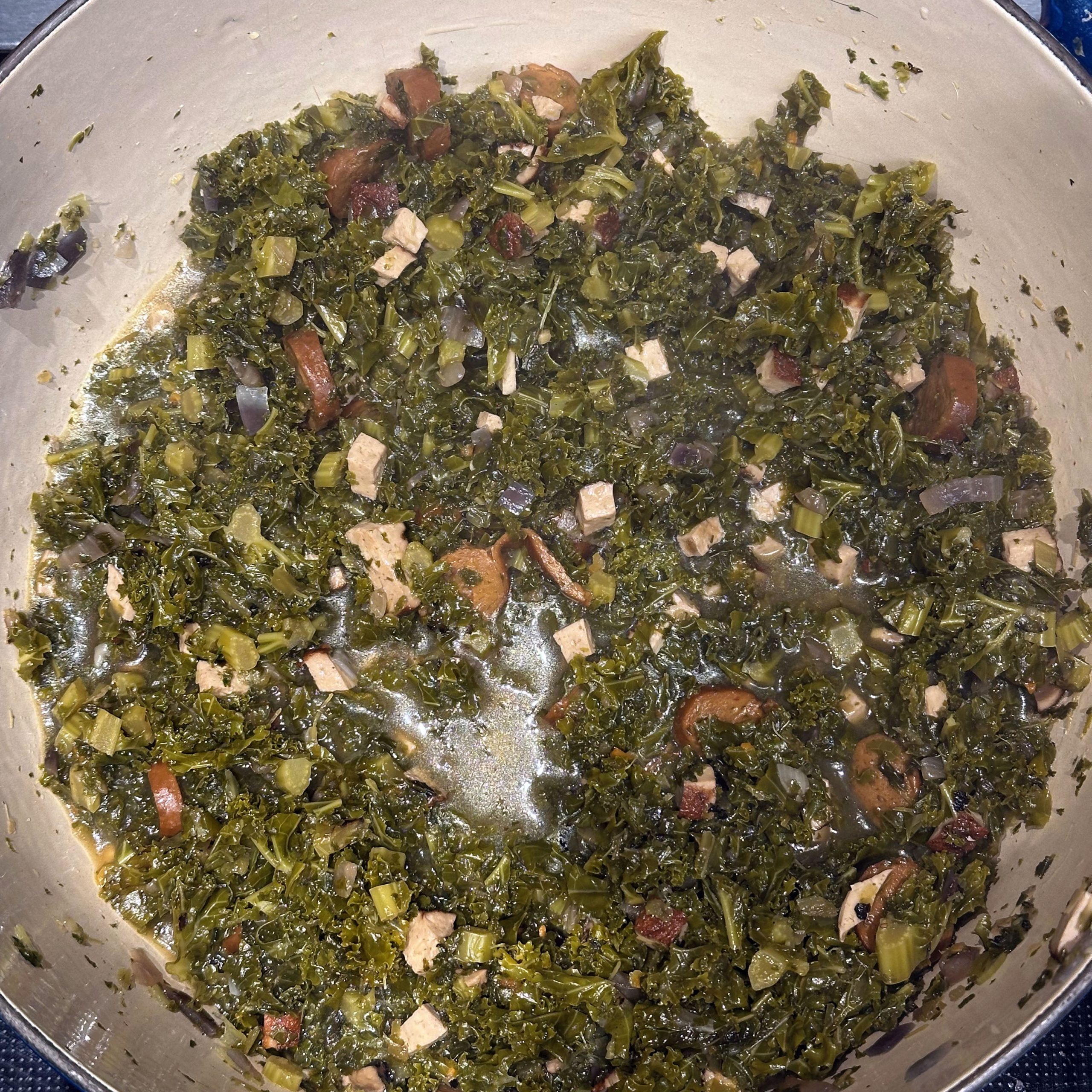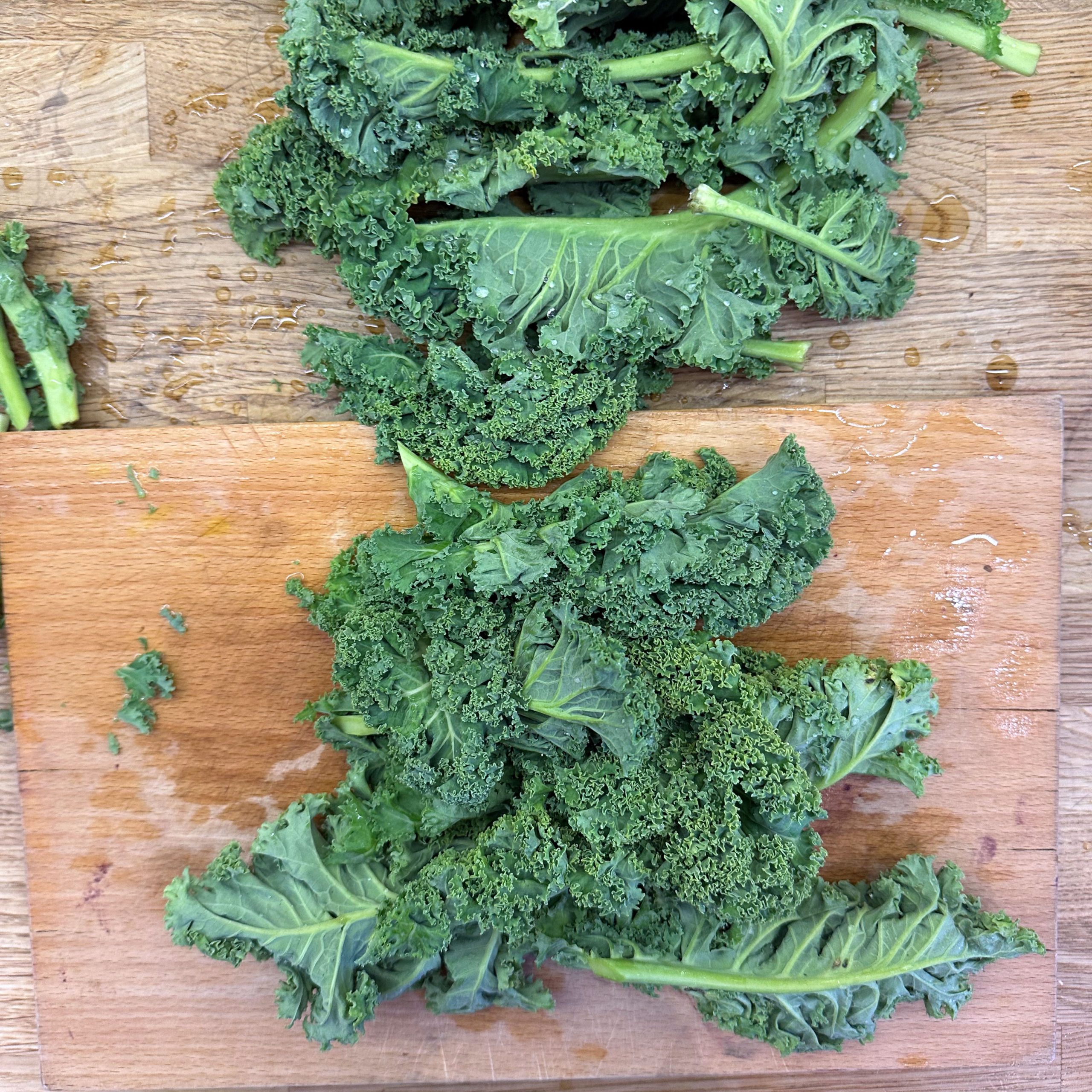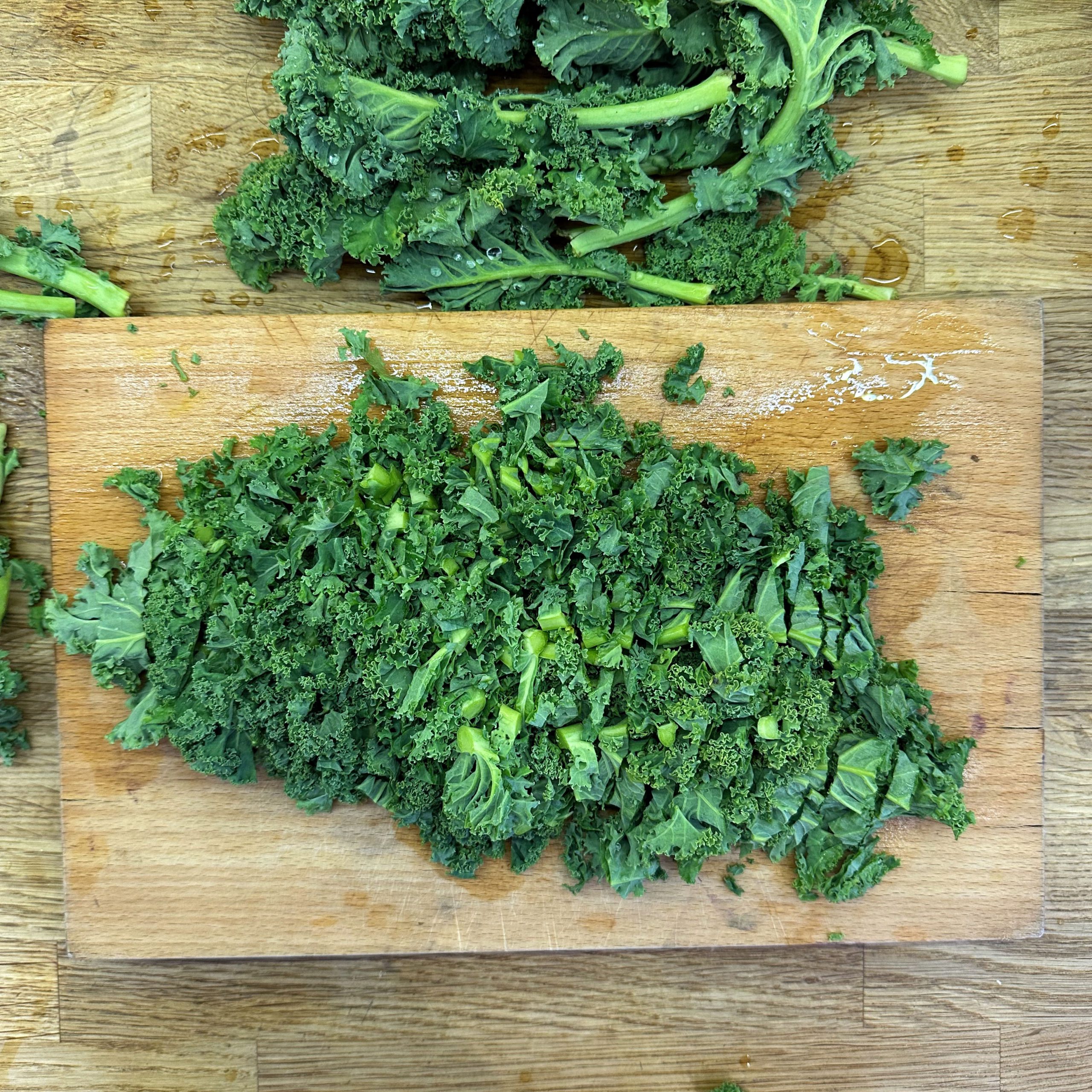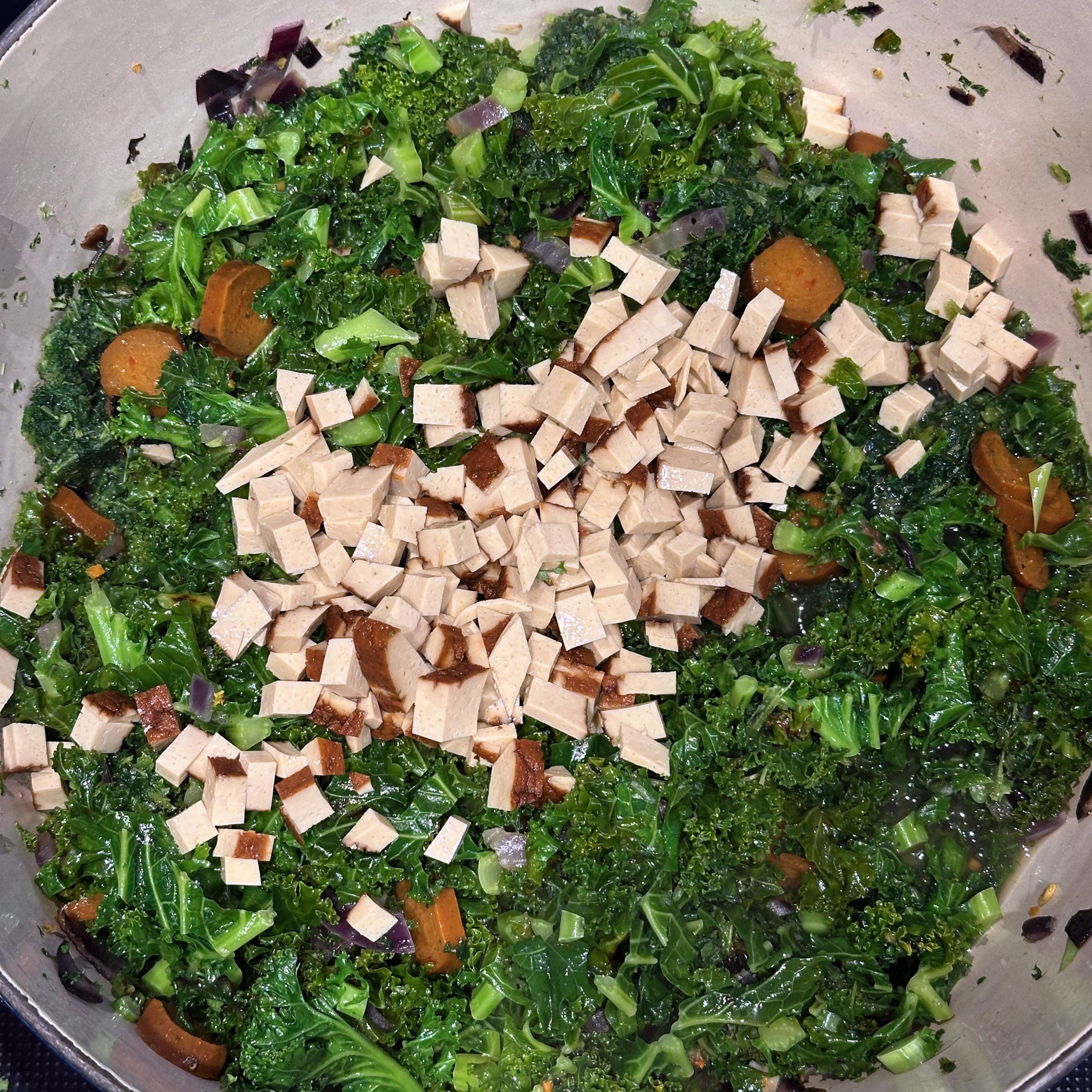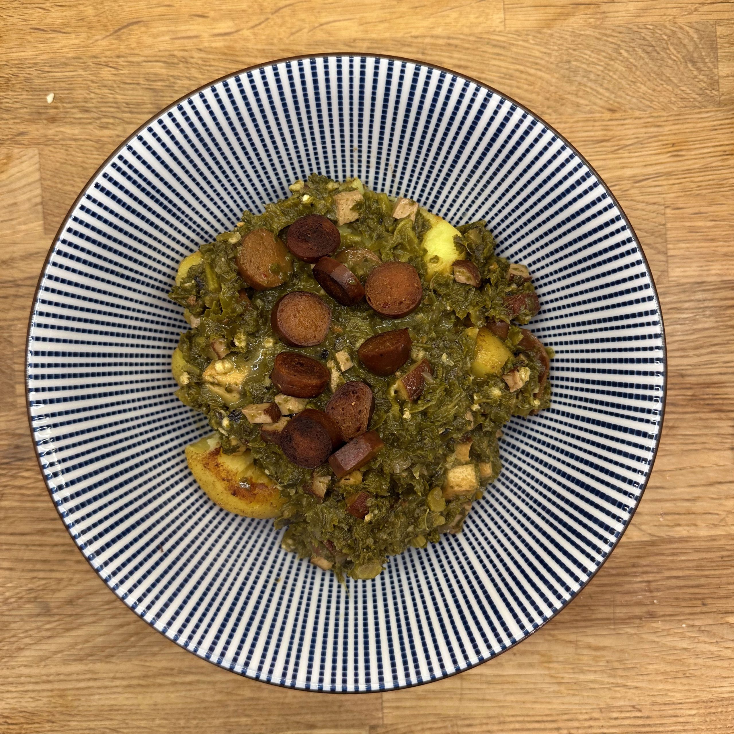 800 g frischen Grünkohl waschen, vom festen Strunk befreien und klein schneiden, 400 g TK-Grünkohl bereitstellen und 1 Zwiebel fein würfeln. Zwiebel in etwas Öl in einem großen Topf anbraten, Grünkohl zugeben, mit 600 ml Gemüsebrühe aufgießen und salzen, dann bei kleiner Flamme mit geschlossenem Deckel ca. 2h köcheln lassen. 250 g Räuchertofu würfeln und 4 vegane Würste in Scheiben schneiden, die Hälfte davon direkt in den Topf geben und mitköcheln lassen. 800 g kleine Kartoffeln mit Schale in Salzwasser 15–20 min kochen, abgießen, kurz ausdampfen lassen, schälen und im Wok in etwas Öl im Ganzen rundum braun braten. Restlichen Tofu und restliche Wurst in einer Pfanne mit etwas Öl knusprig anbraten, zusammen mit 50 g Haferflocken in den Topf geben und ca. 5 min weiterköcheln lassen. Mit 1 EL Senf, Salz und Pfeffer abschmecken. Grünkohleintopf mit den gebratenen Kartoffeln in Schalen servieren.