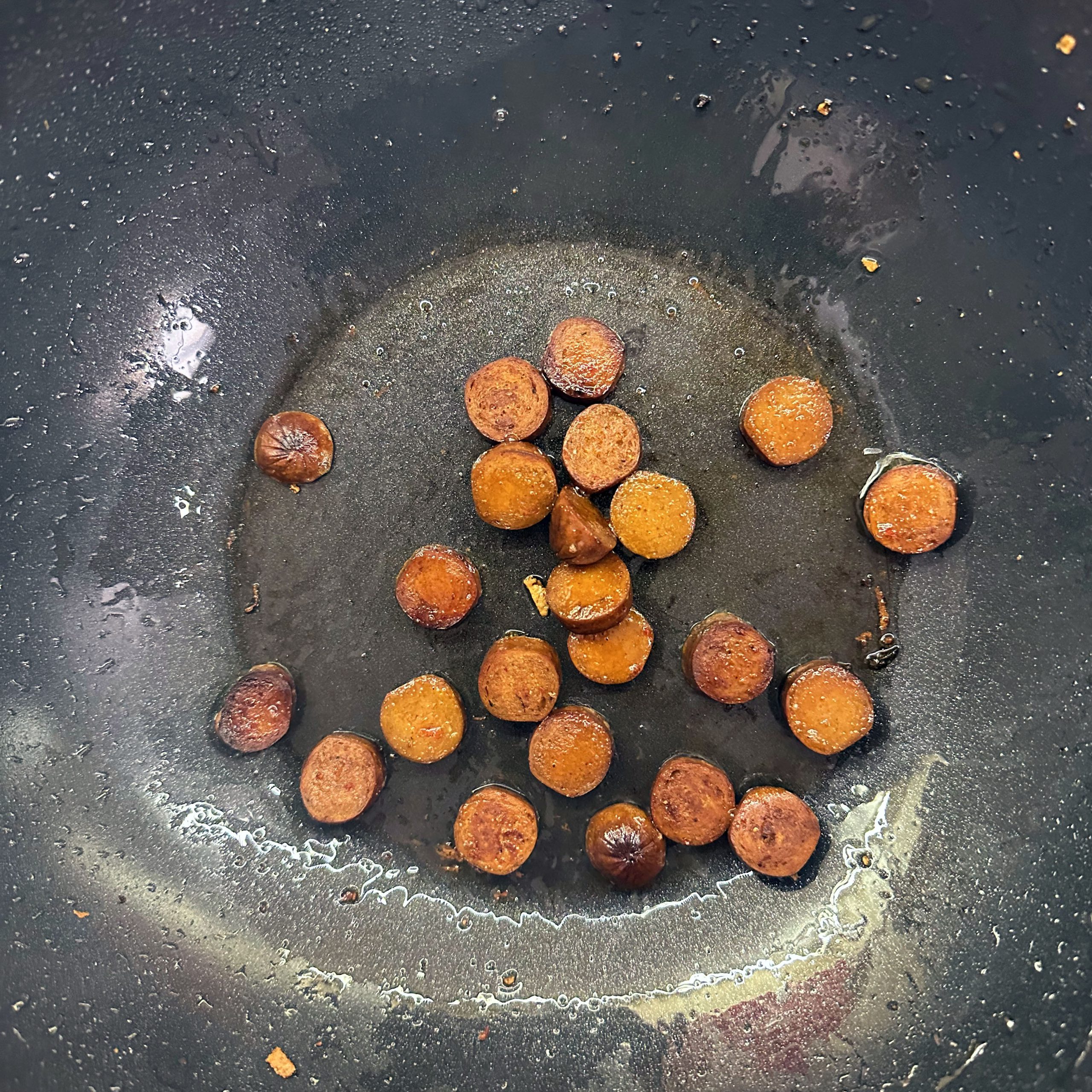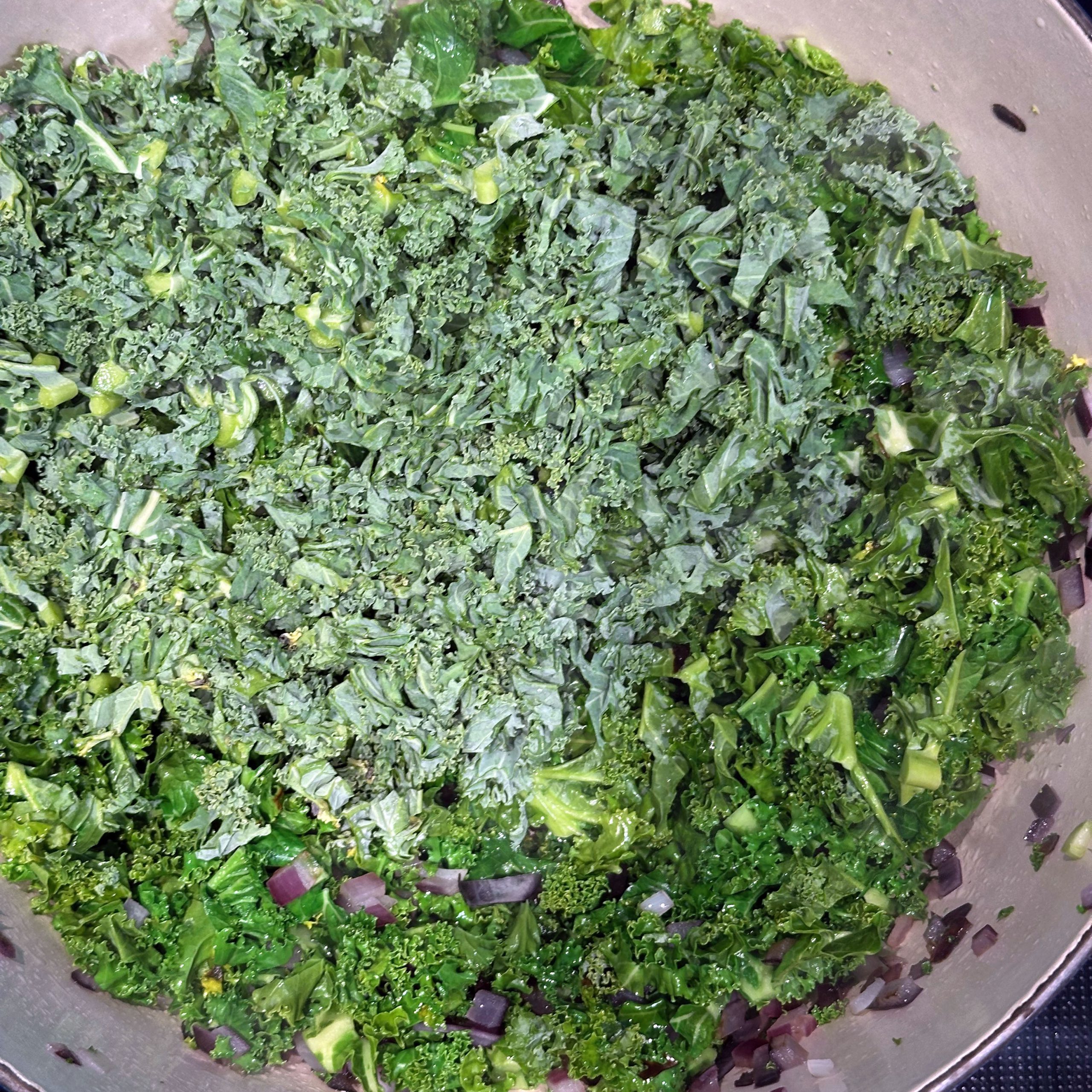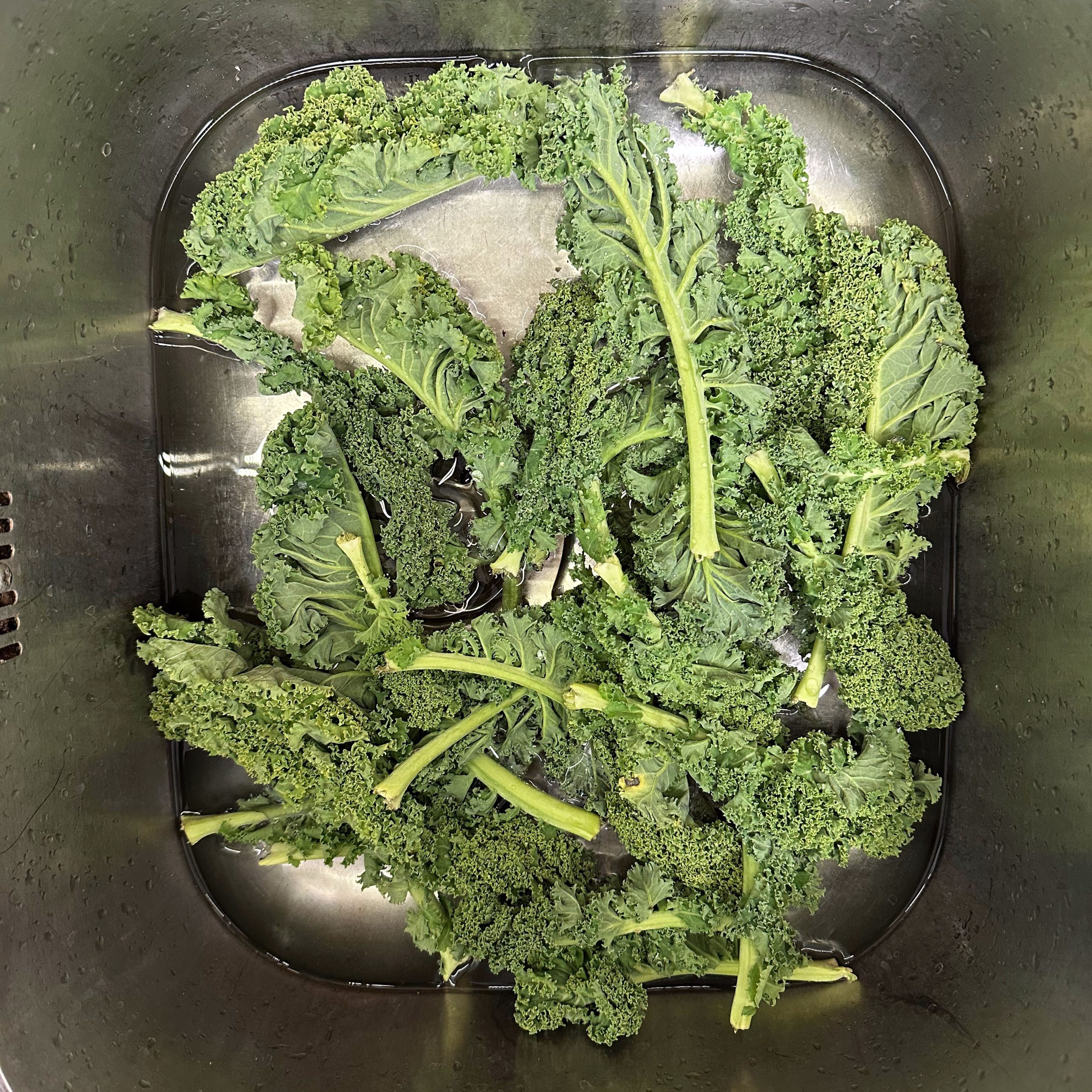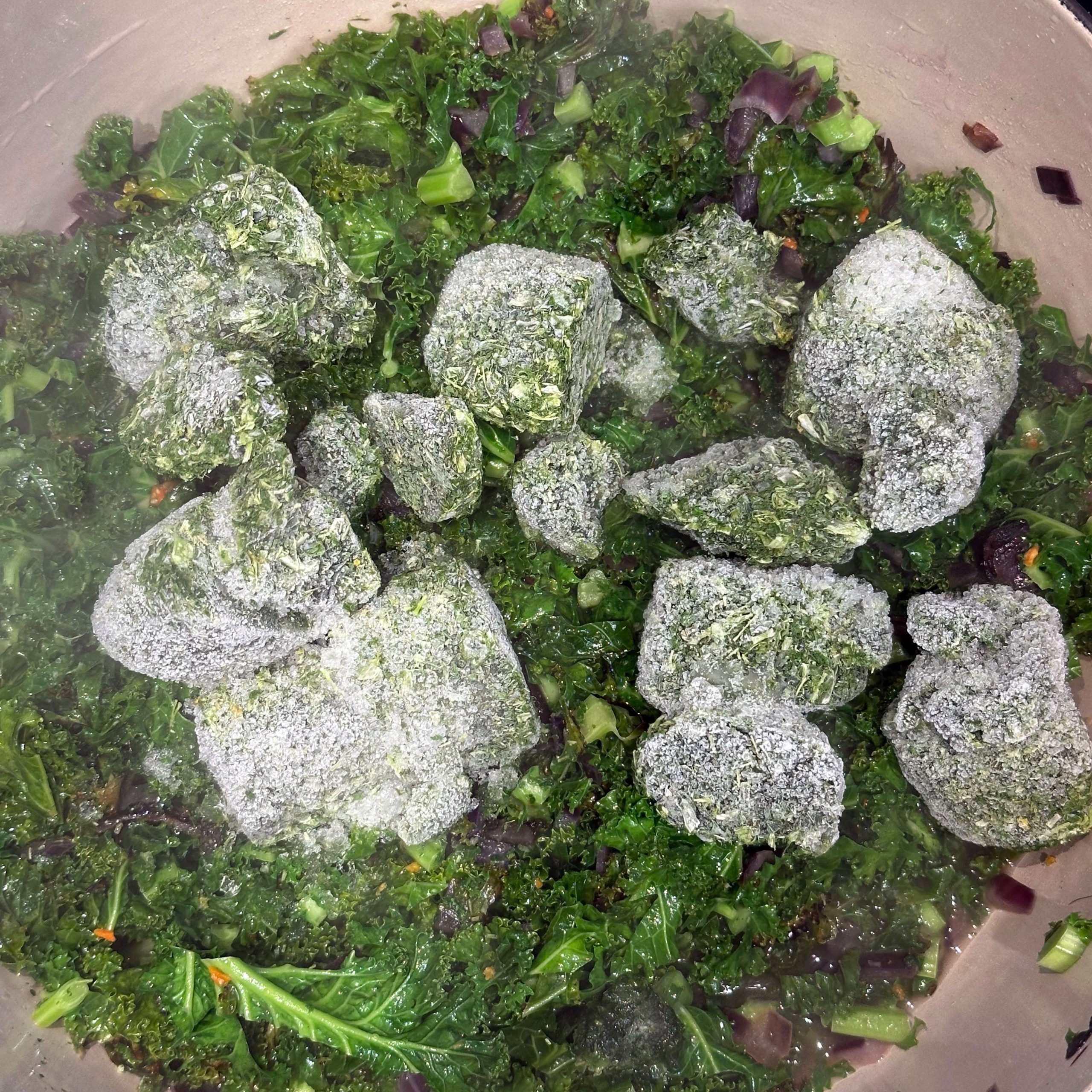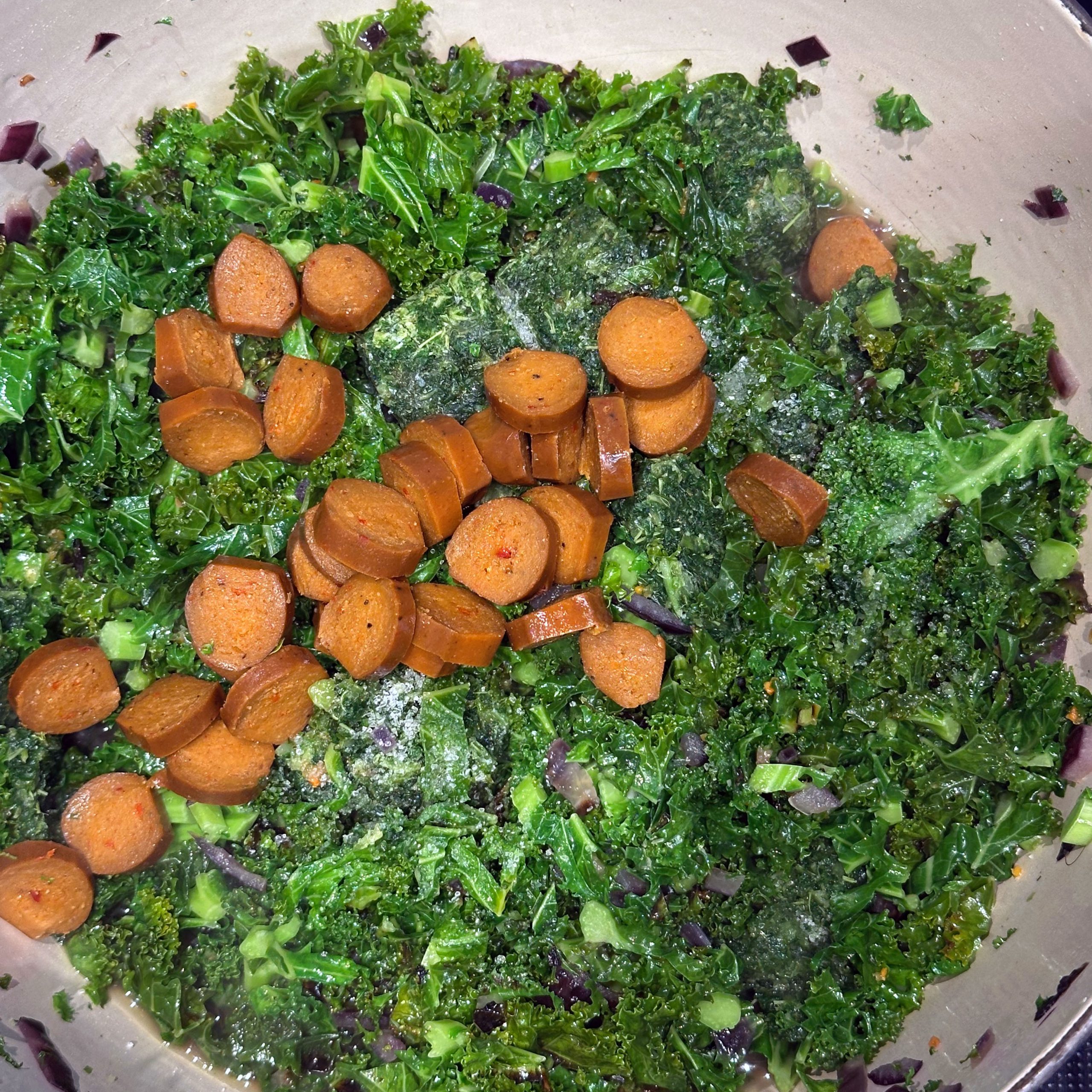 800 g frischen Grünkohl waschen, vom festen Strunk befreien und klein schneiden, 400 g TK-Grünkohl bereitstellen und 1 Zwiebel fein würfeln. Zwiebel in etwas Öl in einem großen Topf anbraten, Grünkohl zugeben, mit 600 ml Gemüsebrühe aufgießen und salzen, dann bei kleiner Flamme mit geschlossenem Deckel ca. 2h köcheln lassen. 250 g Räuchertofu würfeln und 4 vegane Würste in Scheiben schneiden, die Hälfte davon direkt in den Topf geben und mitköcheln lassen. 800 g kleine Kartoffeln mit Schale in Salzwasser 15–20 min kochen, abgießen, kurz ausdampfen lassen, schälen und im Wok in etwas Öl im Ganzen rundum braun braten. Restlichen Tofu und restliche Wurst in einer Pfanne mit etwas Öl knusprig anbraten, zusammen mit 50 g Haferflocken in den Topf geben und ca. 5 min weiterköcheln lassen. Mit 1 EL Senf, Salz und Pfeffer abschmecken. Grünkohleintopf mit den gebratenen Kartoffeln in Schalen servieren.