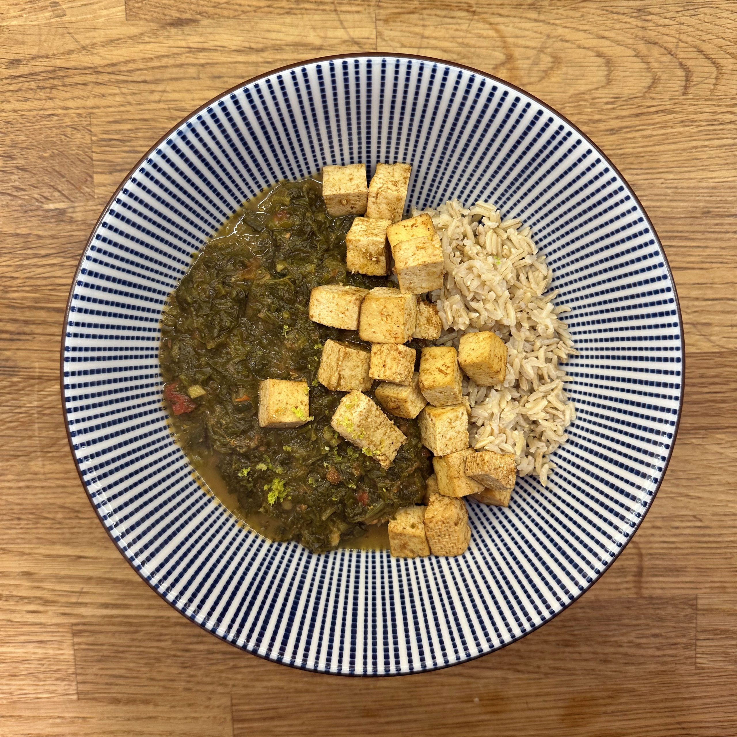 Karine kocht Palak mit Tofu aus dem Ofen. Geriebene Limettenschale und Limettensaft verfeinern den Geschmack. Sehr lecker.