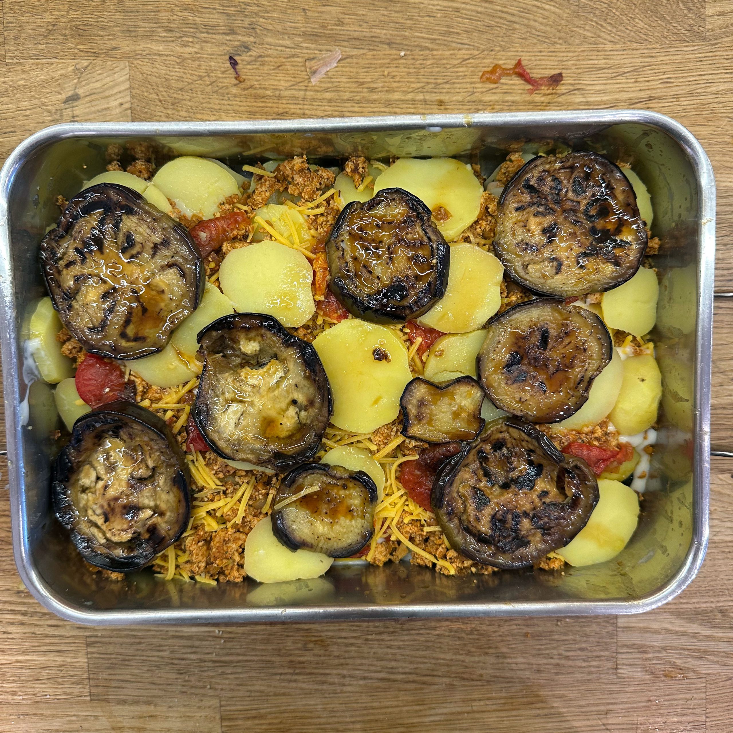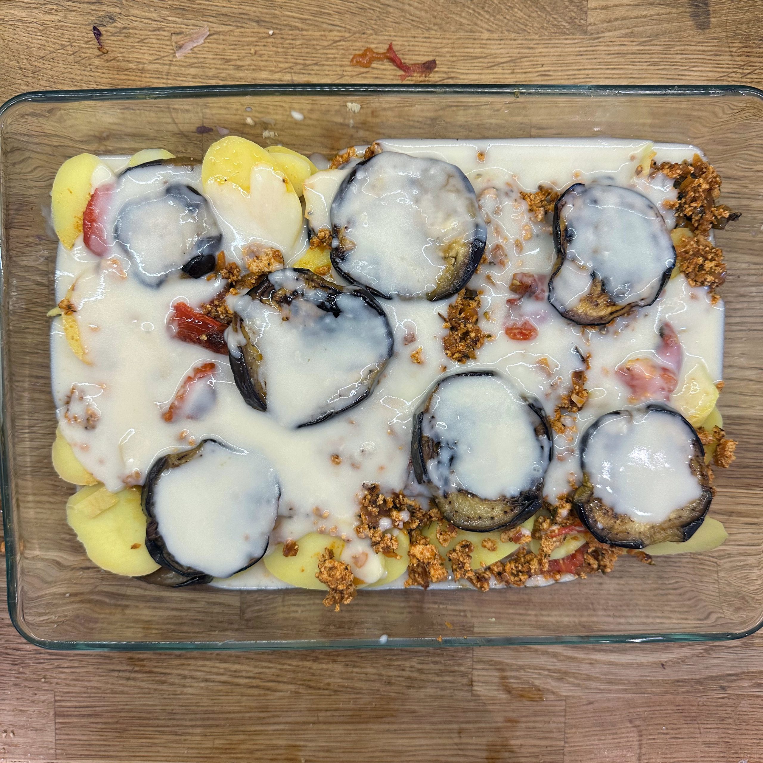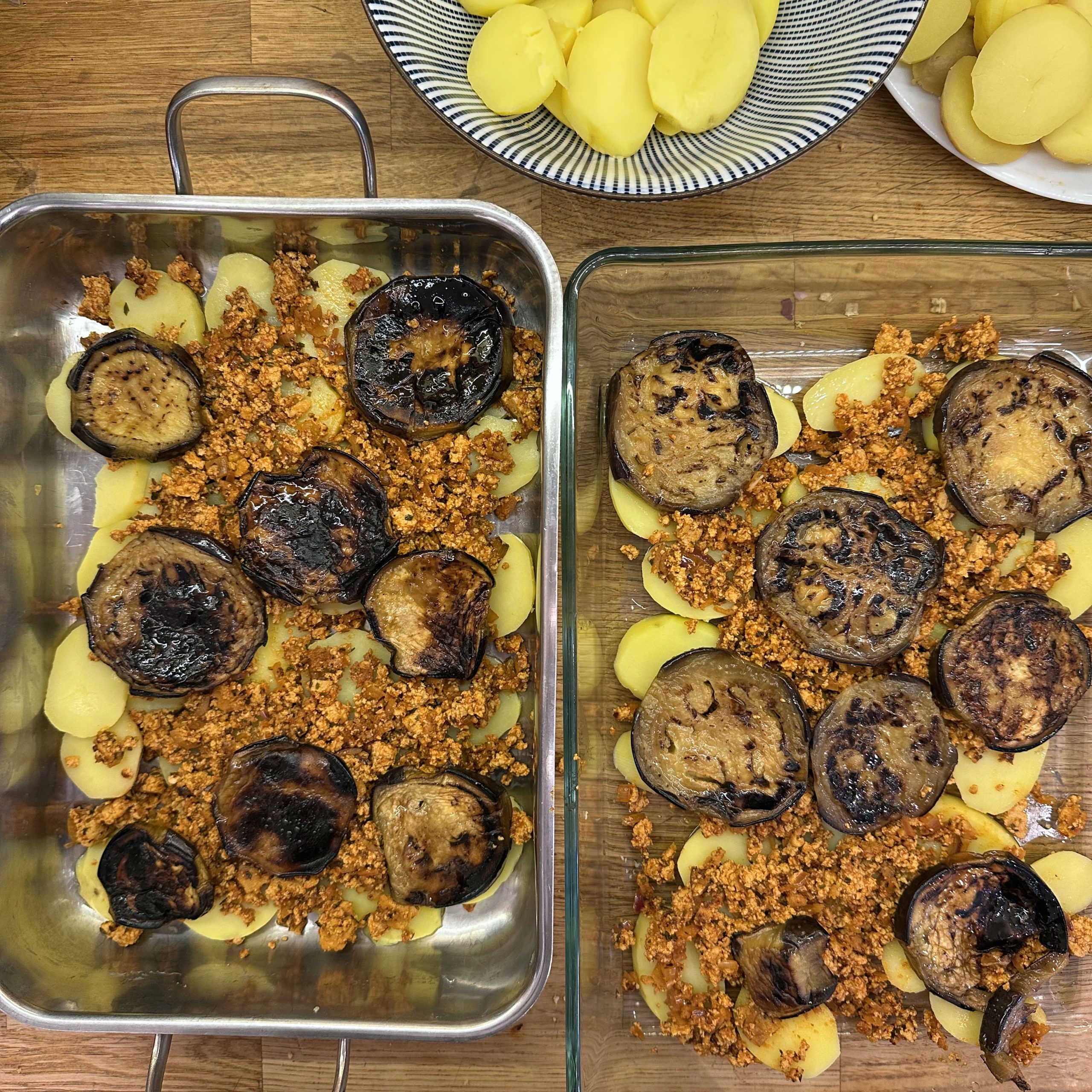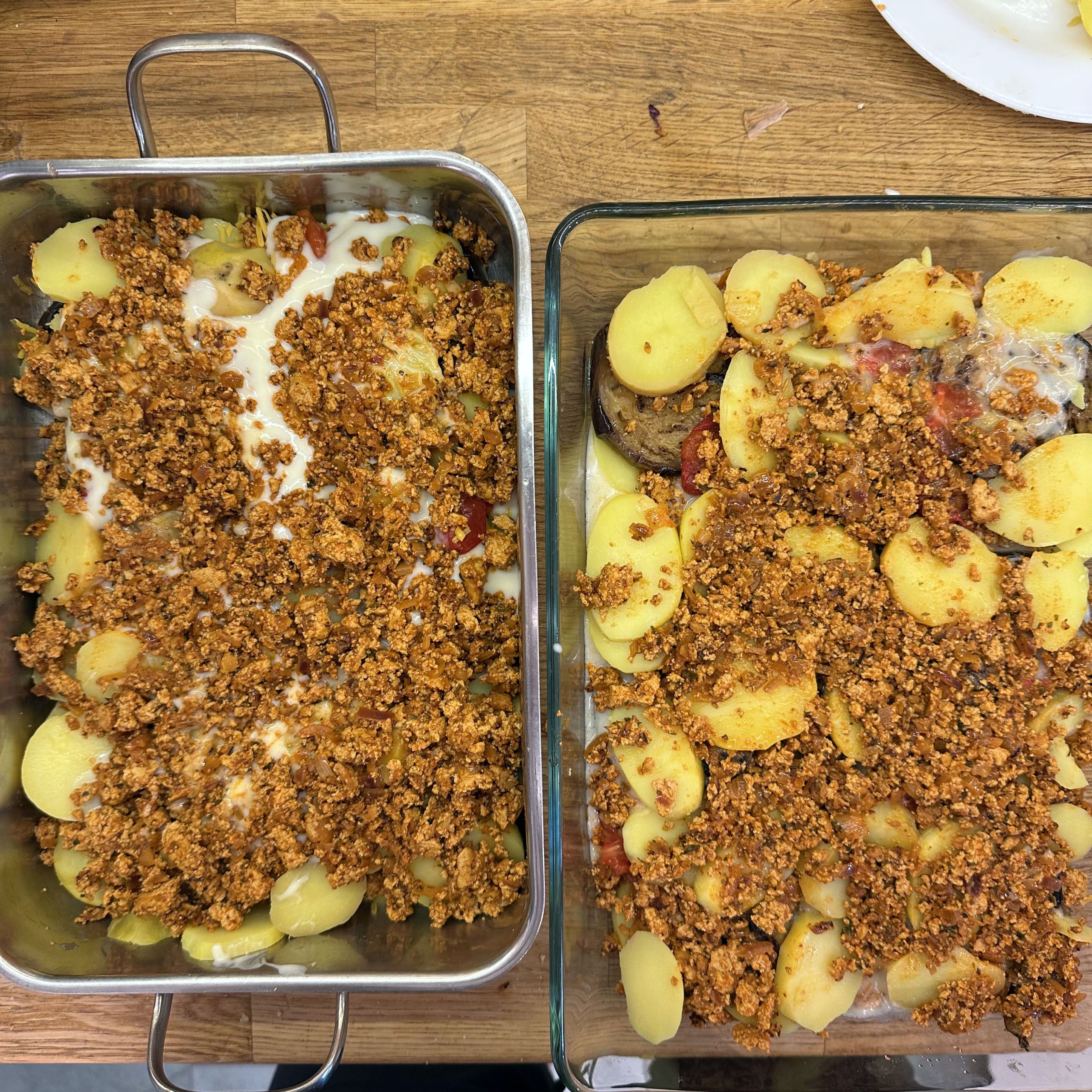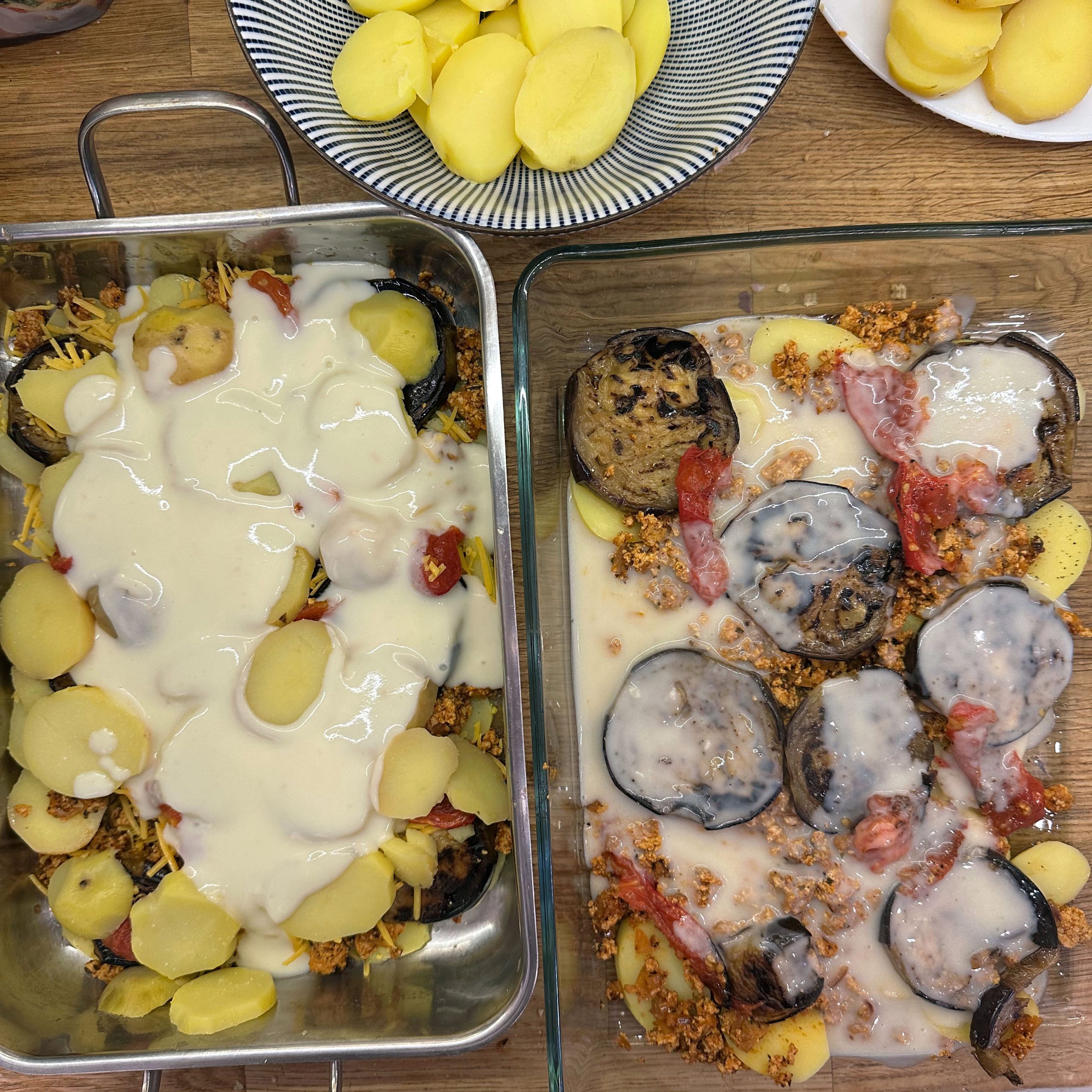 Am Vortag die Vorbereitung: 3 große Auberginen in etwa 1 cm dicke Scheiben schneiden, mit Salz bestreuen, 30 Minuten entwässern lassen, trocken tupfen und einzeln in Öl goldbraun braten, dann übereinander gestapelt mit Olivenöl beträufelt im Kühlschrank lagern. 1,5kg Kartoffeln in der Schale kochen, ausgedampft über Nacht im Kühlschrank lagern, am nächsten Tag schälen und in Scheiben schneiden. 600g Tofu zerkrümeln, in 2 Portionen scharf anbraten, 2 EL Tomatenmark und 50ml Wasser hinzufügen und mit Salz, Sojasoße, normalem und geräuchertem Paprikapulver, Thymian, Kräutern der Provence, Majoran und Bruschettagewürz würzen. 1l Bechamelsoße mit Milch und 0,5l Bechamelsoße mit Pflanzenmilch zubereiten. 8 Tomaten schälen, halbieren, entkernen und im Ofen backen. Zwei Auflaufformen mit Öl einpinseln und abwechselnd schichten: Kartoffelscheiben, Tofuhack, Auberginenscheiben, geröstete Tomaten, in die eine Form zusätzlich Käse und Milch-Bechamel, in die andere die Pflanzenmilch-Bechamel. Zwei Schichten aufbauen, die oberste mit Auberginenscheiben abschließen und mit der restlichen Bechamelsoße gut bedecken. Mit Alufolie oder Deckel bei 230°C Umluft 30 Minuten backen, dann weitere 25 Minuten ohne Deckel bei 200°C. Die vegetarische Version am Ende noch mit Käse bestreuen und weitere 5 Minuten backen. Vor dem Servieren 20 Minuten stehen lassen.