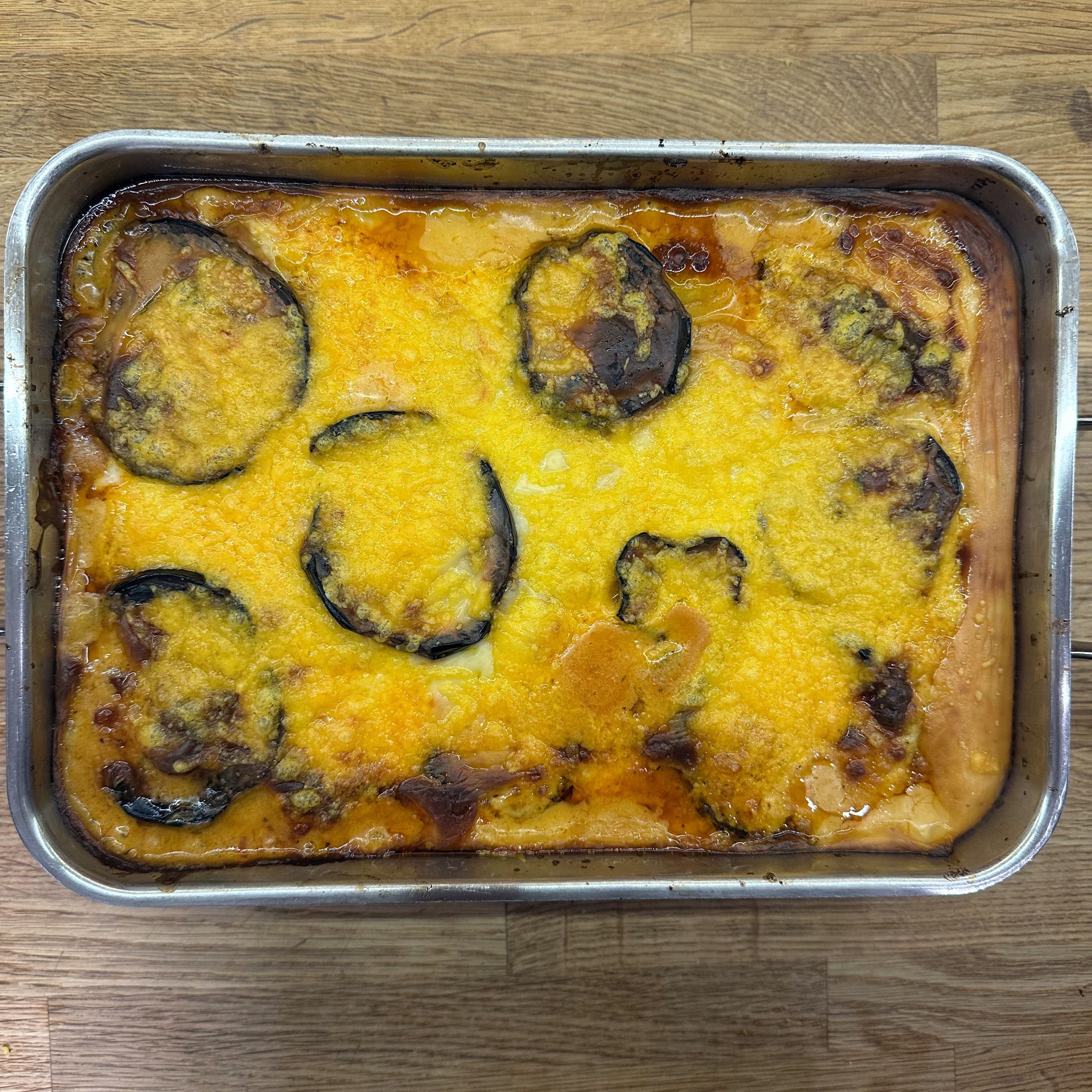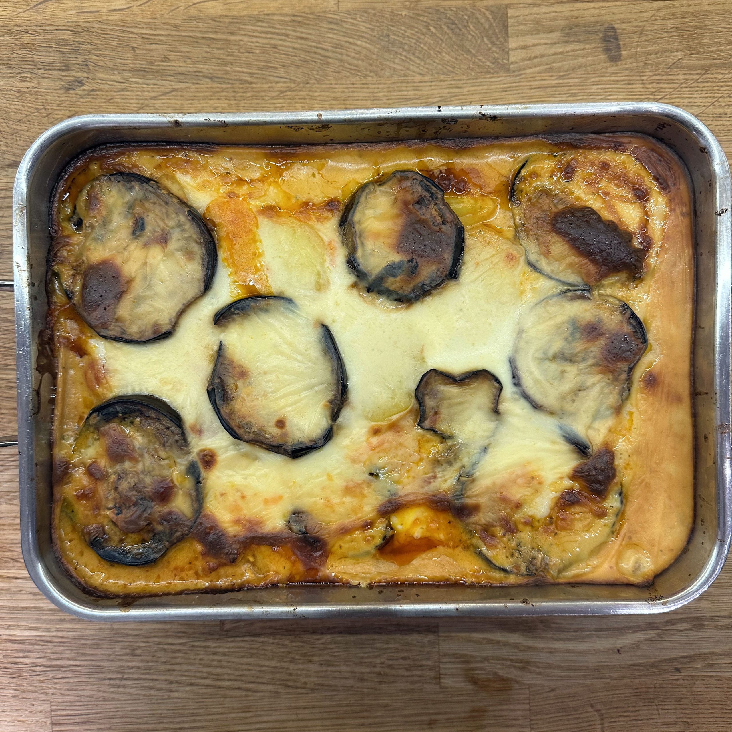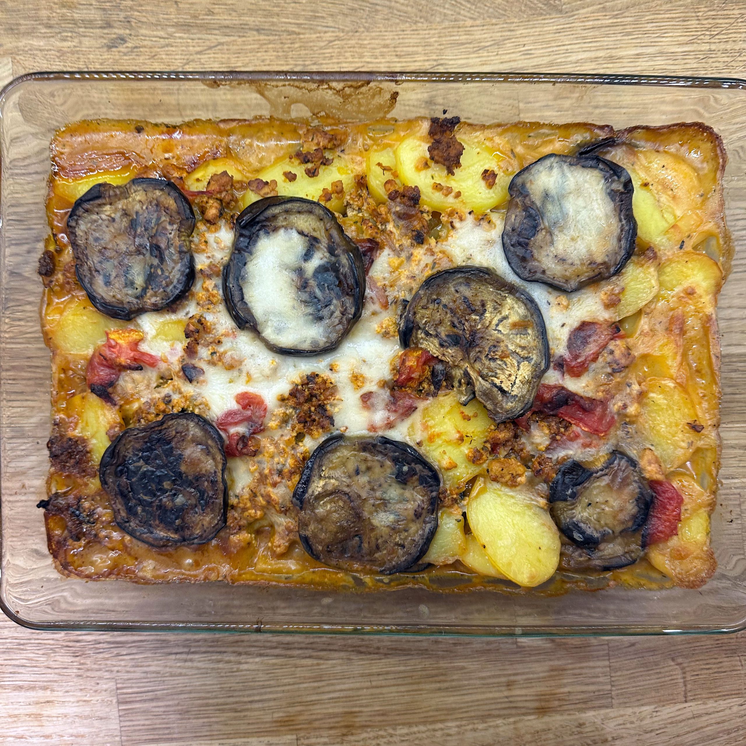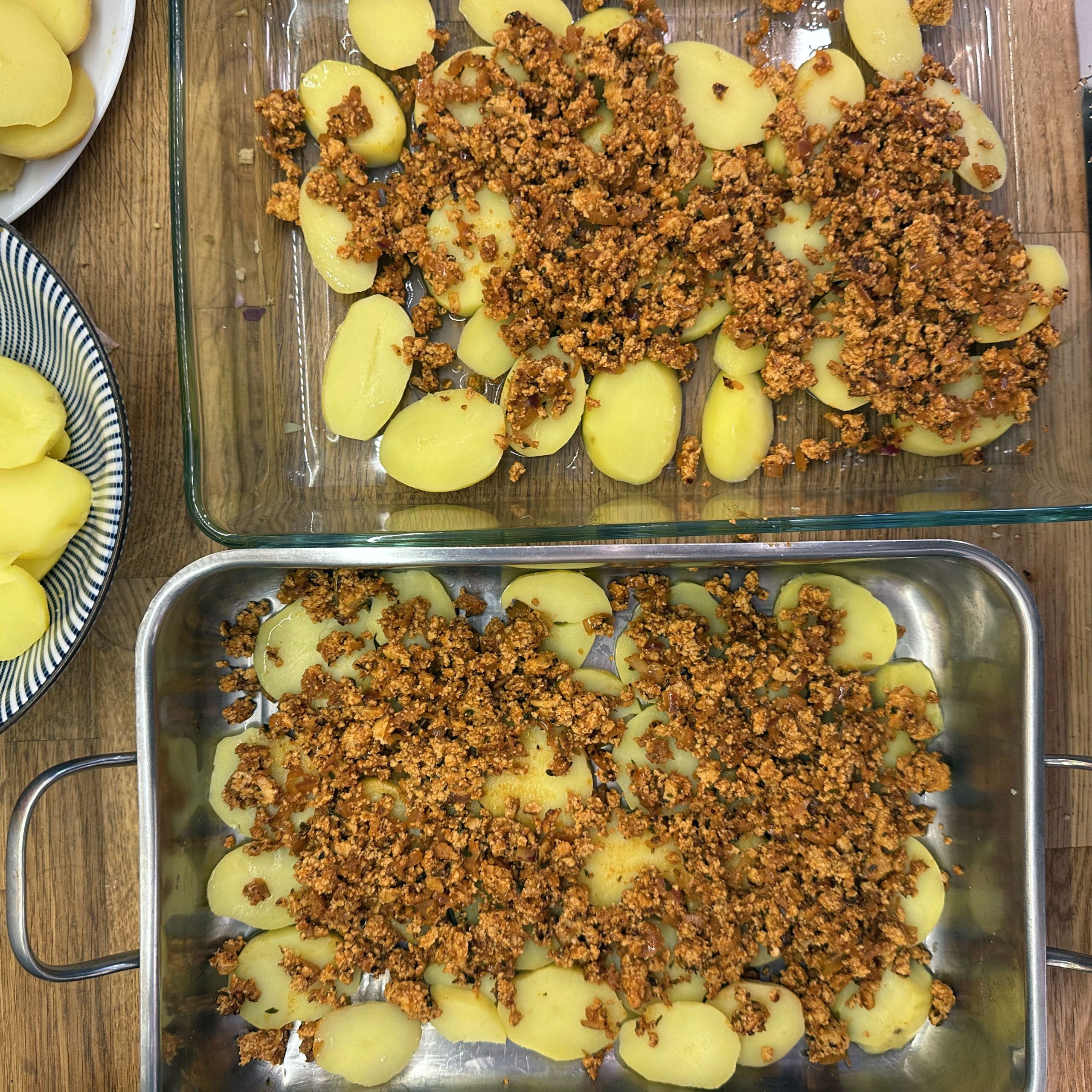 Am Vortag die Vorbereitung: 3 große Auberginen in etwa 1 cm dicke Scheiben schneiden, mit Salz bestreuen, 30 Minuten entwässern lassen, trocken tupfen und einzeln in Öl goldbraun braten, dann übereinander gestapelt mit Olivenöl beträufelt im Kühlschrank lagern. 1,5kg Kartoffeln in der Schale kochen, ausgedampft über Nacht im Kühlschrank lagern, am nächsten Tag schälen und in Scheiben schneiden. 600g Tofu zerkrümeln, in 2 Portionen scharf anbraten, 2 EL Tomatenmark und 50ml Wasser hinzufügen und mit Salz, Sojasoße, normalem und geräuchertem Paprikapulver, Thymian, Kräutern der Provence, Majoran und Bruschettagewürz würzen. 1l Bechamelsoße mit Milch und 0,5l Bechamelsoße mit Pflanzenmilch zubereiten. 8 Tomaten schälen, halbieren, entkernen und im Ofen backen. Zwei Auflaufformen mit Öl einpinseln und abwechselnd schichten: Kartoffelscheiben, Tofuhack, Auberginenscheiben, geröstete Tomaten, in die eine Form zusätzlich Käse und Milch-Bechamel, in die andere die Pflanzenmilch-Bechamel. Zwei Schichten aufbauen, die oberste mit Auberginenscheiben abschließen und mit der restlichen Bechamelsoße gut bedecken. Mit Alufolie oder Deckel bei 230°C Umluft 30 Minuten backen, dann weitere 25 Minuten ohne Deckel bei 200°C. Die vegetarische Version am Ende noch mit Käse bestreuen und weitere 5 Minuten backen. Vor dem Servieren 20 Minuten stehen lassen.