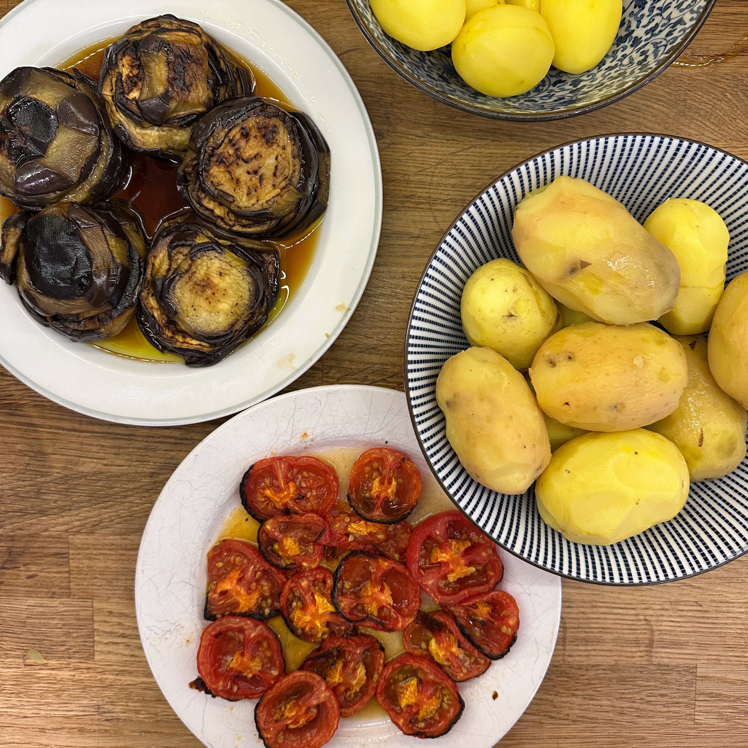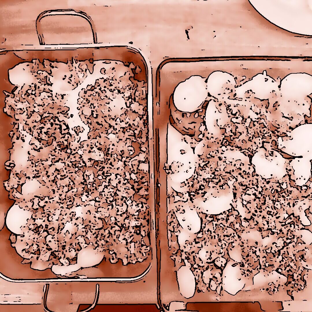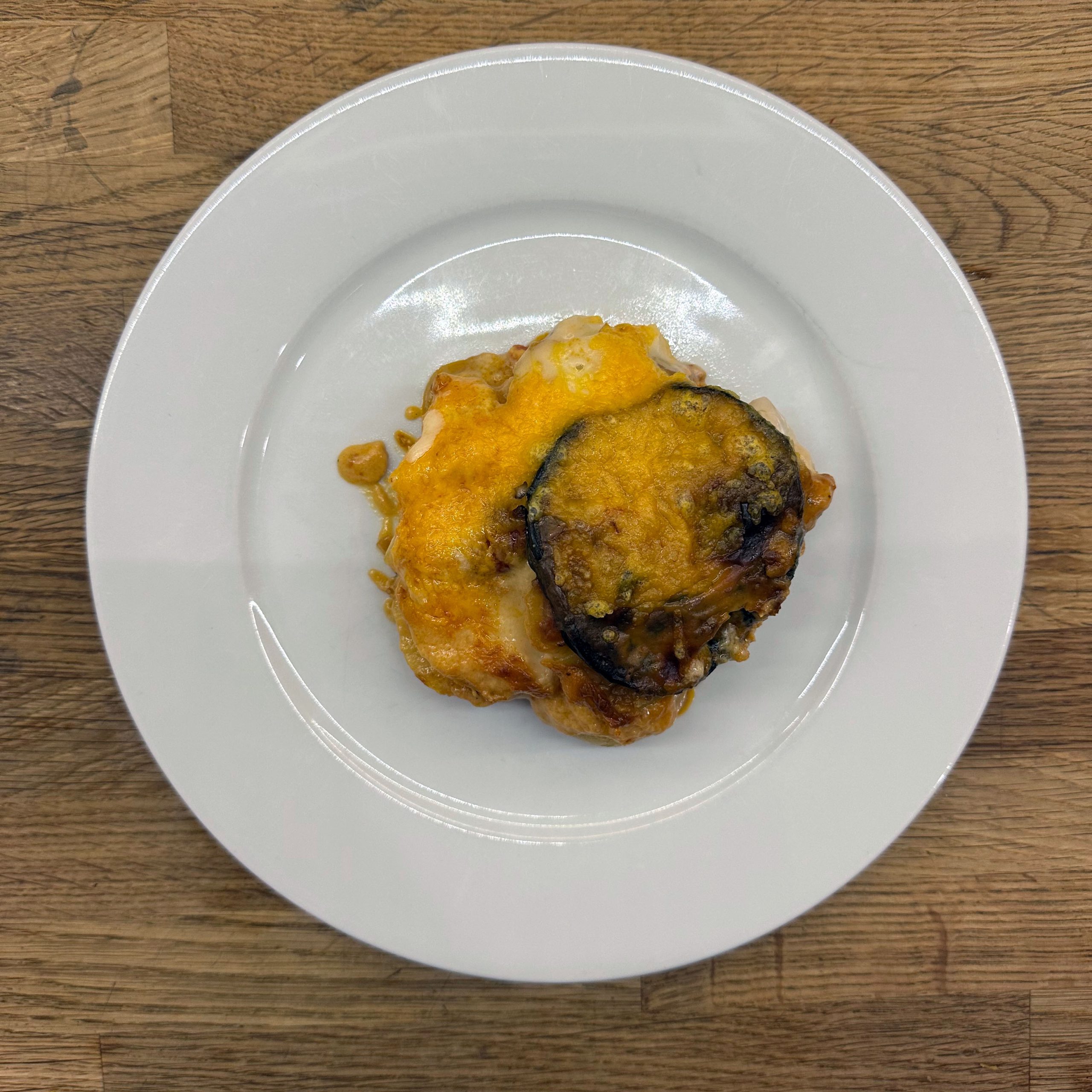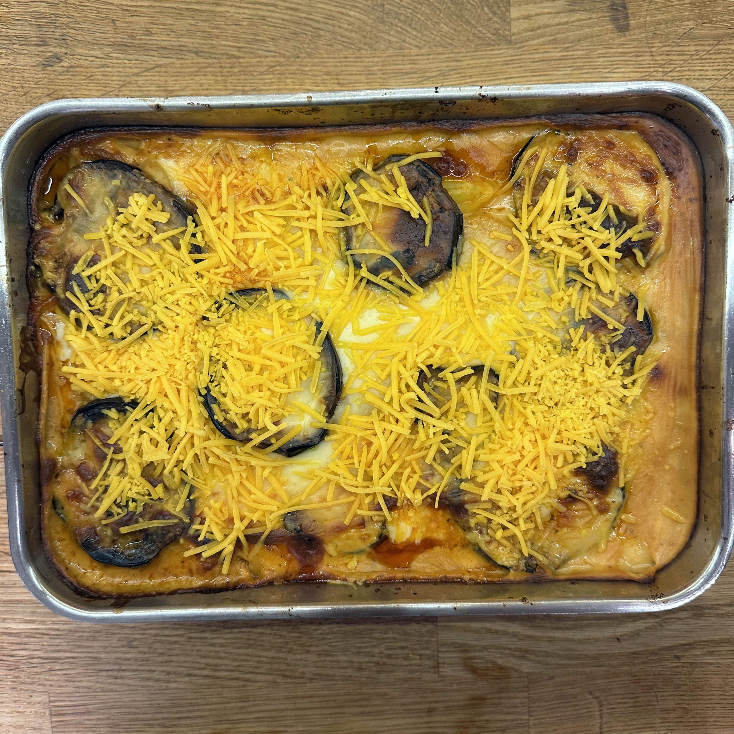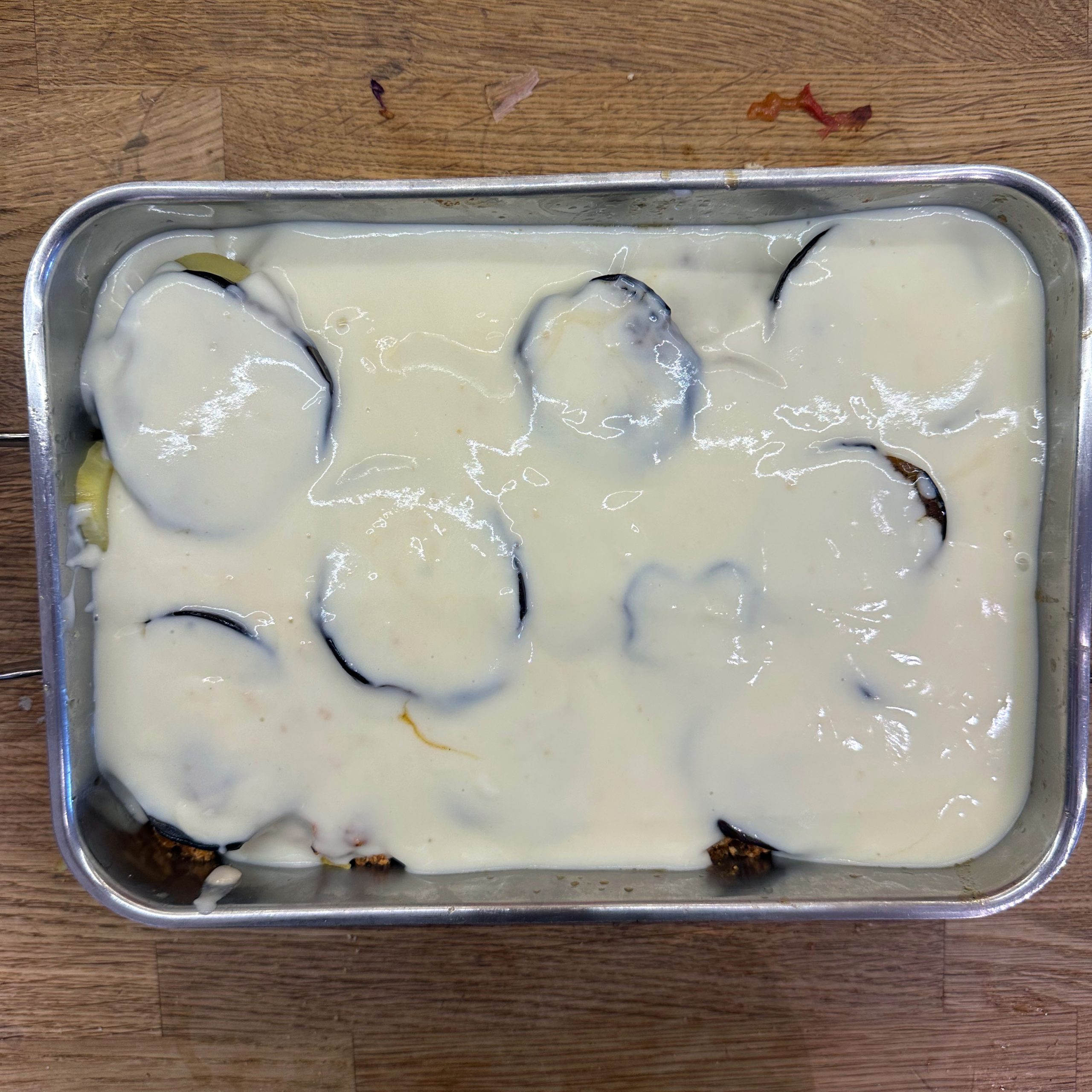 Am Vortag die Vorbereitung: 3 große Auberginen in etwa 1 cm dicke Scheiben schneiden, mit Salz bestreuen, 30 Minuten entwässern lassen, trocken tupfen und einzeln in Öl goldbraun braten, dann übereinander gestapelt mit Olivenöl beträufelt im Kühlschrank lagern. 1,5kg Kartoffeln in der Schale kochen, ausgedampft über Nacht im Kühlschrank lagern, am nächsten Tag schälen und in Scheiben schneiden. 600g Tofu zerkrümeln, in 2 Portionen scharf anbraten, 2 EL Tomatenmark und 50ml Wasser hinzufügen und mit Salz, Sojasoße, normalem und geräuchertem Paprikapulver, Thymian, Kräutern der Provence, Majoran und Bruschettagewürz würzen. 1l Bechamelsoße mit Milch und 0,5l Bechamelsoße mit Pflanzenmilch zubereiten. 8 Tomaten schälen, halbieren, entkernen und im Ofen backen. Zwei Auflaufformen mit Öl einpinseln und abwechselnd schichten: Kartoffelscheiben, Tofuhack, Auberginenscheiben, geröstete Tomaten, in die eine Form zusätzlich Käse und Milch-Bechamel, in die andere die Pflanzenmilch-Bechamel. Zwei Schichten aufbauen, die oberste mit Auberginenscheiben abschließen und mit der restlichen Bechamelsoße gut bedecken. Mit Alufolie oder Deckel bei 230°C Umluft 30 Minuten backen, dann weitere 25 Minuten ohne Deckel bei 200°C. Die vegetarische Version am Ende noch mit Käse bestreuen und weitere 5 Minuten backen. Vor dem Servieren 20 Minuten stehen lassen.