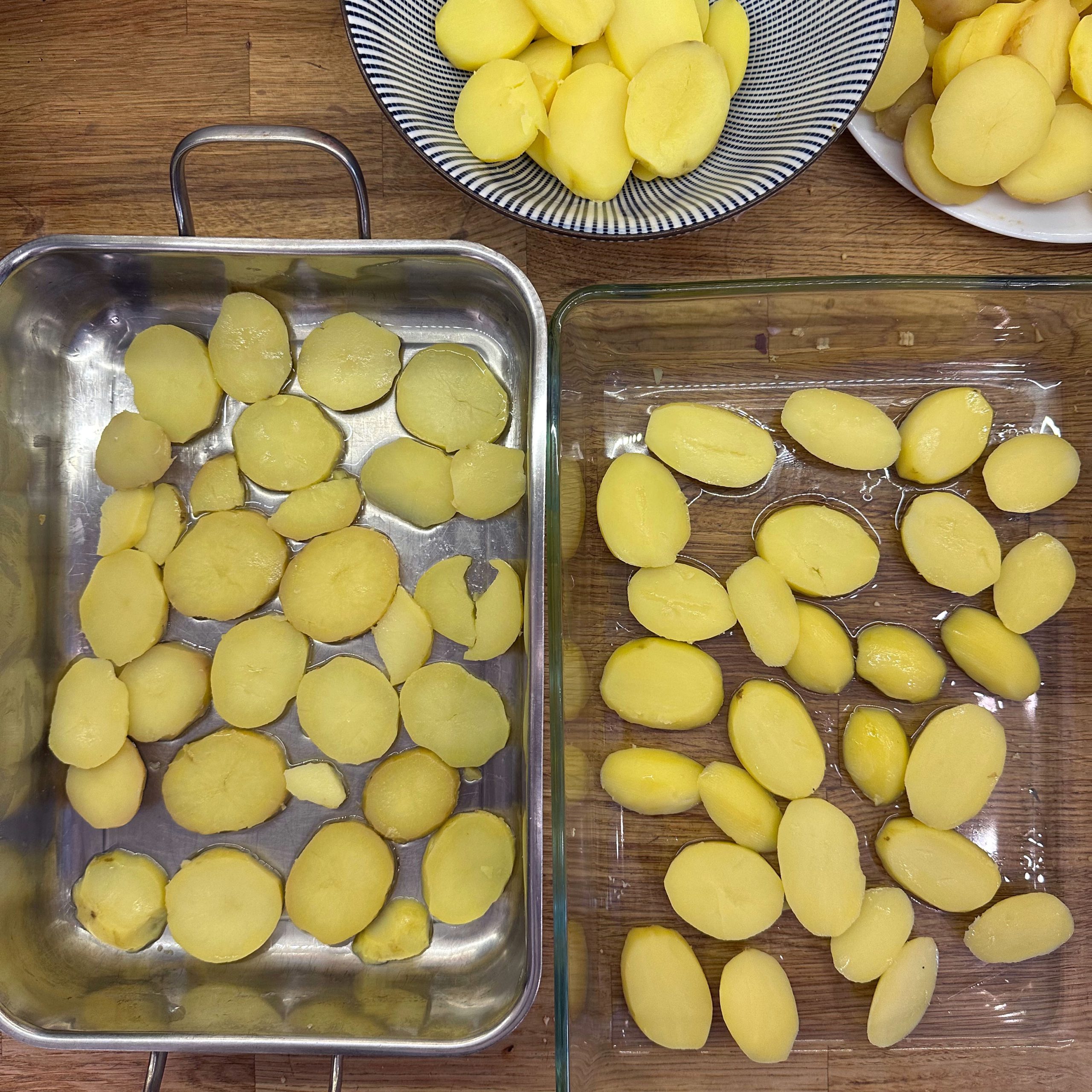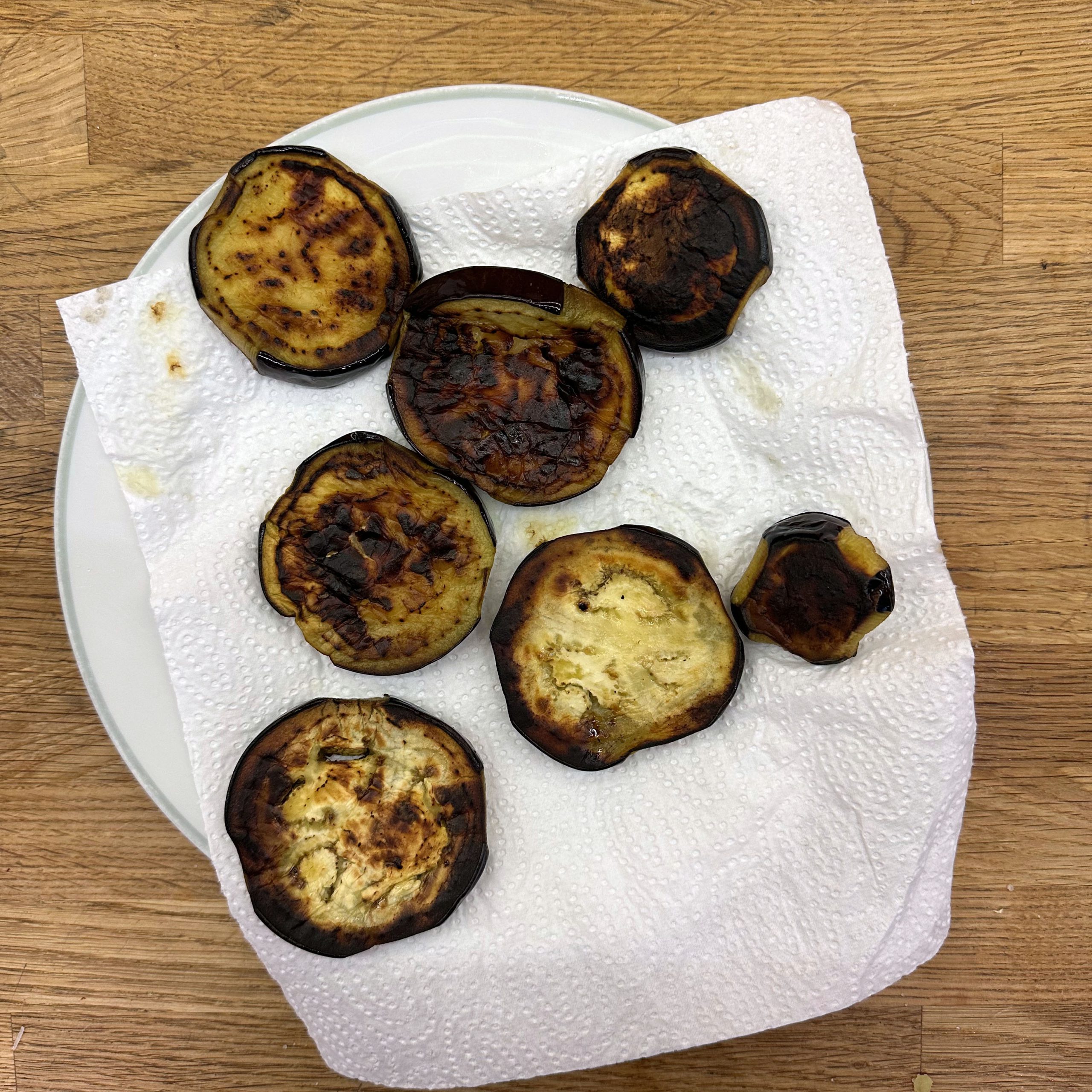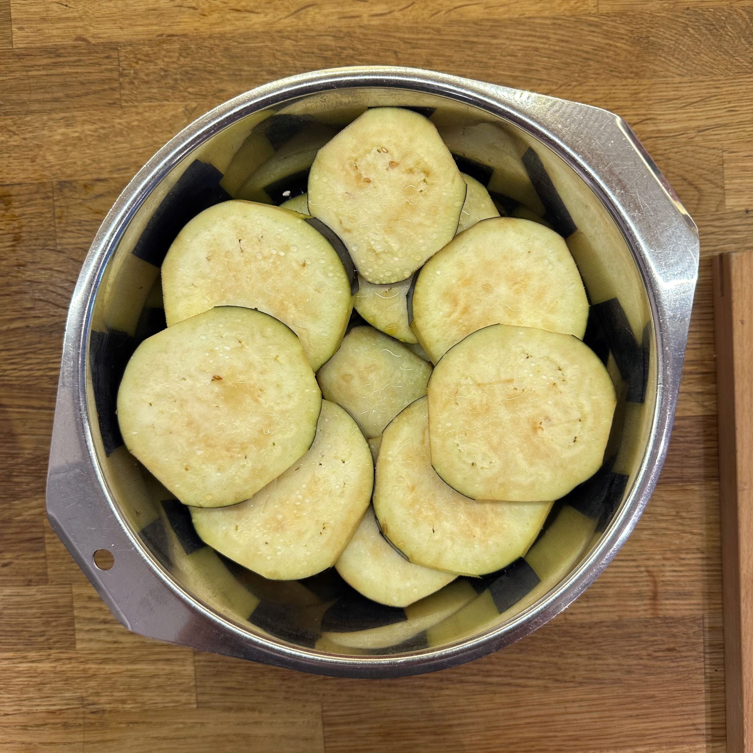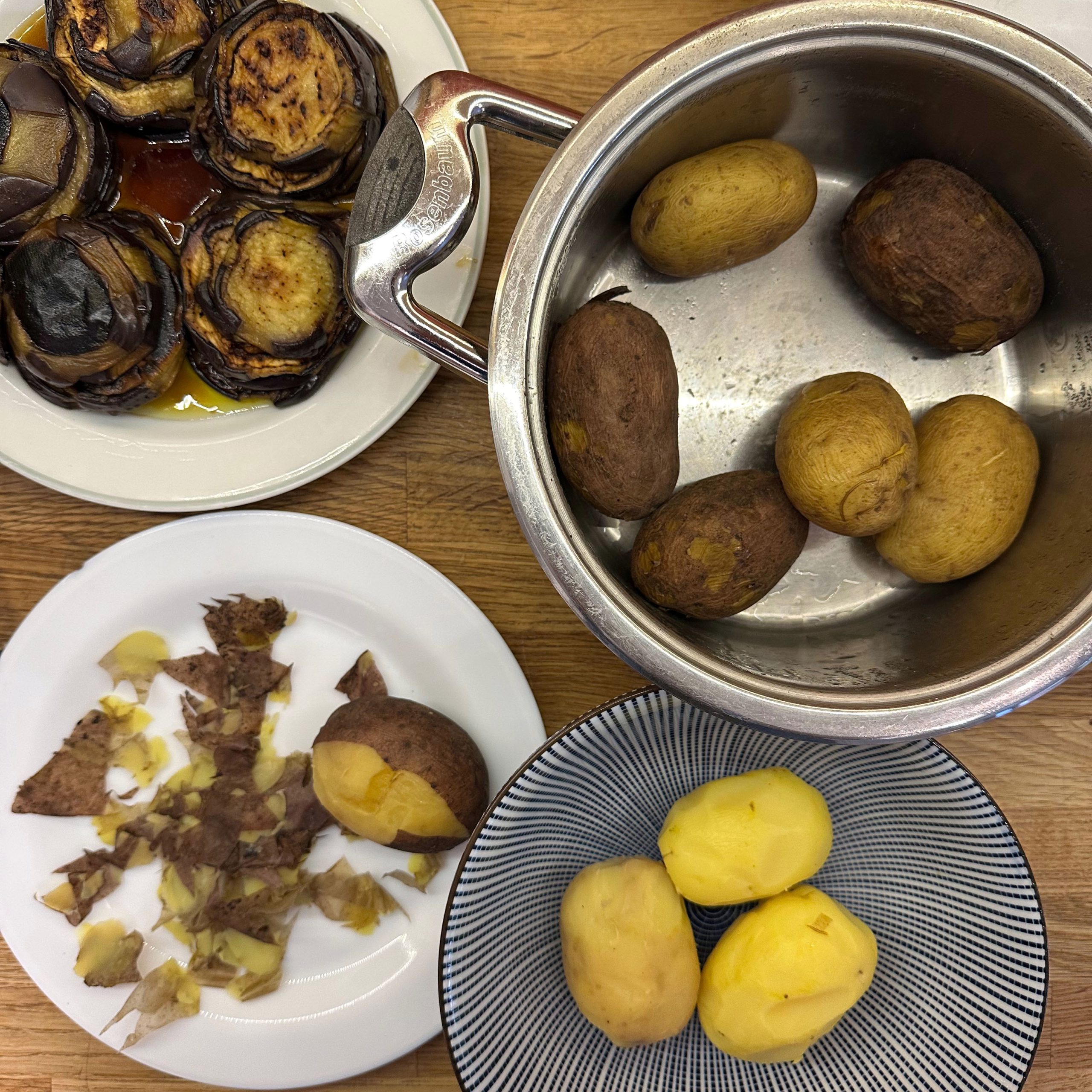 Am Vortag die Vorbereitung: 3 große Auberginen in etwa 1 cm dicke Scheiben schneiden, mit Salz bestreuen, 30 Minuten entwässern lassen, trocken tupfen und einzeln in Öl goldbraun braten, dann übereinander gestapelt mit Olivenöl beträufelt im Kühlschrank lagern. 1,5kg Kartoffeln in der Schale kochen, ausgedampft über Nacht im Kühlschrank lagern, am nächsten Tag schälen und in Scheiben schneiden. 600g Tofu zerkrümeln, in 2 Portionen scharf anbraten, 2 EL Tomatenmark und 50ml Wasser hinzufügen und mit Salz, Sojasoße, normalem und geräuchertem Paprikapulver, Thymian, Kräutern der Provence, Majoran und Bruschettagewürz würzen. 1l Bechamelsoße mit Milch und 0,5l Bechamelsoße mit Pflanzenmilch zubereiten. 8 Tomaten schälen, halbieren, entkernen und im Ofen backen. Zwei Auflaufformen mit Öl einpinseln und abwechselnd schichten: Kartoffelscheiben, Tofuhack, Auberginenscheiben, geröstete Tomaten, in die eine Form zusätzlich Käse und Milch-Bechamel, in die andere die Pflanzenmilch-Bechamel. Zwei Schichten aufbauen, die oberste mit Auberginenscheiben abschließen und mit der restlichen Bechamelsoße gut bedecken. Mit Alufolie oder Deckel bei 230°C Umluft 30 Minuten backen, dann weitere 25 Minuten ohne Deckel bei 200°C. Die vegetarische Version am Ende noch mit Käse bestreuen und weitere 5 Minuten backen. Vor dem Servieren 20 Minuten stehen lassen.