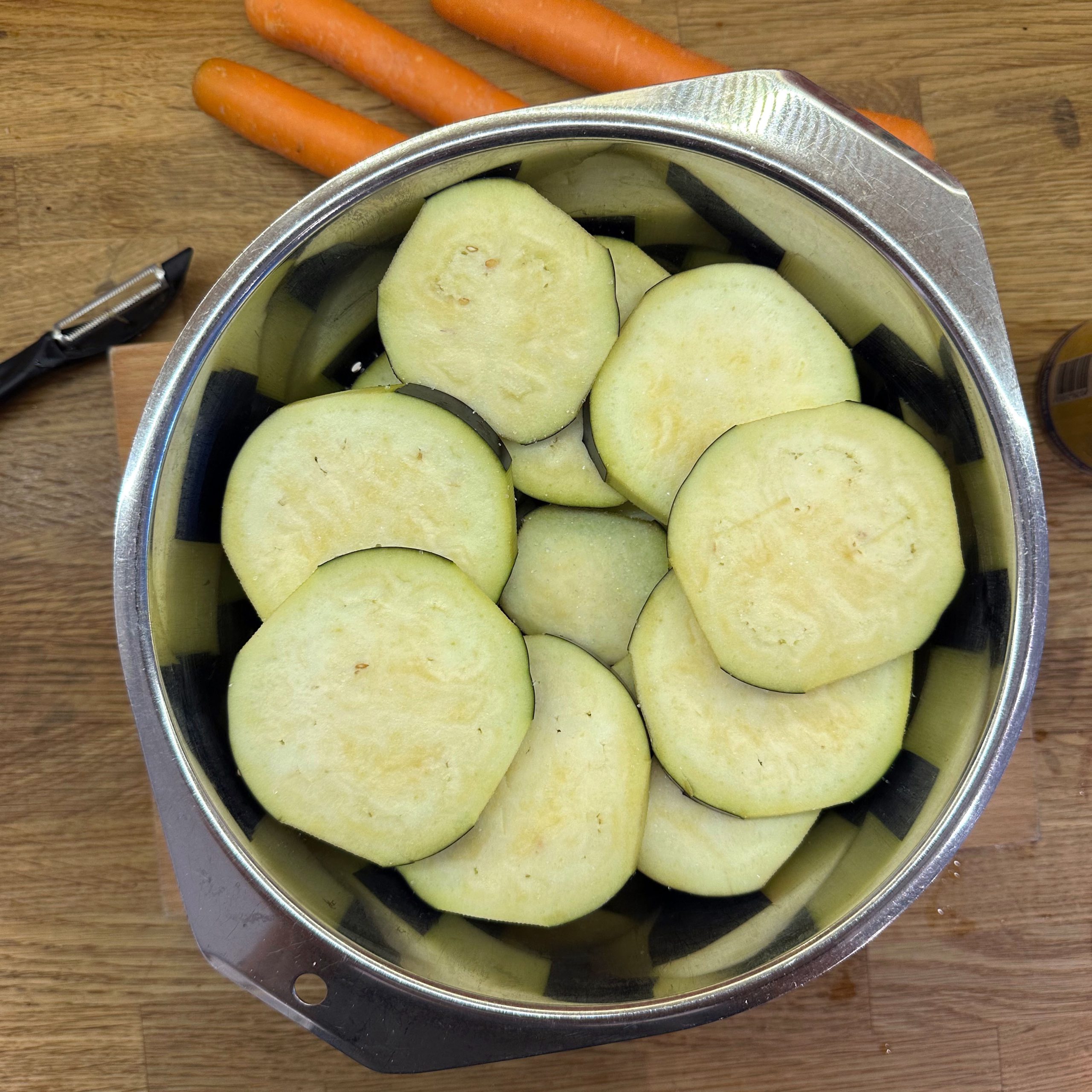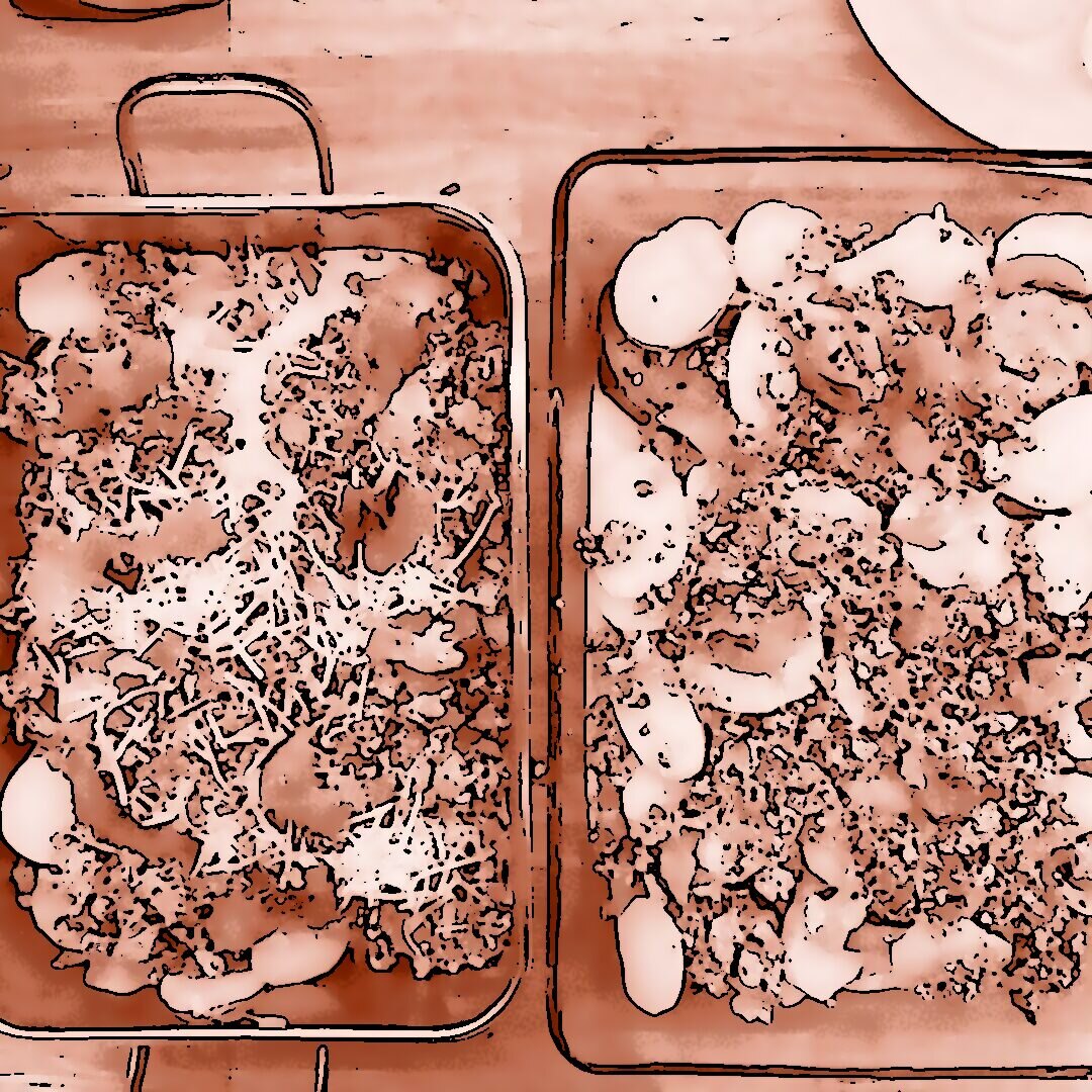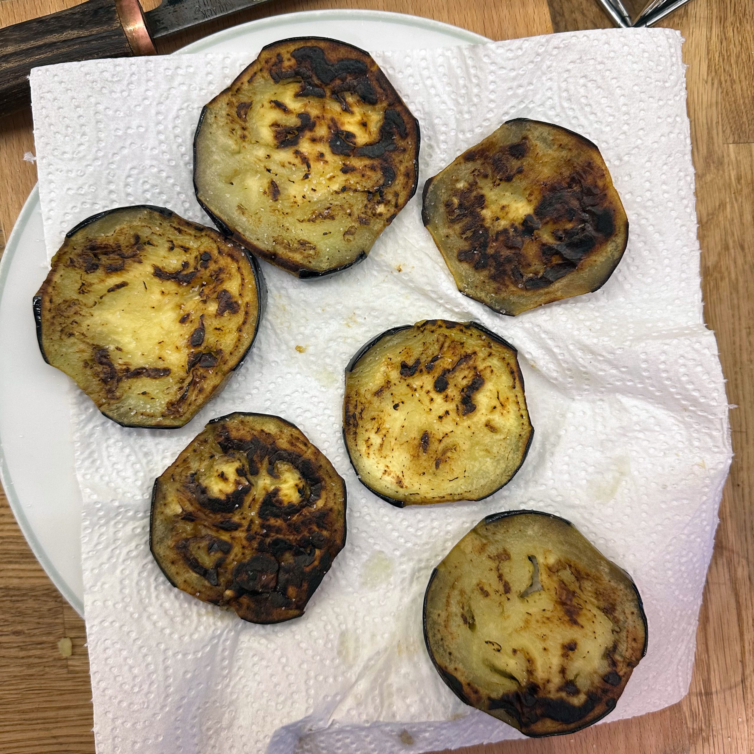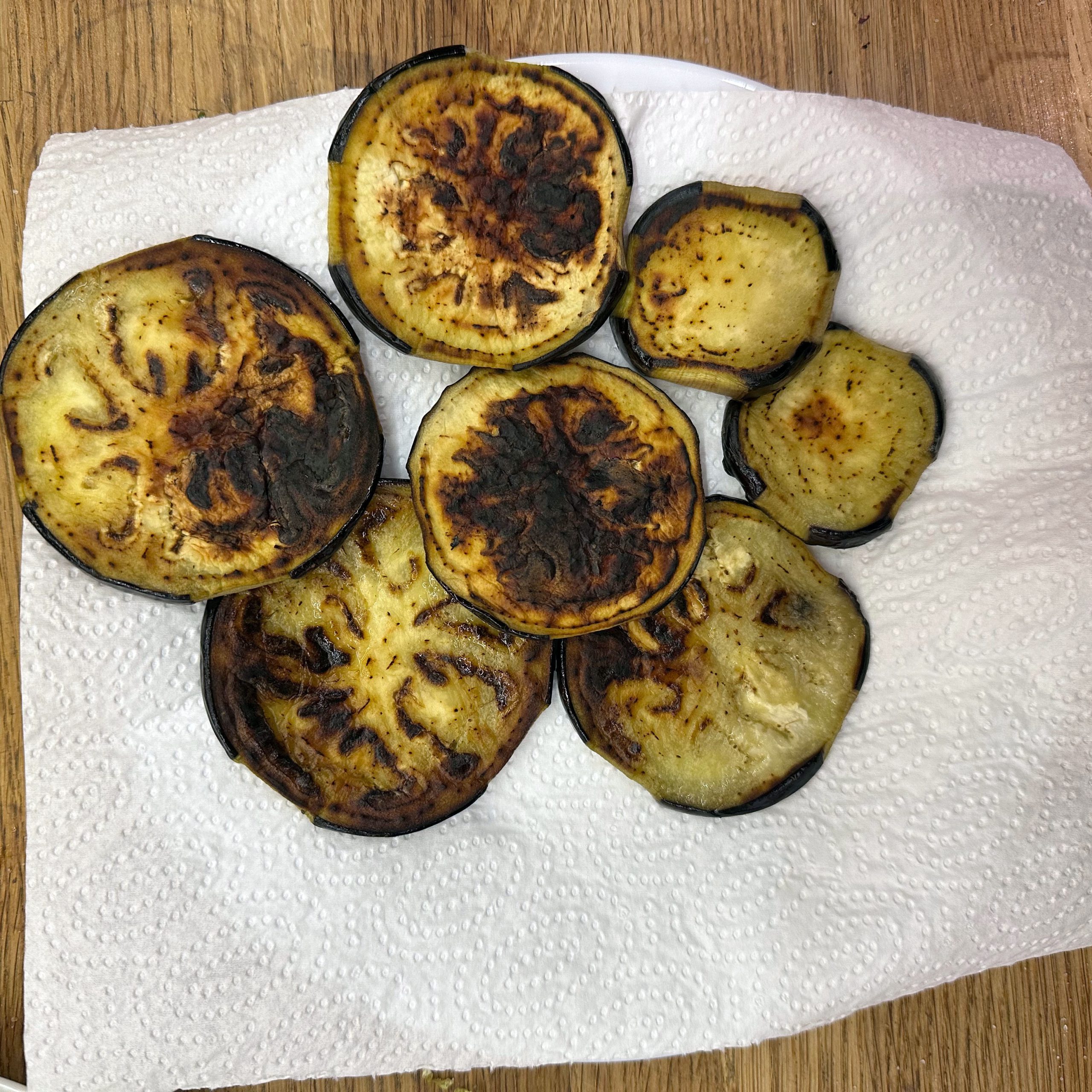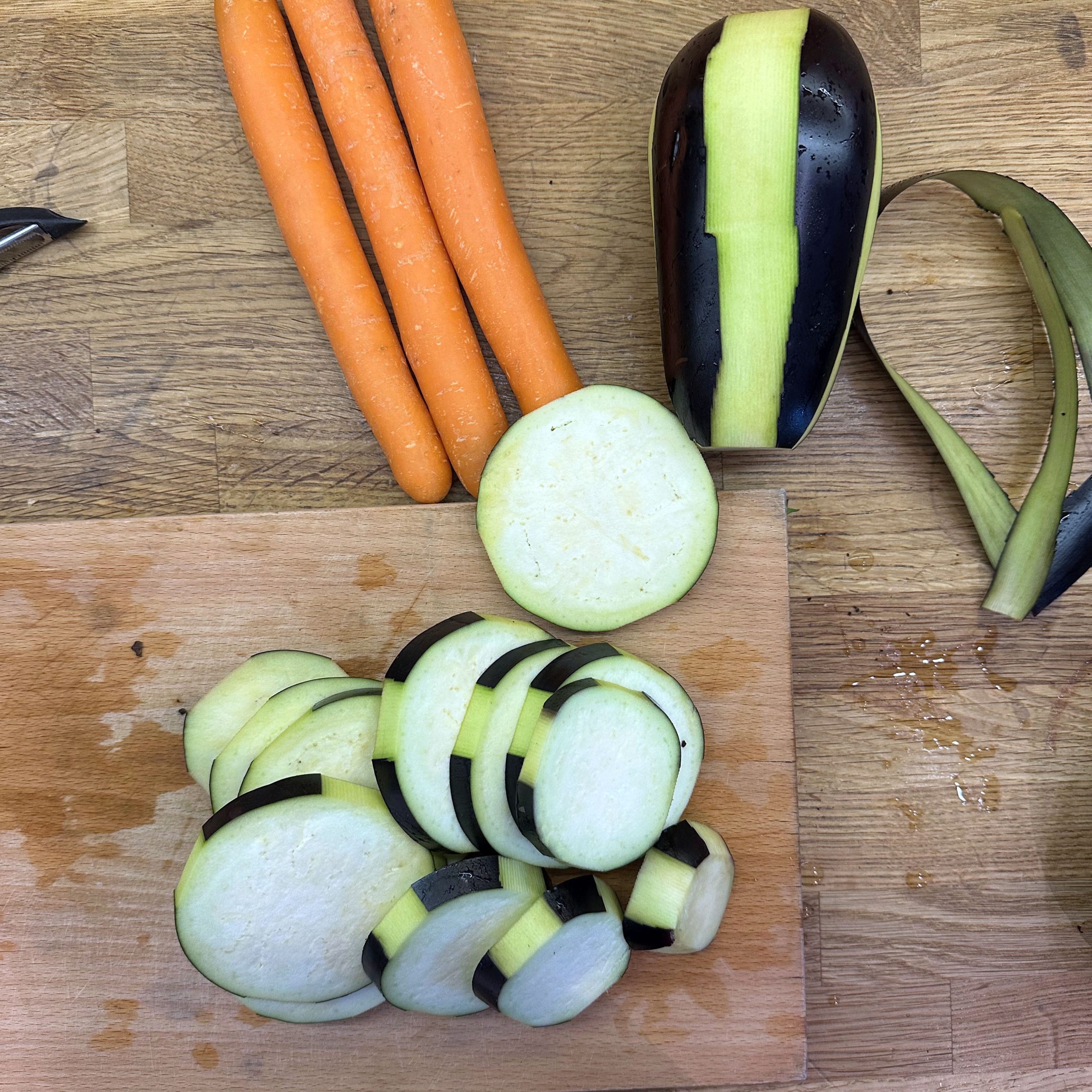 Am Vortag die Vorbereitung: 3 große Auberginen in etwa 1 cm dicke Scheiben schneiden, mit Salz bestreuen, 30 Minuten entwässern lassen, trocken tupfen und einzeln in Öl goldbraun braten, dann übereinander gestapelt mit Olivenöl beträufelt im Kühlschrank lagern. 1,5kg Kartoffeln in der Schale kochen, ausgedampft über Nacht im Kühlschrank lagern, am nächsten Tag schälen und in Scheiben schneiden. 600g Tofu zerkrümeln, in 2 Portionen scharf anbraten, 2 EL Tomatenmark und 50ml Wasser hinzufügen und mit Salz, Sojasoße, normalem und geräuchertem Paprikapulver, Thymian, Kräutern der Provence, Majoran und Bruschettagewürz würzen. 1l Bechamelsoße mit Milch und 0,5l Bechamelsoße mit Pflanzenmilch zubereiten. 8 Tomaten schälen, halbieren, entkernen und im Ofen backen. Zwei Auflaufformen mit Öl einpinseln und abwechselnd schichten: Kartoffelscheiben, Tofuhack, Auberginenscheiben, geröstete Tomaten, in die eine Form zusätzlich Käse und Milch-Bechamel, in die andere die Pflanzenmilch-Bechamel. Zwei Schichten aufbauen, die oberste mit Auberginenscheiben abschließen und mit der restlichen Bechamelsoße gut bedecken. Mit Alufolie oder Deckel bei 230°C Umluft 30 Minuten backen, dann weitere 25 Minuten ohne Deckel bei 200°C. Die vegetarische Version am Ende noch mit Käse bestreuen und weitere 5 Minuten backen. Vor dem Servieren 20 Minuten stehen lassen.