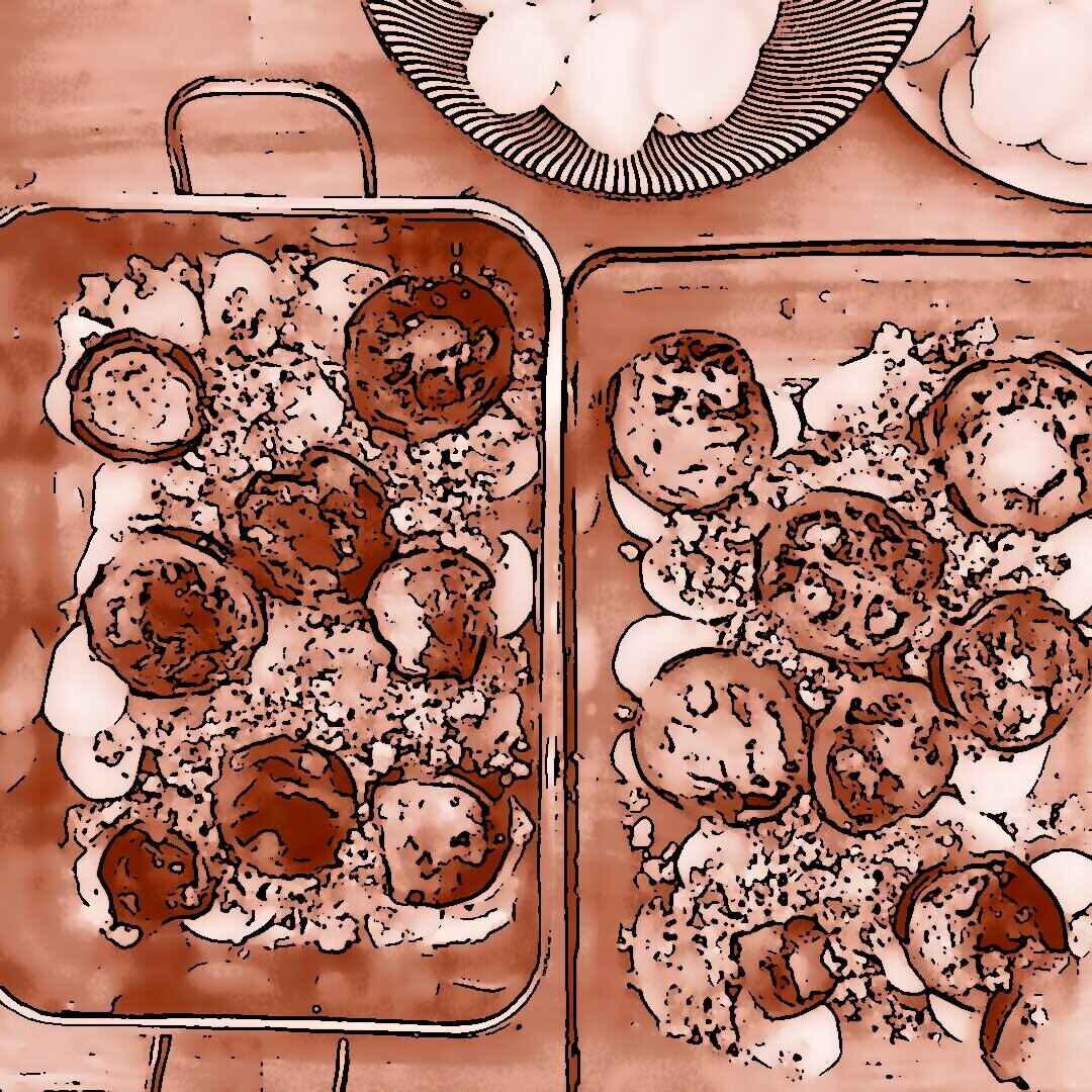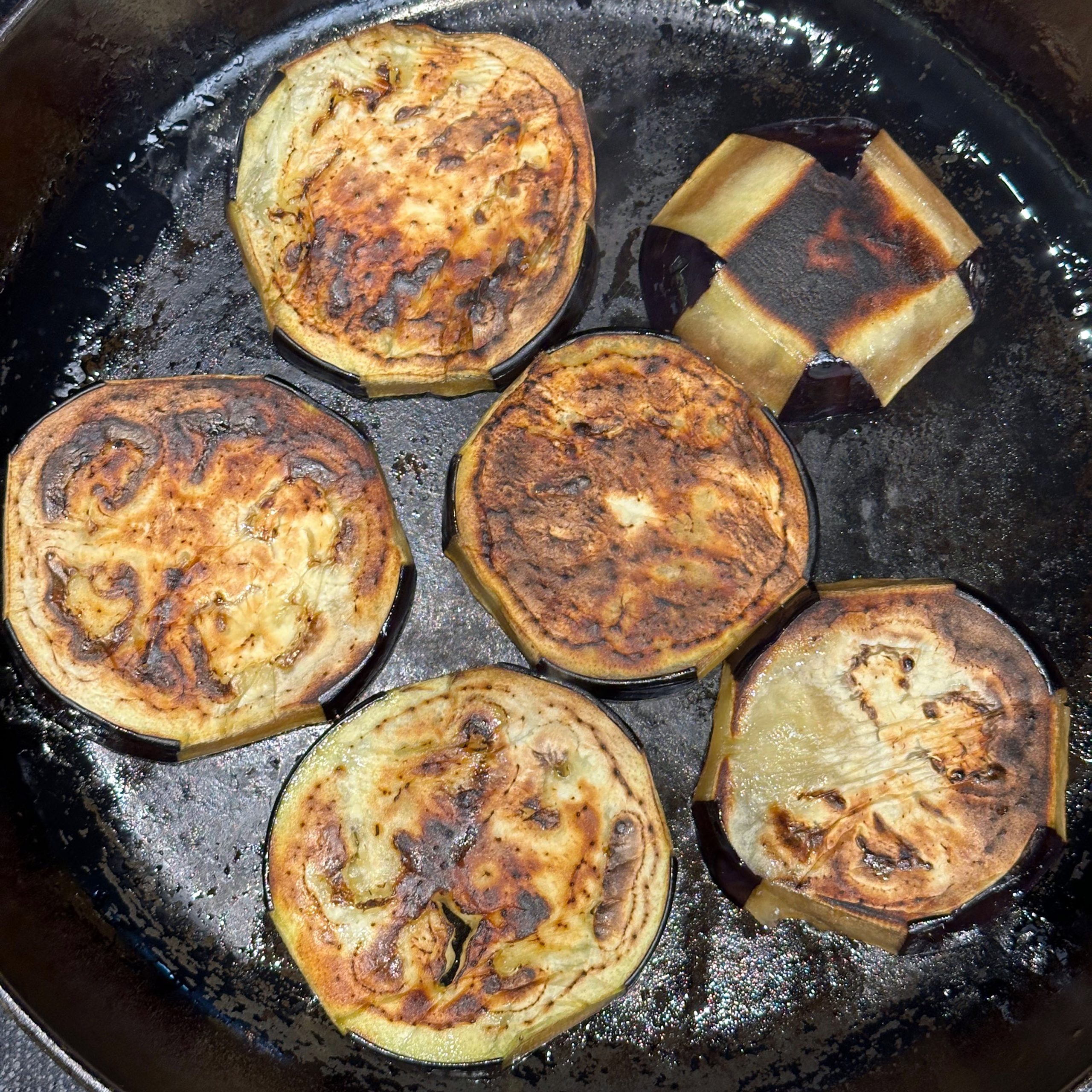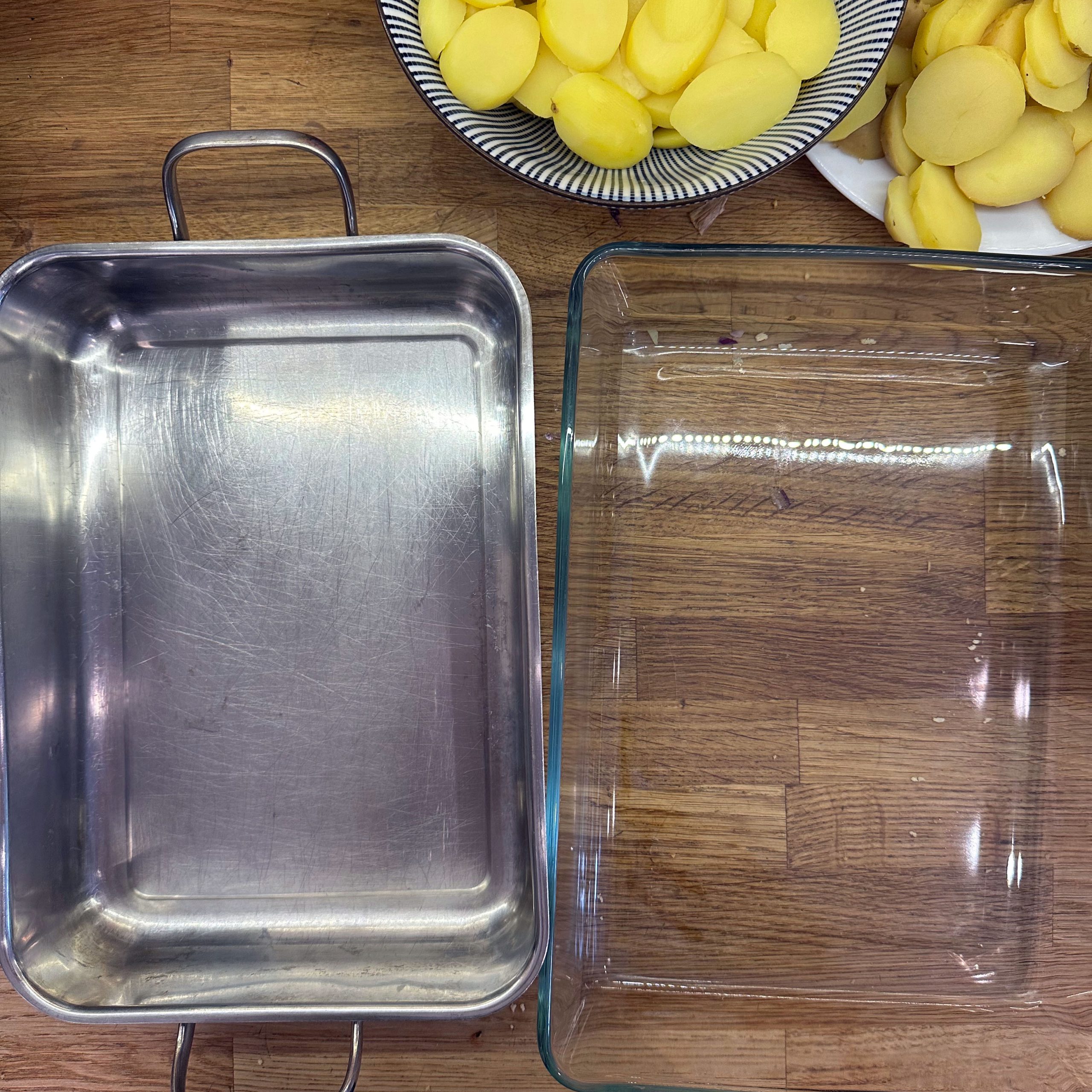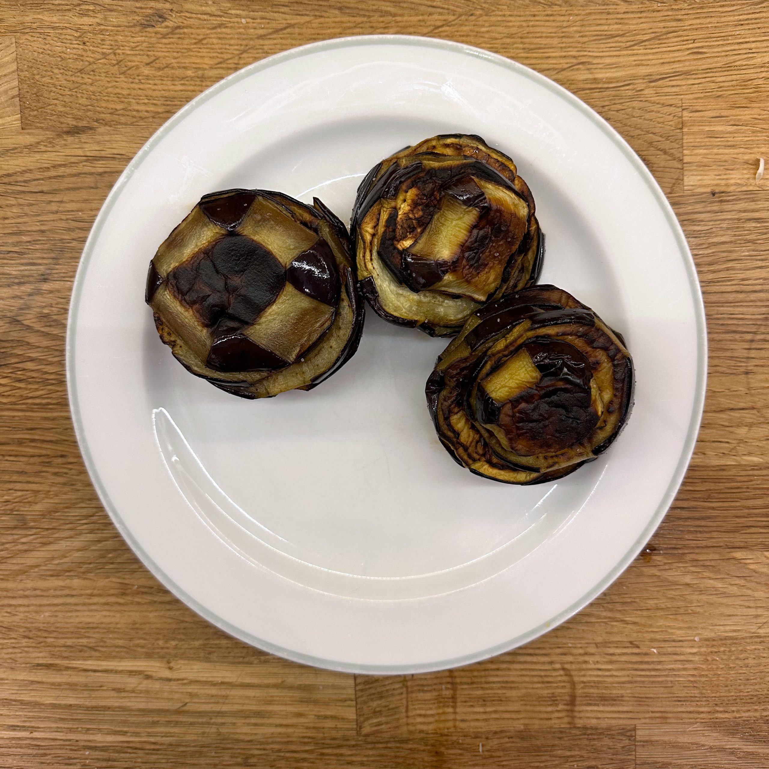Am Vortag die Vorbereitung: 3 große Auberginen in etwa 1 cm dicke Scheiben schneiden, mit Salz bestreuen, 30 Minuten entwässern lassen, trocken tupfen und einzeln in Öl goldbraun braten, dann übereinander gestapelt mit Olivenöl beträufelt im Kühlschrank lagern. 1,5kg Kartoffeln in der Schale kochen, ausgedampft über Nacht im Kühlschrank lagern, am nächsten Tag schälen und in Scheiben schneiden. 600g Tofu zerkrümeln, in 2 Portionen scharf anbraten, 2 EL Tomatenmark und 50ml Wasser hinzufügen und mit Salz, Sojasoße, normalem und geräuchertem Paprikapulver, Thymian, Kräutern der Provence, Majoran und Bruschettagewürz würzen. 1l Bechamelsoße mit Milch und 0,5l Bechamelsoße mit Pflanzenmilch zubereiten. 8 Tomaten schälen, halbieren, entkernen und im Ofen backen. Zwei Auflaufformen mit Öl einpinseln und abwechselnd schichten: Kartoffelscheiben, Tofuhack, Auberginenscheiben, geröstete Tomaten, in die eine Form zusätzlich Käse und Milch-Bechamel, in die andere die Pflanzenmilch-Bechamel. Zwei Schichten aufbauen, die oberste mit Auberginenscheiben abschließen und mit der restlichen Bechamelsoße gut bedecken. Mit Alufolie oder Deckel bei 230°C Umluft 30 Minuten backen, dann weitere 25 Minuten ohne Deckel bei 200°C. Die vegetarische Version am Ende noch mit Käse bestreuen und weitere 5 Minuten backen. Vor dem Servieren 20 Minuten stehen lassen.