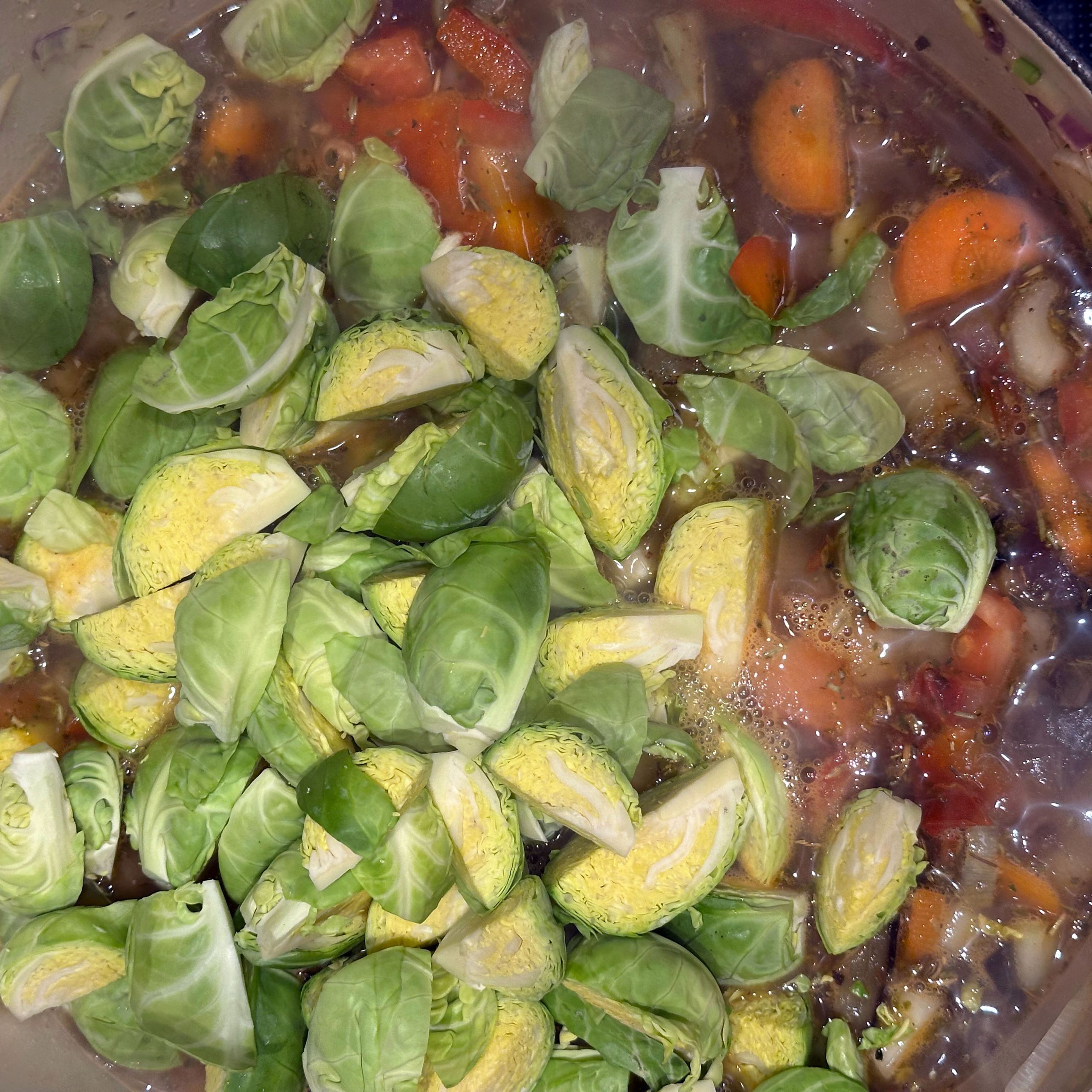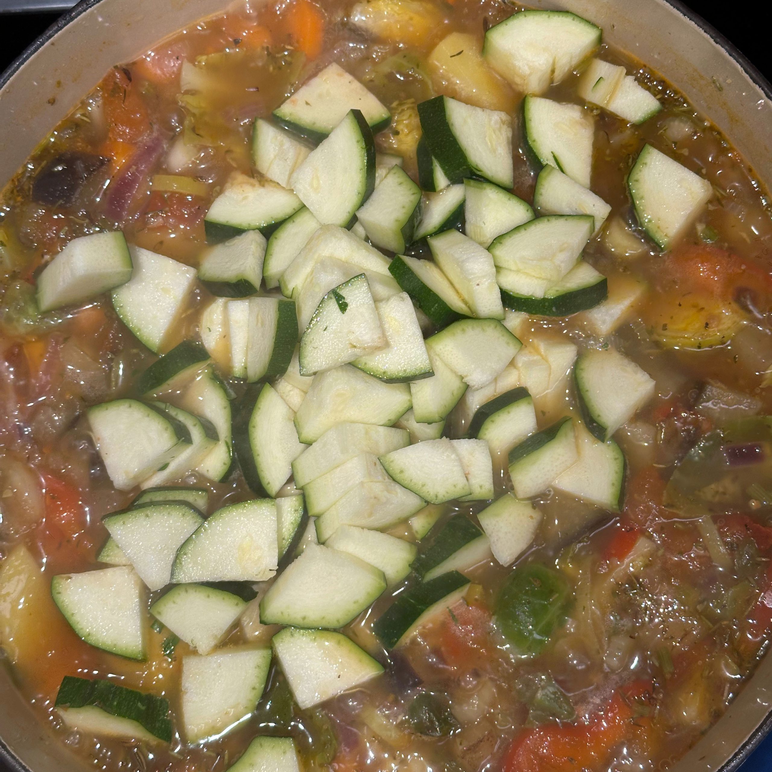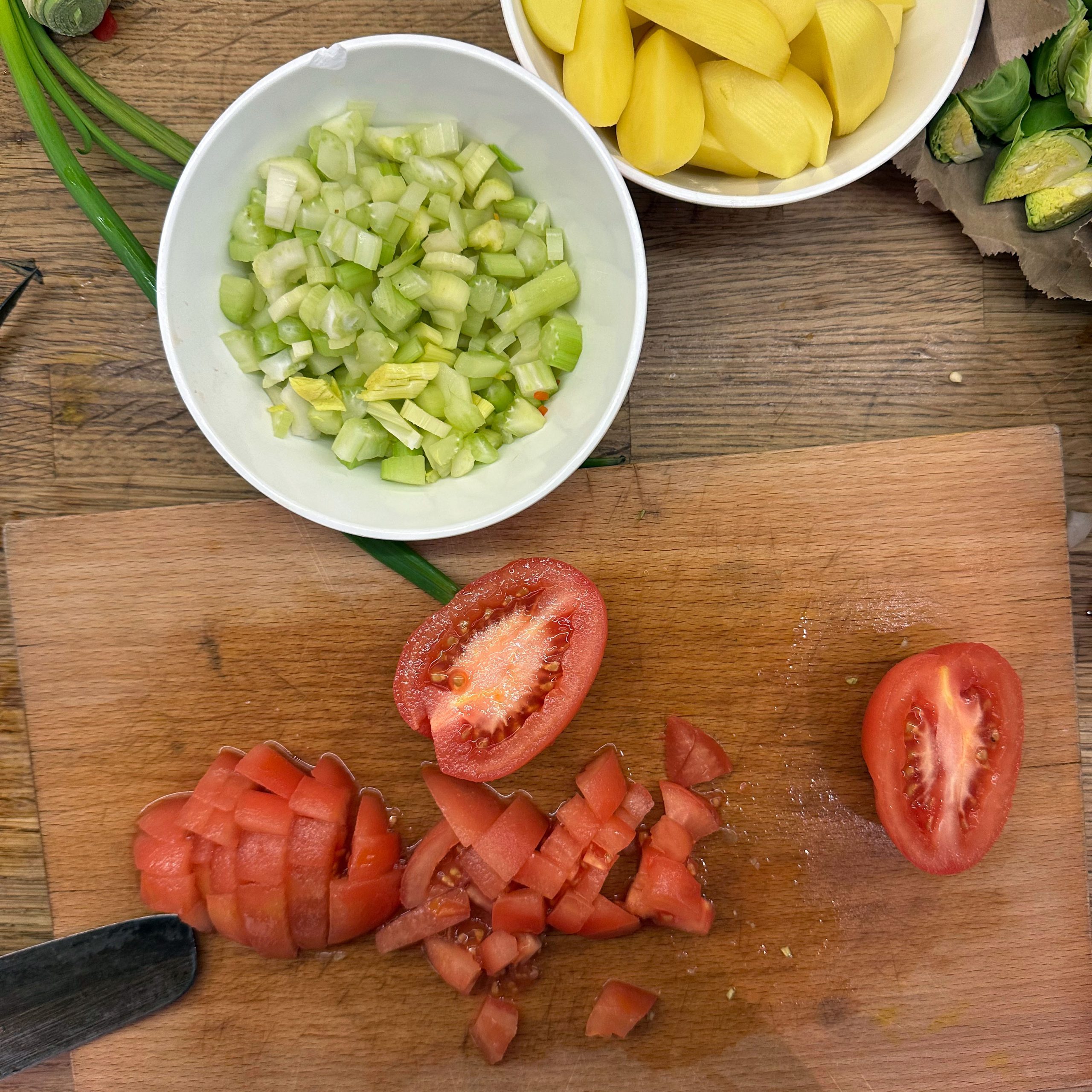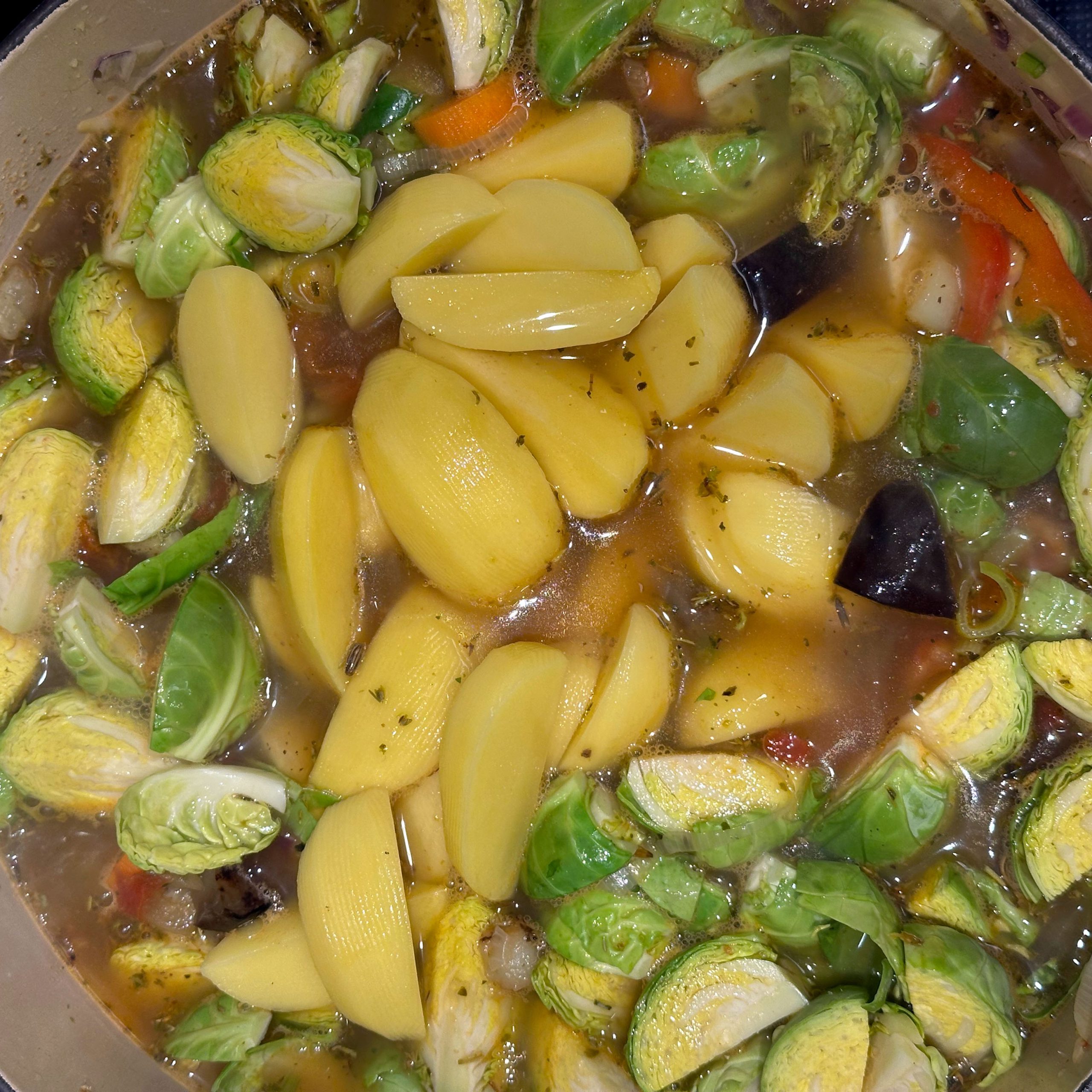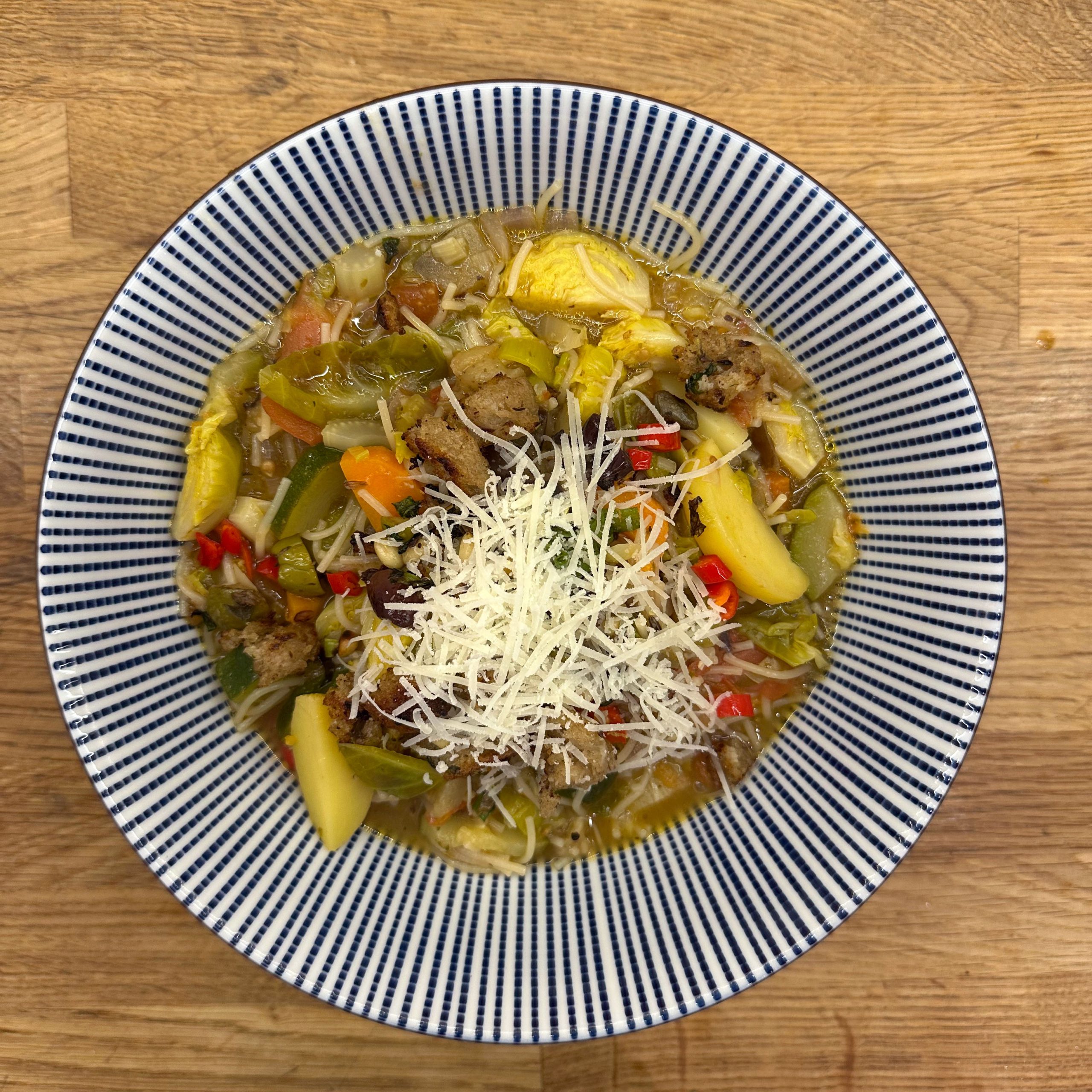 2 Zwiebeln würfeln und in Olivenöl anbraten, 3 Stangen Sellerie in Scheiben hinzufügen und mitbraten, dann 2 Möhren in Halbmonden und 6 kleine Kartoffeln geviertelt unterrühren. Rosenkohl putzen, vierteln. 3 Tomaten mit kochendem Wasser übergießen, häuten, würfeln und mit 5 kleingeschnittenen getrockneten Tomaten zugeben, mit 100ml Weißwein ablöschen und getrocknete Kräuter, Thymian, Fenchelsamen, 0,5 Lauchstange in Scheiben und 2 Lorbeerblätter einrühren. Mit 700ml Brühe auffüllen, Rosenkohl zusammen mit vorher kräftig gebratenen Auberginenwürfeln zugeben, Saft von 1 Zitrone einrühren und mit geschlossenem Deckel 12min köcheln lassen. 1 Zucchini würfeln, zugeben und 10min weiterköcheln lassen. In der Zwischenzeit 2 dicke Scheiben Sauerteigbrot ohne Rinde kleinzupfen und in einer Pfanne mit 4EL Olivenöl braun braten, Kapern und 4 Stängel gehackten Schnittlauch zugeben, 0,5 Zitrone abreiben und den Abrieb unterrühren, 30gr kleingeschnittene gemischte Oliven und 3EL Pinienkerne zugeben, salzen, kurz weiterbraten und als Topping beiseitestellen. 100gr kleine Pastanudeln am Ende in die Minestrone geben und 4min ziehen lassen, bis sie weich sind. Minestrone in Schüsseln füllen, mit dem Brot-Oliven-Topping bestreuen und mit saurer Sahne, Parmesan und gehackter roter Chili servieren.