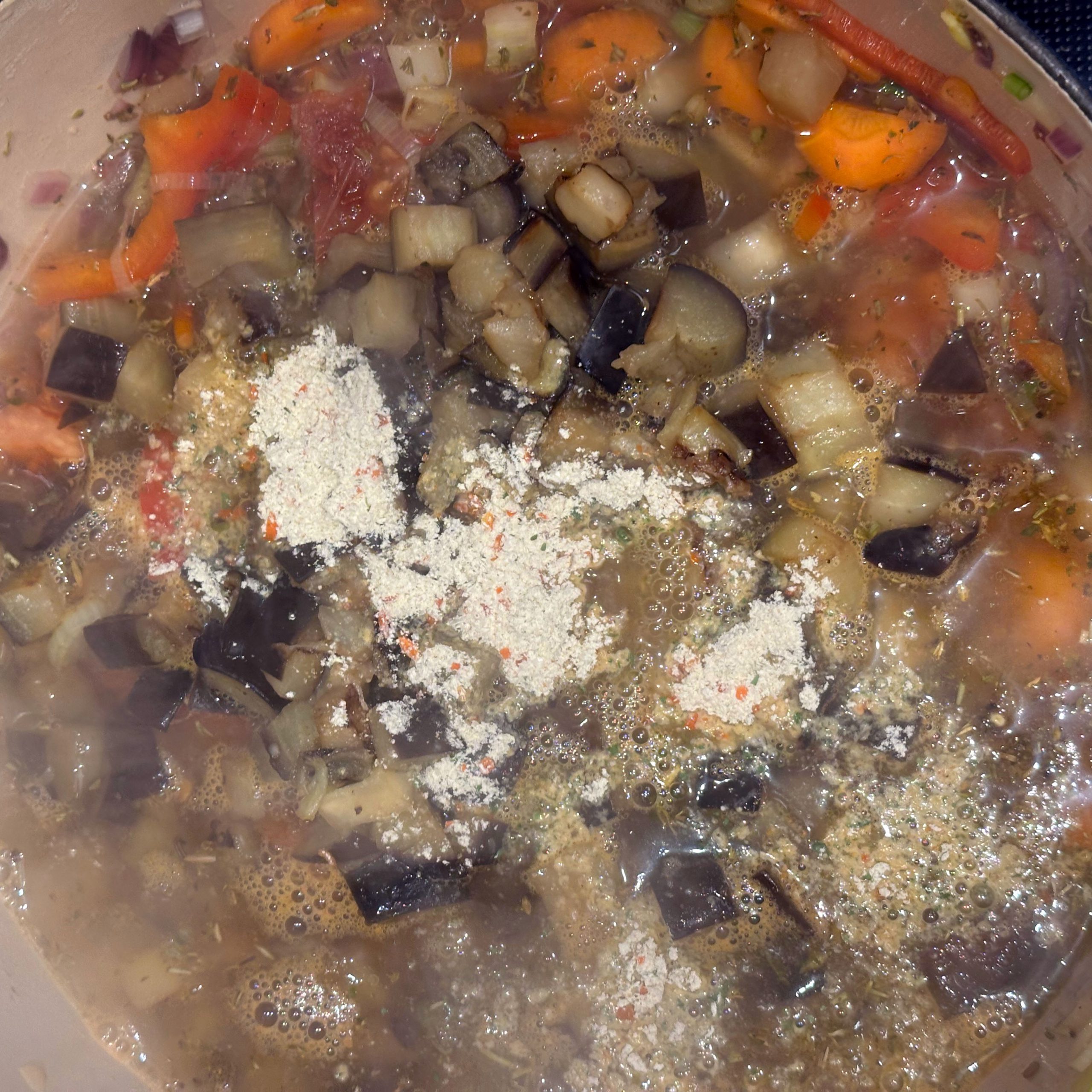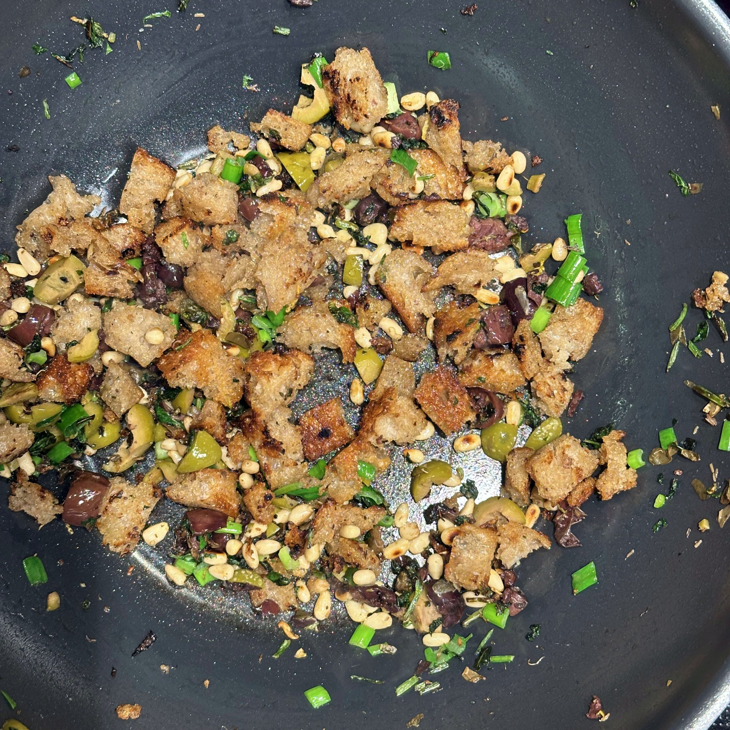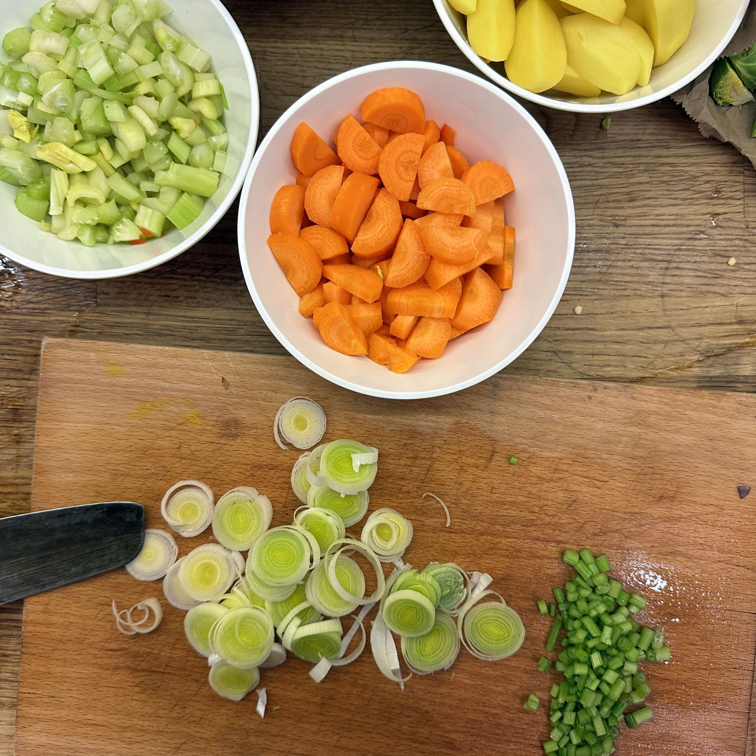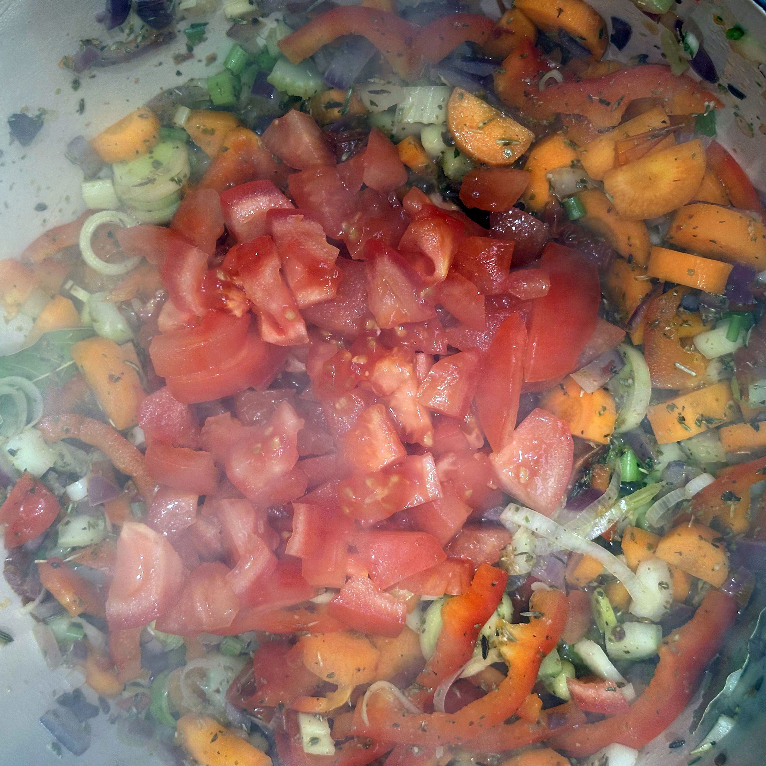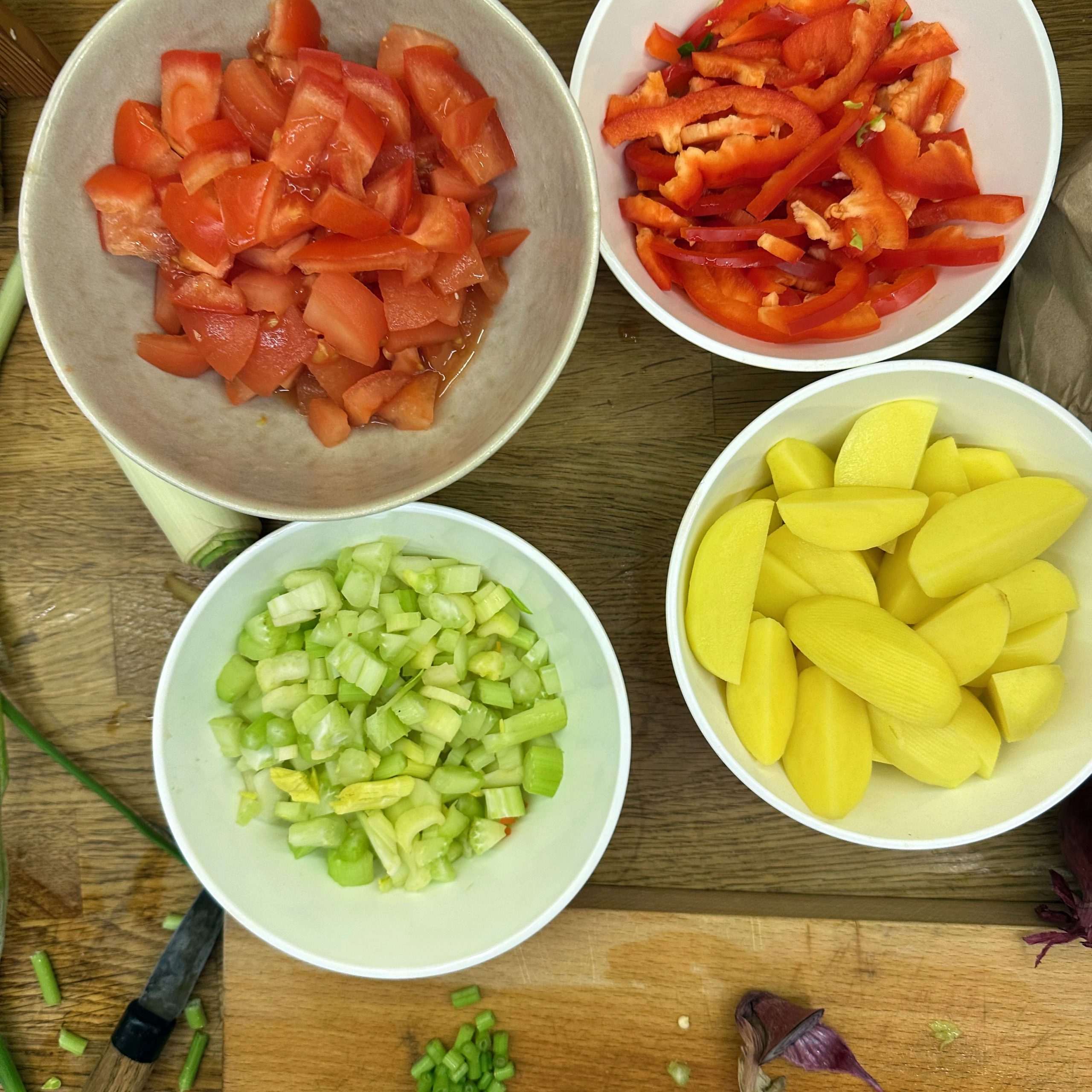 2 Zwiebeln würfeln und in Olivenöl anbraten, 3 Stangen Sellerie in Scheiben hinzufügen und mitbraten, dann 2 Möhren in Halbmonden und 6 kleine Kartoffeln geviertelt unterrühren. Rosenkohl putzen, vierteln. 3 Tomaten mit kochendem Wasser übergießen, häuten, würfeln und mit 5 kleingeschnittenen getrockneten Tomaten zugeben, mit 100ml Weißwein ablöschen und getrocknete Kräuter, Thymian, Fenchelsamen, 0,5 Lauchstange in Scheiben und 2 Lorbeerblätter einrühren. Mit 700ml Brühe auffüllen, Rosenkohl zusammen mit vorher kräftig gebratenen Auberginenwürfeln zugeben, Saft von 1 Zitrone einrühren und mit geschlossenem Deckel 12min köcheln lassen. 1 Zucchini würfeln, zugeben und 10min weiterköcheln lassen. In der Zwischenzeit 2 dicke Scheiben Sauerteigbrot ohne Rinde kleinzupfen und in einer Pfanne mit 4EL Olivenöl braun braten, Kapern und 4 Stängel gehackten Schnittlauch zugeben, 0,5 Zitrone abreiben und den Abrieb unterrühren, 30gr kleingeschnittene gemischte Oliven und 3EL Pinienkerne zugeben, salzen, kurz weiterbraten und als Topping beiseitestellen. 100gr kleine Pastanudeln am Ende in die Minestrone geben und 4min ziehen lassen, bis sie weich sind. Minestrone in Schüsseln füllen, mit dem Brot-Oliven-Topping bestreuen und mit saurer Sahne, Parmesan und gehackter roter Chili servieren.