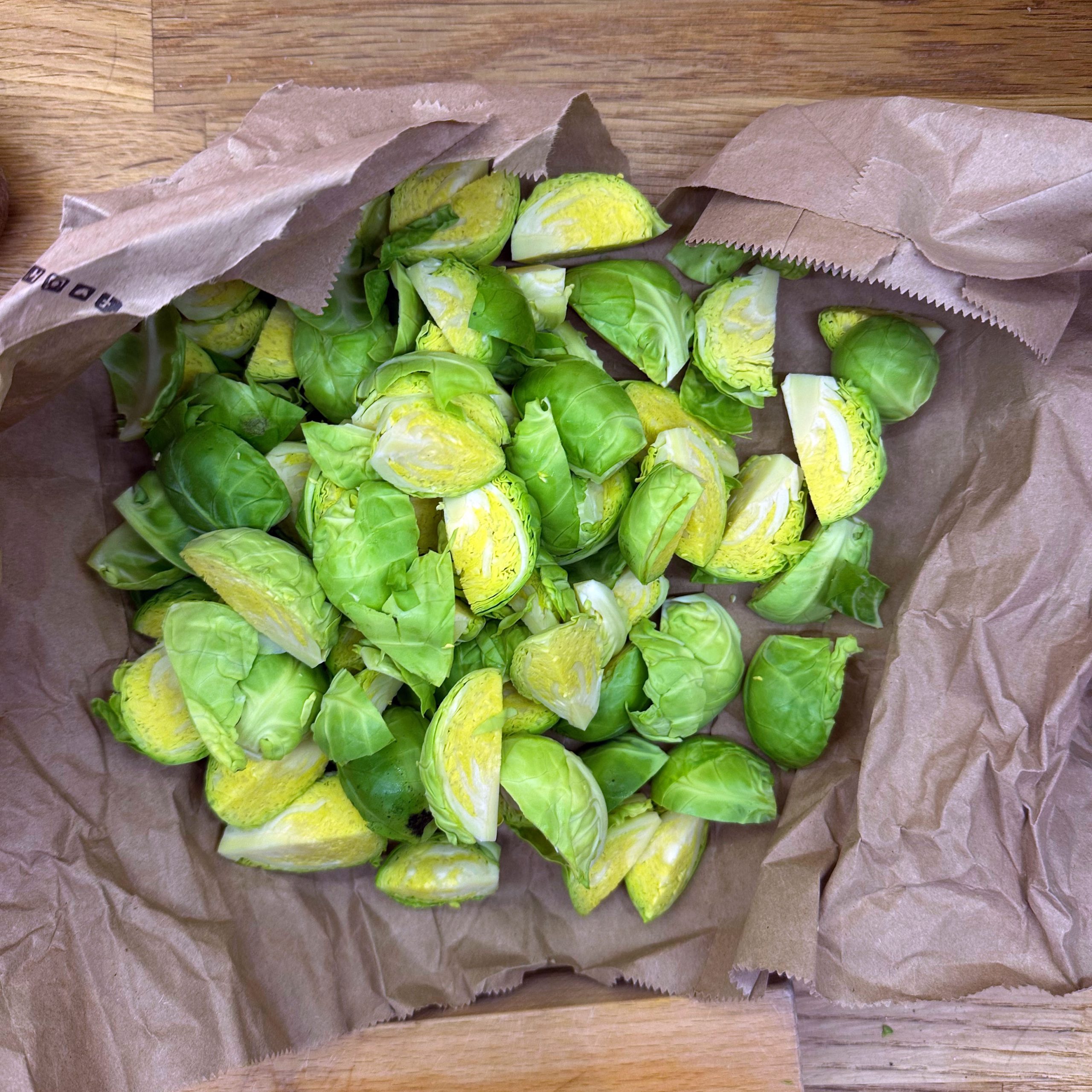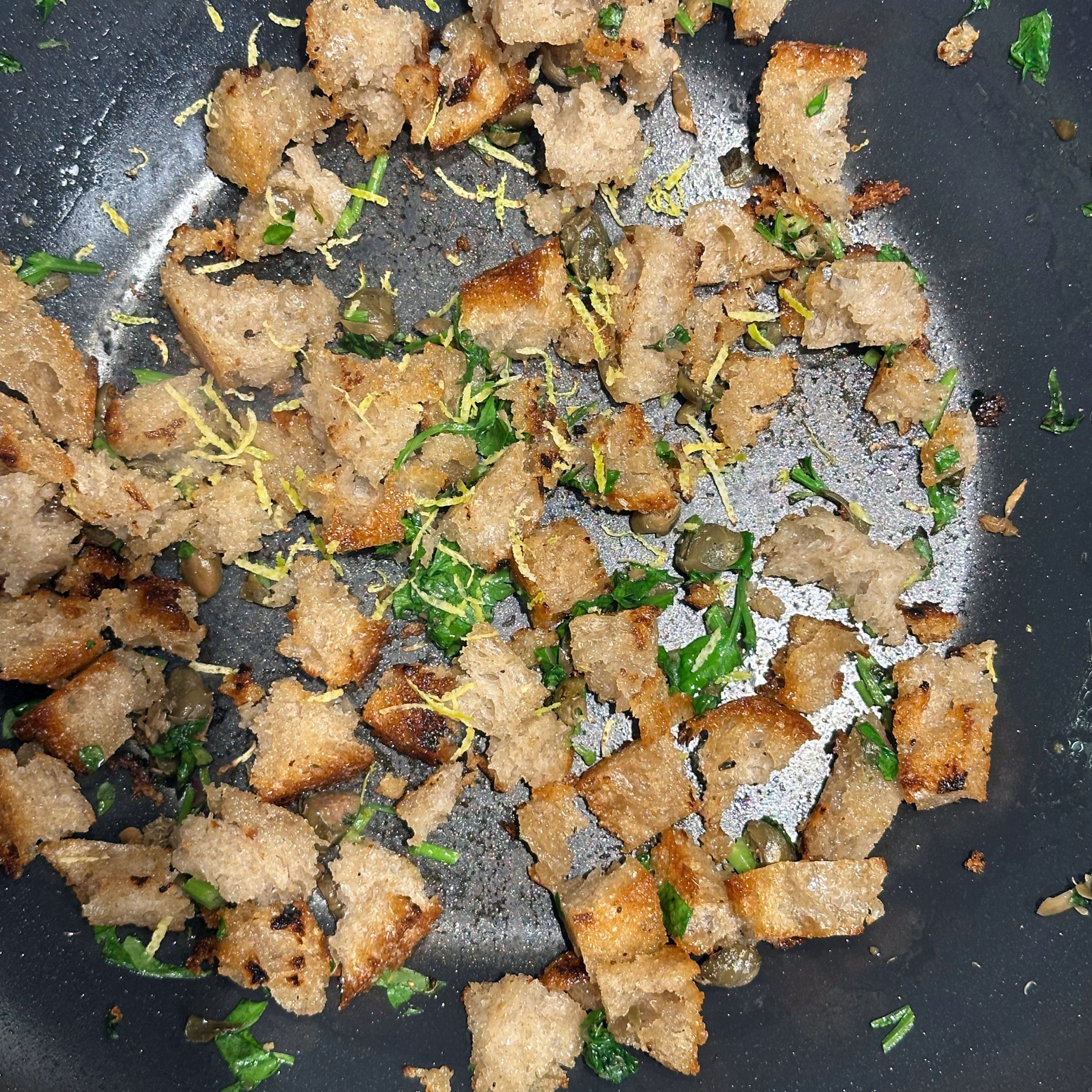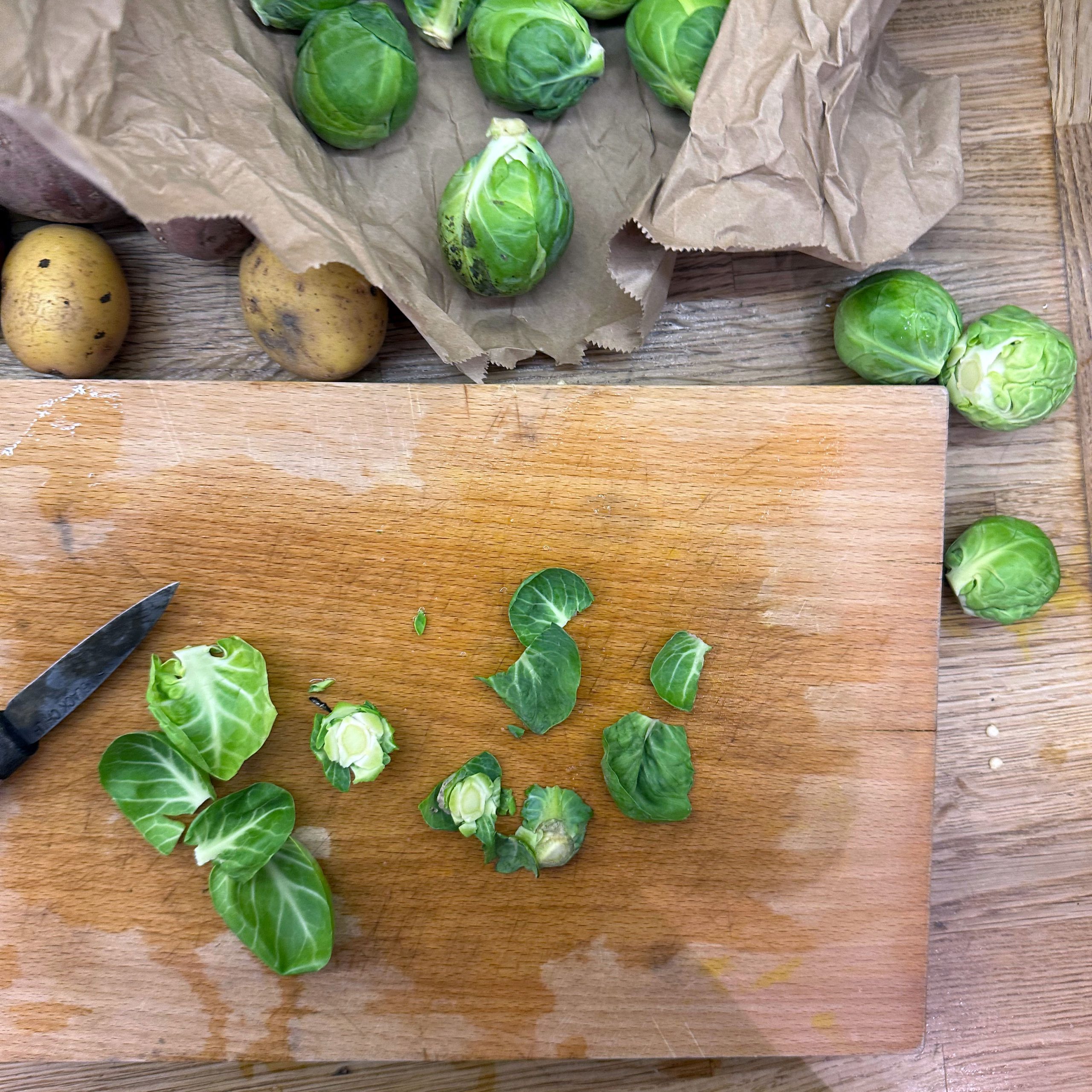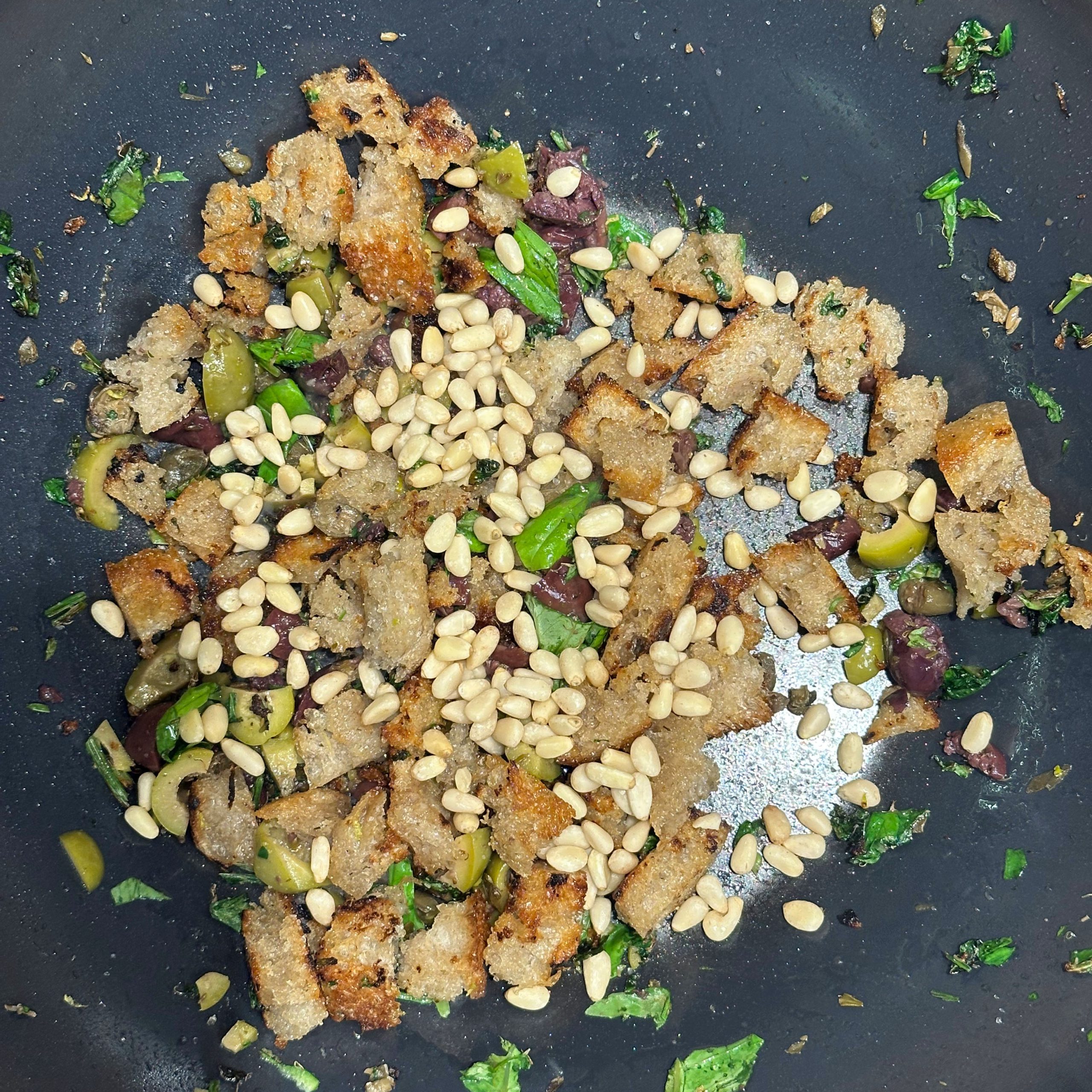 2 Zwiebeln würfeln und in Olivenöl anbraten, 3 Stangen Sellerie in Scheiben hinzufügen und mitbraten, dann 2 Möhren in Halbmonden und 6 kleine Kartoffeln geviertelt unterrühren. Rosenkohl putzen, vierteln. 3 Tomaten mit kochendem Wasser übergießen, häuten, würfeln und mit 5 kleingeschnittenen getrockneten Tomaten zugeben, mit 100ml Weißwein ablöschen und getrocknete Kräuter, Thymian, Fenchelsamen, 0,5 Lauchstange in Scheiben und 2 Lorbeerblätter einrühren. Mit 700ml Brühe auffüllen, Rosenkohl zusammen mit vorher kräftig gebratenen Auberginenwürfeln zugeben, Saft von 1 Zitrone einrühren und mit geschlossenem Deckel 12min köcheln lassen. 1 Zucchini würfeln, zugeben und 10min weiterköcheln lassen. In der Zwischenzeit 2 dicke Scheiben Sauerteigbrot ohne Rinde kleinzupfen und in einer Pfanne mit 4EL Olivenöl braun braten, Kapern und 4 Stängel gehackten Schnittlauch zugeben, 0,5 Zitrone abreiben und den Abrieb unterrühren, 30gr kleingeschnittene gemischte Oliven und 3EL Pinienkerne zugeben, salzen, kurz weiterbraten und als Topping beiseitestellen. 100gr kleine Pastanudeln am Ende in die Minestrone geben und 4min ziehen lassen, bis sie weich sind. Minestrone in Schüsseln füllen, mit dem Brot-Oliven-Topping bestreuen und mit saurer Sahne, Parmesan und gehackter roter Chili servieren.