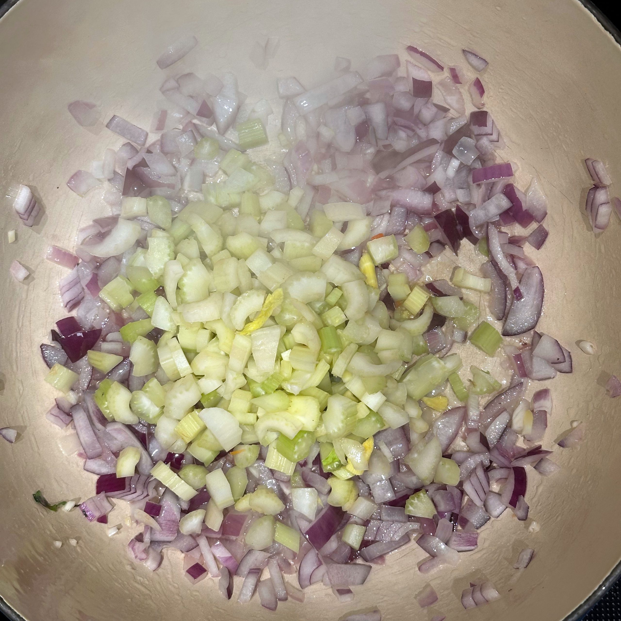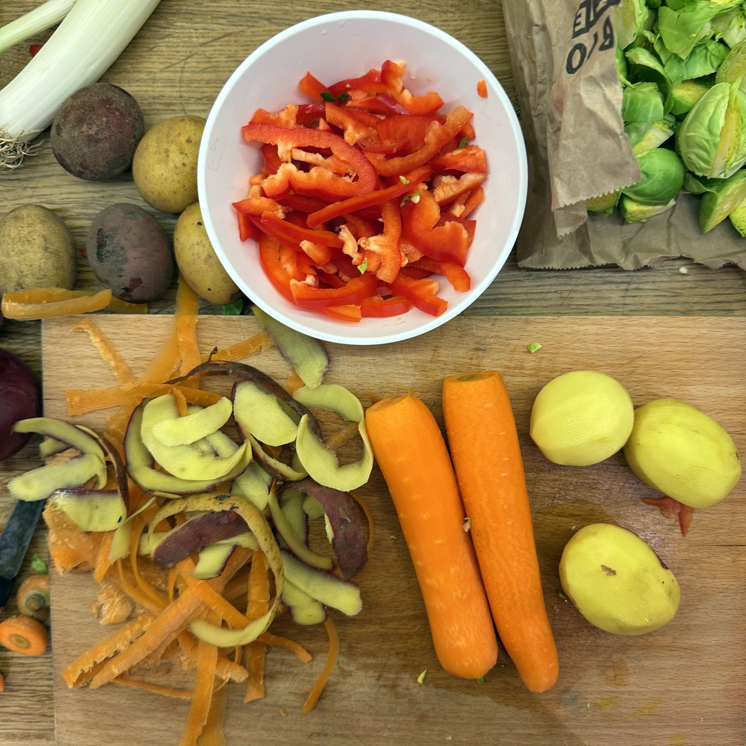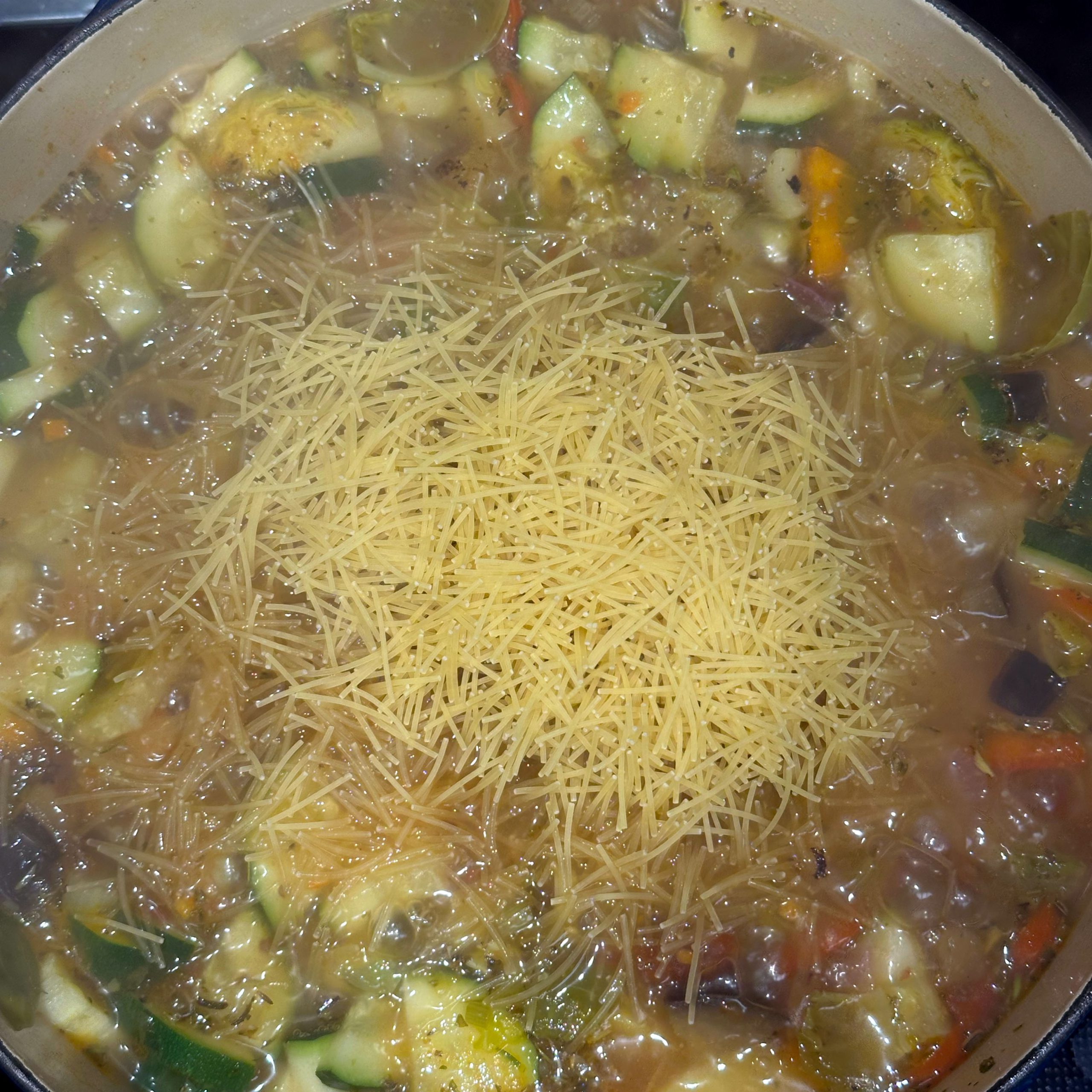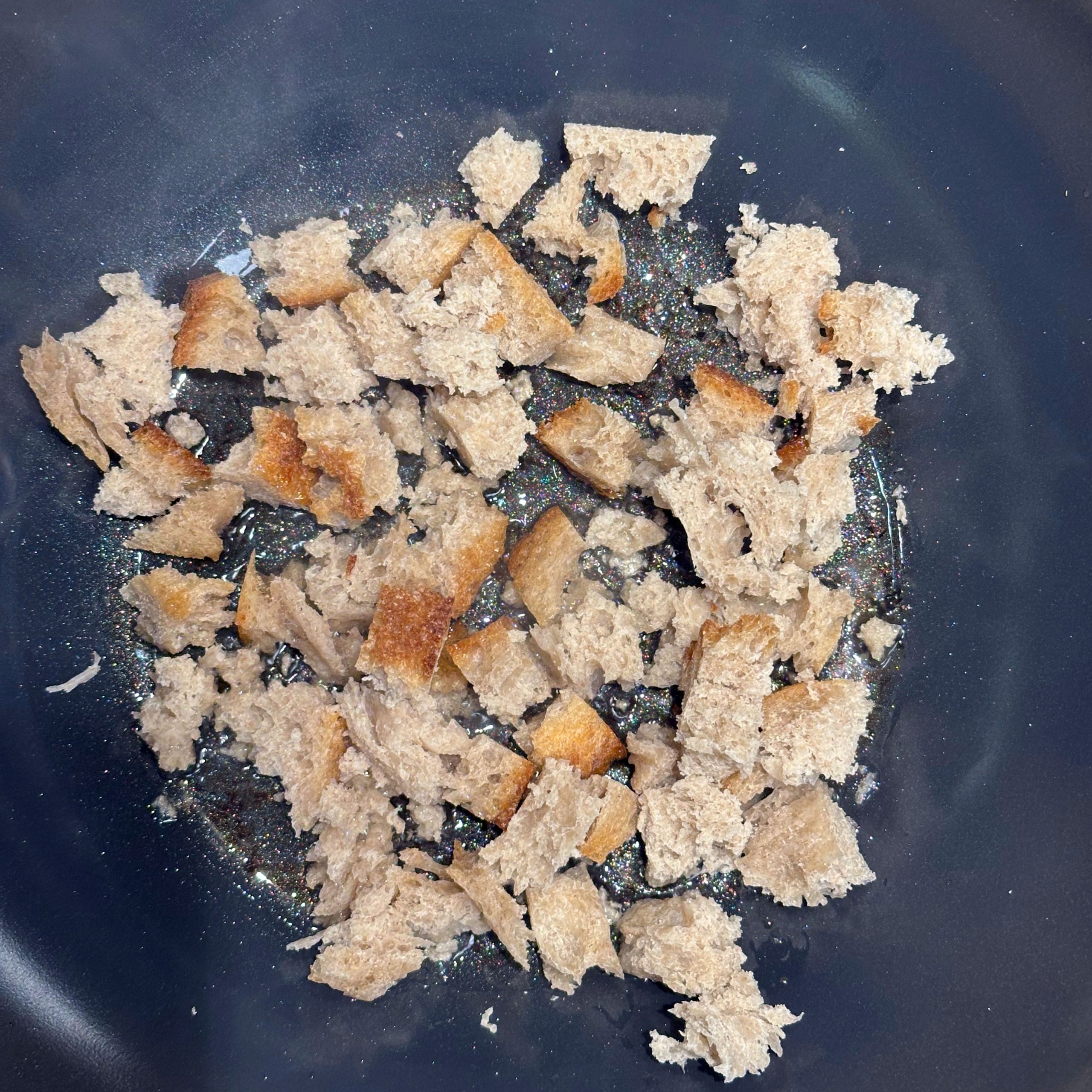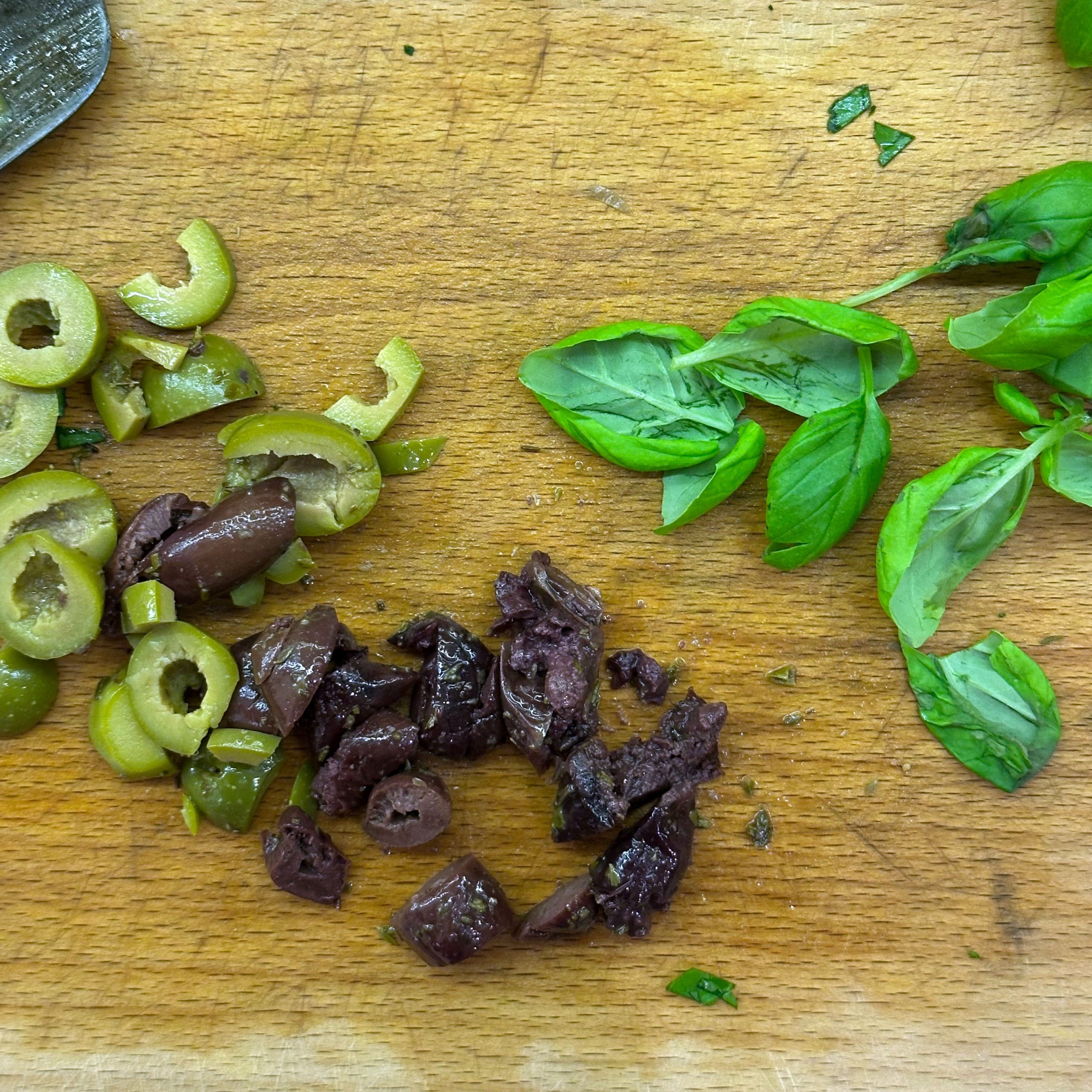 2 Zwiebeln würfeln und in Olivenöl anbraten, 3 Stangen Sellerie in Scheiben hinzufügen und mitbraten, dann 2 Möhren in Halbmonden und 6 kleine Kartoffeln geviertelt unterrühren. Rosenkohl putzen, vierteln. 3 Tomaten mit kochendem Wasser übergießen, häuten, würfeln und mit 5 kleingeschnittenen getrockneten Tomaten zugeben, mit 100ml Weißwein ablöschen und getrocknete Kräuter, Thymian, Fenchelsamen, 0,5 Lauchstange in Scheiben und 2 Lorbeerblätter einrühren. Mit 700ml Brühe auffüllen, Rosenkohl zusammen mit vorher kräftig gebratenen Auberginenwürfeln zugeben, Saft von 1 Zitrone einrühren und mit geschlossenem Deckel 12min köcheln lassen. 1 Zucchini würfeln, zugeben und 10min weiterköcheln lassen. In der Zwischenzeit 2 dicke Scheiben Sauerteigbrot ohne Rinde kleinzupfen und in einer Pfanne mit 4EL Olivenöl braun braten, Kapern und 4 Stängel gehackten Schnittlauch zugeben, 0,5 Zitrone abreiben und den Abrieb unterrühren, 30gr kleingeschnittene gemischte Oliven und 3EL Pinienkerne zugeben, salzen, kurz weiterbraten und als Topping beiseitestellen. 100gr kleine Pastanudeln am Ende in die Minestrone geben und 4min ziehen lassen, bis sie weich sind. Minestrone in Schüsseln füllen, mit dem Brot-Oliven-Topping bestreuen und mit saurer Sahne, Parmesan und gehackter roter Chili servieren.