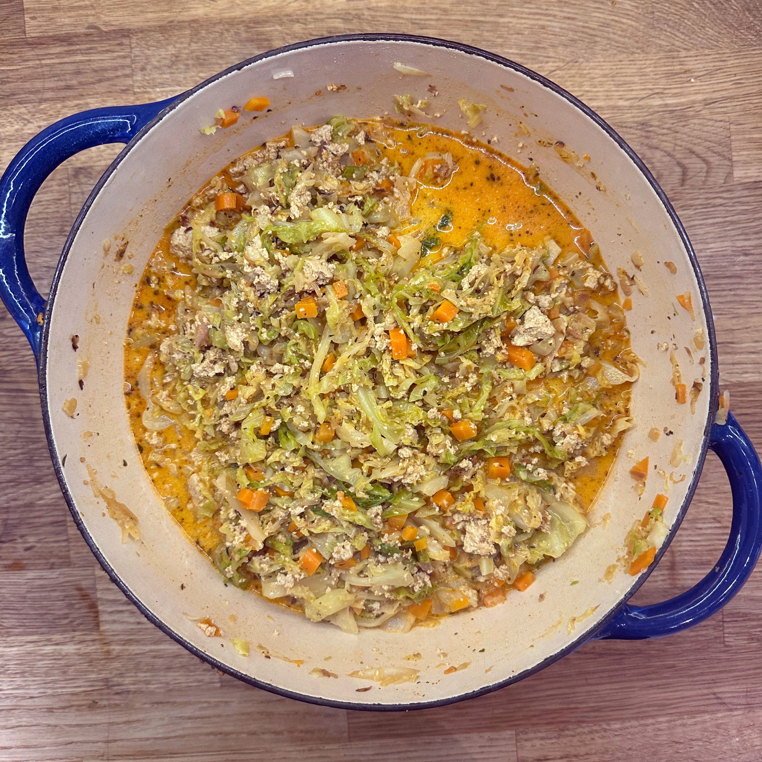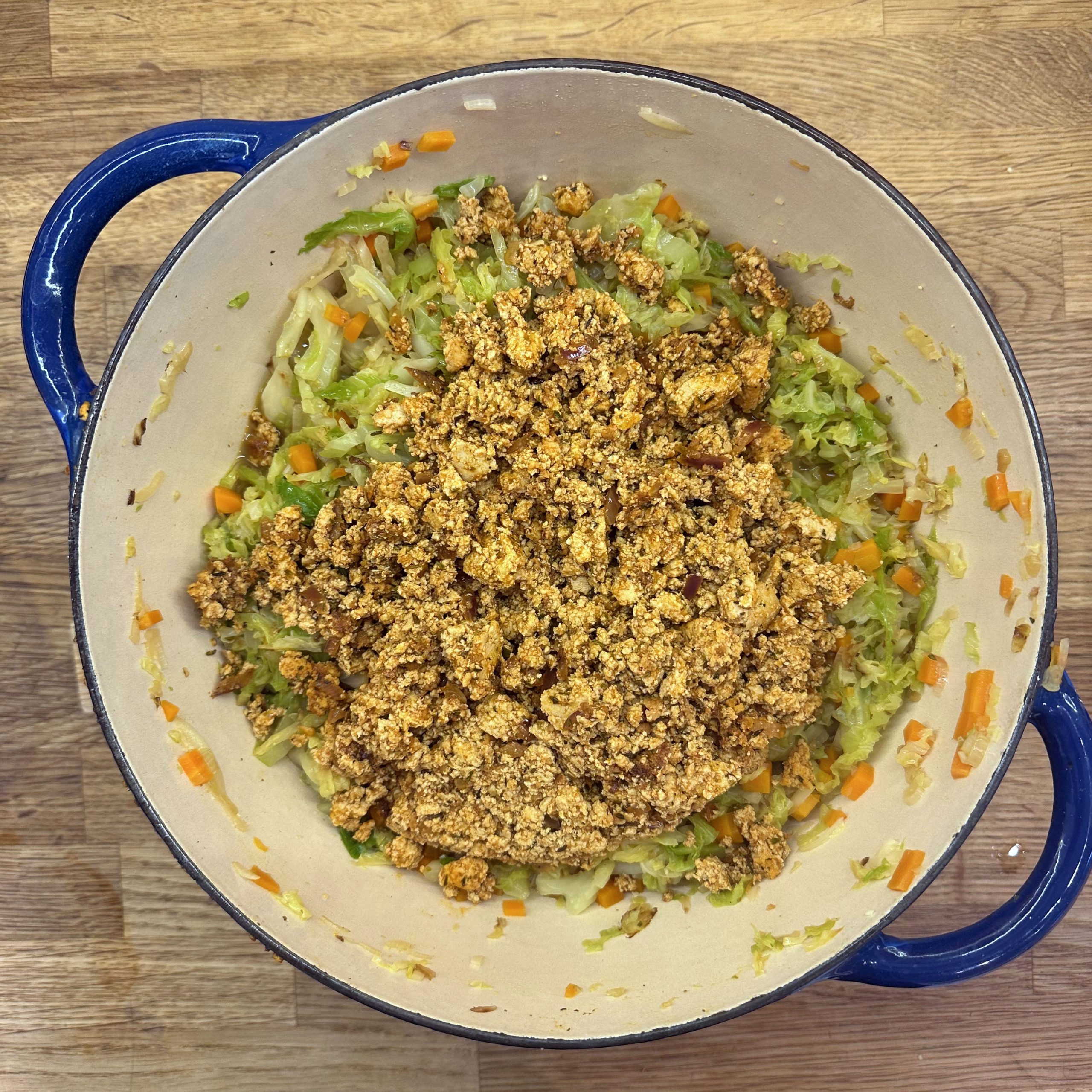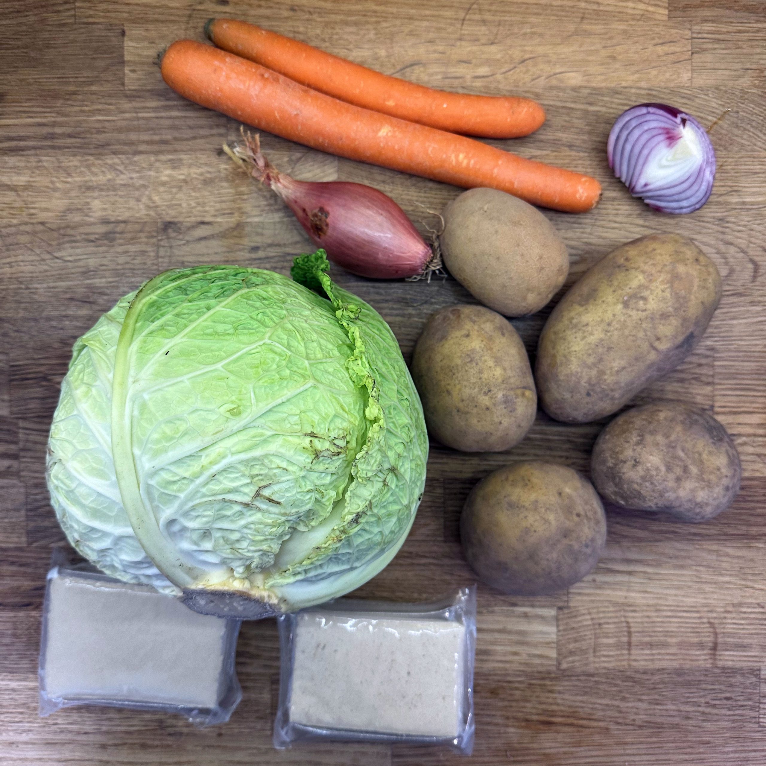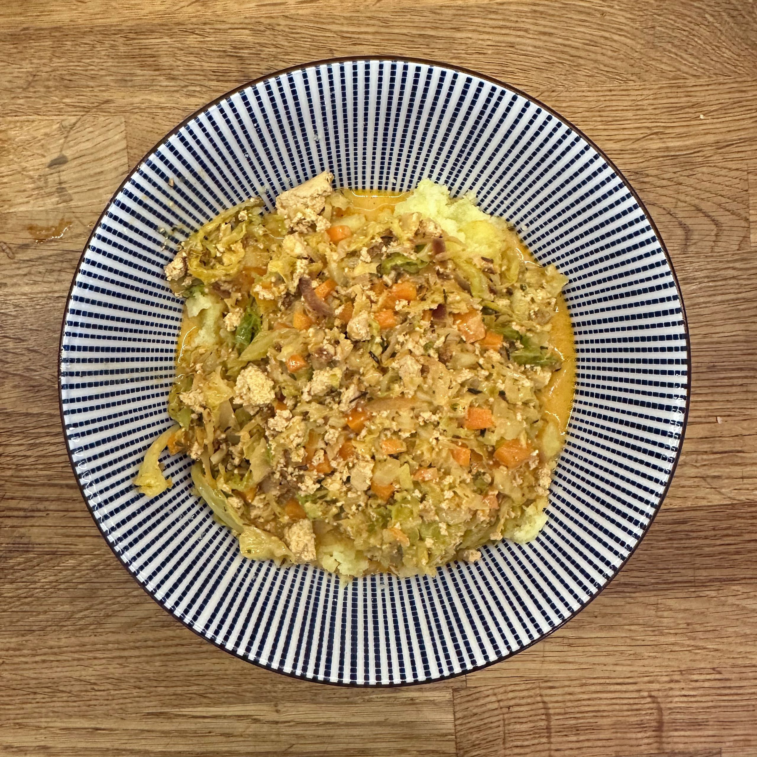 Die äußeren Wirsingblätter vom Strunk lösen, soweit möglich, den restlichen Wirsing in kleine Streifen schneiden. Die ganzen Blätter in kochendem Salzwasser blanchieren und abtropfen lassen. In dem gleichen Kochwasser 800g mehligkochende, geschälte und geviertelte Kartoffeln 20 Minuten garen. 400g Tofu zerbröseln und in Öl bei starker Hitze 10 Minuten braten, dabei gut umrühren, dann mit 80ml Brühe ablöschen und 2 EL Tomatenmark unterrühren. Mit getrockneten Kräutern, Sojasoße und geräuchertem Paprikapulver abschmecken und beiseite stellen. Im gleichen Topf 2 kleingeschnittene Zwiebeln und den gehackten Restwirsing anbraten, 2 gewürfelte Möhren hinzufügen. Die abgetropften Wirsingblätter in Streifen schneiden und mit ein paar Kümmelkörnern und 200ml Brühe zu dem Gemüse geben. Mit geschlossenem Deckel 10min köcheln lassen. Das vegane Hack unterrühren, mit Salz und Zitronensaft abschmecken und 1 Becher Sahne unterrühren, kurz erhitzen. Den Eintopf mit den gekochten Kartoffeln servieren.