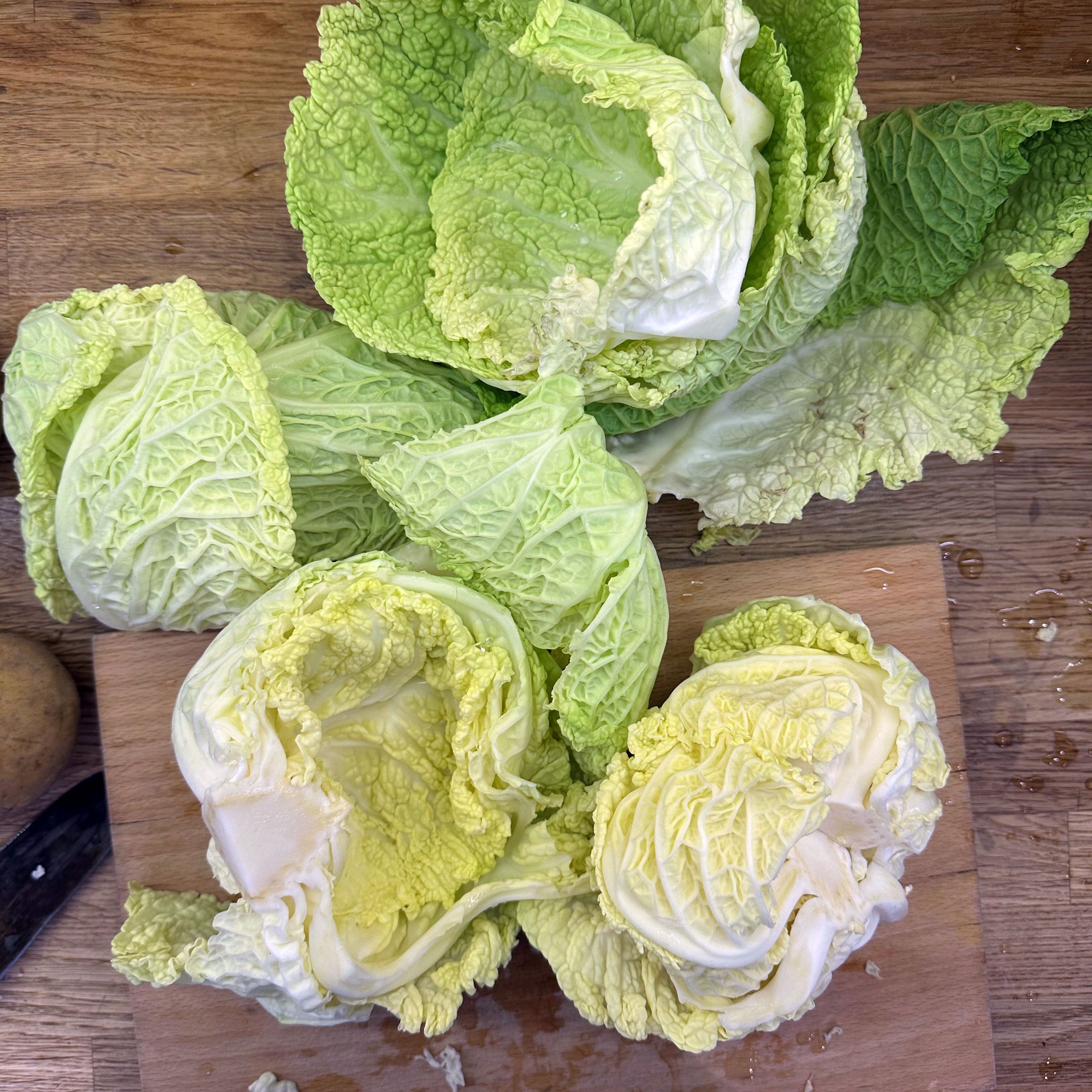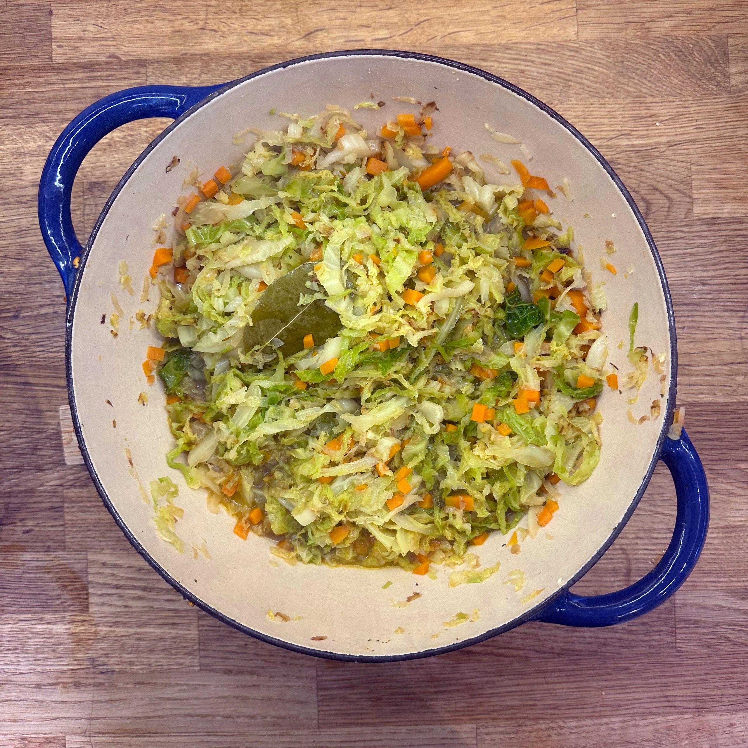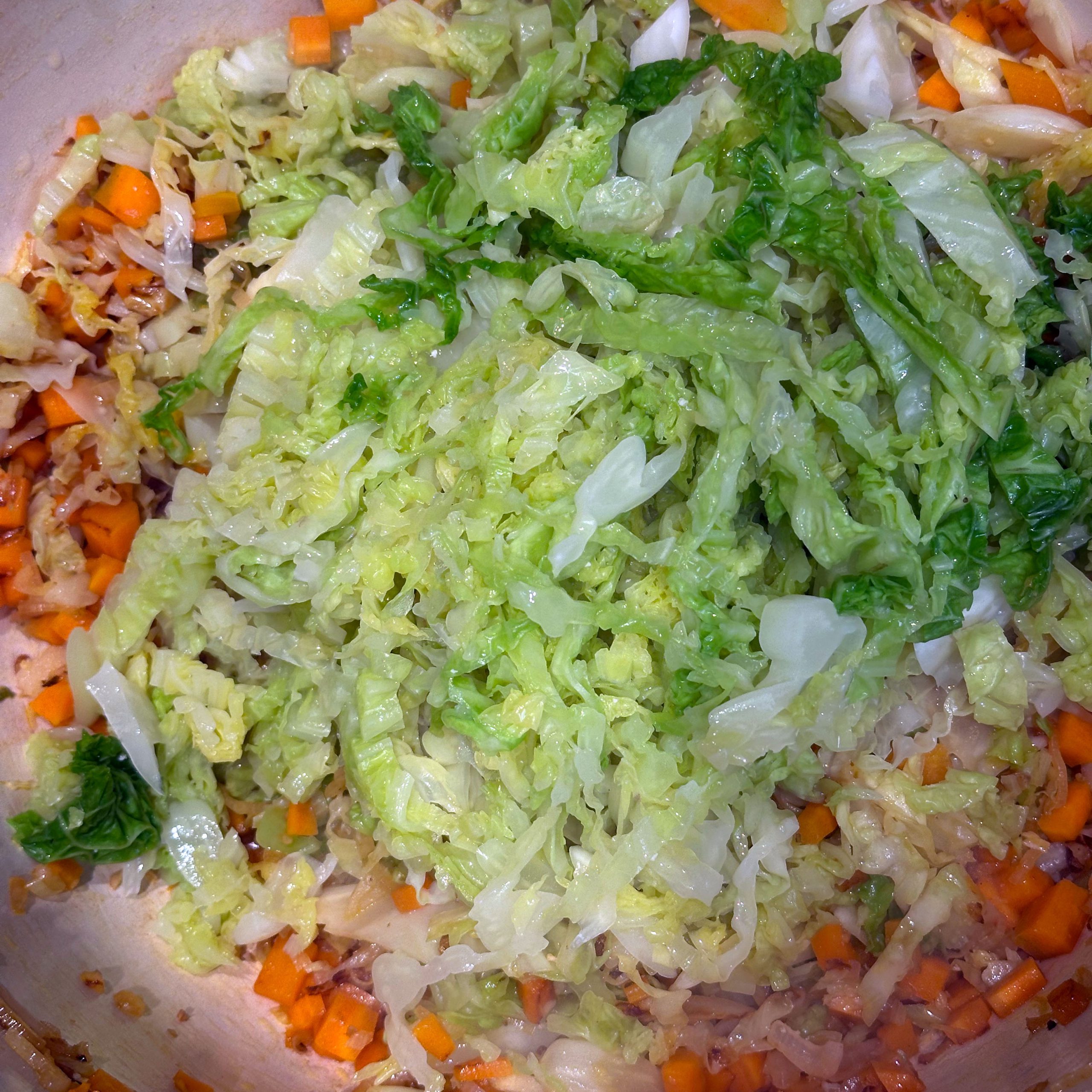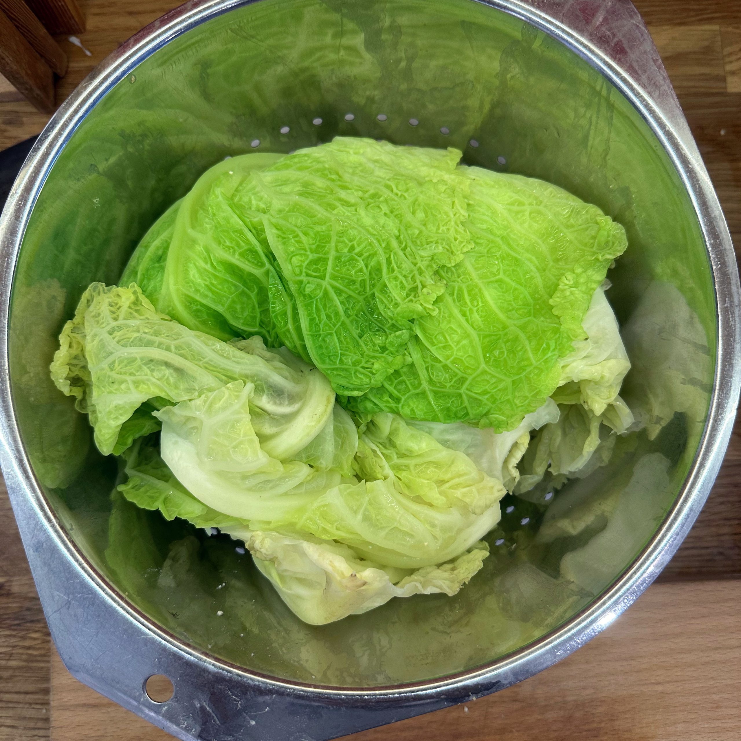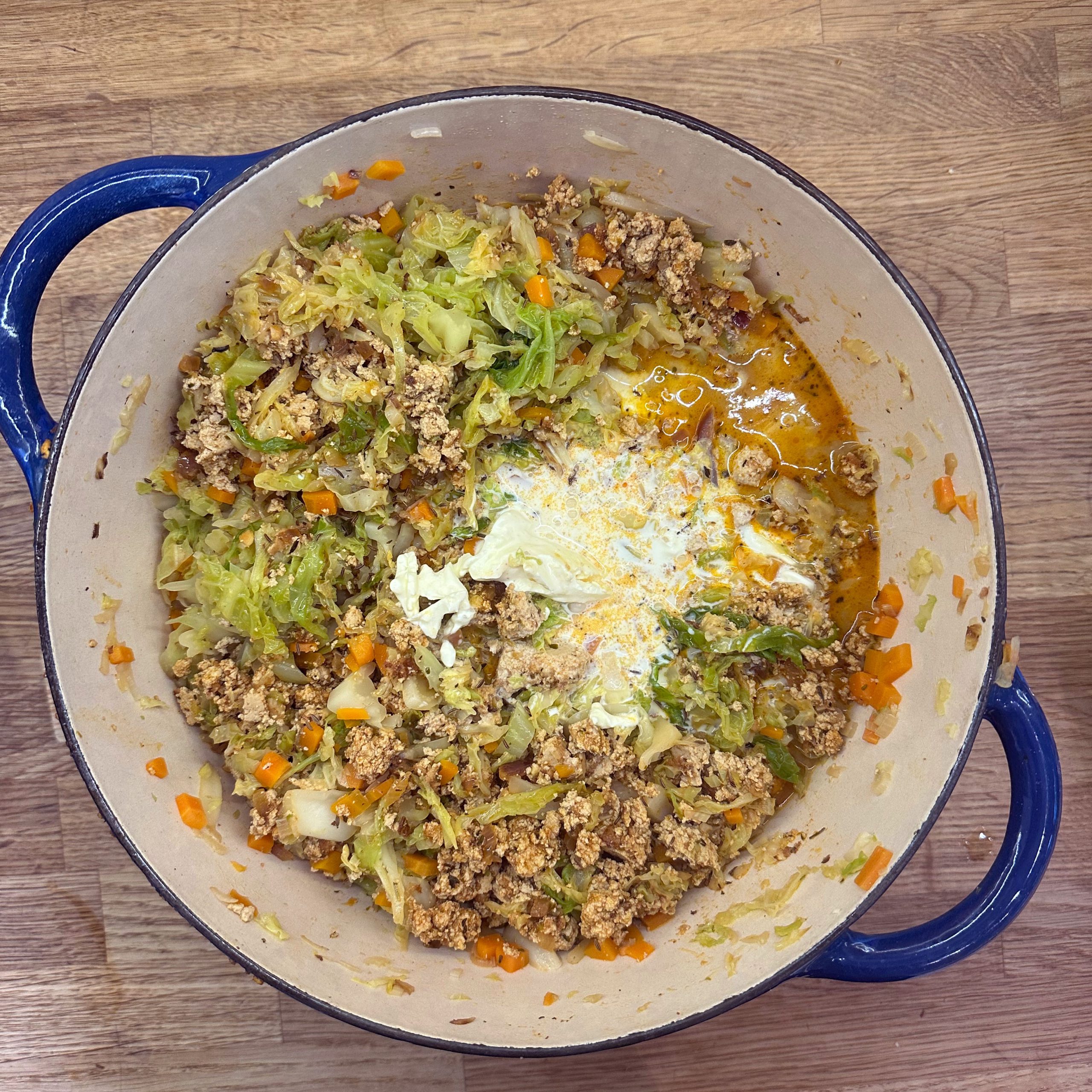 Die äußeren Wirsingblätter vom Strunk lösen, soweit möglich, den restlichen Wirsing in kleine Streifen schneiden. Die ganzen Blätter in kochendem Salzwasser blanchieren und abtropfen lassen. In dem gleichen Kochwasser 800g mehligkochende, geschälte und geviertelte Kartoffeln 20 Minuten garen. 400g Tofu zerbröseln und in Öl bei starker Hitze 10 Minuten braten, dabei gut umrühren, dann mit 80ml Brühe ablöschen und 2 EL Tomatenmark unterrühren. Mit getrockneten Kräutern, Sojasoße und geräuchertem Paprikapulver abschmecken und beiseite stellen. Im gleichen Topf 2 kleingeschnittene Zwiebeln und den gehackten Restwirsing anbraten, 2 gewürfelte Möhren hinzufügen. Die abgetropften Wirsingblätter in Streifen schneiden und mit ein paar Kümmelkörnern und 200ml Brühe zu dem Gemüse geben. Mit geschlossenem Deckel 10min köcheln lassen. Das vegane Hack unterrühren, mit Salz und Zitronensaft abschmecken und 1 Becher Sahne unterrühren, kurz erhitzen. Den Eintopf mit den gekochten Kartoffeln servieren.