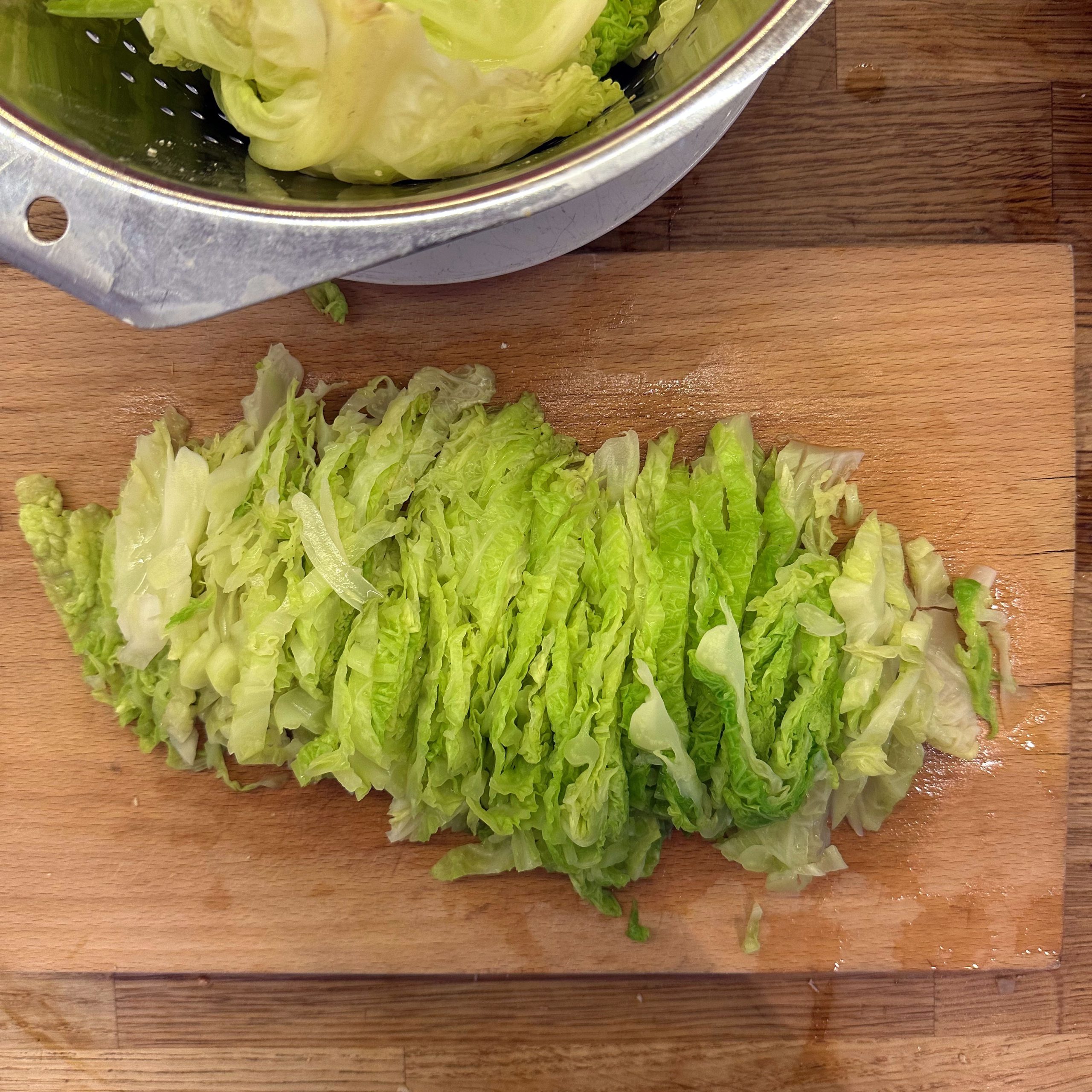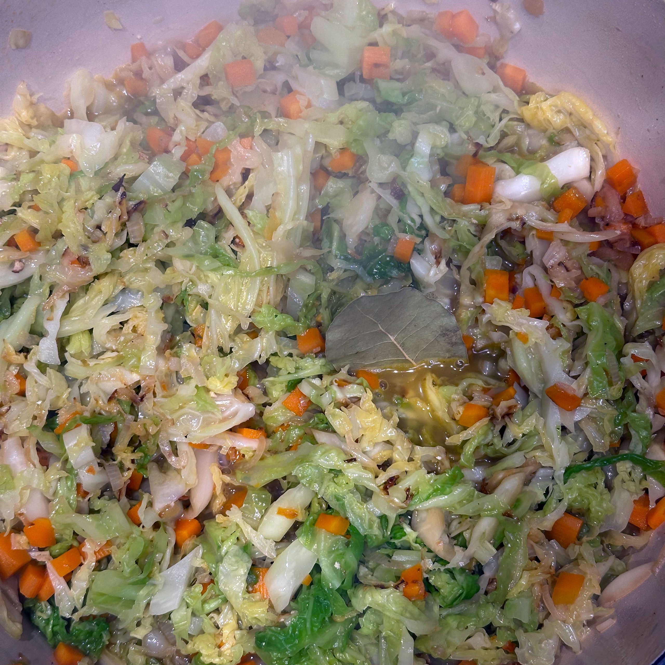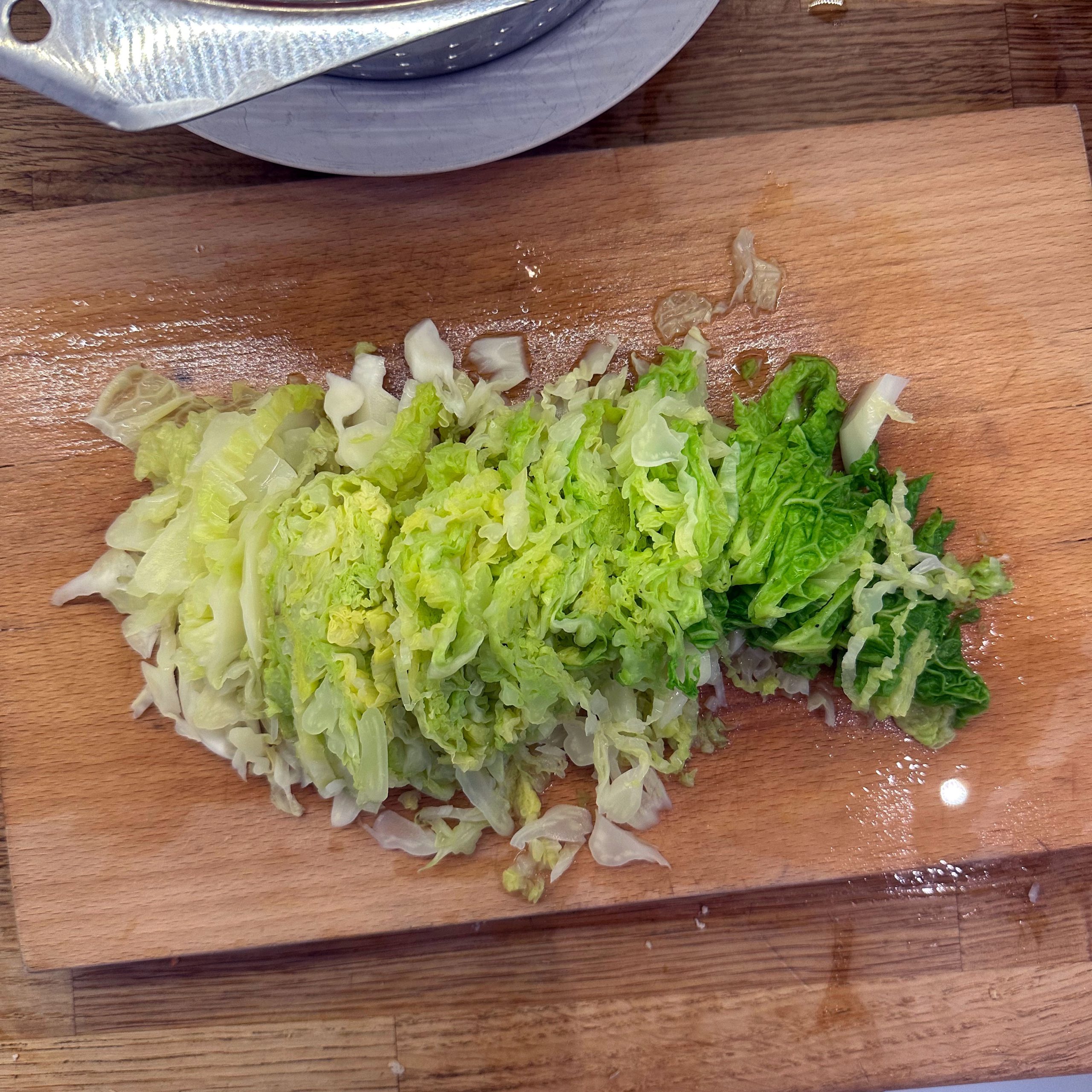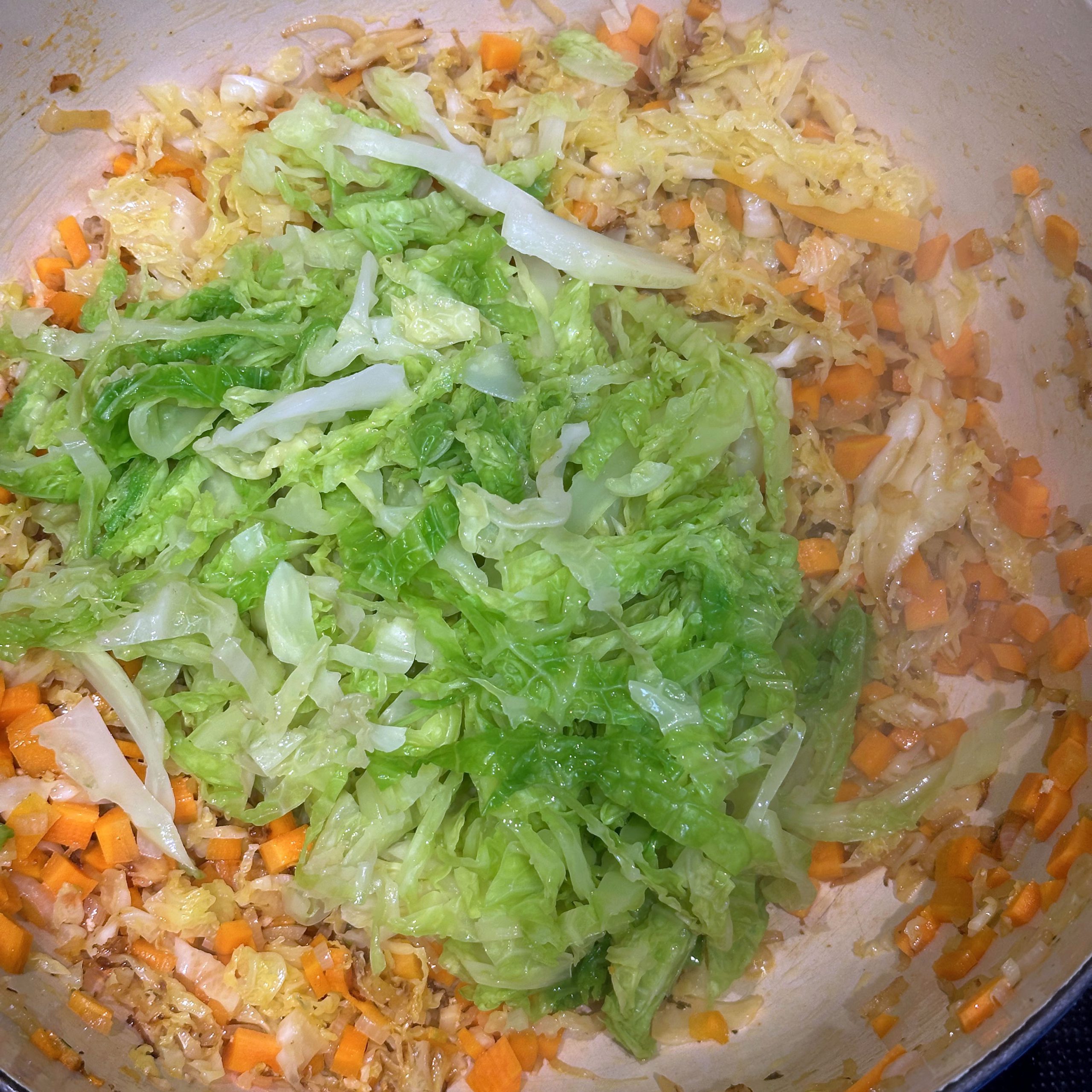 Die äußeren Wirsingblätter vom Strunk lösen, soweit möglich, den restlichen Wirsing in kleine Streifen schneiden. Die ganzen Blätter in kochendem Salzwasser blanchieren und abtropfen lassen. In dem gleichen Kochwasser 800g mehligkochende, geschälte und geviertelte Kartoffeln 20 Minuten garen. 400g Tofu zerbröseln und in Öl bei starker Hitze 10 Minuten braten, dabei gut umrühren, dann mit 80ml Brühe ablöschen und 2 EL Tomatenmark unterrühren. Mit getrockneten Kräutern, Sojasoße und geräuchertem Paprikapulver abschmecken und beiseite stellen. Im gleichen Topf 2 kleingeschnittene Zwiebeln und den gehackten Restwirsing anbraten, 2 gewürfelte Möhren hinzufügen. Die abgetropften Wirsingblätter in Streifen schneiden und mit ein paar Kümmelkörnern und 200ml Brühe zu dem Gemüse geben. Mit geschlossenem Deckel 10min köcheln lassen. Das vegane Hack unterrühren, mit Salz und Zitronensaft abschmecken und 1 Becher Sahne unterrühren, kurz erhitzen. Den Eintopf mit den gekochten Kartoffeln servieren.