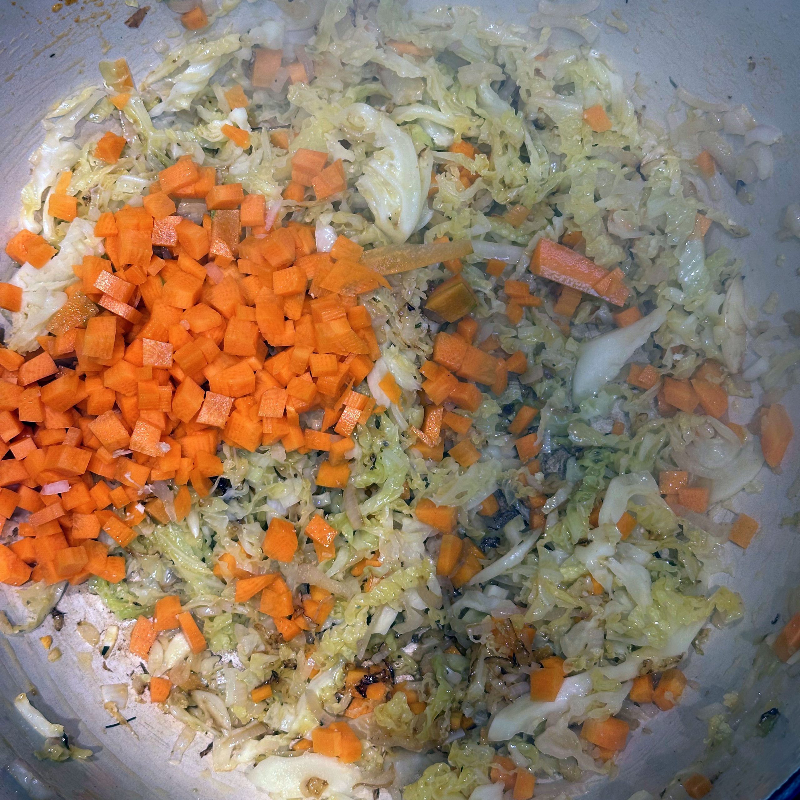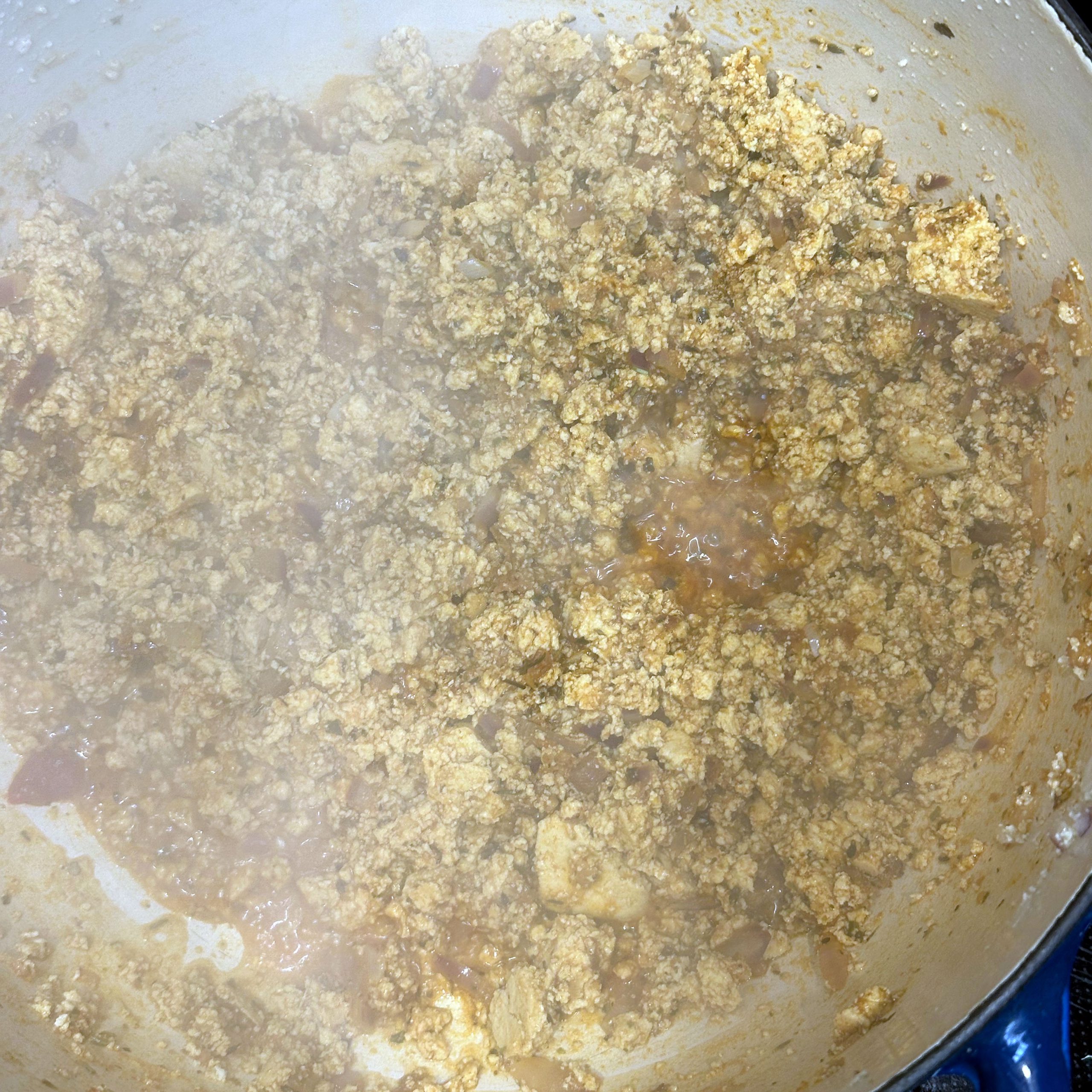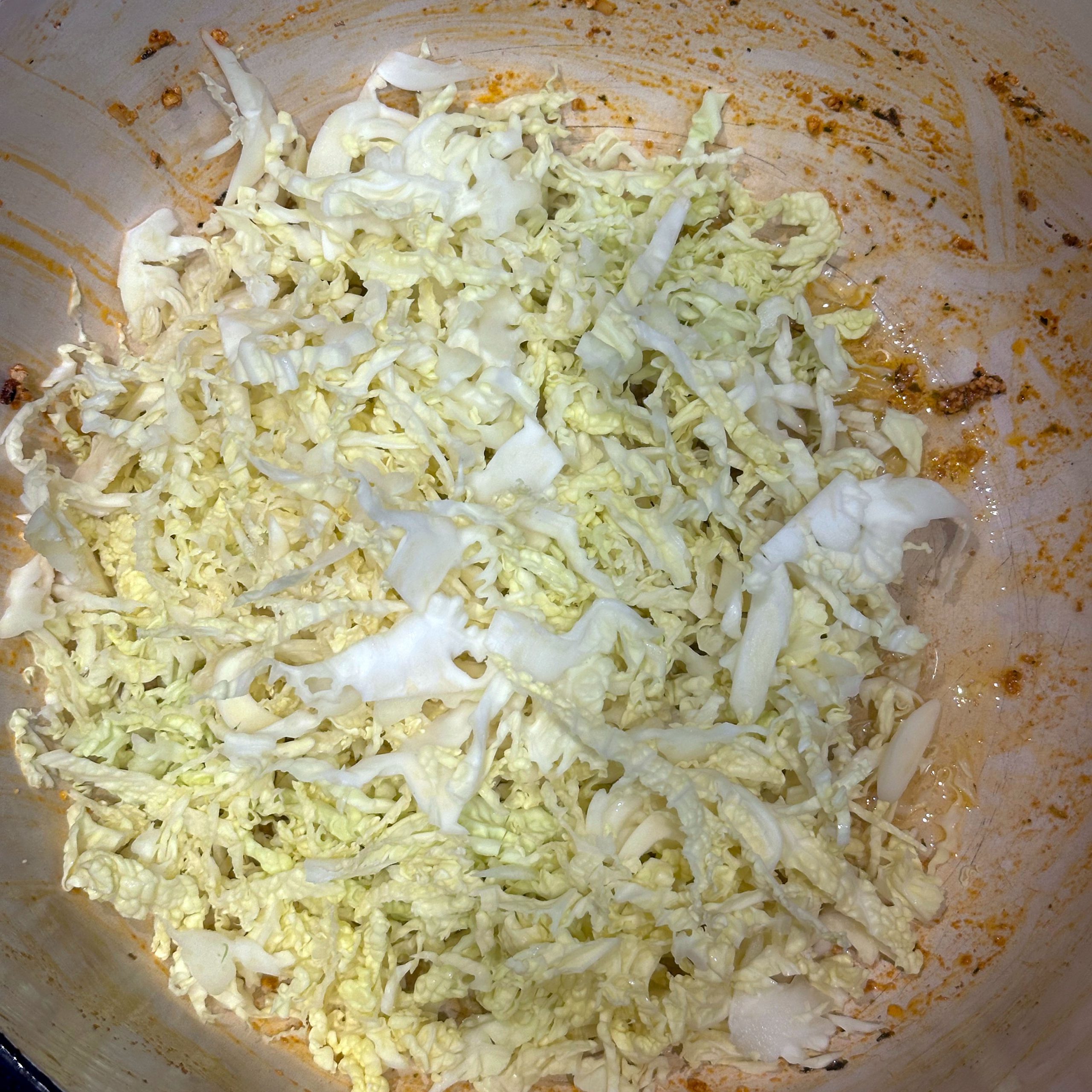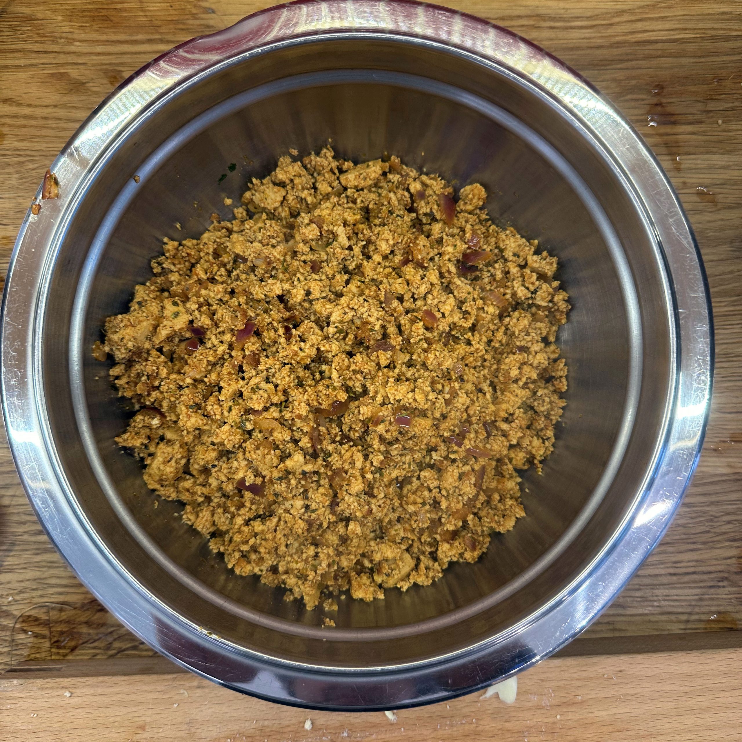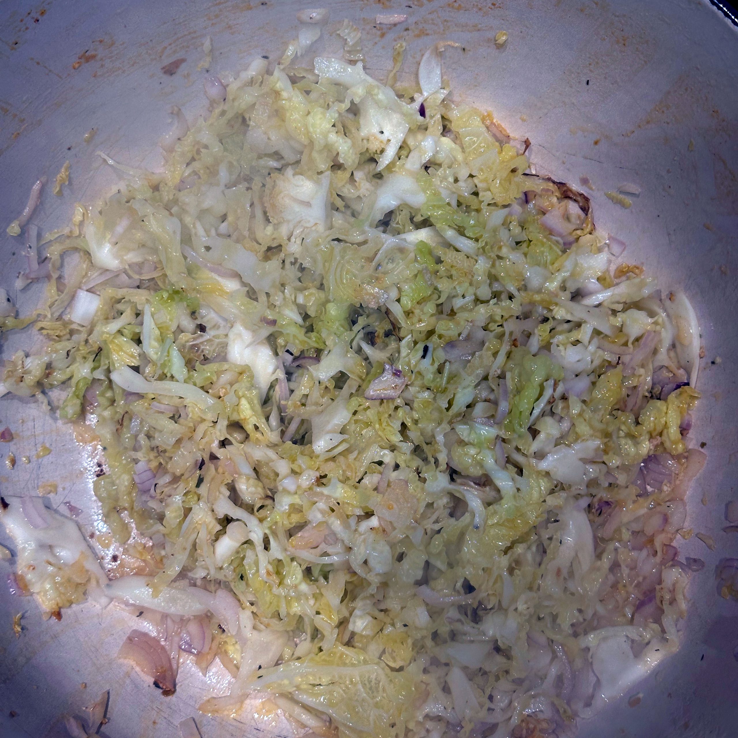 Die äußeren Wirsingblätter vom Strunk lösen, soweit möglich, den restlichen Wirsing in kleine Streifen schneiden. Die ganzen Blätter in kochendem Salzwasser blanchieren und abtropfen lassen. In dem gleichen Kochwasser 800g mehligkochende, geschälte und geviertelte Kartoffeln 20 Minuten garen. 400g Tofu zerbröseln und in Öl bei starker Hitze 10 Minuten braten, dabei gut umrühren, dann mit 80ml Brühe ablöschen und 2 EL Tomatenmark unterrühren. Mit getrockneten Kräutern, Sojasoße und geräuchertem Paprikapulver abschmecken und beiseite stellen. Im gleichen Topf 2 kleingeschnittene Zwiebeln und den gehackten Restwirsing anbraten, 2 gewürfelte Möhren hinzufügen. Die abgetropften Wirsingblätter in Streifen schneiden und mit ein paar Kümmelkörnern und 200ml Brühe zu dem Gemüse geben. Mit geschlossenem Deckel 10min köcheln lassen. Das vegane Hack unterrühren, mit Salz und Zitronensaft abschmecken und 1 Becher Sahne unterrühren, kurz erhitzen. Den Eintopf mit den gekochten Kartoffeln servieren.